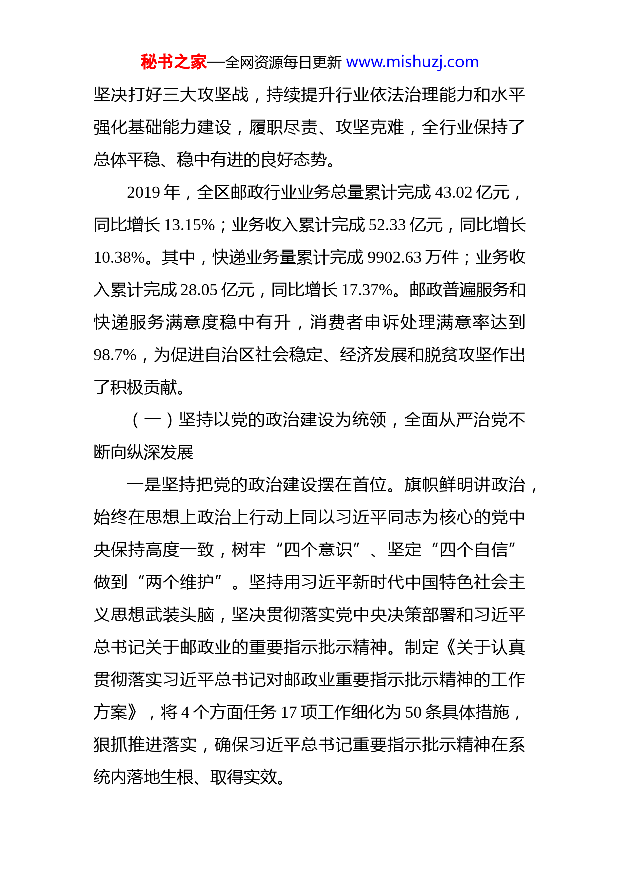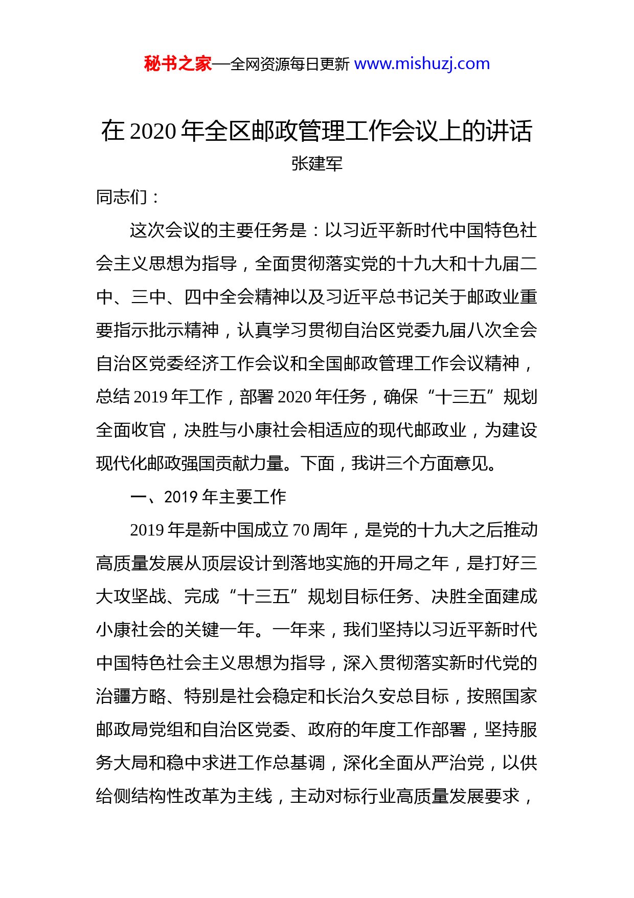 秘书之家—全网资源每日更新www.mishuzj.com在2020年全区邮政管理工作会议上的讲话张建军同志们:这次会议的主要任务是:以习近平新时代中国特色社会主义思想为指导,全面贯彻落实党的十九大和十九届二中、三中、四中全会精神以及习近平总书记关于邮政业重要指示批示精神,认真学习贯彻自治区党委九届八次全会自治区党委经济工作会议和全国邮政管理工作会议精神,总结2019年工作,部署2020年任务,确保“十三五”规划全面收官,决胜与小康社会相适应的现代邮政业,为建设现代化邮政强国贡献力量。下面,我讲三个方面意见。一、2019年主要工作2019年是新中国成立70周年,是党的十九大之后推动高质量发展从顶层设计到落地实施的开局之年,是打好三大攻坚战、完成“十三五”规划目标任务、决胜全面建成小康社会的关键一年。一年来,我们坚持以习近平新时代中国特色社会主义思想为指导,深入贯彻落实新时代党的治疆方略、特别是社会稳定和长治久安总目标,按照国家邮政局党组和自治区党委、政府的年度工作部署,坚持服务大局和稳中求进工作总基调,深化全面从严治党,以供给侧结构性改革为主线,主动对标行业高质量发展要求,秘书之家—全网资源每日更新www.mishuzj.com坚决打好三大攻坚战,持续提升行业依法治理能力和水平强化基础能力建设,履职尽责、攻坚克难,全行业保持了总体平稳、稳中有进的良好态势。2019年,全区邮政行业业务总量累计完成43.02亿元,同比增长13.15%;业务收入累计完成52.33亿元,同比增长10.38%。其中,快递业务量累计完成9902.63万件;业务收入累计完成28.05亿元,同比增长17.37%。邮政普遍服务和快递服务满意度稳中有升,消费者申诉处理满意率达到98.7%,为促进自治区社会稳定、经济发展和脱贫攻坚作出了积极贡献。(一)坚持以党的政治建设为统领,全面从严治党不断向纵深发展一是坚持把党的政治建设摆在首位。旗帜鲜明讲政治,始终在思想上政治上行动上同以习近平同志为核心的党中央保持高度一致,树牢“四个意识”、坚定“四个自信”做到“两个维护”。坚持用习近平新时代中国特色社会主义思想武装头脑,坚决贯彻落实党中央决策部署和习近平总书记关于邮政业的重要指示批示精神。制定《关于认真贯彻落实习近平总书记对邮政业重要指示批示精神的工作方案》,将4个方面任务17项工作细化为50条具体措施,狠抓推进落实,确保习近平总书记重要指示批示精神在系统内落地生根、取得实效。秘书之家—全网资源每日更新www.mishuzj.com二是扎实开展“不忘初心、牢记使命”主题教育。坚持把开展主题教育作为重大政治任务,摆在突出位置,按照“守初心、担使命、找差距、抓落实”的总要求,把“学习教育、调查研究、检视问题、整改落实”贯穿始终区管局党组组织处级以上党员干部利用6天时间进行集中学习并专题研讨2次。党组成员行程8000余公里,深入8个地州市23个县市开展调研。广泛征求意见,梳理出29条问题清单,研究制定77条具体整改措施,分阶段推进落实。全区提前实现建制村直接通邮目标,快递末端服务违规收费清理整顿成效明显。坚持两批主题教育压茬推进,派出3个指导组全过程全覆盖开展督促指导。各级党员领导干部带头深入调研、听取意见、查找问题、制定整改措施,带头抓好整改落实。各级党组坚持上下联动抓整改,扎实推进“8+3+1”专项整治和重点解决三个阶段17个问题,认真组织开好专题民主生活会,推动全系统主题教育取得明显成效。和田局在国庆70周年前后全员下沉驻村50天,期间坚持主题教育力度不减,把开展主题教育与维护稳定、助力脱贫攻坚结合起来,以实际行动确保主题教育取得实效。三是着力加强全系统机关党的建设。认真履行全面从严治党责任,修订《中共新疆邮政管理局党组工作规则》完善党组讨论和决定的重大问题清单。印发《中共新疆邮政管理局党组贯彻落实<中国共产党重大事项请示报告条例秘书之家—全网资源每日更新www.mishuzj.com>实施办法》,把贯彻执行《条例》作为全面从严治党的利器。严格执行《关于新形势下党内政治生活的若干准则》从严肃党的组织生活抓起,严格执行民主集中制原则,落实“三会一课”、民主生活会、组织生活会、谈心谈话、民主评议党员、请示报告以及领导干部双重组织生活等制度。加强基层党组织建设,严格党员发展程序,加强党员和入党积极分子教育管理,健全完善基层党建述职考核和综合评价机制。推进非公快递企业党建工作,全区现有非公快递企业党组织9个、党员74人。完成5个地州市局政治巡察工作,进一步彰显巡察利剑作用。四是深入推进党风廉政建设和反腐败工作。深入落实中央八项规定及其实施细则精神,持之以恒正风肃纪,严防“四风”反弹。严格落实中央《关于解决形式主义突出问题切实为基层减负的实施意见》,精文简会,改进文风会风。紧盯重要节点开展警示提醒,召开2次警示教育会议,通报违规违纪案例。扎实开展扶贫领域腐败和作风问题专项治理,开展受党纪政务处分党员干部回访教育和纪律处分决定执行情况监督检查。加大信访举报查办力度,接受并处置各类信访举报案件3起。深化运用监督执纪“四种形态”,对九个专项治理自检问题进行分类处置。2019年,全系统受党纪处分2人,提醒谈话2人次,批评