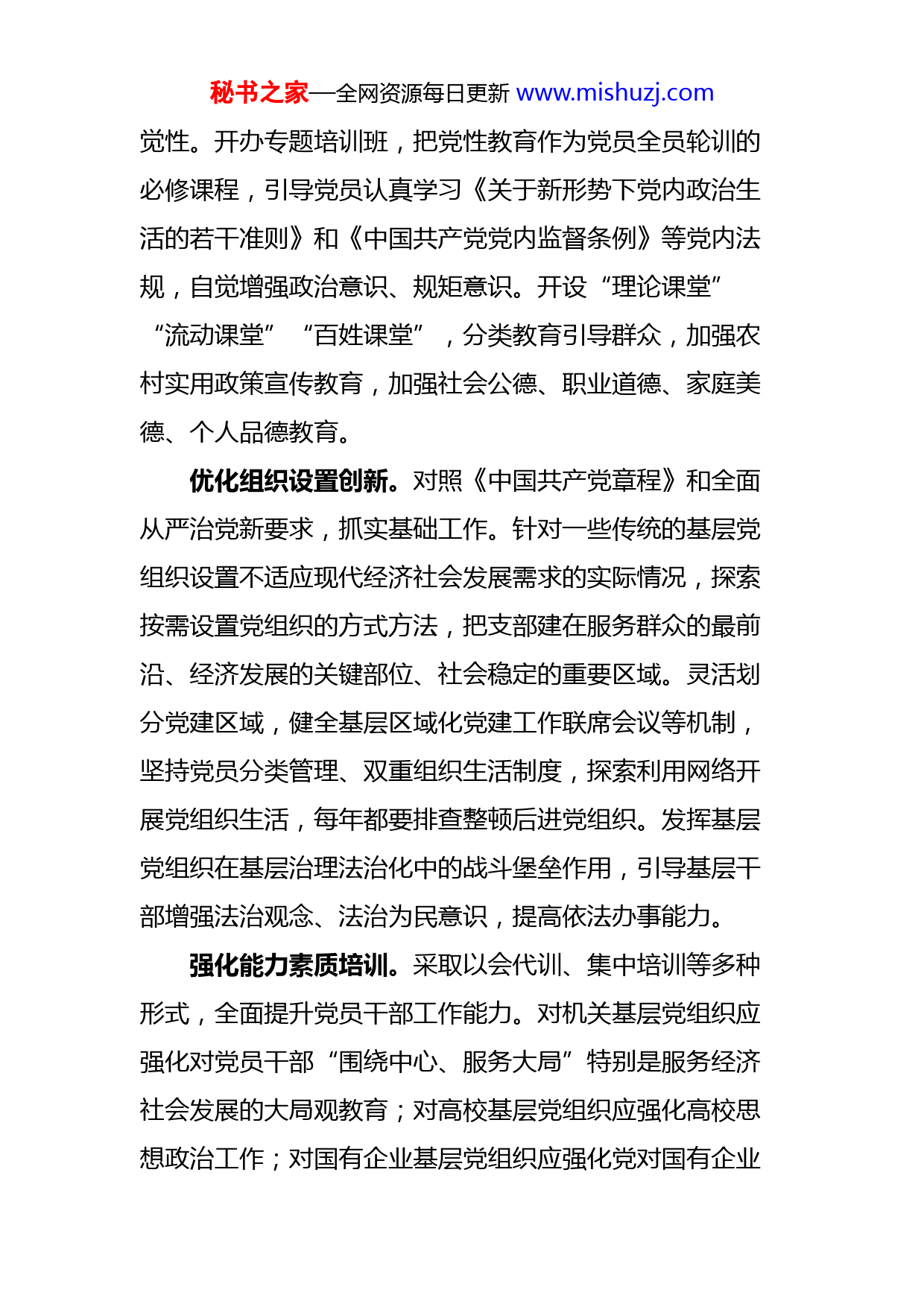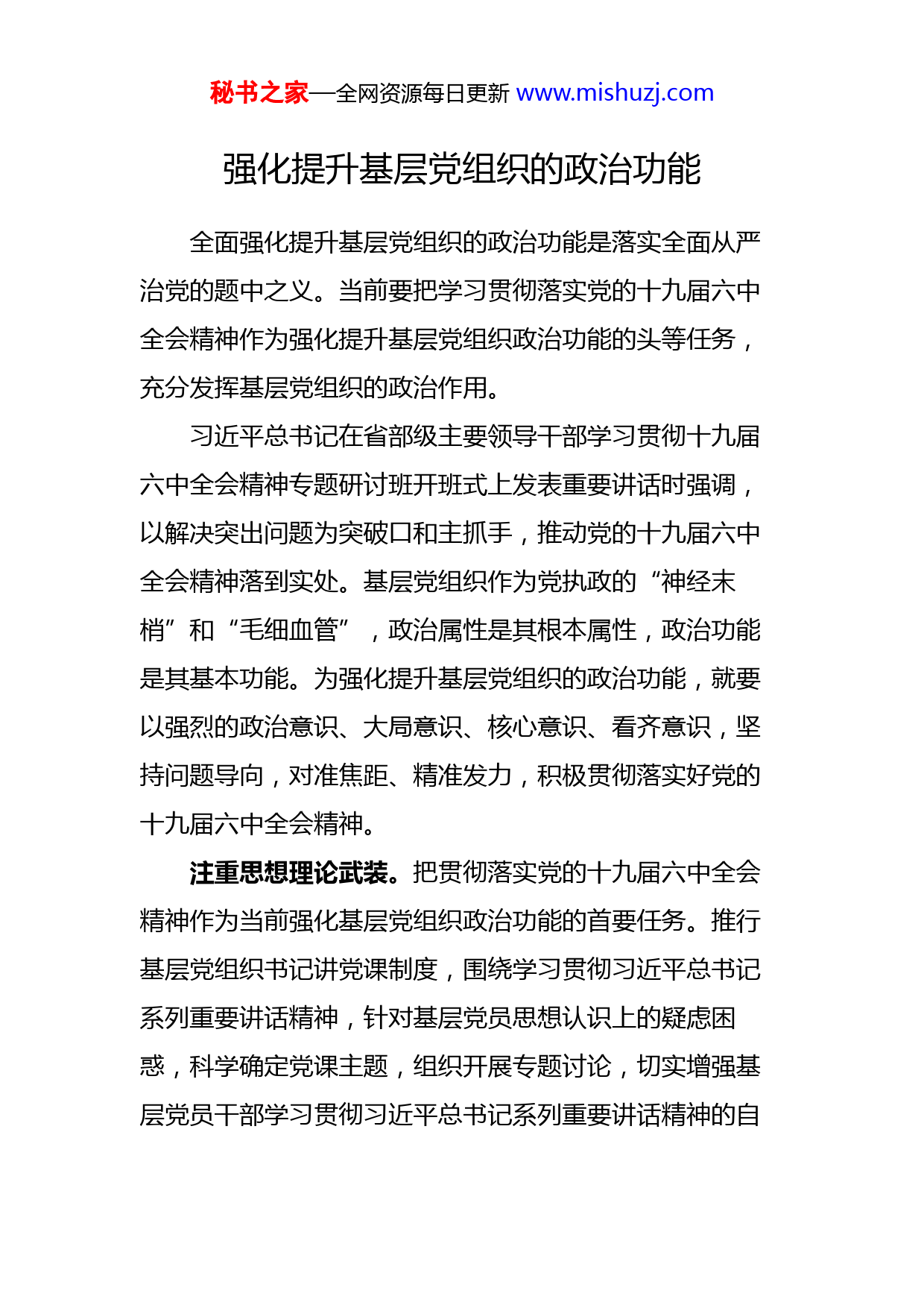 秘书之家—全网资源每日更新www.mishuzj.com强化提升基层党组织的政治功能全面强化提升基层党组织的政治功能是落实全面从严治党的题中之义。当前要把学习贯彻落实党的十九届六中全会精神作为强化提升基层党组织政治功能的头等任务,充分发挥基层党组织的政治作用。习近平总书记在省部级主要领导干部学习贯彻十九届六中全会精神专题研讨班开班式上发表重要讲话时强调,以解决突出问题为突破口和主抓手,推动党的十九届六中全会精神落到实处。基层党组织作为党执政的“神经末梢”和“毛细血管”,政治属性是其根本属性,政治功能是其基本功能。为强化提升基层党组织的政治功能,就要以强烈的政治意识、大局意识、核心意识、看齐意识,坚持问题导向,对准焦距、精准发力,积极贯彻落实好党的十九届六中全会精神。注重思想理论武装。把贯彻落实党的十九届六中全会精神作为当前强化基层党组织政治功能的首要任务。推行基层党组织书记讲党课制度,围绕学习贯彻习近平总书记系列重要讲话精神,针对基层党员思想认识上的疑虑困惑,科学确定党课主题,组织开展专题讨论,切实增强基层党员干部学习贯彻习近平总书记系列重要讲话精神的自秘书之家—全网资源每日更新www.mishuzj.com觉性。开办专题培训班,把党性教育作为党员全员轮训的必修课程,引导党员认真学习《关于新形势下党内政治生活的若干准则》和《中国共产党党内监督条例》等党内法规,自觉增强政治意识、规矩意识。开设“理论课堂”“流动课堂”“百姓课堂”,分类教育引导群众,加强农村实用政策宣传教育,加强社会公德、职业道德、家庭美德、个人品德教育。优化组织设置创新。对照《中国共产党章程》和全面从严治党新要求,抓实基础工作。针对一些传统的基层党组织设置不适应现代经济社会发展需求的实际情况,探索按需设置党组织的方式方法,把支部建在服务群众的最前沿、经济发展的关键部位、社会稳定的重要区域。灵活划分党建区域,健全基层区域化党建工作联席会议等机制,坚持党员分类管理、双重组织生活制度,探索利用网络开展党组织生活,每年都要排查整顿后进党组织。发挥基层党组织在基层治理法治化中的战斗堡垒作用,引导基层干部增强法治观念、法治为民意识,提高依法办事能力。强化能力素质培训。采取以会代训、集中培训等多种形式,全面提升党员干部工作能力。对机关基层党组织应强化对党员干部“围绕中心、服务大局”特别是服务经济社会发展的大局观教育;对高校基层党组织应强化高校思想政治工作;对国有企业基层党组织应强化党对国有企业秘书之家—全网资源每日更新www.mishuzj.com的领导;对非公经济和社会组织应重点明确和维护党组织在单位法人治理结构中的法定地位和作用;对村(社区)等基层党组织应强化党组织书记引领致富能力培训,进行党组织领导下的基层治理体系、群众自治机制、村务监督机制方式方法教育培训,开展网络操作全员培训,促进基层党建信息多渠道传输、多平台展示、多终端发送。严格党员队伍管理。做好不称职基层党组织书记调整工作,把政治强、能力强、作风好的党员选拔到党组织书记岗位上来,确保党组织带头人作用积极发挥。严把党员发展入口,引导基层党组织从思想政治、能力素质、道德品行、现实表现等方面对发展对象进行深入考察,着重看是否具有坚定的理想信念和良好的道德品行,是否自觉为党的纲领而努力奋斗,是否在生产、工作、学习和社会生活中起先锋模范作用。严格党员日常管理,按照“贵在经常、重在认真、严在细节”的要求,完善“三会一课”、民主评议党员、党员党性定期分析等制度。结合党员日常管理量化考评、党员统一活动日、警示教育等,提升组织生活质量,坚决防止组织生活随意化、娱乐化、庸俗化。做好不合格党员的处置工作。细化全面从严举措。引导基层党组织强化党建主业意识,树立大抓基层夯实基础的理念和导向,扎实推进党的秘书之家—全网资源每日更新www.mishuzj.com思想建设、组织建设、作风建设、制度建设和反腐倡廉建设等各项工作,把每条战线、每个领域、每个环节的党建工作抓具体、抓深入。做好基层党组织书记抓党建工作述职评议工作,推动各级基层党组织书记切实履行好“第一责任人”的责任,形成各级各部门齐抓共管格局。把党建工作作为考核评价领导班子和领导干部的重要内容,纳入各级目标绩效考核,加大党建分值在综合目标考核中的比重,确保党建考核真正突出政治导向。把对党是否忠诚、是否讲政治懂规矩作为党员领导干部选拔任用、奖励惩戒的重要依据,强化正面激励。通过实行责任追究,对落实党建工作责任制不力的基层党组织书记及时进行责任追究。