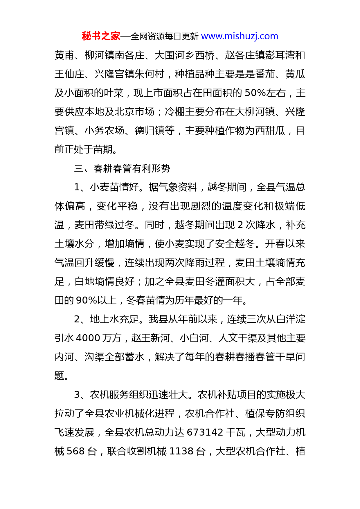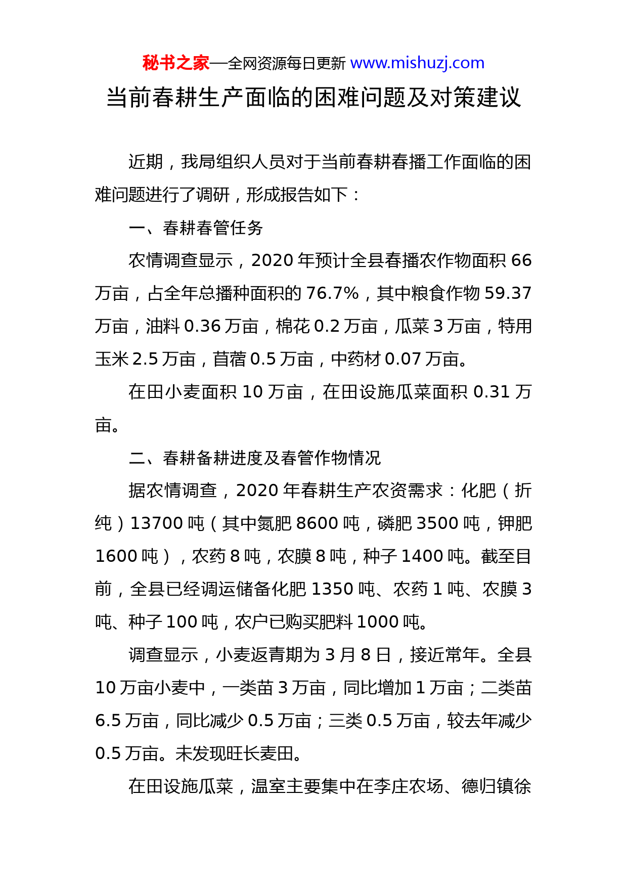 秘书之家—全网资源每日更新www.mishuzj.com当前春耕生产面临的困难问题及对策建议近期,我局组织人员对于当前春耕春播工作面临的困难问题进行了调研,形成报告如下:一、春耕春管任务农情调查显示,2020年预计全县春播农作物面积66万亩,占全年总播种面积的76.7%,其中粮食作物59.37万亩,油料0.36万亩,棉花0.2万亩,瓜菜3万亩,特用玉米2.5万亩,苜蓿0.5万亩,中药材0.07万亩。在田小麦面积10万亩,在田设施瓜菜面积0.31万亩。二、春耕备耕进度及春管作物情况据农情调查,2020年春耕生产农资需求:化肥(折纯)13700吨(其中氮肥8600吨,磷肥3500吨,钾肥1600吨),农药8吨,农膜8吨,种子1400吨。截至目前,全县已经调运储备化肥1350吨、农药1吨、农膜3吨、种子100吨,农户已购买肥料1000吨。调查显示,小麦返青期为3月8日,接近常年。全县10万亩小麦中,一类苗3万亩,同比增加1万亩;二类苗6.5万亩,同比减少0.5万亩;三类0.5万亩,较去年减少0.5万亩。未发现旺长麦田。在田设施瓜菜,温室主要集中在李庄农场、德归镇徐秘书之家—全网资源每日更新www.mishuzj.com黄甫、柳河镇南各庄、大围河乡西桥、赵各庄镇澎耳湾和王仙庄、兴隆宫镇朱何村,种植品种主要是是番茄、黄瓜及小面积的叶菜,现上市面积占在田面积的50%左右,主要供应本地及北京市场;冷棚主要分布在大柳河镇、兴隆宫镇、小务农场、德归镇等,主要种植作物为西甜瓜,目前正处于苗期。三、春耕春管有利形势1、小麦苗情好。据气象资料,越冬期间,全县气温总体偏高,变化平稳,没有出现剧烈的温度变化和极端低温,麦田带绿过冬。同时,越冬期间出现2次降水,补充土壤水分,增加墒情,使小麦实现了安全越冬。开春以来气温回升缓慢,连续出现两次降雨过程,麦田土壤墒情充足,白地墒情良好;加之全县麦田冬灌面积大,占全部麦田的90%以上,冬春苗情为历年最好的一年。2、地上水充足。我县从年前以来,连续三次从白洋淀引水4000万方,赵王新河、小白河、人文干渠及其他主要内河、沟渠全部蓄水,解决了每年的春耕春播春管干旱问题。3、农机服务组织迅速壮大。农机补贴项目的实施极大拉动了全县农业机械化进程,农机合作社、植保专防组织飞速发展,全县农机总动力达673142千瓦,大型动力机械568台,联合收割机械1138台,大型农机合作社、植秘书之家—全网资源每日更新www.mishuzj.com保服务组织达20余家,日作业能力在4万亩以上,为春耕春管工作的快速开展提供了坚实后盾。四、春耕春管面临的困难问题我县作为疫情低风险区,按照上级要求,各乡镇、村街、社区严格落实了“外防输入”策略。但是由于惯性使然,大部分村街仍保持了非低风险区时的防控方式,给春耕春管带来了一定影响。(一)农资储备进度缓慢,农资进村入户难受疫情影响,目前全县农资储备进度缓慢,储备量与常年同期比下降了50-60%。主要原因是:1、农户储备积极性降低。由于我县春播高峰期在4月下旬到5月中旬,受疫情影响,大部分农户购买意愿推迟,农资提前储备积极性不高。2、部分村街主要街口仍处于封堵状态,农资运输车辆出入村困难,部分村外大户农资储备顺畅,村内农户农资供应受阻。3、农资销售门店开工率不足。据调查,全县102家农资经销门店,正常营业的仅40余家,复工率不足50%。从农资流通来看,农资进文基本顺畅,农资进村入地困难。(二)部分村口封堵,给春耕春管造成一定影响部分村路切断,进田入地不畅。据调查,目前部分乡秘书之家—全网资源每日更新www.mishuzj.com村通田间道路仍处于挖断或堆土状态,春管机具、农资无法运送到田间地头,村外农户储备比例高,村内农户比例低。当下正是未浇冻水的小麦返青肥水的关键期,返青肥水的推迟将直接导致小麦减产。(三)农产品出基地困难,销售滞后全县在售鲜活农产品主要是蔬菜和红薯。蔬菜销售受阻主要表现在两方面,一是大的蔬菜基地农资供应和产品运输不畅。全县规模较大的蔬菜基地有六个,产品主要是西红柿、黄瓜等,销售渠道主要是北京新发地等,疫情期间由于道路卡点多,运输车辆和人员来往阻碍较大,目前虽有缓解,但也形成了购销压力。二是较为分散的种植户因无固定销售渠道,本地销售受阻,造成销售困难。红薯销售更为明显。去年全县红薯种植面积月3.4万亩,总产10.2万吨,储存量约4.5万吨左右,常年春节前后即可销售告罄。今年受疫情影响,销售缓慢。例如新镇、苏桥等红薯主产区,由于部分村街的严防死守,导致贮藏红薯出村困难,红薯经纪人减少,出现销售困难。最后只能先拉到村口,再转到村外的车辆,成本增加。截止目前全县储存红薯基本到了销售末期,同比延迟销售20余天,病薯、烂薯率同比提高20个百分点以上,农户损失巨大。秘书之家—全网资源每日更新www.mishuzj.com(四)农业用工困难,人工成本增加本地农民工出不来,外地工人进不来。工人对疫情的恐惧心理尚未消除,不愿聚群劳动。即使本地雇到工人,工资也由原来的150元/天涨到200元/天,涨幅33.3%。用工短缺尤其在大面积瓜菜种植基地最为明显,一般用工短缺率在50%以上。其次是土地流转大户,由于人工成本上升,用工量明显下降。(五)维修点歇业,农机维修困难。据调查,目前全县农机维修点复工率不足10%,春耕、春管即将进入高峰期,大量农机具将投入机耕、灌溉等田间作业,农机保养、维修正常化成为农机手的必需。五、对策建