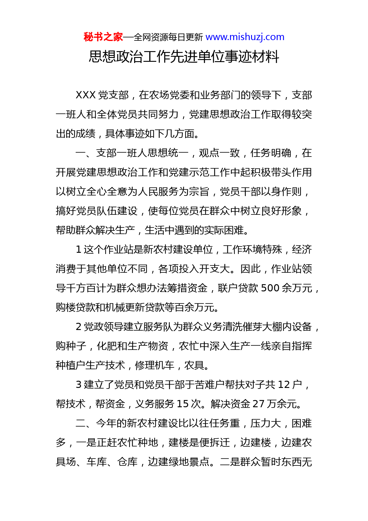秘书之家—全网资源每日更新www.mishuzj.com思想政治工作先进单位事迹材料XXX党支部,在农场党委和业务部门的领导下,支部一班人和全体党员共同努力,党建思想政治工作取得较突出的成绩,具体事迹如下几方面。一、支部一班人思想统一,观点一致,任务明确,在开展党建思想政治工作和党建示范工作中起积极带头作用以树立全心全意为人民服务为宗旨,党员干部以身作则,搞好党员队伍建设,使每位党员在群众中树立良好形象,帮助群众解决生产,生活中遇到的实际困难。1这个作业站是新农村建设单位,工作环境特殊,经济消费于其他单位不同,各项投入开支大。因此,作业站领导千方百计为群众想办法筹措资金,联户贷款500余万元,购楼贷款和机械更新贷款等百余万元。2党政领导建立服务队为群众义务清洗催芽大棚内设备,购种子,化肥和生产物资,农忙中深入生产一线亲自指挥种植户生产技术,修理机车,农具。3建立了党员和党员干部于苦难户帮扶对子共12户,帮技术,帮资金,义务服务15次。解决资金27万余元。二、今年的新农村建设比以往任务重,压力大,困难多,一是正赶农忙种地,建楼是便拆迁,边建楼,边建农具场、车库、仓库,边建绿地景点。二是群众暂时东西无秘书之家—全网资源每日更新www.mishuzj.com处放,三是被拆迁户少确实无时间扒房,倒东西。四是被拆迁户的主仓房标准不一样,讲代价的户太多,无理取闹的钉子户等等。另外还有建设绿色大通道,路边沿线挖沟筑台、绿化造株、下桥整改路等繁琐工作,相应的给思想政治工作带来很多麻烦。因此,面对如此工作难度,支部一班人制定了一套工作方案,利用中晚事件进行被拆迁户的走访、调查、宣传农场关于新农村建设的优惠政策,做认真细致的思想政治工作。全年走访60户,并对重点户走访做工作几次,难点户都在十几次以上,XXX、XXX、XXX、XXX、XXX等钉子户和精神病人时常就去做工作,经过艰难的思想斗争,终于合手下了堡垒,动员够了楼,并负责找人装修和垫付资金,帮助条件差的户找住处、放东西和义务出车搬家拉物品。三、充分发挥党员干部的先锋模范作用,作业站在推荐新农村建设中。党员汪昌君、丁富荣、陈兴伟自己首先带头拆迁房子、扒屋杖子,而且深入群众中去做思想工作他们先后去了郭安龙、李伟、刘玉宝家宣传这次给我们建家园是我们的理得,农场把好的政策先给咱们,是对咱的先爱护、先享受。我们应该感谢上级党委对咱们的爱。另外这几位党员还义务出动自家的机车为苦难户拉东西,不收分文,不计费用。党员干部沈星明、陈庆复、熊亚文放弃中午休息,帮助条件差的户扒房木料、门窗、收拾房屋秘书之家—全网资源每日更新www.mishuzj.com等物品、全体党员干部共为群众义务奉献活动24人/次。解决实际问题10余件。四、积极开展党员联系户活动,党员干部共建立联系户8户,他们是:XX、XXX、XXX、XXX、XXX。党员干部经常深入家中座谈。帮助解决思想误区,生产、生活中的困难,生老病死,子女上学可以说面面俱到为他们送去温暖和关爱。全年为他们送去慰问品,救助金7000元(包括上级救助)。解决了4户的土地,帮助3户找工作和活干。缓解他们的困难局面,党支部在开展示范作用中全年义务奉献活动3次,清理楼区四周公共场所卫生、植树、清理绿色通道残树、杂草共出人力36人/次。在开展“献爱心、送温暖”和为玉树震区捐款总计6000元以上,其中党员干部每人都在80-100元。五、党员科技示范点和科技示范带,集中催芽、集中育秧基地建设取得可喜成效。党建示范点建设初见成效,并通过总局验收,以及升级文明建设工作取得可喜成绩。各项硬件已逐渐建设和宽容。丁富荣的垄系、宽容行栽培试验。陈吴伟的卢博士有机肥试验。都得到了专家认可。另外,我们在调动群众的积极性中继续开展“十星级文明户”“文明楼道”评比工作。利用节假日开展文化体育活动。聘请农场业务部门“三下乡”和“冬季培训”文艺演出,讲秘书之家—全网资源每日更新www.mishuzj.com党课送知识活动。其次坚持常年“三会一课”民主生活会,党建党性分析会,加强了党风廉政建设工作,全年无一名党员干部违法违纪,真正体现思想政治工作做到位不留死角,有利地促进各项生产建设,新农村建设。党建思想政治工作的向前进展。
