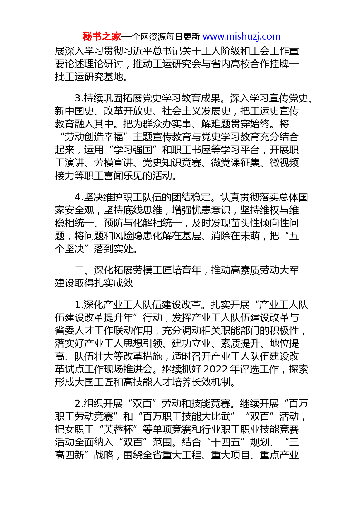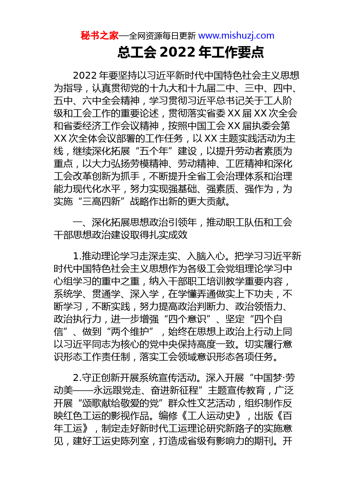 秘书之家—全网资源每日更新www.mishuzj.com总工会2022年工作要点2022年要坚持以习近平新时代中国特色社会主义思想为指导,认真贯彻党的十九大和十九届二中、三中、四中、五中、六中全会精神,学习贯彻习近平总书记关于工人阶级和工会工作的重要论述,贯彻落实省委XX届XX次全会和省委经济工作会议精神,按照中国工会XX届执委会第XX次全体会议部署的工作任务,以XX主题实践活动为主线,继续深化拓展“五个年”建设,以提升劳动者素质为重点,以大力弘扬劳模精神、劳动精神、工匠精神和深化工会改革创新为抓手,不断提升全省工会治理体系和治理能力现代化水平,努力实现强基础、强素质、强作为,为实施“三高四新”战略作出新的更大贡献。一、深化拓展思想政治引领年,推动职工队伍和工会干部思想政治建设取得扎实成效1.推动理论学习走深走实、入脑入心。把学习习近平新时代中国特色社会主义思想作为各级工会党组理论学习中心组学习的重中之重,纳入干部职工培训教学重要内容,系统学、贯通学、深入学,在学懂弄通做实上下功夫,不断学习,不断实践,努力提高政治判断力、政治领悟力、政治执行力,进一步增强“四个意识”、坚定“四个自信”、做到“两个维护”,始终在思想上政治上行动上同以习近平同志为核心的党中央保持高度一致。切实履行意识形态工作责任制,落实工会领域意识形态各项任务。2.守正创新开展系统宣传活动。深入开展“中国梦·劳动美——永远跟党走、奋进新征程”主题宣传教育,广泛开展“颂歌献给敬爱的党”群众性文艺活动,组织制作反映红色工运的影视作品。编修《工人运动史》,出版《百年工运》,制定走好新时代工运理论研究新路子的实施意见,建好工运史陈列室,打造成省级有影响力的期刊。开秘书之家—全网资源每日更新www.mishuzj.com展深入学习贯彻习近平总书记关于工人阶级和工会工作重要论述理论研讨,推动工运研究会与省内高校合作挂牌一批工运研究基地。3.持续巩固拓展党史学习教育成果。深入学习宣传党史、新中国史、改革开放史、社会主义发展史,把工运史宣传教育融入其中。把为群众办实事、解难题贯穿始终。将“劳动创造幸福”主题宣传教育与党史学习教育充分结合起来,运用“学习强国”和职工书屋等学习平台,开展职工演讲、劳模宣讲、党史知识竞赛、微党课征集、微视频接力等职工喜闻乐见的活动。4.坚决维护职工队伍的团结稳定。认真贯彻落实总体国家安全观,坚持底线思维,增强忧患意识,坚持维权与维稳相统一、预防与化解相统一,及时发现苗头性倾向性问题,将问题和风险隐患化解在基层、消除在未萌,把“五个坚决”落到实处。二、深化拓展劳模工匠培育年,推动高素质劳动大军建设取得扎实成效1.深化产业工人队伍建设改革。扎实开展“产业工人队伍建设改革提升年”行动,发挥产业工人队伍建设改革与省委人才工作联动作用,充分调动相关职能部门的积极性,落实好产业工人思想引领、建功立业、素质提升、地位提高、队伍壮大等改革措施,适时召开产业工人队伍建设改革试点工作现场推进会。继续抓好2022年评选工作,探索形成大国工匠和高技能人才培养长效机制。2.组织开展“双百”劳动和技能竞赛。继续开展“百万职工劳动竞赛”和“百万职工技能大比武”“双百”活动,把女职工“芙蓉杯”等单项竞赛和行业职工职业技能竞赛活动全面纳入“双百”范围。结合“十四五”规划、“三高四新”战略,围绕全省重大工程、重大项目、重点产业秘书之家—全网资源每日更新www.mishuzj.com优化竞赛门类。深化拓展“五小”活动内涵。组织好全省第七届职工职业技能大赛,做好全国第七届职工职业技能大赛参赛工作。完善竞赛绩效评估指标体系,推动健全竞赛同劳模评选、职称评定、技术等级认定、工资收入等相融合的体制机制,贯彻落实《关于进一步提高非公企业劳动和技能竞赛工作水平的意见》,探索开展竞赛的新形式。3.大力弘扬劳模精神、劳动精神、工匠精神。定期研究劳模推荐评选与管理服务工作,创新劳模服务方式,推动落实劳模政策。加强新时代劳动教育,开展“劳模进校园”“大国工匠进校园”等活动,教育引导青少年学生崇尚劳动、尊重劳动、热爱劳动。实施劳模宣讲“百千万”计划,组织开展全省第XX个工人阶级宣传月等系列活动。牵头筹备好庆祝“五一”国际劳动节暨表彰劳动模范和优秀工匠大会。三、深化拓展维权帮扶服务年,推动工会服务职工体系建设取得扎实成效1.健全完善常态化服务职工机制。紧密结合“我为职工办实事”实践活动,构建以精准帮扶为重点的服务职工工作体系,推动春送岗位、夏送清凉、金秋助学、冬送温暖、职工医疗互助、工会法律援助、女职工关爱行动、工会户外劳动者服务站点等工会服务品牌常态化、制度化、规范化,着力建设新时代“双联”工作品牌。巩固城市困难职工解困脱困成果,建立健全困难职工家庭常态化帮扶机制。2.推进职工依法维权服务。结合工会实际谋划好八五普法工作,在工会法规建设、法律宣传、依法维权、法律工作者队伍建设等方面出实招,积极推动和参与同职工利益密切相关的就业、医疗、养老、住房、工伤等法律法规和政策文件制定和修改,充分反映职工和工会组织
