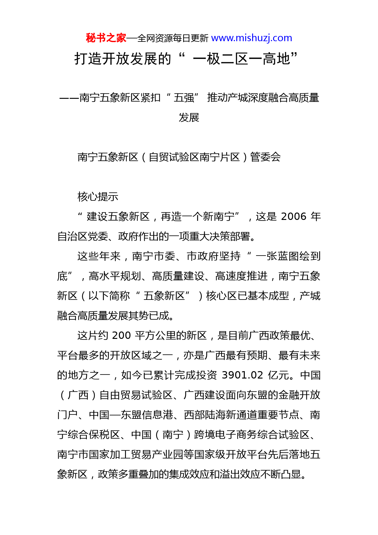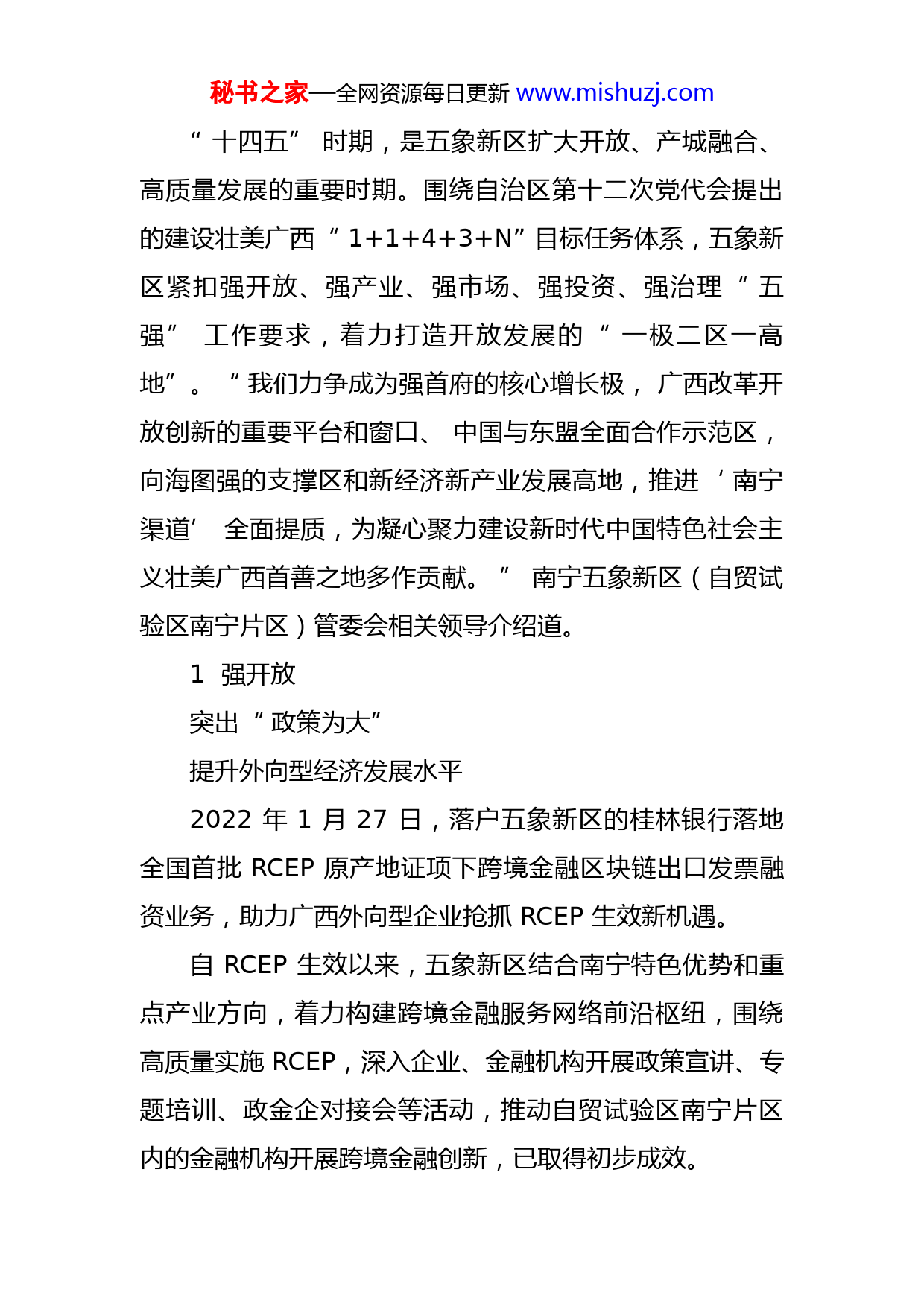 秘书之家—全网资源每日更新www.mishuzj.com打造开放发展的“一极二区一高地”——南宁五象新区紧扣“五强”推动产城深度融合高质量发展南宁五象新区(自贸试验区南宁片区)管委会核心提示“建设五象新区,再造一个新南宁”,这是2006年自治区党委、政府作出的一项重大决策部署。这些年来,南宁市委、市政府坚持“一张蓝图绘到底”,高水平规划、高质量建设、高速度推进,南宁五象新区(以下简称“五象新区”)核心区已基本成型,产城融合高质量发展其势已成。这片约200平方公里的新区,是目前广西政策最优、平台最多的开放区域之一,亦是广西最有预期、最有未来的地方之一,如今已累计完成投资3901.02亿元。中国(广西)自由贸易试验区、广西建设面向东盟的金融开放门户、中国—东盟信息港、西部陆海新通道重要节点、南宁综合保税区、中国(南宁)跨境电子商务综合试验区、南宁市国家加工贸易产业园等国家级开放平台先后落地五象新区,政策多重叠加的集成效应和溢出效应不断凸显。秘书之家—全网资源每日更新www.mishuzj.com“十四五”时期,是五象新区扩大开放、产城融合、高质量发展的重要时期。围绕自治区第十二次党代会提出的建设壮美广西“1+1+4+3+N”目标任务体系,五象新区紧扣强开放、强产业、强市场、强投资、强治理“五强”工作要求,着力打造开放发展的“一极二区一高地”。“我们力争成为强首府的核心增长极,广西改革开放创新的重要平台和窗口、中国与东盟全面合作示范区,向海图强的支撑区和新经济新产业发展高地,推进‘南宁渠道’全面提质,为凝心聚力建设新时代中国特色社会主义壮美广西首善之地多作贡献。”南宁五象新区(自贸试验区南宁片区)管委会相关领导介绍道。1强开放突出“政策为大”提升外向型经济发展水平2022年1月27日,落户五象新区的桂林银行落地全国首批RCEP原产地证项下跨境金融区块链出口发票融资业务,助力广西外向型企业抢抓RCEP生效新机遇。自RCEP生效以来,五象新区结合南宁特色优势和重点产业方向,着力构建跨境金融服务网络前沿枢纽,围绕高质量实施RCEP,深入企业、金融机构开展政策宣讲、专题培训、政金企对接会等活动,推动自贸试验区南宁片区内的金融机构开展跨境金融创新,已取得初步成效。秘书之家—全网资源每日更新www.mishuzj.com如今,五象新区积极参与建设中国—东盟经贸中心、RCEP企业服务中心,大力推动AEO企业获批经核准出口商资质,并继续深耕东盟市场,拓展日韩澳新贸易空间,推动设立RCEP进口商品展示交易中心,力争成为广西乃至中国对接RCEP的新高地。抢抓机遇,乘势而上、主动作为。近年来,五象新区着眼积极服务建设中国—东盟命运共同体,抢抓中国—东盟自由贸易区3.0版建设机遇,聚焦项目、用足政策,坚定不移推进强开放,助推南宁打造成为中国企业走向东盟市场和东盟企业进入中国的产业投资集聚地、贸易往来结算地、科技创新支撑地、生活服务保障地。在推进面向东盟的金融开放门户核心区建设方面,五象新区不断强化面向东盟的人民币跨境结算、货币贸易和跨境投融资服务,促进跨境金融合作交流,推动中国—东盟跨境金融服务中心运营,打造面向东盟、服务RCEP的区域性国际金融中心;在中国—东盟信息港南宁核心基地建设方面,五象新区持续优化升级南宁国际互联网专用通道,加快推进中国电信东盟国际信息园、中国移动(广西)数据中心等超大规模数据中心建设,着力打造面向东盟的国际通信网络节点和信息服务枢纽。与此同时,五象新区还全力加快西部陆海新通道重要秘书之家—全网资源每日更新www.mishuzj.com节点、中国(南宁)跨境电子商务综合试验区、南宁综合保税区、南宁市国家加工贸易产业园等建设,推动多平台统筹发展大融合,不断提升外向型经济发展水平。2强产业强化创新驱动加快构建新区现代产业体系抓创新就是抓发展,谋创新就是谋未来。五象新区秉承创新理念,把做强实体经济作为新区建设的“主攻方向”,现代化产业体系逐步形成——着力打造先进制造业产业集群。围绕电子信息等重点产业链,将自贸试验区南宁片区打造成南宁中越(中国—东盟)跨境产业链关键环节生产总部集聚区的重要承载地;发展壮大新能源汽车产业,推动新能源汽车项目加快建成投产;发挥南南铝加工的技术辐射和带动效应,大力发展铝精深加工产业;依托丰林木业、爱阁工房,发展多功能板材和中高端家居等绿色家居产业;全力建设南宁市国家加工贸易产业园,重点推进中新南宁国际物流园、智慧物流及跨境贸易供应链融合产业园等一批重大项目建设。提速提质发展生产性服务业。五象新区全力扩量提质建设中国—东盟金融城,支持金融机构组建面向东盟的中后台运营总部基地,打造西南、中南地区金融产业中后台秘书之家—全网资源每日更新www.mishuzj.com发展集聚高地;支持中银香港东南亚业务营运中心、太平东盟保险服务中心、交通银行全国运营中心—南宁金融服务中心等一批先导示范项目做大做强;深入推进绿色金融改革创新和保险创新综合示范区建设,申报创建供应链金融示范区;打造数字经济产业集群。积极推动新一代信息技术与实体经济深度融合,打造全区经济发展核心引擎。值得一提的是,五象新区继续打造总部经济产业集群,以Smart全球