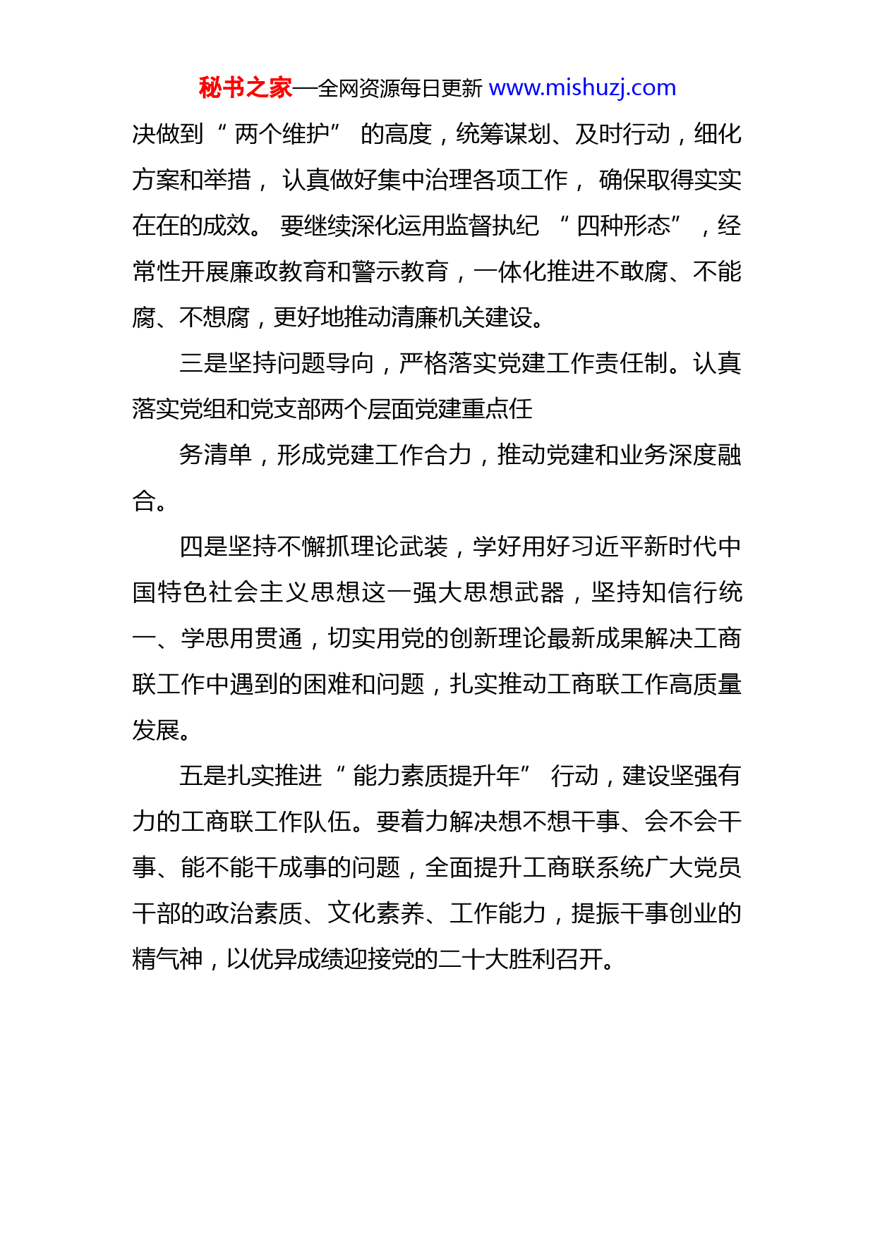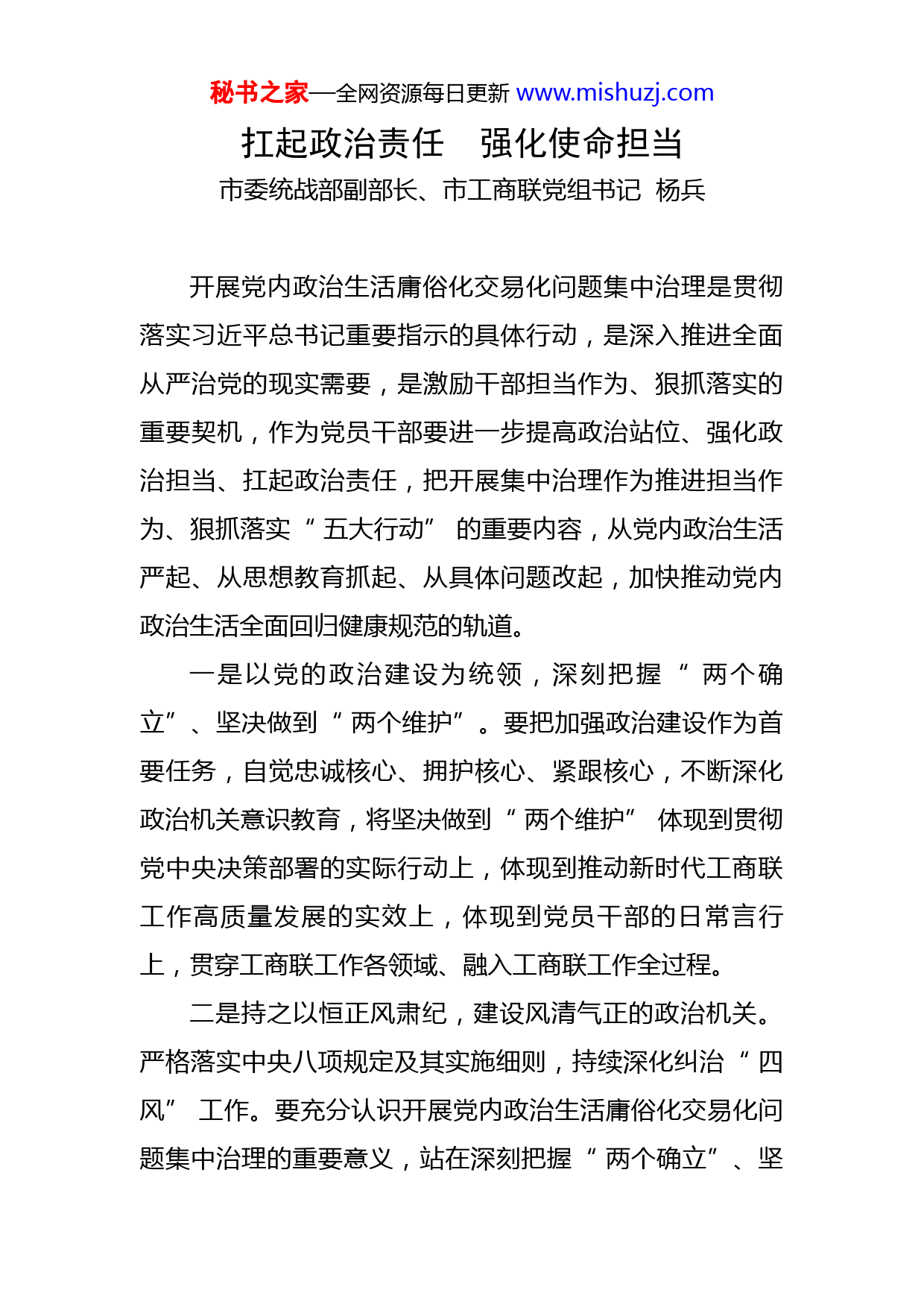 秘书之家—全网资源每日更新www.mishuzj.com扛起政治责任强化使命担当市委统战部副部长、市工商联党组书记杨兵开展党内政治生活庸俗化交易化问题集中治理是贯彻落实习近平总书记重要指示的具体行动,是深入推进全面从严治党的现实需要,是激励干部担当作为、狠抓落实的重要契机,作为党员干部要进一步提高政治站位、强化政治担当、扛起政治责任,把开展集中治理作为推进担当作为、狠抓落实“五大行动”的重要内容,从党内政治生活严起、从思想教育抓起、从具体问题改起,加快推动党内政治生活全面回归健康规范的轨道。一是以党的政治建设为统领,深刻把握“两个确立”、坚决做到“两个维护”。要把加强政治建设作为首要任务,自觉忠诚核心、拥护核心、紧跟核心,不断深化政治机关意识教育,将坚决做到“两个维护”体现到贯彻党中央决策部署的实际行动上,体现到推动新时代工商联工作高质量发展的实效上,体现到党员干部的日常言行上,贯穿工商联工作各领域、融入工商联工作全过程。二是持之以恒正风肃纪,建设风清气正的政治机关。严格落实中央八项规定及其实施细则,持续深化纠治“四风”工作。要充分认识开展党内政治生活庸俗化交易化问题集中治理的重要意义,站在深刻把握“两个确立”、坚秘书之家—全网资源每日更新www.mishuzj.com决做到“两个维护”的高度,统筹谋划、及时行动,细化方案和举措,认真做好集中治理各项工作,确保取得实实在在的成效。要继续深化运用监督执纪“四种形态”,经常性开展廉政教育和警示教育,一体化推进不敢腐、不能腐、不想腐,更好地推动清廉机关建设。三是坚持问题导向,严格落实党建工作责任制。认真落实党组和党支部两个层面党建重点任务清单,形成党建工作合力,推动党建和业务深度融合。四是坚持不懈抓理论武装,学好用好习近平新时代中国特色社会主义思想这一强大思想武器,坚持知信行统一、学思用贯通,切实用党的创新理论最新成果解决工商联工作中遇到的困难和问题,扎实推动工商联工作高质量发展。五是扎实推进“能力素质提升年”行动,建设坚强有力的工商联工作队伍。要着力解决想不想干事、会不会干事、能不能干成事的问题,全面提升工商联系统广大党员干部的政治素质、文化素养、工作能力,提振干事创业的精气神,以优异成绩迎接党的二十大胜利召开。