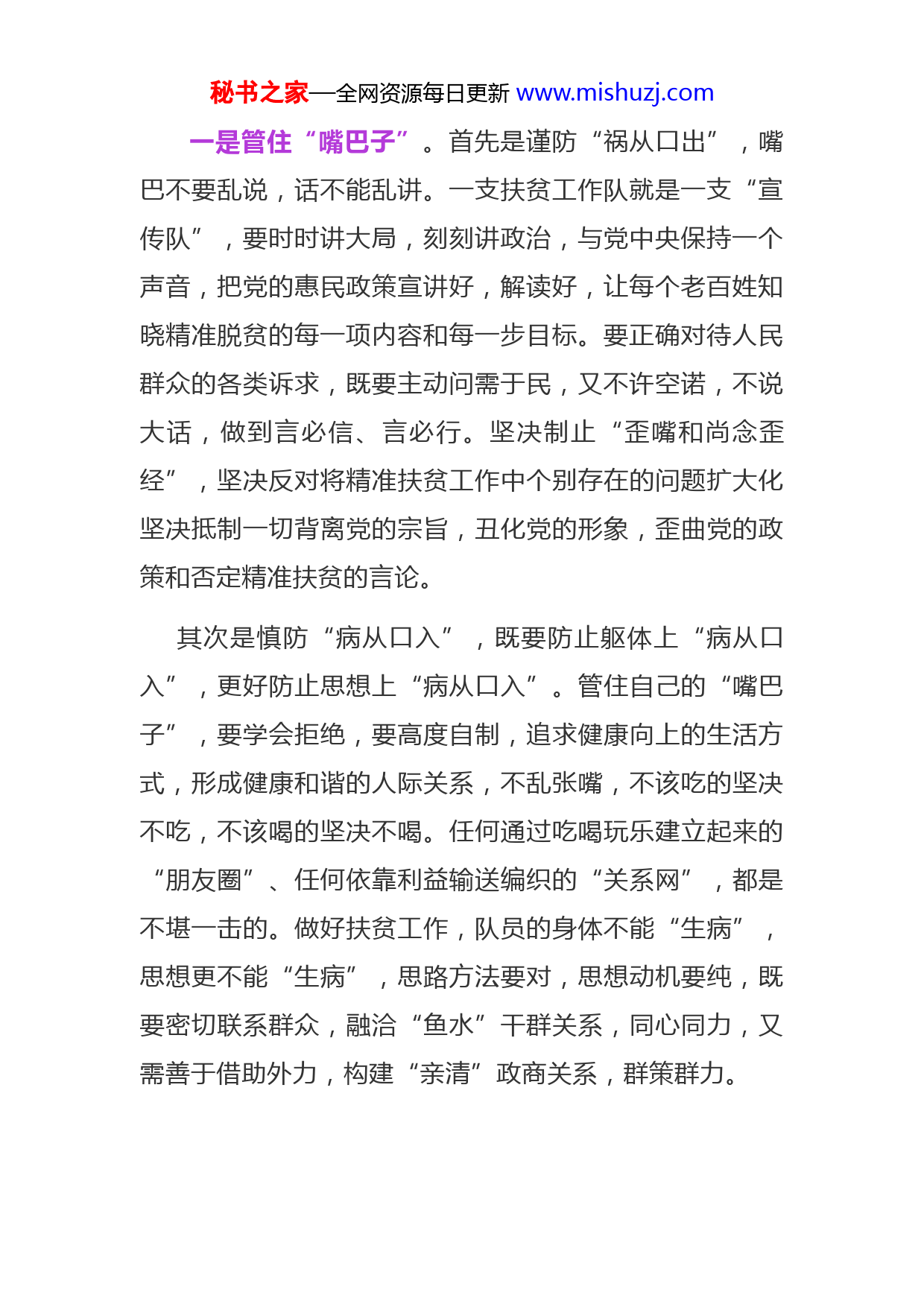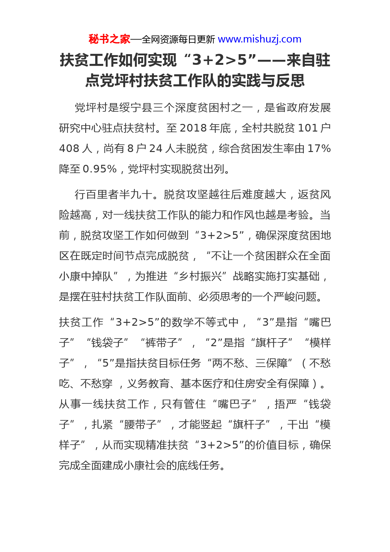 秘书之家—全网资源每日更新www.mishuzj.com扶贫工作如何实现“3+2>5”——来自驻点党坪村扶贫工作队的实践与反思党坪村是绥宁县三个深度贫困村之一,是省政府发展研究中心驻点扶贫村。至2018年底,全村共脱贫101户408人,尚有8户24人未脱贫,综合贫困发生率由17%降至0.95%,党坪村实现脱贫出列。行百里者半九十。脱贫攻坚越往后难度越大,返贫风险越高,对一线扶贫工作队的能力和作风也越是考验。当前,脱贫攻坚工作如何做到“3+2>5”,确保深度贫困地区在既定时间节点完成脱贫,“不让一个贫困群众在全面小康中掉队”,为推进“乡村振兴”战略实施打实基础,是摆在驻村扶贫工作队面前、必须思考的一个严峻问题。扶贫工作“3+2>5”的数学不等式中,“3”是指“嘴巴子”“钱袋子”“裤带子”,“2”是指“旗杆子”“模样子”,“5”是指扶贫目标任务“两不愁、三保障”(不愁吃、不愁穿,义务教育、基本医疗和住房安全有保障)。从事一线扶贫工作,只有管住“嘴巴子”,捂严“钱袋子”,扎紧“腰带子”,才能竖起“旗杆子”,干出“模样子”,从而实现精准扶贫“3+2>5”的价值目标,确保完成全面建成小康社会的底线任务。秘书之家—全网资源每日更新www.mishuzj.com一是管住“嘴巴子”。首先是谨防“祸从口出”,嘴巴不要乱说,话不能乱讲。一支扶贫工作队就是一支“宣传队”,要时时讲大局,刻刻讲政治,与党中央保持一个声音,把党的惠民政策宣讲好,解读好,让每个老百姓知晓精准脱贫的每一项内容和每一步目标。要正确对待人民群众的各类诉求,既要主动问需于民,又不许空诺,不说大话,做到言必信、言必行。坚决制止“歪嘴和尚念歪经”,坚决反对将精准扶贫工作中个别存在的问题扩大化坚决抵制一切背离党的宗旨,丑化党的形象,歪曲党的政策和否定精准扶贫的言论。其次是慎防“病从口入”,既要防止躯体上“病从口入”,更好防止思想上“病从口入”。管住自己的“嘴巴子”,要学会拒绝,要高度自制,追求健康向上的生活方式,形成健康和谐的人际关系,不乱张嘴,不该吃的坚决不吃,不该喝的坚决不喝。任何通过吃喝玩乐建立起来的“朋友圈”、任何依靠利益输送编织的“关系网”,都是不堪一击的。做好扶贫工作,队员的身体不能“生病”,思想更不能“生病”,思路方法要对,思想动机要纯,既要密切联系群众,融洽“鱼水”干群关系,同心同力,又需善于借助外力,构建“亲清”政商关系,群策群力。秘书之家—全网资源每日更新www.mishuzj.com二是捂严“钱袋子”。扶贫必须加大投入,加大投入必须争取更多的资金或项目支持,但要保持清醒意识,扶贫资金姓“公”不姓“私”,公与私必须分明、不杂糅。捂严“钱袋子”,必须严格“公用”,把各类扶贫资金看好、管好、用好。做到专项专款,专管专用,让每一分钱都花在“刀刃”上,既不浪费也不闲置。要把钱用在项目建设上,用在产业引导上,用在帮贫济困上,用在保障和改善民生,提高贫困地区群众生活品质上,发挥扶贫资金“四两拨千斤”作用,努力实现扶贫资金效益最大化。捂严“钱袋子”,必须严防“私用”,牢记“莫伸手,伸手必被捉”。扶贫工作中涉及产业引导、项目招标、物资采购以及公务开支等,都要与钱打交道,要始终坚守党性原则,保持思想定力,自觉抵制金钱和利益诱惑,捂严捂实自己的“钱袋子”,不该要的一分钱也不要,不该花的一分钱也不花,做到“常在河边走,坚决不湿鞋”,做人做事,干干净净。三是扎紧“腰带子”。驻点扶贫工作,特别是深度贫困地区的脱贫攻坚工作,任务艰巨,条件艰苦,只有扎紧“腰带子”,才能挺直“腰杆子”,精神振奋,一身正气。秘书之家—全网资源每日更新www.mishuzj.com一方面,要像奥运赛场上的田径运动员一样,把腰带扎得紧紧的,深吸一口气,憋住一股劲,助跑几步,然后奋力将标枪、铁饼或铅球掷出去。当前,扶贫攻坚到达关键点全面小康进入决胜期,每一位扶贫队员都要有运动员比赛中振臂一掷的豪气和魄力,目标朝前,傲视困难,咬紧牙关,一鼓作气,掷地有声,落地成印,保质保量完成党和人民交给的工作目标任务。另一方面,腰带子连着裤带子,扎紧“腰带子”就是要系牢“裤带子”。裤带一松,事关作风。越是身处偏远,独在异乡,远隔家人,脱离监管,越要耐得寂寞,素情寡欲洁身自好,慎独慎始。生活作风问题绝不能小觑,“下半身”出小问题,必然导致“上半身”生大病,生活作风问题的背后往往就有经济问题。作风关系党风政风,关系民风家风,作风一出问题,工作必出问题,必将影响党员干部形象,必然损害党群干群关系,必定破坏家庭安定团结和社会稳定和谐。四是竖起“旗杆子”。旗帜是方向,典型是标杆,派驻一支扶贫工作队就要竖起一面旗,立起一排杆。坚持旗帜引领,抓党建促扶贫。驻村扶贫工作,既要突出产业和经济扶贫,也要强化党建和思想扶贫。越是贫困落后地区,越是基层基础工作薄弱地区,扶贫工作队要帮助秘书之家—全网资源每日更新www.mishuzj.com推进贫困村两委建设,选好配强村两委班子。举什么旗,走什么路;群众看党员,党员看干部。扶贫工作队员要以身作则,率先垂范,树标立杆,充分发挥和调动贫困村党员干部的先锋模范作用,令必行,行必果,以扶贫实效造福于百姓,以脱贫成果取信于群众。坚持标杆示范,树典型聚贤能。要充分发挥基层