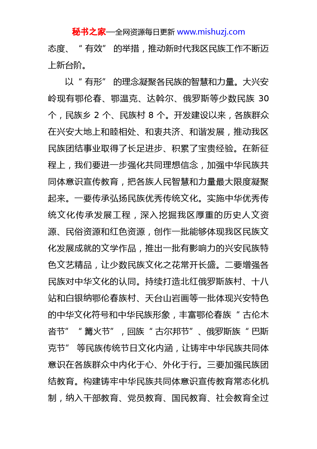 秘书之家—全网资源每日更新www.mishuzj.com把牢政治方向紧扣工作主线奋力开创新时代民族工作新局面地委委员、地委秘书长、统战部部长李金龙3月5日,习近平总书记在参加十三届全国人大五次会议内蒙古代表团审议时强调,“不断巩固中华民族共同体思想基础,促进各民族在中华民族大家庭中像石榴籽一样紧紧抱在一起,共同建设伟大祖国,共同创造美好生活。”大兴安岭历史厚重、文化久远、民族众多,历史学家翦伯赞于1961年12月13日在《人民日报》上发表的文章《内蒙访古》“历史的后院”一段中,开篇这样说:“假如呼伦贝尔草原在中国历史上是一个闹市,那么大兴安岭则是中国历史上的一个幽静的后院。”这篇文章是他1961年夏季与叶圣陶、老舍一起到大兴安岭甘河林业局、阿里河林业局考察采风时写的。大兴安岭在先秦、两汉、魏晋南北朝时期,就有肃慎、东胡、乌桓、鲜卑、室韦等少数民族活动,其中一部分是现代大兴安岭少数民族的先祖。可以说大兴安岭是北方少数民族的集中分布区,处理好民族问题、做好民族工作,关系维护国家“两大安全”和兴安转型振兴。我们要深入学习贯彻习近平总书记关于加强和改进民族工作的重要思想,牢牢把握铸牢中华民族共同体意识这条主线,以“有形”的理念、“有感”的秘书之家—全网资源每日更新www.mishuzj.com态度、“有效”的举措,推动新时代我区民族工作不断迈上新台阶。以“有形”的理念凝聚各民族的智慧和力量。大兴安岭现有鄂伦春、鄂温克、达斡尔、俄罗斯等少数民族30个,民族乡2个、民族村8个。开发建设以来,各族群众在兴安大地上和睦相处、和衷共济、和谐发展,推动我区民族团结事业取得了长足进步、积累了宝贵经验。在新征程上,我们要进一步强化共同理想信念,加强中华民族共同体意识宣传教育,把各族人民智慧和力量最大限度凝聚起来。一要传承弘扬民族优秀传统文化。实施中华优秀传统文化传承发展工程,深入挖掘我区厚重的历史人文资源、民俗资源和红色资源,创作一批能够体现我区民族文化发展成就的文学作品,推出一批有影响力的兴安民族特色文艺精品,让少数民族文化之花常开长盛。二要增强各民族对中华文化的认同。持续打造北红俄罗斯族村、十八站和白银纳鄂伦春族村、天台山岩画等一批体现兴安特色的中华文化符号和中华民族形象,丰富鄂伦春族“古伦木沓节”“篝火节”,回族“古尔邦节”、俄罗斯族“巴斯克节”等民族传统节日文化内涵,让铸牢中华民族共同体意识在各族群众中内化于心、外化于行。三要加强民族团结教育。构建铸牢中华民族共同体意识宣传教育常态化机制,纳入干部教育、党员教育、国民教育、社会教育全过秘书之家—全网资源每日更新www.mishuzj.com程,突出抓好青少年这一群体,加强学校思政教育和校园文化建设,推动“三个离不开”“五个认同”在各族青少年心中深深扎根。以“有感”的态度促进各民族交往交流交融。促进各民族广泛交往交流交融,既是党的民族工作理论和实践的智慧结晶,也是推动中华民族共同体建设的重要途径。我们要正确把握好增进共同性、尊重和包容差异性这一民族工作的重要原则,以民族团结进步创建为抓手,激励各民族团结奋斗、拼搏进取,实现团结互助、相亲相爱、共同进步。一要深入开展民族团结进步创建。落实好地委《关于深入持久开展民族团结进步创建、铸牢中华民族共同体意识实施办法》,以机关单位、乡镇村屯、企业学校为主阵地,扎实开展民族团结进步宣传月、民族政策法规进社区、民族文体活动下基层等联谊交流活动,打造边境地区“民族团结示范长廊”,让各族群众形成密不可分的共同体。二要促进民族深度交流融合。通过多种途径鼓励各族群众在民族地区和非民族地区、城市和乡村双向流动,从居住生活、工作学习、文化娱乐等日常环节入手,积极营造各民族共居共学共事共乐的社会条件,推动实现各民族在空间、文化、经济、社会等方面的全方位嵌入。三要加强民族事务治理。将少数民族流动人口纳入城市流动人口服务管理体系,帮助少数民族流动人口解决就业、医疗保秘书之家—全网资源每日更新www.mishuzj.com障、子女就学、法律援助等实际困难,维护少数民族合法权益。以“有效”的举措促进各民族共同繁荣发展。习近平总书记指出,“铸牢中华民族共同体意识,既要做看得见、摸得着的工作,也要做大量‘润物细无声’的事情。”这就需要我们全面落实党的民族政策,支持少数民族和民族乡村加快发展,不断满足各族群众对美好生活的向往。一要大力发展民族特色经济。坚持把加快民族乡村发展摆到更加突出的战略位置,与产业发展、招商引资、项目建设等工作一体谋划、一体推进,通过重点投入、落实政策、项目扶持等措施,大力培育既有民族特色又有规模效益的优势产业,增强民族地区发展内生动力,让民族地区群众共享改革发展成果。二要强化社会民生保障。深入实施兴边富民行动,加大兴边富民行动中心城镇试点争取力度,加快补齐民族乡村道路、通信、供水等基础设施短板,着力改善教育、医疗等公共服务条件,落实好边民补助、守边固防各项政策,不断增强各族群众获得感、幸福感、安全感。三要营造和谐稳定的环境。健全民族领域防范化解风