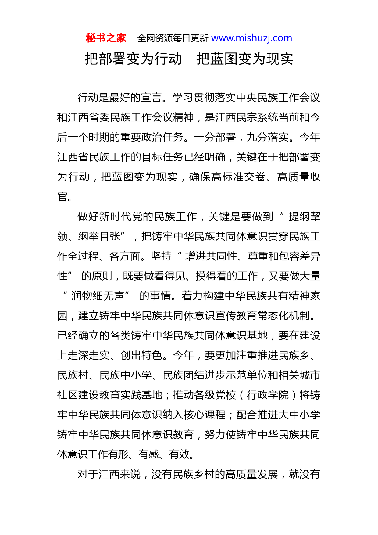 秘书之家—全网资源每日更新www.mishuzj.com把部署变为行动把蓝图变为现实行动是最好的宣言。学习贯彻落实中央民族工作会议和江西省委民族工作会议精神,是江西民宗系统当前和今后一个时期的重要政治任务。一分部署,九分落实。今年江西省民族工作的目标任务已经明确,关键在于把部署变为行动,把蓝图变为现实,确保高标准交卷、高质量收官。做好新时代党的民族工作,关键是要做到“提纲挈领、纲举目张”,把铸牢中华民族共同体意识贯穿民族工作全过程、各方面。坚持“增进共同性、尊重和包容差异性”的原则,既要做看得见、摸得着的工作,又要做大量“润物细无声”的事情。着力构建中华民族共有精神家园,建立铸牢中华民族共同体意识宣传教育常态化机制。已经确立的各类铸牢中华民族共同体意识基地,要在建设上走深走实、创出特色。今年,要更加注重推进民族乡、民族村、民族中小学、民族团结进步示范单位和相关城市社区建设教育实践基地;推动各级党校(行政学院)将铸牢中华民族共同体意识纳入核心课程;配合推进大中小学铸牢中华民族共同体意识教育,努力使铸牢中华民族共同体意识工作有形、有感、有效。对于江西来说,没有民族乡村的高质量发展,就没有秘书之家—全网资源每日更新www.mishuzj.com民族工作的高质量发展。要找准推进高质量发展的切入点和发力点,闯出新路子、形成新特色、取得新成效。在大力推进民族乡村振兴示范方面,各地要选择具备一定基础的民族乡村开展示范,抓点带面推进民族乡村振兴全面展开。科学谋划民族乡村高质量发展的路径和方法,继续落实差别化支持政策,持续加大对产业和就业的扶持力度,真正做到乡有特色产业、村有主打品牌、户有致富项目、人有专业技术。江西省财政近期下达中央和省财政衔接推进乡村振兴补助资金(少数民族发展任务)1000多万元,各设区市要指导县(市、区)合理安排项目,重点向改善民生、促进共同富裕倾斜,优先支持产业发展。各地用于产业发展的资金规模,原则上不低于55%,且不低于去年用于产业发展的资金占比。要加强项目库建设,强化项目实施管理,落实绩效管理要求,提高资金使用效益。去年10月,江西省民族工作领导小组印发《第六轮对口支援民族乡村经济社会发展工作方案》,正式启动新一轮对口支援工作。各设区市民宗局要当好沟通桥梁,协调对口支援单位和受援民族乡村,结合当地比较优势和发展需要,科学编制对口支援方案和年度支援计划,尽快推动对口支援举措落地见效,保障对口支援力度“只能加强、不能削弱”。各设区市和有关重点县(市、区)要积极争秘书之家—全网资源每日更新www.mishuzj.com取,组织开展本级对口支援民族乡村工作,逐步形成对口支援民族乡村三级联动机制。——江西省委统战部副部长、省民宗局局长喻志勇在江西省民族宗教重点工作推进会上说