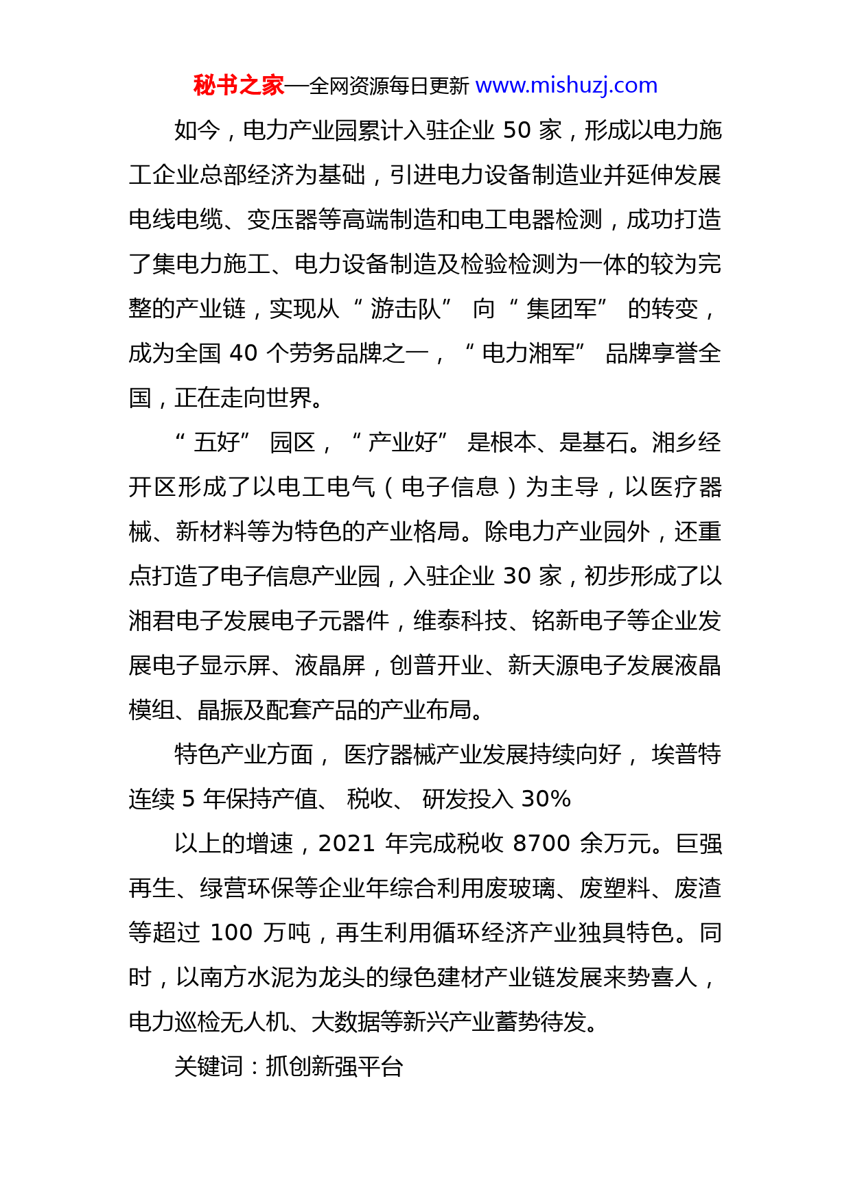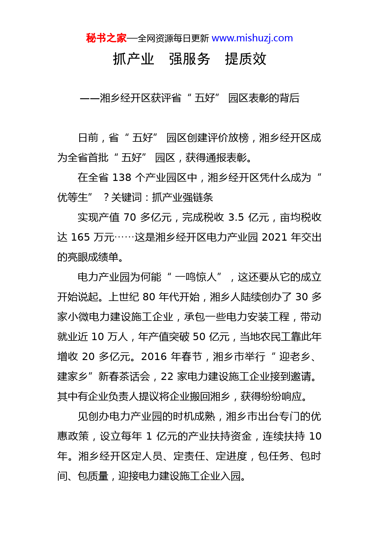 秘书之家—全网资源每日更新www.mishuzj.com抓产业强服务提质效——湘乡经开区获评省“五好”园区表彰的背后日前,省“五好”园区创建评价放榜,湘乡经开区成为全省首批“五好”园区,获得通报表彰。在全省138个产业园区中,湘乡经开区凭什么成为“优等生”?关键词:抓产业强链条实现产值70多亿元,完成税收3.5亿元,亩均税收达165万元这是湘乡经开区电力产业园⋯⋯2021年交出的亮眼成绩单。电力产业园为何能“一鸣惊人”,这还要从它的成立开始说起。上世纪80年代开始,湘乡人陆续创办了30多家小微电力建设施工企业,承包一些电力安装工程,带动就业近10万人,年产值突破50亿元,当地农民工靠此年增收20多亿元。2016年春节,湘乡市举行“迎老乡、建家乡”新春茶话会,22家电力建设施工企业接到邀请。其中有企业负责人提议将企业搬回湘乡,获得纷纷响应。见创办电力产业园的时机成熟,湘乡市出台专门的优惠政策,设立每年1亿元的产业扶持资金,连续扶持10年。湘乡经开区定人员、定责任、定进度,包任务、包时间、包质量,迎接电力建设施工企业入园。秘书之家—全网资源每日更新www.mishuzj.com如今,电力产业园累计入驻企业50家,形成以电力施工企业总部经济为基础,引进电力设备制造业并延伸发展电线电缆、变压器等高端制造和电工电器检测,成功打造了集电力施工、电力设备制造及检验检测为一体的较为完整的产业链,实现从“游击队”向“集团军”的转变,成为全国40个劳务品牌之一,“电力湘军”品牌享誉全国,正在走向世界。“五好”园区,“产业好”是根本、是基石。湘乡经开区形成了以电工电气(电子信息)为主导,以医疗器械、新材料等为特色的产业格局。除电力产业园外,还重点打造了电子信息产业园,入驻企业30家,初步形成了以湘君电子发展电子元器件,维泰科技、铭新电子等企业发展电子显示屏、液晶屏,创普开业、新天源电子发展液晶模组、晶振及配套产品的产业布局。特色产业方面,医疗器械产业发展持续向好,埃普特连续5年保持产值、税收、研发投入30%以上的增速,2021年完成税收8700余万元。巨强再生、绿营环保等企业年综合利用废玻璃、废塑料、废渣等超过100万吨,再生利用循环经济产业独具特色。同时,以南方水泥为龙头的绿色建材产业链发展来势喜人,电力巡检无人机、大数据等新兴产业蓄势待发。关键词:抓创新强平台秘书之家—全网资源每日更新www.mishuzj.com企业创新是发展壮大的“内因”,园区全心全意扶持和引导企业创新是重要“外因”。湘乡经开区从平台打造、政策供给、生态构建等方面持续发力,使科技创新成为驱动引领园区高质量发展的第一动力。在平台打造方面,深化产学研合作补短板。该区创建了国家级创业创新示范基地正润创服、省级工程技术研究中心巨强科技等6个国省平台,促成埃普特与湘雅二医院合作建设介入医疗器械技术中心,振添光学与中南大学合作打造光学玻璃检验检测公共服务平台。引进湖南电器检测所打造中南、西南地区最大的电器检验检测平台。建设前行科创湘乡数字港打造科技创新、金融服务、人才服务、招商服务等产业服务平台。与移动公司合作建设5G智慧园区,打造大数据共享平台。同时在园区实施产业倍增计划,围绕“入规、登高、上市、智造、盘活”,着力培育“独角兽”“小巨人”企业。目前,园区税收过1000万元企业达20家,其中5000万元以上企业4家。新增高新技术企业13家、小巨人企业4家,埃普特、深思电工获批国家专精特新“小巨人”企业。以埃普特为研发生产基地的惠泰医疗在上交所科创板挂牌上市。关键词:抓效能强服务118天实现主体竣工,埃普特新生产基地项目刷新了秘书之家—全网资源每日更新www.mishuzj.com湘乡项目建设的新速度。速度的达成,与湘乡经开区不断优化营商环境、抓效能强服务是分不开的。在项目落地前,湘乡经开区创新实施产业项目闭环审批,提升项目落地速度。涉及产业项目的49项行政审批事项由园区政务服务中心承接实施,实现“园区事园区办”。建立绿色通道,缩减审批时限,立项、施工许可证由原来的5个工作日缩减至当天办理;建设用地规划许可证由7个工作日缩减至3个工作日。项目落地后,湘乡经开区实施“签约即注册、交地即开工”,加快项目建设进度。采取“三个一”代办模式,即提交一张申请表格、一套申报资料、一张身份证,第一时间代办各类项目手续。如维泰科技、路盛达等项目签约当天就办理工商注册、税收登记等有关手续。采取申报资料承诺制,容缺办理企业立项、规划设计、建筑图审等手续,缩短项目落地时间,如投资10亿元的维泰科技项目,建筑面积11.5万平方米,从开工到投产不到1年时间,创造了赶超“深圳速度”的“湘乡加速度”。在项目建设过程中,实施“五个一”工作机制和“三个提前”服务模式,以服务温度护航建设速度。“五个一”帮办服务机制即“一个项目、一个领导、一个项目专员、一个联络员、一个现场监管员”实现一跟到底,及时解决项目推进过程中的困难和问题。“三个提前”服务即秘书之家—全网资源每日更新www.mishuzj.com提前为企业招工培训、提前为企业高管配套公租房后勤服务、提前为企业进行环保及安全生产“三同时”指导,加快项目落地推进。