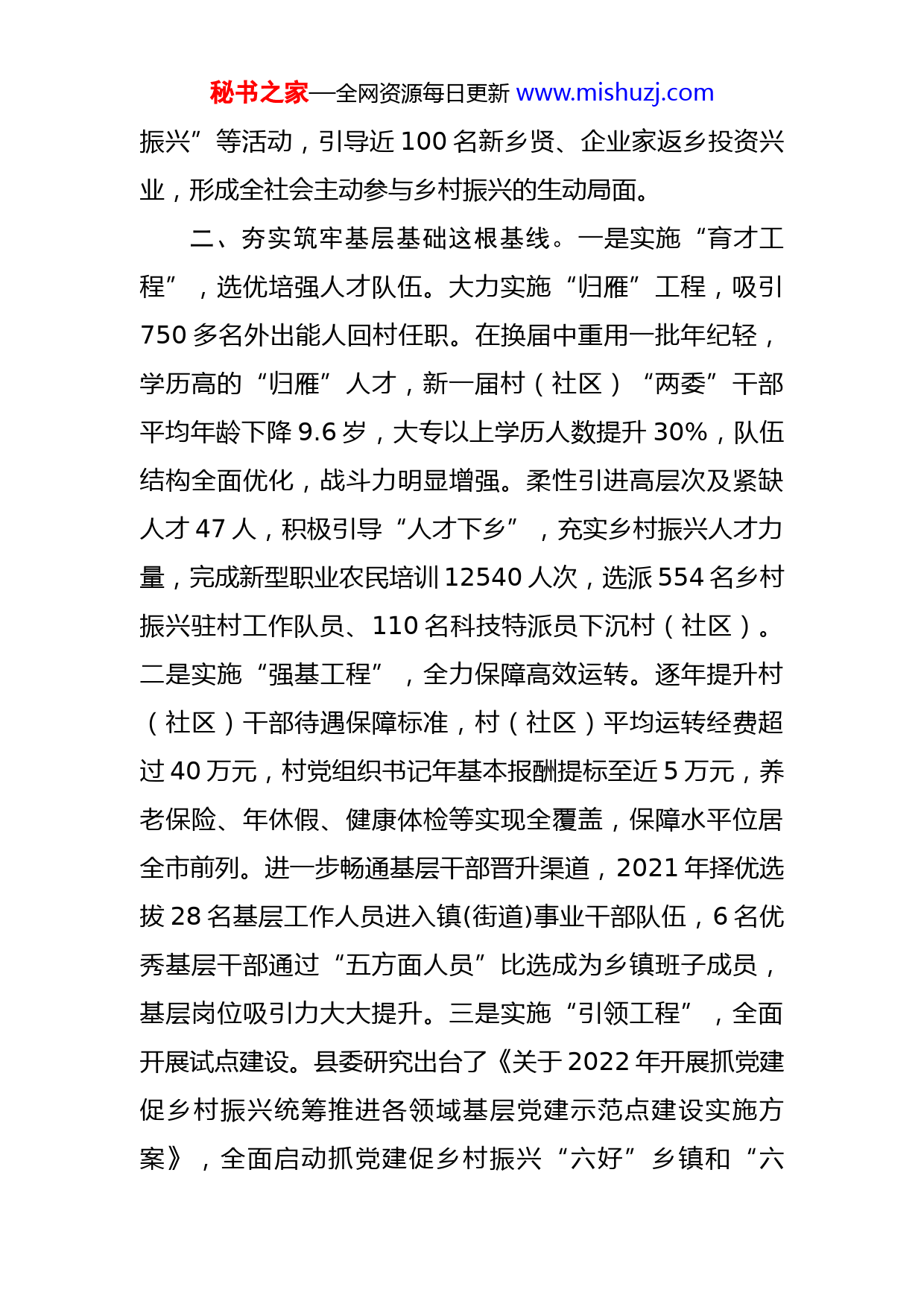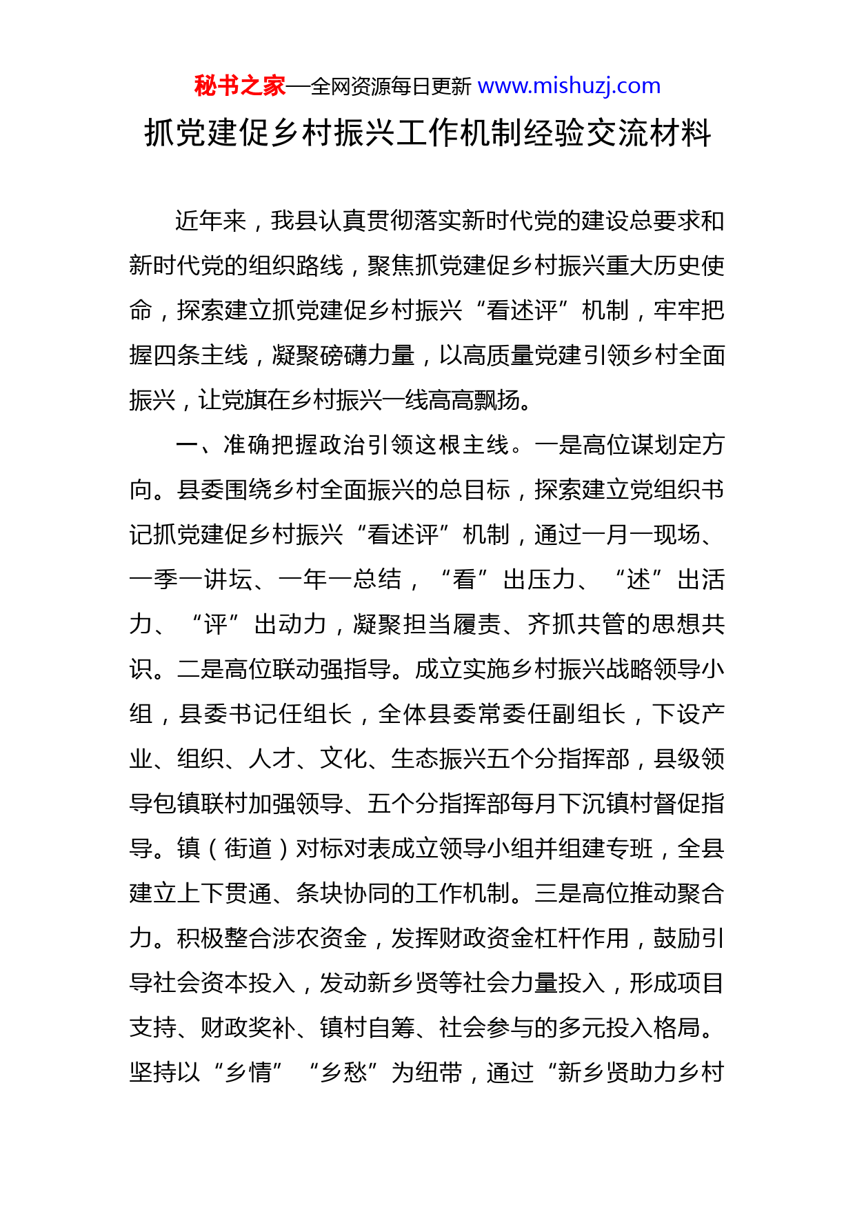 秘书之家—全网资源每日更新www.mishuzj.com抓党建促乡村振兴工作机制经验交流材料近年来,我县认真贯彻落实新时代党的建设总要求和新时代党的组织路线,聚焦抓党建促乡村振兴重大历史使命,探索建立抓党建促乡村振兴“看述评”机制,牢牢把握四条主线,凝聚磅礴力量,以高质量党建引领乡村全面振兴,让党旗在乡村振兴一线高高飘扬。一、准确把握政治引领这根主线。一是高位谋划定方向。县委围绕乡村全面振兴的总目标,探索建立党组织书记抓党建促乡村振兴“看述评”机制,通过一月一现场、一季一讲坛、一年一总结,“看”出压力、“述”出活力、“评”出动力,凝聚担当履责、齐抓共管的思想共识。二是高位联动强指导。成立实施乡村振兴战略领导小组,县委书记任组长,全体县委常委任副组长,下设产业、组织、人才、文化、生态振兴五个分指挥部,县级领导包镇联村加强领导、五个分指挥部每月下沉镇村督促指导。镇(街道)对标对表成立领导小组并组建专班,全县建立上下贯通、条块协同的工作机制。三是高位推动聚合力。积极整合涉农资金,发挥财政资金杠杆作用,鼓励引导社会资本投入,发动新乡贤等社会力量投入,形成项目支持、财政奖补、镇村自筹、社会参与的多元投入格局。坚持以“乡情”“乡愁”为纽带,通过“新乡贤助力乡村秘书之家—全网资源每日更新www.mishuzj.com振兴”等活动,引导近100名新乡贤、企业家返乡投资兴业,形成全社会主动参与乡村振兴的生动局面。二、夯实筑牢基层基础这根基线。一是实施“育才工程”,选优培强人才队伍。大力实施“归雁”工程,吸引750多名外出能人回村任职。在换届中重用一批年纪轻,学历高的“归雁”人才,新一届村(社区)“两委”干部平均年龄下降9.6岁,大专以上学历人数提升30%,队伍结构全面优化,战斗力明显增强。柔性引进高层次及紧缺人才47人,积极引导“人才下乡”,充实乡村振兴人才力量,完成新型职业农民培训12540人次,选派554名乡村振兴驻村工作队员、110名科技特派员下沉村(社区)。二是实施“强基工程”,全力保障高效运转。逐年提升村(社区)干部待遇保障标准,村(社区)平均运转经费超过40万元,村党组织书记年基本报酬提标至近5万元,养老保险、年休假、健康体检等实现全覆盖,保障水平位居全市前列。进一步畅通基层干部晋升渠道,2021年择优选拔28名基层工作人员进入镇(街道)事业干部队伍,6名优秀基层干部通过“五方面人员”比选成为乡镇班子成员,基层岗位吸引力大大提升。三是实施“引领工程”,全面开展试点建设。县委研究出台了《关于2022年开展抓党建促乡村振兴统筹推进各领域基层党建示范点建设实施方案》,全面启动抓党建促乡村振兴“六好”乡镇和“六秘书之家—全网资源每日更新www.mishuzj.com有”村建设、村级集体经济“消薄攻坚、引领提升”八大行动示范建设、整建提质促基层社会治理现代化示范建设、县直单位创“五星”满意机关示范建设、两新党组织创“五优”标杆引领示范建设等五大领域试点示范建设工作。所有试点和示范点均由党员县级领导包联督导,县委组织部专门编印《工作指南》,明确部务会成员和中层骨干具体指导,确保抓出特色、抓出经验、抓出实效。三、抓紧抓实乡村发展这根长线。一是消薄攻坚实现“加速度”。制定出台《XX县关于整体推进“消薄攻坚、引领提升”八大行动发展壮大村级集体经济发展规划》,梳理总结土地流转、资源开发、合作经营等12种发展类型,明确8大类20项具体扶持政策。进一步盘活村级资产资源,促进政策、资金、人才等要素进一步向村(社区)倾斜,聚力打造3个县级、19个镇级集体经济“快进村”,全县120家企业和合作社与98个村建立了利益联结机制,实现村级集体经济增收600余万元,XX西街道向阳社区合理利用闲置资产,创办XX县永盛花画工艺品制造厂,每年为村级增收40万元。二是产业发展呈现“新格局”。依托农业大县的优势,着力打造具有XX县特色的现代产业体系。以洞庭春米业扩产提质、湖南锦绣千村农业合作社“一园两中心”建设等为抓手,确保粮食加工龙头企业创牌争优。推进产业融合发展,以水稻、葡萄产业为秘书之家—全网资源每日更新www.mishuzj.com基础,孕育、催生二三产业,与休闲创意农业、乡村文化旅游、农村电子商务等新产业新业态相融合,延长产业链,提高附加值,促进农业产业现代化。通过土地流转和扶持龙头企业、种养大户等措施,实现全县粮食播种116万亩以上、水产养殖17万亩、生猪出栏80万头;农产品加工企业发展到675家、农民专业合作社750家、家庭农场1193家,2021年营业性收入突破350亿元。四、集中突出基层治理这根专线。一是整建提质把方向。聚焦涉毒、电信网络诈骗等重点问题,发动2万名党员干部参与摸排工作,将重点人员和信访矛盾较多的12个村(社区)确定为软弱涣散党组织,县委主要领导带头包联,县委组织部、政法委、公安局等部门骨干重点指导,确保10月底前全部“转化升级”。按照“软弱涣散整顿与重点问题整治、文明新风创建与重点人员管控、整建提质与无上访村(社区)创建同步推进”的举措推进整建提质专项行动,矛盾纠纷就地化解率提升到95%以上,基本实现“小事不出村、大事不出镇、矛盾不上交”,全县社会大局持续和谐稳定。二是村