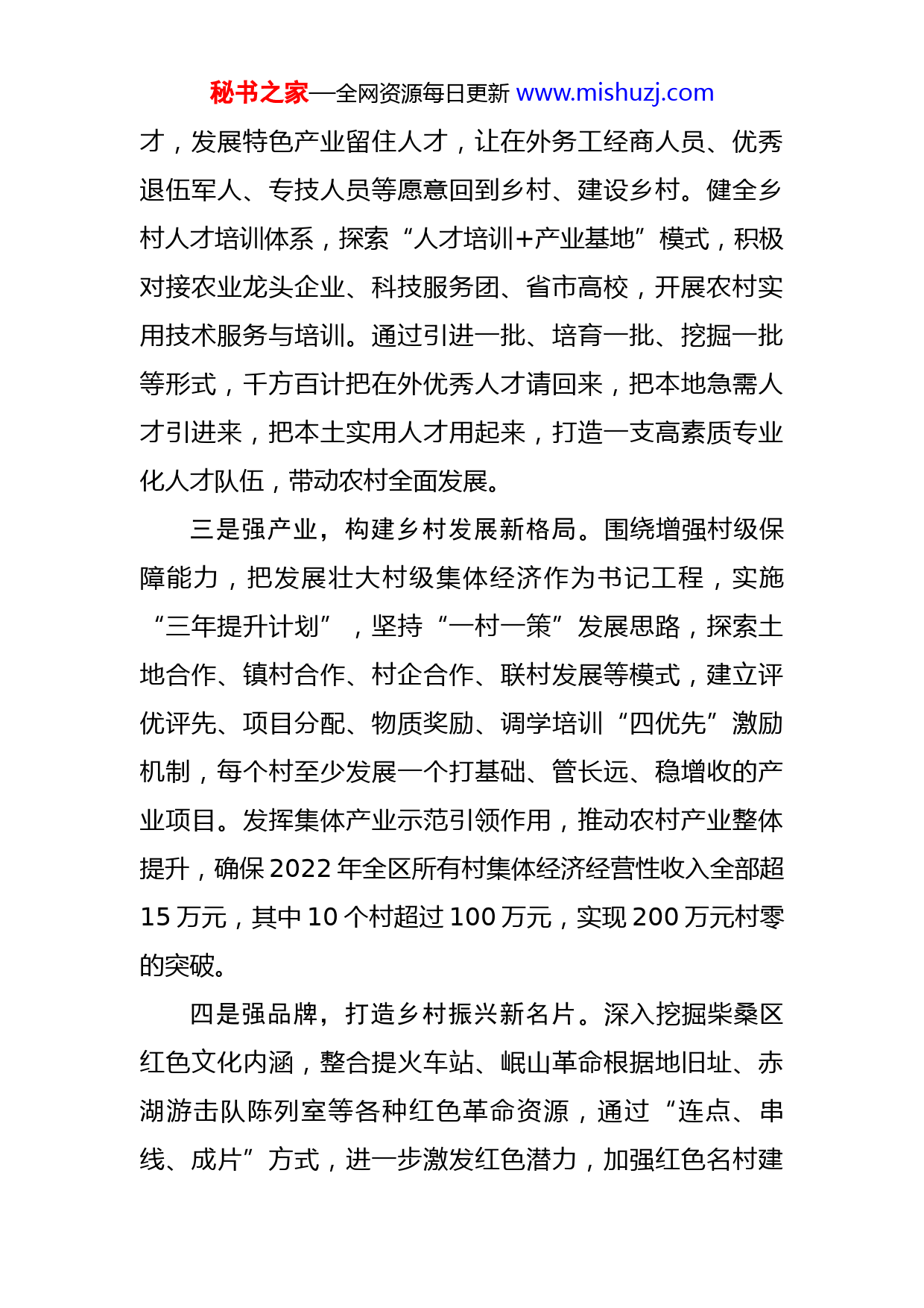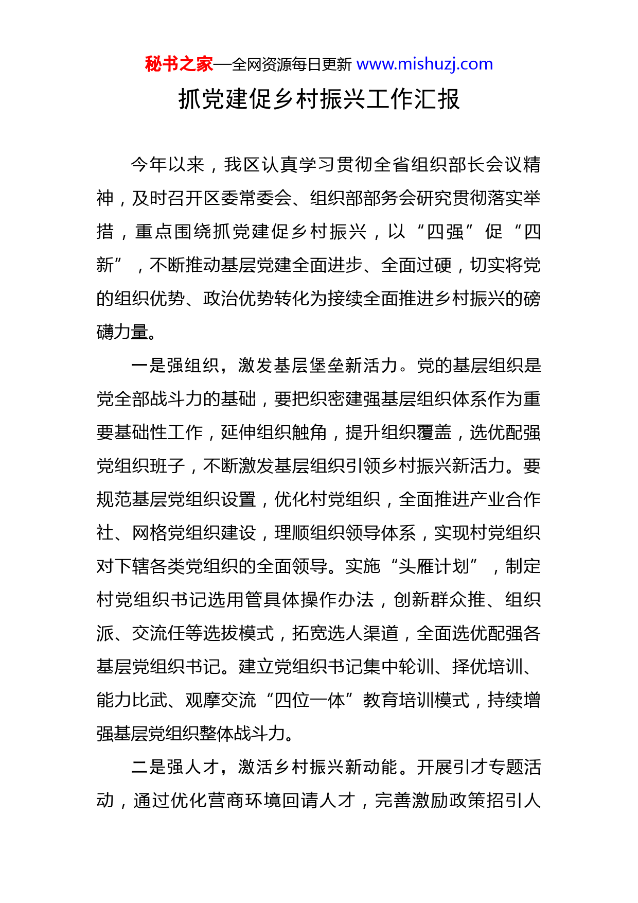 秘书之家—全网资源每日更新www.mishuzj.com抓党建促乡村振兴工作汇报今年以来,我区认真学习贯彻全省组织部长会议精神,及时召开区委常委会、组织部部务会研究贯彻落实举措,重点围绕抓党建促乡村振兴,以“四强”促“四新”,不断推动基层党建全面进步、全面过硬,切实将党的组织优势、政治优势转化为接续全面推进乡村振兴的磅礴力量。一是强组织,激发基层堡垒新活力。党的基层组织是党全部战斗力的基础,要把织密建强基层组织体系作为重要基础性工作,延伸组织触角,提升组织覆盖,选优配强党组织班子,不断激发基层组织引领乡村振兴新活力。要规范基层党组织设置,优化村党组织,全面推进产业合作社、网格党组织建设,理顺组织领导体系,实现村党组织对下辖各类党组织的全面领导。实施“头雁计划”,制定村党组织书记选用管具体操作办法,创新群众推、组织派、交流任等选拔模式,拓宽选人渠道,全面选优配强各基层党组织书记。建立党组织书记集中轮训、择优培训、能力比武、观摩交流“四位一体”教育培训模式,持续增强基层党组织整体战斗力。二是强人才,激活乡村振兴新动能。开展引才专题活动,通过优化营商环境回请人才,完善激励政策招引人秘书之家—全网资源每日更新www.mishuzj.com才,发展特色产业留住人才,让在外务工经商人员、优秀退伍军人、专技人员等愿意回到乡村、建设乡村。健全乡村人才培训体系,探索“人才培训+产业基地”模式,积极对接农业龙头企业、科技服务团、省市高校,开展农村实用技术服务与培训。通过引进一批、培育一批、挖掘一批等形式,千方百计把在外优秀人才请回来,把本地急需人才引进来,把本土实用人才用起来,打造一支高素质专业化人才队伍,带动农村全面发展。三是强产业,构建乡村发展新格局。围绕增强村级保障能力,把发展壮大村级集体经济作为书记工程,实施“三年提升计划”,坚持“一村一策”发展思路,探索土地合作、镇村合作、村企合作、联村发展等模式,建立评优评先、项目分配、物质奖励、调学培训“四优先”激励机制,每个村至少发展一个打基础、管长远、稳增收的产业项目。发挥集体产业示范引领作用,推动农村产业整体提升,确保2022年全区所有村集体经济经营性收入全部超15万元,其中10个村超过100万元,实现200万元村零的突破。四是强品牌,打造乡村振兴新名片。深入挖掘柴桑区红色文化内涵,整合提火车站、岷山革命根据地旧址、赤湖游击队陈列室等各种红色革命资源,通过“连点、串线、成片”方式,进一步激发红色潜力,加强红色名村建秘书之家—全网资源每日更新www.mishuzj.com设,打造党员教育培训和红色旅游矩阵,不断擦亮“红色柴桑”党建新名片。挖掘本地名人、名品、名俗、名胜等“四名”资源,讲好名人故事,开展名品创建,传承优秀名俗,推进名胜保护,打造“四名”乡村振兴品牌,努力将“四名”资源转化为推动产业发展实际效果。