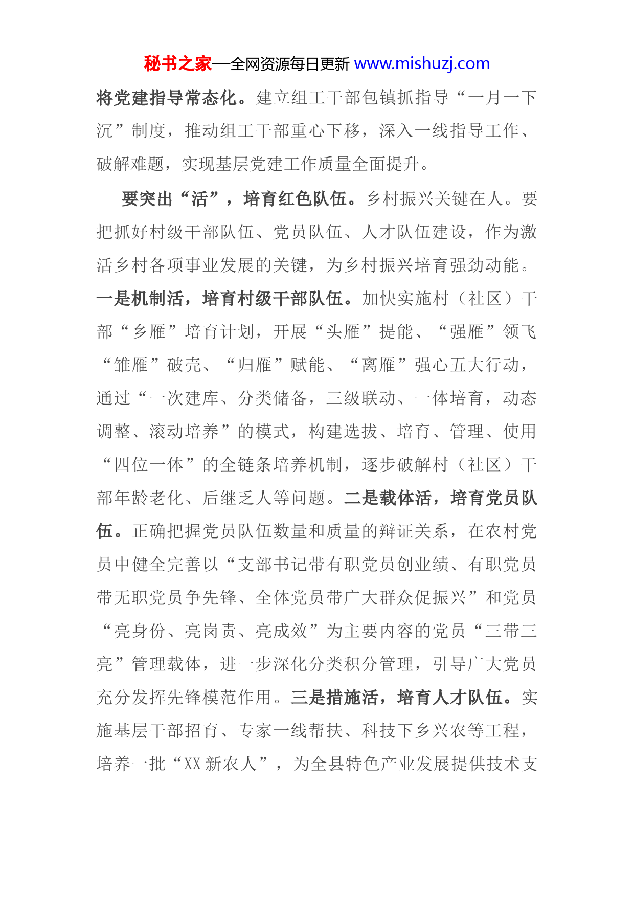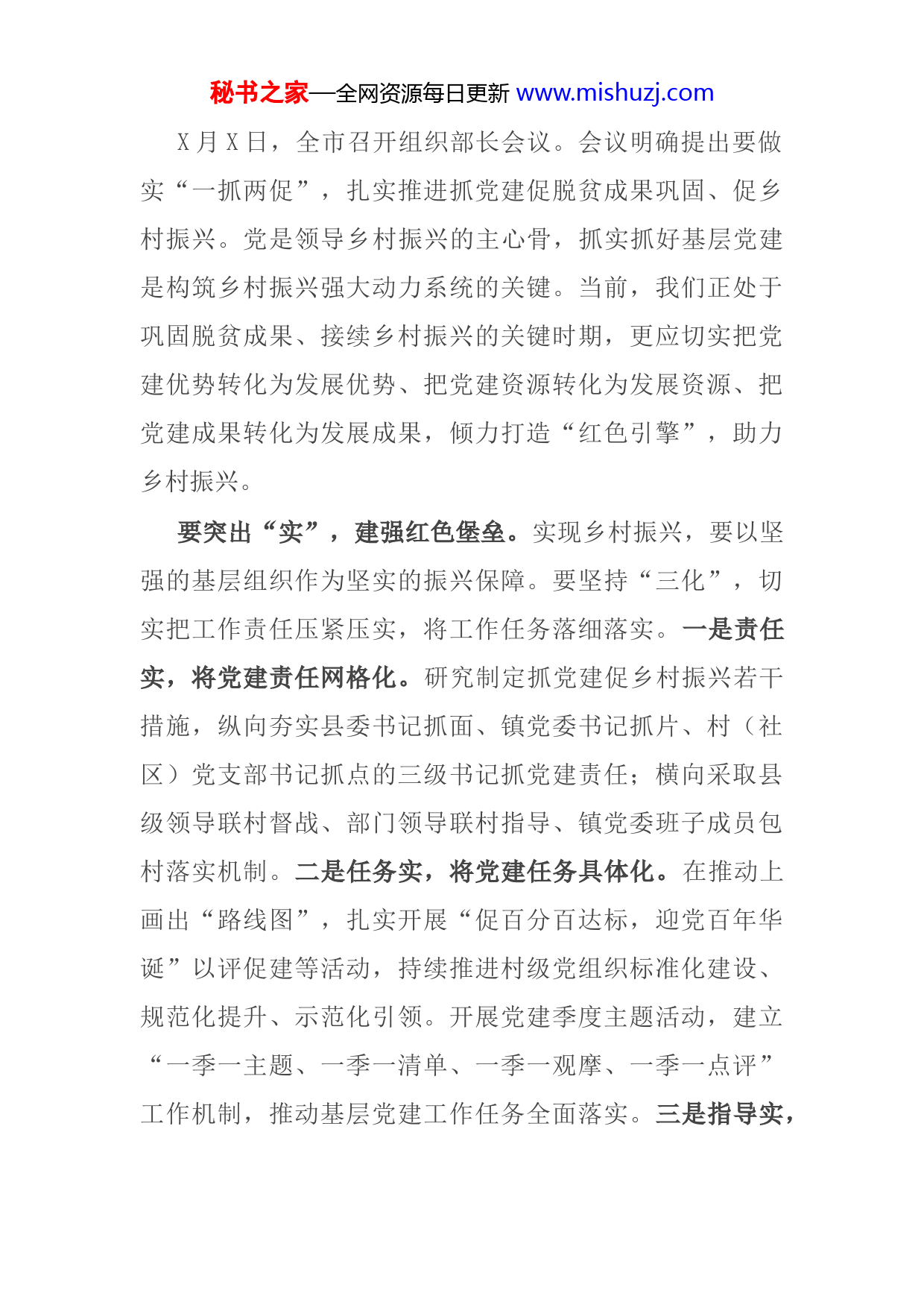 秘书之家—全网资源每日更新www.mishuzj.comX月X日,全市召开组织部长会议。会议明确提出要做实“一抓两促”,扎实推进抓党建促脱贫成果巩固、促乡村振兴。党是领导乡村振兴的主心骨,抓实抓好基层党建是构筑乡村振兴强大动力系统的关键。当前,我们正处于巩固脱贫成果、接续乡村振兴的关键时期,更应切实把党建优势转化为发展优势、把党建资源转化为发展资源、把党建成果转化为发展成果,倾力打造“红色引擎”,助力乡村振兴。要突出“实”,建强红色堡垒。实现乡村振兴,要以坚强的基层组织作为坚实的振兴保障。要坚持“三化”,切实把工作责任压紧压实,将工作任务落细落实。一是责任实,将党建责任网格化。研究制定抓党建促乡村振兴若干措施,纵向夯实县委书记抓面、镇党委书记抓片、村(社区)党支部书记抓点的三级书记抓党建责任;横向采取县级领导联村督战、部门领导联村指导、镇党委班子成员包村落实机制。二是任务实,将党建任务具体化。在推动上画出“路线图”,扎实开展“促百分百达标,迎党百年华诞”以评促建等活动,持续推进村级党组织标准化建设、规范化提升、示范化引领。开展党建季度主题活动,建立“一季一主题、一季一清单、一季一观摩、一季一点评”工作机制,推动基层党建工作任务全面落实。三是指导实,秘书之家—全网资源每日更新www.mishuzj.com将党建指导常态化。建立组工干部包镇抓指导“一月一下沉”制度,推动组工干部重心下移,深入一线指导工作、破解难题,实现基层党建工作质量全面提升。要突出“活”,培育红色队伍。乡村振兴关键在人。要把抓好村级干部队伍、党员队伍、人才队伍建设,作为激活乡村各项事业发展的关键,为乡村振兴培育强劲动能。一是机制活,培育村级干部队伍。加快实施村(社区)干部“乡雁”培育计划,开展“头雁”提能、“强雁”领飞“雏雁”破壳、“归雁”赋能、“离雁”强心五大行动,通过“一次建库、分类储备,三级联动、一体培育,动态调整、滚动培养”的模式,构建选拔、培育、管理、使用“四位一体”的全链条培养机制,逐步破解村(社区)干部年龄老化、后继乏人等问题。二是载体活,培育党员队伍。正确把握党员队伍数量和质量的辩证关系,在农村党员中健全完善以“支部书记带有职党员创业绩、有职党员带无职党员争先锋、全体党员带广大群众促振兴”和党员“亮身份、亮岗责、亮成效”为主要内容的党员“三带三亮”管理载体,进一步深化分类积分管理,引导广大党员充分发挥先锋模范作用。三是措施活,培育人才队伍。实施基层干部招育、专家一线帮扶、科技下乡兴农等工程,培养一批“XX新农人”,为全县特色产业发展提供技术支秘书之家—全网资源每日更新www.mishuzj.com撑。建立县级医疗、教育、科技、文化等人才定期服务乡村制度,支持引导退休专家和干部服务乡村振兴。建立“三级书记抓乡村振兴”“乡村振兴总队长”机制,完善鼓励激励政策措施,引导党员干部扎根乡村、助力振兴。组建村集体经济专家指导服务团,分类选树一批集体经济样板村,发展壮大村级集体经济,强化基层基础保障。要突出“新”,激活红色动能。以党建引领乡村振兴,创新创优创效、打造特色亮点是重点。一是激发创新活力。以开展基层党建创新创效竞赛活动为抓手,通过业务比拼现场展示、以奖代补等形式,激发基层党组织的创新活力打造一批接地气、受欢迎、有实效又能始终走在前列、富有新意的XX党建工作品牌。二是坚持守正创新。既要打造新品牌,又要擦亮老品牌。在全面落实“三联”机制、实施百名村级后备干部培养行动和强基、护航、聚力、暖心睦邻“五大工程”等新品牌的同时,持续深化细化实化“星旗工程”,开展“xx村”竞赛和“五旗党员”评选,不断为“星旗工程”等老品牌赋予新内涵。三是构建创新格局。坚持重点突出,在布局上主攻“关键点”,围绕“一镇十村”乡村振兴示范镇村建设,打造一批党建示范点,创建2条党建引领乡村振兴精品示范带,不断扩大影响力和辐射力。坚持多点发力,鼓励其他镇结合实际、勇于秘书之家—全网资源每日更新www.mishuzj.com探索、善于总结,至少抓好一个党建示范点或一项党建品牌。连点成线、以线扩面,实现点上突破、面上提升,构建全县有目标、镇域有亮点、整体有提升的党建引领乡村振兴新格局。