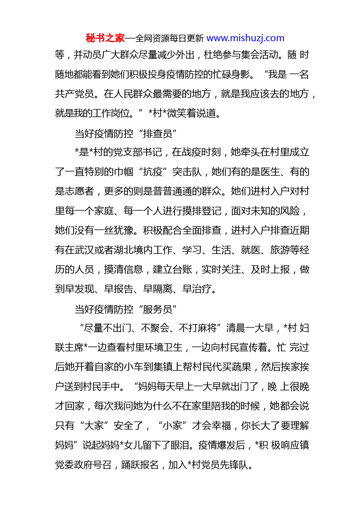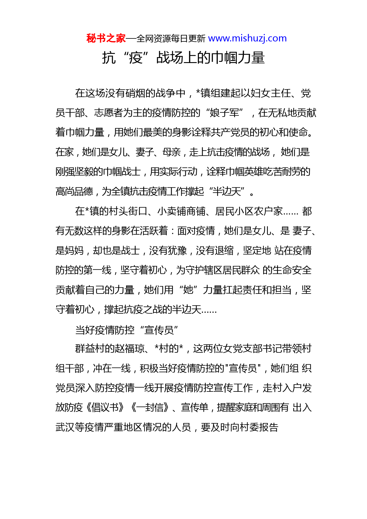 秘书之家—全网资源每日更新www.mishuzj.com抗“疫”战场上的巾帼力量在这场没有硝烟的战争中,镇组建起以妇女主任、党员干部、志愿者为主的疫情防控的“娘子军”,在无私地贡献着巾帼力量,用她们最美的身影诠释共产党员的初心和使命。在家,她们是女儿、妻子、母亲,走上抗击疫情的战场,她们是刚强坚毅的巾帼战士,用实际行动,诠释巾帼英雄吃苦耐劳的高尚品德,为全镇抗击疫情工作撑起“半边天”。在镇的村头街口、小卖铺商铺、居民小区农户家……都有无数这样的身影在活跃着:面对疫情,她们是女儿、是妻子、是妈妈,却也是战士,没有犹豫,没有退缩,坚定地站在疫情防控的第一线,坚守着初心,为守护辖区居民群众的生命安全贡献着自己的力量,她们用“她”力量扛起责任和担当,坚守着初心,撑起抗疫之战的半边天……当好疫情防控“宣传员”群益村的赵福琼、村的,这两位女党支部书记带领村组干部,冲在一线,积极当好疫情防控的"宣传员",她们组织党员深入防控疫情一线开展疫情防控宣传工作,走村入户发放防疫《倡议书》《一封信》、宣传单,提醒家庭和周围有出入武汉等疫情严重地区情况的人员,要及时向村委报告秘书之家—全网资源每日更新www.mishuzj.com等,并动员广大群众尽量减少外出,杜绝参与集会活动。随时随地都能看到她们积极投身疫情防控的忙碌身影。“我是一名共产党员。在人民群众最需要的地方,就是我应该去的地方,就是我的工作岗位。”村微笑着说道。当好疫情防控“排查员”是村的党支部书记,在战疫时刻,她牵头在村里成立了一直特别的巾帼“抗疫”突击队,她们有的是医生、有的是志愿者,更多的则是普普通通的群众。她们进村入户对村里每一个家庭、每一个人进行摸排登记,面对未知的风险,她们没有一丝犹豫。积极配合全面排查,进村入户排查近期有在武汉或者湖北境内工作、学习、生活、就医、旅游等经历的人员,摸清信息,建立台账,实时关注、及时上报,做到早发现、早报告、早隔离、早治疗。当好疫情防控“服务员”“尽量不出门、不聚会、不打麻将”清晨一大早,村妇联主席一边查看村里环境卫生,一边向村民宣传着。忙完过后她开着自家的小车到集镇上帮村民代买蔬果,然后挨家挨户送到村民手中。“妈妈每天早上一大早就出门了,晚上很晚才回家,每次我问她为什么不在家里陪我的时候,她都会说只有“大家”安全了,“小家”才会幸福,你长大了要理解妈妈”说起妈妈女儿留下了眼泪。疫情爆发后,积极响应镇党委政府号召,踊跃报名,加入村党员先锋队。秘书之家—全网资源每日更新www.mishuzj.com在村民心中她是政策“宣传员”、物资“配送员”、情绪“疏导员”,可在她唯一的女儿心里,她却是生活中缺失已久的“假妈妈”。当好疫情防控“战斗员”在镇中心卫生院,由医务人员组成的巾帼“抗疫”突击队每天都24小时连轴转,看护病人、入户给重点人群做好监测是她们的日常。因为连日来的持续作战,很多人的手都被酒精消毒剂腐蚀出了裂口,但她们毫不畏惧,誓把疫情阻断在“门外”。“你们村对进出车辆的详细登记在哪?有没有将了解的情况及时上报?”“请把村里的监测卡点值班人员安排表给我看下,村委对疫情防控做了哪些工作?”镇纪委副书记,一边查看卡点记录情况一边说道。在前线,各个卡点,都有女党员的身影,她们积极奋战在第一线,对所有的车辆进行检测,劝返外来车辆,保障人民群众的健康和安全。当好疫情防控“记录员”镇各村的巾帼志愿者始终坚守防控阵地,数据排查,上报信息、每天晚上加班到深夜,她们弱小的身躯在疫情防控阵地上爆发出巨大的能量。她们尽自己所能活跃在各个卡点在监测点外防输入,走村入户每天对疫区返乡人员及湖北省外返乡,给大家讲道理、测体温、做记录,“抗疫”战秘书之家—全网资源每日更新www.mishuzj.com场上,她们是名副其实的女战士!她们只是镇妇女同志们抗疫的一个缩影。在这场“无硝烟”的战争中,镇广大党员妇女群众,坚守初心,不忘本职;她们用柔弱的身躯,扛起沉甸甸的责任,用无畏的精神,谱写着疫情防控阻击战的巾帼之美。她们相信,大家齐心协力、众志成城定能打赢这场没有硝烟的战争。秘书之家—全网资源每日更新www.mishuzj.com