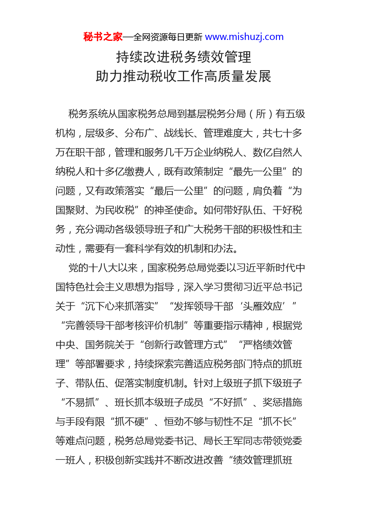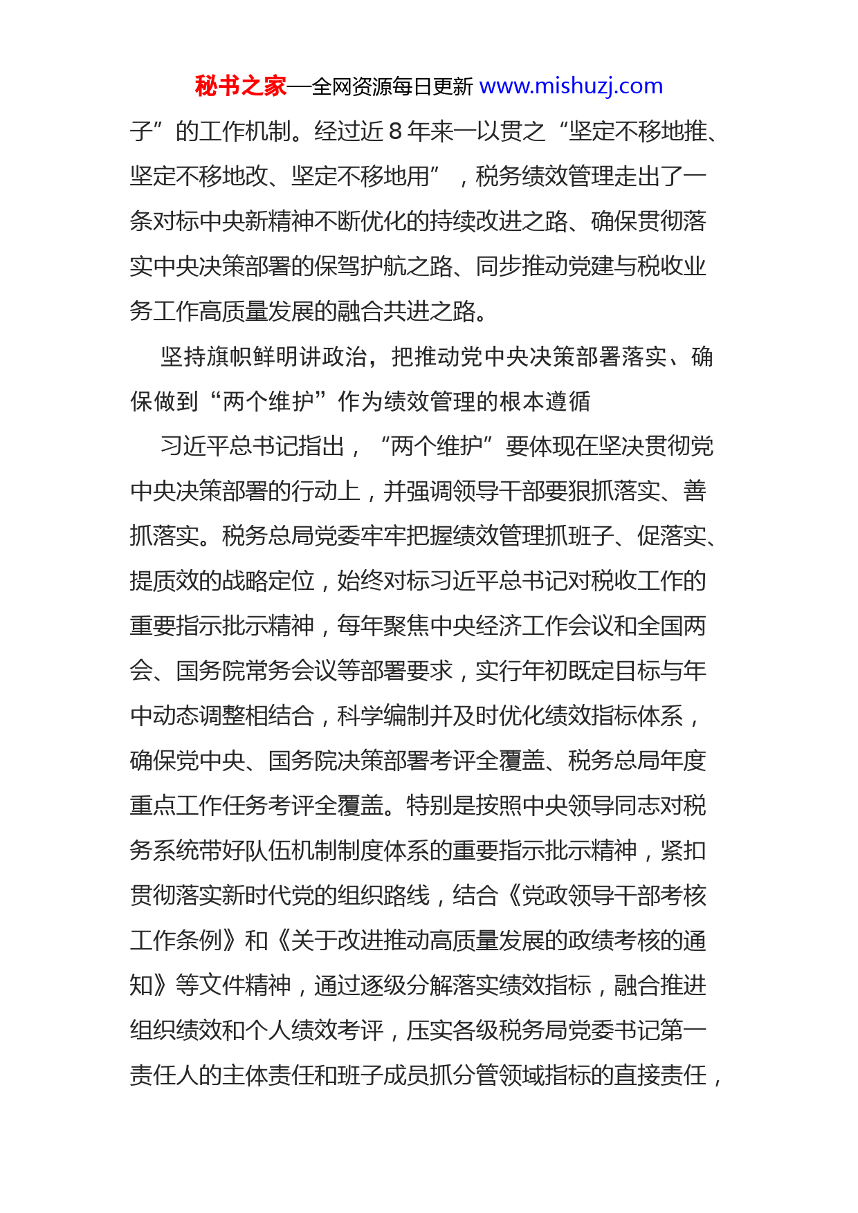 秘书之家—全网资源每日更新www.mishuzj.com持续改进税务绩效管理助力推动税收工作高质量发展税务系统从国家税务总局到基层税务分局(所)有五级机构,层级多、分布广、战线长、管理难度大,共七十多万在职干部,管理和服务几千万企业纳税人、数亿自然人纳税人和十多亿缴费人,既有政策制定“最先一公里”的问题,又有政策落实“最后一公里”的问题,肩负着“为国聚财、为民收税”的神圣使命。如何带好队伍、干好税务,充分调动各级领导班子和广大税务干部的积极性和主动性,需要有一套科学有效的机制和办法。党的十八大以来,国家税务总局党委以习近平新时代中国特色社会主义思想为指导,深入学习贯彻习近平总书记关于“沉下心来抓落实”“发挥领导干部‘头雁效应’”“完善领导干部考核评价机制”等重要指示精神,根据党中央、国务院关于“创新行政管理方式”“严格绩效管理”等部署要求,持续探索完善适应税务部门特点的抓班子、带队伍、促落实制度机制。针对上级班子抓下级班子“不易抓”、班长抓本级班子成员“不好抓”、奖惩措施与手段有限“抓不硬”、恒劲不够与韧性不足“抓不长”等难点问题,税务总局党委书记、局长王军同志带领党委一班人,积极创新实践并不断改进改善“绩效管理抓班秘书之家—全网资源每日更新www.mishuzj.com子”的工作机制。经过近8年来一以贯之“坚定不移地推、坚定不移地改、坚定不移地用”,税务绩效管理走出了一条对标中央新精神不断优化的持续改进之路、确保贯彻落实中央决策部署的保驾护航之路、同步推动党建与税收业务工作高质量发展的融合共进之路。坚持旗帜鲜明讲政治,把推动党中央决策部署落实、确保做到“两个维护”作为绩效管理的根本遵循习近平总书记指出,“两个维护”要体现在坚决贯彻党中央决策部署的行动上,并强调领导干部要狠抓落实、善抓落实。税务总局党委牢牢把握绩效管理抓班子、促落实、提质效的战略定位,始终对标习近平总书记对税收工作的重要指示批示精神,每年聚焦中央经济工作会议和全国两会、国务院常务会议等部署要求,实行年初既定目标与年中动态调整相结合,科学编制并及时优化绩效指标体系,确保党中央、国务院决策部署考评全覆盖、税务总局年度重点工作任务考评全覆盖。特别是按照中央领导同志对税务系统带好队伍机制制度体系的重要指示批示精神,紧扣贯彻落实新时代党的组织路线,结合《党政领导干部考核工作条例》和《关于改进推动高质量发展的政绩考核的通知》等文件精神,通过逐级分解落实绩效指标,融合推进组织绩效和个人绩效考评,压实各级税务局党委书记第一责任人的主体责任和班子成员抓分管领域指标的直接责任,秘书之家—全网资源每日更新www.mishuzj.com引导各级领导干部牢固树立正确政绩观,进一步发挥绩效管理的“指挥棒”“风向标”和“助推器”作用,使绩效管理成为确保新时代党的组织路线和推动高质量发展政绩考核要求在全国税务系统落地见效的重要抓手。经过持续探索实践,不断完善升级包括税务系统绩效管理办法、绩效考评结果运用办法、绩效考评规则在内的绩效管理制度,逐步形成了“4+4+4+N”的税务绩效管理框架体系:考评范围覆盖税务总局各司局、各省级税务局、驻各地特派办、副省级城市税务局“四类对象”;考评事项包括依据中央经济工作会议精神的年初工作部署、全国两会《政府工作报告》涉税内容、年中调整工作任务、其他重点工作“四处来源”;考评指标归为党的全面领导、税收改革发展、工作运转保障、各方多维评价“四大板块”;对需要啃硬骨头的重大改革事项制定“N个专项”考评办法。在具体操作中,紧紧围绕加强党的建设、依法组织税费收入、落实支持国家战略税收政策、深化税务领域“放管服”改革、优化税收营商环境等设置关键性、引领性指标,明确各年度主攻方向和工作着力点,并对营改增改革、国税地税征管体制改革、实施大规模减税降费、个人所得税改革、统筹推进疫情防控和服务经济社会发展等重大任务制定专项考评办法、完善配套考评措施,从压实责任、推动落实、提质增效着眼,明确路线图、时间表、任务书,既考“干秘书之家—全网资源每日更新www.mishuzj.com没干”,对工作进度和完成数量进行考评;更考干得“好不好”,强化年度间重点工作纵向比较,统筹不同地域、不同部门差异因素,对工作质量和实际成效加强考评;既形成持之以恒推进税收现代化建设的“战略地图”,又建立上级抓下级班子、推动税收工作高质量发展的“作战沙盘”,引导“人人讲绩效,事事求绩效”,凝聚起全国税务系统不折不扣贯彻落实党中央、国务院决策部署的强大合力。坚持为民服务办实事,把提高纳税人缴费人和基层满意度作为绩效管理的重要目标人民满意是政绩考核的“硬标准”。税务总局党委认真落实以人民为中心的发展思想,在绩效考评指标体系中坚持以纳税人缴费人和基层满意不满意为标准,将外部评价、内部评价与业绩评价统筹起来,加强“税收营商环境”和“基层满意度”等指标的考评,既突出服务好纳税人缴费人,又促进为基层减负服务好税务人。一方面,将税务部门政务服务“好差评”结果纳入考评,既考省局又考相关司局,加大基