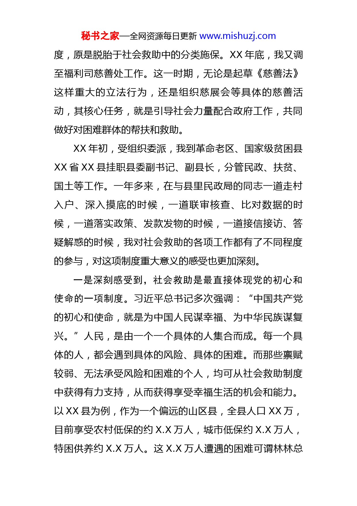 秘书之家—全网资源每日更新www.mishuzj.com挂职民政干部工作汇报为纪念建党100周年,去年X月初,民政部社会救助司党支部克服疫情障碍,跨越空间阻隔,以互联网云端相聚的方式,与XX省民政厅社会救助局、XX县民政局,开展了一次别开生面的主题党日联学联建活动。期间,民政部副部长XX带领大家集体重温了入党誓词;来自部、省、县的十余位领导和同事,分享了在社会救助战线的实践经验和心路历程。我作为民政部派驻XX县的挂职干部,有幸现场参与了此次活动,在聆听大家发言的时候,有感叹、有共鸣、有收获,更激发了一些基于自我体验的思考。我于XX年进入民政部工作,十几年来,虽然没有直接从事过社会救助业务,但却从多角度参与过社会救助事业。XX年,社会救助司的前身最低生活保障司成立,民政部在青岛召开了全国最低生活保障工作会议,我作为办公厅的工作人员参办会务,第一次深入接触社会救助。此后,在办公厅报出的政务信息中,社会救助成为了中办、国办最重视的民政信息之一。XX年,我调至新闻办工作,发现这项工作不仅上级部门关心,新闻媒体乃至社会各界,也都十分关注。XX年底,我调至福利司儿童处。彼时恰逢孤儿保障制度建制,在推动各地出台文件、落实资金的过程中,我慢慢了解到,这项高标准惠及全国孤儿的制秘书之家—全网资源每日更新www.mishuzj.com度,原是脱胎于社会救助中的分类施保。XX年底,我又调至福利司慈善处工作。这一时期,无论是起草《慈善法》这样重大的立法行为,还是组织慈展会等具体的慈善活动,其核心任务,就是引导社会力量配合政府工作,共同做好对困难群体的帮扶和救助。XX年初,受组织委派,我到革命老区、国家级贫困县XX省XX县挂职县委副书记、副县长,分管民政、扶贫、国土等工作。一年多来,在与县里民政局的同志一道走村入户、深入摸底的时候,一道联审核查、比对数据的时候,一道落实政策、发款发物的时候,一道接信接访、答疑解惑的时候,我对社会救助的各项工作都有了不同程度的参与,对这项制度重大意义的感受也更加深刻。一是深刻感受到,社会救助是最直接体现党的初心和使命的一项制度。习近平总书记多次强调:“中国共产党的初心和使命,就是为中国人民谋幸福、为中华民族谋复兴。”人民,是由一个一个具体的人集合而成。每一个具体的人,都会遇到具体的风险、具体的困难。而那些禀赋较弱、无法承受风险和困难的个人,均可从社会救助制度中获得有力支持,从而获得享受幸福生活的机会和能力。以XX县为例,作为一个偏远的山区县,全县人口XX万,目前享受农村低保的约X.X万人,城市低保约X.X万人,特困供养约X.X万人。这X.X万人遭遇的困难可谓林林总秘书之家—全网资源每日更新www.mishuzj.com总、形形色色,但无论其成因和表象如何,社会救助制度都统一地、扎实地保障了他们的基本生活不发生问题,并推动他们得以进一步享受教育、医疗、就业等方面的政策,确保在奔小康的路上一个都不掉队。二是深刻感受到,社会救助是现阶段脱贫攻坚战中具有关键性作用的一项制度。当前,脱贫攻坚战已进入全力冲刺阶段,对于XXX多个已摘帽的贫困县来说,大决战基本告胜,歼灭战如火如荼。而歼灭战中各地最仰仗的政策工具,就是由社会救助构筑的兜底保障。以XX县为例,XX年顺利摘掉了国家级贫困县的帽子,至XX年底全县建档立卡贫困群众为XXX户XXX人,其中未脱贫的还有XXX户XXX人。这XXX人中,除极少数是因为大病、车祸等原因致贫或返贫的外,绝大部分是由于缺乏劳动能力、无法通过产业发展来致富脱贫的,只能通过城乡低保或者特困供养来兜底。因此,社会救助政策的落实情况,对于已摘帽的地方能否冲刺成功、能否兑现歼灭全敌,具有十分关键、甚至决定性的意义。三是深刻感受到,社会救助是服务于“两个一百年”奋斗目标的具有基础性作用的一项制度。党的十九届四中全会明确指出,要“巩固脱贫攻坚成果,建立解决相对贫困的长效机制”。目前,是迎接我们党百岁华诞的前夜,也是宣布全面建成小康社会、实现第一个百年目标的前秘书之家—全网资源每日更新www.mishuzj.com夜。在我们消灭了绝对贫困、向着第二个百年目标加速前进时,各种社会风险仍然有其发生概率,各类社会公众仍然有经受风险、遭遇困难的可能,而对于这部分群体,社会救助制度仍是他们最坚实的依靠。以XX县为例,为了不断提升脱贫成效,在打好歼灭战的同时,又梳理出可能存在返贫风险的两类人群,已脱贫、但收入未超过贫困县X.X倍的脱贫监测户,和收入略高于低保标准的低保边缘户。当他们在生活中遭遇各种风险时,无论是城乡低保、特困供养还是临时救助、慈善救助,都将及时到位,发挥作用。当然,对于未列为监测户或边缘户对象的公众,情况亦然。社会救助制度承载着我们的初心和使命,兑现着民生的公平与正义。快马加鞭未下鞍。在脱贫攻坚战即将全面决胜之际,作为战斗在一线的民政人,我将与县里的同志们一起,继续扎实做好社会救助以及其他各项民政工作,砥砺奋进、昂扬前行!