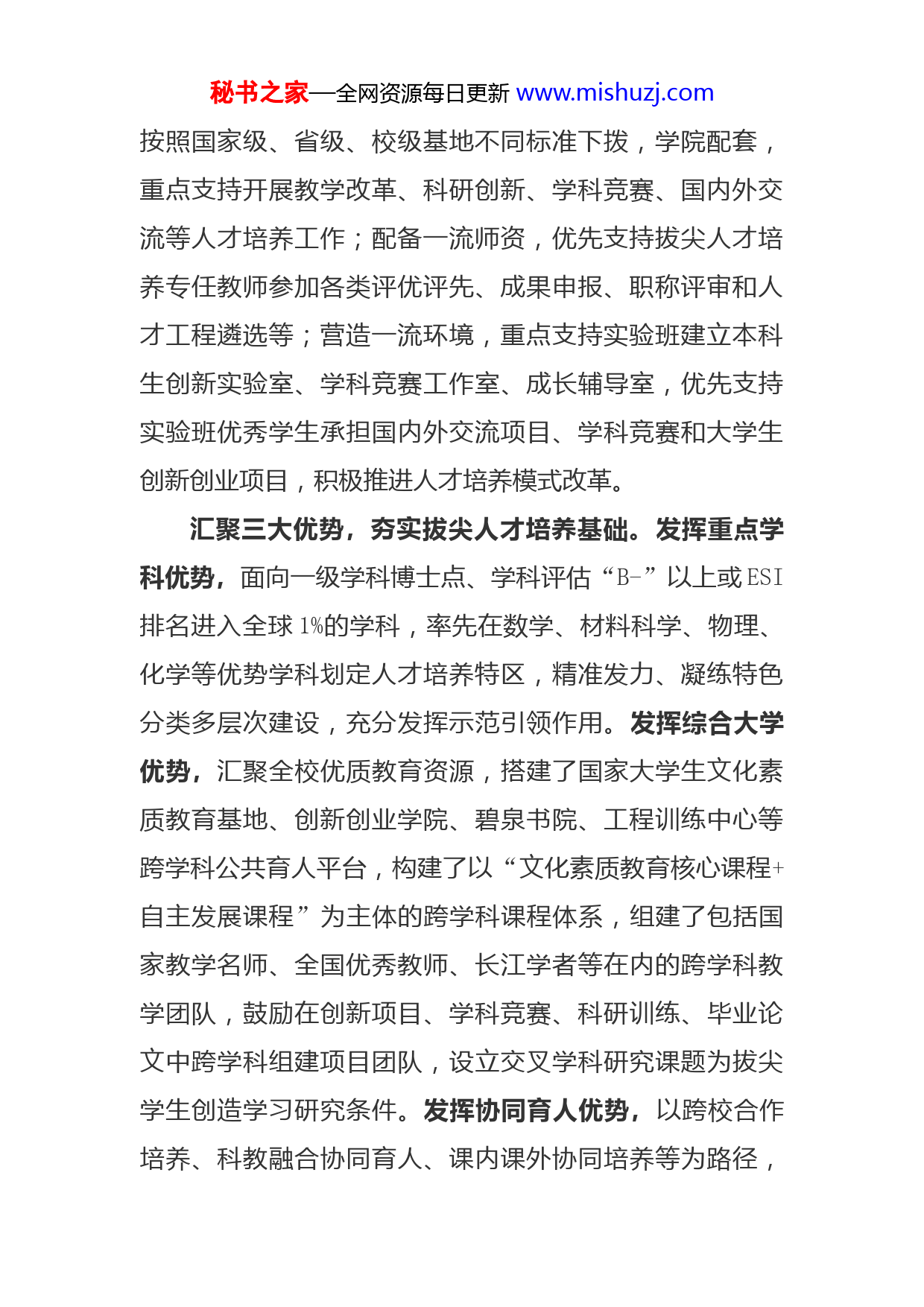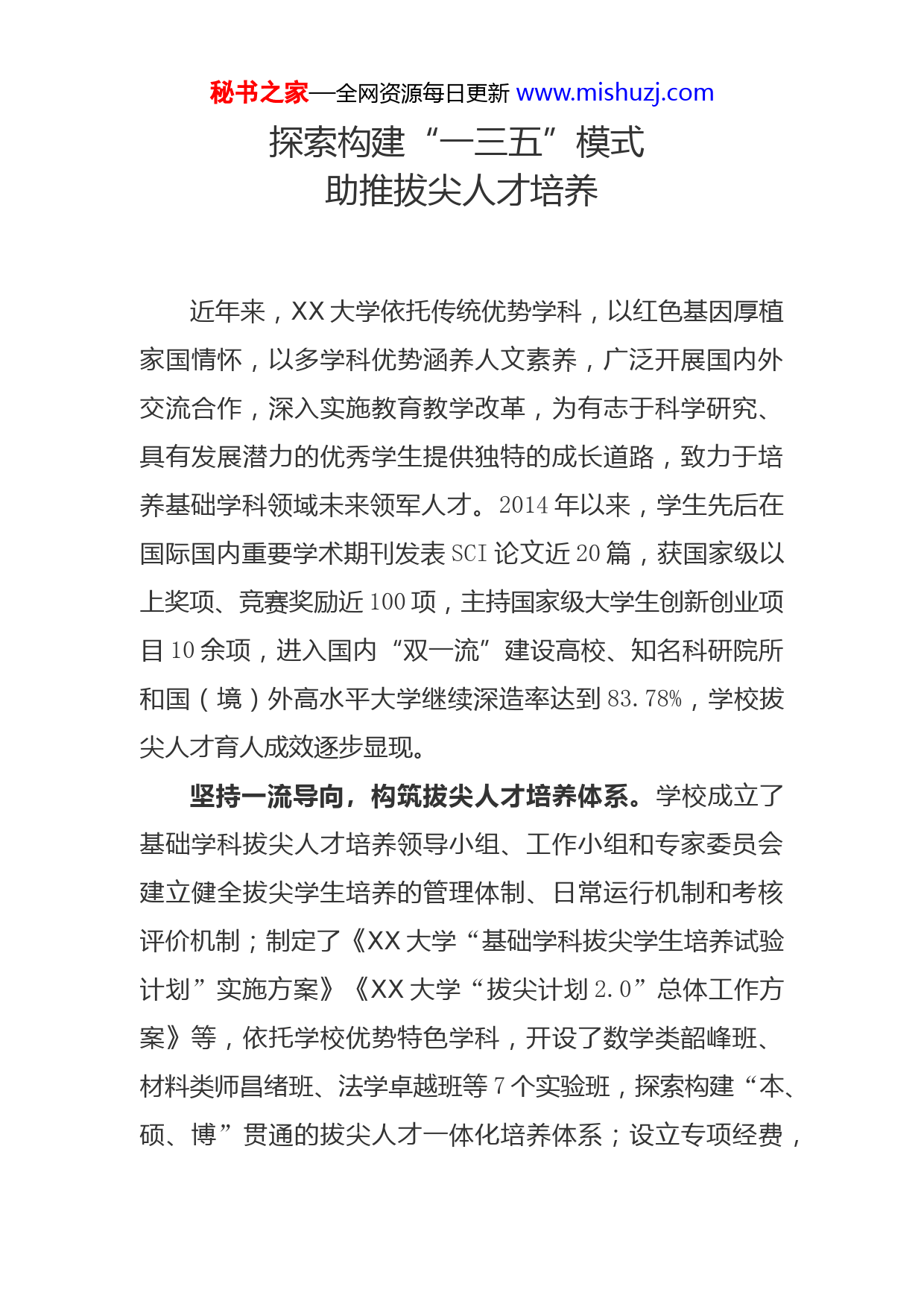 秘书之家—全网资源每日更新www.mishuzj.com探索构建“一三五”模式助推拔尖人才培养近年来,XX大学依托传统优势学科,以红色基因厚植家国情怀,以多学科优势涵养人文素养,广泛开展国内外交流合作,深入实施教育教学改革,为有志于科学研究、具有发展潜力的优秀学生提供独特的成长道路,致力于培养基础学科领域未来领军人才。2014年以来,学生先后在国际国内重要学术期刊发表SCI论文近20篇,获国家级以上奖项、竞赛奖励近100项,主持国家级大学生创新创业项目10余项,进入国内“双一流”建设高校、知名科研院所和国(境)外高水平大学继续深造率达到83.78%,学校拔尖人才育人成效逐步显现。坚持一流导向,构筑拔尖人才培养体系。学校成立了基础学科拔尖人才培养领导小组、工作小组和专家委员会建立健全拔尖学生培养的管理体制、日常运行机制和考核评价机制;制定了《XX大学“基础学科拔尖学生培养试验计划”实施方案》《XX大学“拔尖计划2.0”总体工作方案》等,依托学校优势特色学科,开设了数学类韶峰班、材料类师昌绪班、法学卓越班等7个实验班,探索构建“本、硕、博”贯通的拔尖人才一体化培养体系;设立专项经费,秘书之家—全网资源每日更新www.mishuzj.com按照国家级、省级、校级基地不同标准下拨,学院配套,重点支持开展教学改革、科研创新、学科竞赛、国内外交流等人才培养工作;配备一流师资,优先支持拔尖人才培养专任教师参加各类评优评先、成果申报、职称评审和人才工程遴选等;营造一流环境,重点支持实验班建立本科生创新实验室、学科竞赛工作室、成长辅导室,优先支持实验班优秀学生承担国内外交流项目、学科竞赛和大学生创新创业项目,积极推进人才培养模式改革。汇聚三大优势,夯实拔尖人才培养基础。发挥重点学科优势,面向一级学科博士点、学科评估“B-”以上或ESI排名进入全球1%的学科,率先在数学、材料科学、物理、化学等优势学科划定人才培养特区,精准发力、凝练特色分类多层次建设,充分发挥示范引领作用。发挥综合大学优势,汇聚全校优质教育资源,搭建了国家大学生文化素质教育基地、创新创业学院、碧泉书院、工程训练中心等跨学科公共育人平台,构建了以“文化素质教育核心课程+自主发展课程”为主体的跨学科课程体系,组建了包括国家教学名师、全国优秀教师、长江学者等在内的跨学科教学团队,鼓励在创新项目、学科竞赛、科研训练、毕业论文中跨学科组建项目团队,设立交叉学科研究课题为拔尖学生创造学习研究条件。发挥协同育人优势,以跨校合作培养、科教融合协同育人、课内课外协同培养等为路径,秘书之家—全网资源每日更新www.mishuzj.com加强与国内外科研院所的交流合作,开展国际化培养;实施引智工程,引进一批引领学科发展的知名学者,担任学术导师、举办前沿讲座等;利用校友资源,吸引学生到国内外优秀实验室和科研组学习,实现多方协同培养。创新五项机制,提升拔尖人才培养质量。坚持“使命+创新”的目标引领机制,把传承红色基因转化为拔尖人才培养的精神动力,把学生思想政治素质过硬作为拔尖人才培养的首要目标,遴选思政课名师和专业教师共同参加拔尖人才培养的“课程思政”和“专业思政”建设。坚持“高招+优选”的动态进出机制,直接面向高考考生以拔尖人才计划项目录取,每班每年不超过30人,其中入选国家级基地的不超过20人;完善动态进出管理机制,对不符合要求的学生分流至相同或相近学科专业,对符合条件的学生提供保研、留学、校内“本-博”贯通培养等政策倾斜支持。坚持“经师+人师”的成长辅导机制,注重经师指导,为每位学生选配一名高水平学术导师,量身定制培养方案和课程模块,指导开展科研训练,支持学生提前进课题、进实验室进团队;突出人师引导,选聘一批优秀教师作为学业导师对学生课程学习、日常生活等指导管理。坚持“素质+能力”的个性培养机制,实行小班授课,支持开展研讨式、参与式、体验式和线上线下混合式等教学方法改革;配备指导老师,开展工作室、兴趣小组、科研团队等小组化实秘书之家—全网资源每日更新www.mishuzj.com践教学;搭建学习平台,不断丰富实验室训练、创新创业项目、学科竞赛等自主学习模式,探索形成“课堂教学小班化+实践教学小组化+自主学习多样化”的教学模式。坚持“监控+评估”的持续改进机制,加强质量监控和目标考核,措施不得力、成效不明显的实验班不再享受相关政策和支持;完善毕业生跟踪调查机制和人才成长数据库,优化拔尖人才培养模式和方案;设置专项教改课题,形成一批高质量的理论实践成果,为拔尖计划深入实施提供支持。
