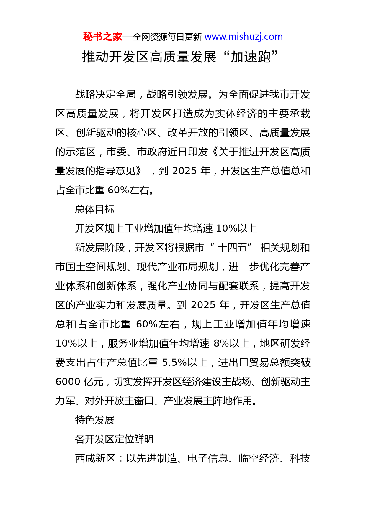 秘书之家—全网资源每日更新www.mishuzj.com推动开发区高质量发展“加速跑”战略决定全局,战略引领发展。为全面促进我市开发区高质量发展,将开发区打造成为实体经济的主要承载区、创新驱动的核心区、改革开放的引领区、高质量发展的示范区,市委、市政府近日印发《关于推进开发区高质量发展的指导意见》,到2025年,开发区生产总值总和占全市比重60%左右。总体目标开发区规上工业增加值年均增速10%以上新发展阶段,开发区将根据市“十四五”相关规划和市国土空间规划、现代产业布局规划,进一步优化完善产业体系和创新体系,强化产业协同与配套联系,提高开发区的产业实力和发展质量。到2025年,开发区生产总值总和占全市比重60%左右,规上工业增加值年均增速10%以上,服务业增加值年均增速8%以上,地区研发经费支出占生产总值比重5.5%以上,进出口贸易总额突破6000亿元,切实发挥开发区经济建设主战场、创新驱动主力军、对外开放主窗口、产业发展主阵地作用。特色发展各开发区定位鲜明西咸新区:以先进制造、电子信息、临空经济、科技秘书之家—全网资源每日更新www.mishuzj.com研发、文化旅游、总部经济为重点,以创新城市发展方式试验为统领,以秦创原创新驱动发展平台总窗口、西安国际航空枢纽建设为契机,打造我国向西开放的重要枢纽、西部大开发的新引擎和中国特色新型城镇化的范例。西安高新区:以光电子、汽车、智能制造、生物医药、新能源新材料为重点,聚力建设国家自主创新示范区、国家硬科技创新示范区,围绕建设“国家科技自立自强的战略支点、陕西高质量发展的重要支撑、西安国家中心城市建设的价值高地”,打造世界领先科技园区。西安经开区:以汽车、新材料新能源、装备制造、电子信息为重点,围绕国家科技创新示范区、国家先进制造业示范区、国家军民融合示范基地、国家产城融合发展示范区等建设目标,打造国际一流创新型经济技术开发区。西安曲江新区:以文旅融合发展为主攻方向,围绕现代文化产业发展、新型文商旅融合消费、大遗址保护利用、传统文化展示等,大力发展文旅商贸产业,打造文旅融合高质量发展示范区和新时代品质生活样板区。西安国际港务区:以发展临港经济为主攻方向,重点发展智能制造、商贸物流、数字经济、现代金融、文旅体育等产业,加快建设中欧班列(西安)集结中心和陆港型国家物流枢纽,打造面向中亚南亚西亚国家贸易物流商事服务通道和面向“一带一路”沿线国家的枢纽经济示范秘书之家—全网资源每日更新www.mishuzj.com区。西安浐灞生态区:以西安国际生态会展城为依托,重点发展会议会展、文化旅游、现代金融、数字经济等产业,打造具有国际影响力丝绸之路经济带沿线人文交流、特色会展功能聚集区。西安航天基地:以民用航天、新能源、大数据、人工智能及智能终端等数字经济产业为重点,聚焦航天科技创新中心、光伏新能源产业创新中心,推进融合创新,打造具有全球影响力的航天新城。西安航空基地(富阎产业合作园区):以航空制造为重点,加快国际先进、国内一流的飞机综合研制生产应用基地建设。围绕建设中国航空新城总目标,打造西安市先进制造业强市的重要承载地、有全球影响力的航空先进制造集聚区和航空国际合作样板区。富阎产业合作园区围绕航空制造与维修等产业,打造区域合作发展示范区。创新发展2025年开发区高新技术企业占全市75%大力推进产业技术创新。以全面创新改革试验区为牵引,进一步强化产业技术创新,高标准抓好国家硬科技创新示范区、国家新一代人工智能创新发展试验区建设。进一步发展市场创新主体,大力培育创新型领军企业和高新技术企业,打造创新型企业集群,到2025年,开发区高秘书之家—全网资源每日更新www.mishuzj.com新技术企业达到9000家,占全市总数的75%。围绕产业链部署创新链,实施支柱产业创新链建设工程,大力推动产学研联合攻关,突破一批关键核心技术,形成一批引领产业发展的标准。围绕创新链布局产业链,实施重大科技成果产业化工程,推广“一院一所”模式,加快推进校地、院地深度融合,实现协同发展。大力推动科技成果在开发区的转化落地。加快建设创新驱动平台。开发区要聚焦打造立体联动“孵化器”、成果转化“加速器”和两链融合“促进器”三大目标,聚集优势创新资源,积极融入秦创原创新驱动平台建设。争取重大科技基础设施在开发区建设布局,推动大型仪器设备开放共享,服务区域经济发展。积极参与秦岭国家实验室创建,推动高精度地基授时系统、国家超算(西安)中心等重大科研设施建成投用,高水平推进丝路科学城建设,争创综合性国家科学中心和国家科技创新中心。大力发展新型研发机构,支持开发区申建技术创新中心、产业创新中心和工程研究中心等国家级、省级创新平台。结合重点产业和优势领域,有效组织整合产、学、研和资本资源,建设具有集成赋能能力的专业化众创空间和孵化器。“十四五”期间,全市开发区新增各级各类创新平台650家以上。鼓励各类主体加强开放合作和体制机制融合,鼓励领军企业牵头建立“创新联合秘书之家—全网资源每日更新www.mishuzj.com体”。集群化发展2025年新增省级以上专精特新企业300家开发区将聚焦主导产业和重点产业领域,促