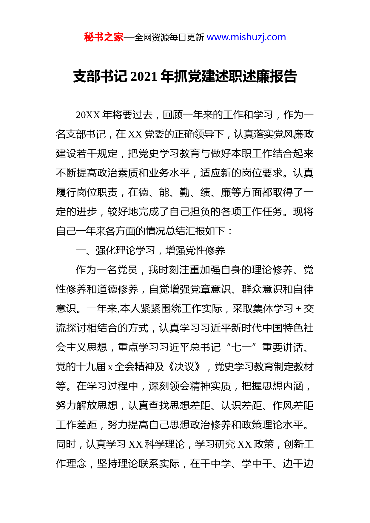 秘书之家—全网资源每日更新www.mishuzj.com支部书记2021年抓党建述职述廉报告20XX年将要过去,回顾一年来的工作和学习,作为一名支部书记,在XX党委的正确领导下,认真落实党风廉政建设若干规定,把党史学习教育与做好本职工作结合起来不断提高政治素质和业务水平,适应新的岗位要求。认真履行岗位职责,在德、能、勤、绩、廉等方面都取得了一定的进步,较好地完成了自己担负的各项工作任务。现将自己一年来各方面的情况总结汇报如下:一、强化理论学习,增强党性修养作为一名党员,我时刻注重加强自身的理论修养、党性修养和道德修养,自觉增强党章意识、群众意识和自律意识。一年来,本人紧紧围绕工作实际,采取集体学习+交流探讨相结合的方式,认真学习习近平新时代中国特色社会主义思想,重点学习习近平总书记“七一”重要讲话、党的十九届x全会精神及《决议》,党史学习教育制定教材等。在学习过程中,深刻领会精神实质,把握思想内涵,努力解放思想,认真查找思想差距、认识差距、作风差距工作差距,努力提高自己思想政治修养和政策理论水平。同时,认真学习XX科学理论,学习研究XX政策,创新工作理念,坚持理论联系实际,在干中学、学中干、边干边秘书之家—全网资源每日更新www.mishuzj.com学、边学边干,学以致用,不断提高自己运用科学理论分析和解决实际问题的能力,提高自己判断形势、驾驭局面统领工作的能力。一年来,本人坚持用习近平新时代中国特色社会主义思想武装头脑,指导实践,推动工作,坚定不移地在思想上、政治上、行动上同党中央保持高度一致坚决贯彻执行党的方针、政策,坚决执行地委、行署的决议、决定,自觉的投身于XX高质量发展工作中。二、对照廉政准则,提升廉洁自律意识一年来,本人认真遵守党章,严格执行党纪;按照权为民所用、情为民所系、利为民所谋的要求,严格要求自己,树立正确的权利观、地位观、利益观,坚决抵制拜金主义、享乐主义、极端个人主义等腐朽思想;常修为政之德,常思贪欲之害,常怀律己之心,常戒非分之想;耐得住清贫,守得住寂寞,不行偏袒之事,不图非分之财,始终做到自重、自省、自警、自励,保持良好操守;遵守原则,秉公办事,以身作则,严以律己;要求下级做的,自己首先做到,要求下级不做的,自己坚决不做;坚持做老实人,说老实话,办老实事;坚持真诚待人,正直处世。认真落实党风廉政建设责任制,认真遵守《领导干部廉洁从政若干准则》和廉洁自律的各项规章制度,自觉增强廉洁自律意识,规范从政行为,做到了以身作则、清正廉洁取信于民、艰苦朴素、勤奋工作,处处以党员先锋模范作秘书之家—全网资源每日更新www.mishuzj.com用要求自己,树立了良好的党员领导干部形象。三、从严从实,持续加强作风建设本人认真遵守民主集中制原则,按照民主集中制的要求决策和处理问题;服从组织安排,执行党组决定,坚决维护党组织的团结;按照工作分工,全力协助、配合、支持党委工作,努力做好自己的分管工作;坚持重大问题及时向上级主管部门请示汇报,一般事务和属自己职权范围的事情大胆决策;始终坚持做到摆正位子,当好配角,做好参谋和助手。按照集体领导与分工负责的原则,大胆开展工作,与班子成员加强沟通、密切协作,坚持做到互相配合不争权,相互信任不猜疑,相互支持不拆台,相互体谅不推诿。能够牢固树立责任意识,落实工作责任制,坚持原则,严格管理,严谨细致,勤奋敬业。在日常工作中认真听取基层单位和有关科室意见,诚恳接受组织和群众的监督批评,坚持批评与自我批评,虚心向同志们学习,坚持严以律己,宽以待人;在原则问题上讲真理,不讲面子,在一些非原则的小事上讲风格,求同存异,互尊互谅对别人的弱点不苛求指责,对别人的过失不耿耿于怀,对下属努力做到在生活上多关心,在感情上多交流,努力营造宽松、和谐、积极、向上的工作氛围。四、履职尽责,抓好工作落实一年来,本人在工作中注重培养分析问题和解决问题秘书之家—全网资源每日更新www.mishuzj.com的能力,注重提高管理、组织、决策、执行能力;对工作中出现的各种复杂问题能够运用习近平新时代中国特色社会主义思想的立场、观点和方法,分析、研究、解决;大胆创新工作思路,不断增强创新能力,采取灵活多样的工作方式,推进各项工作有序开展;充分尊重群众的首创精神,充分调动大家的工作积极性和主动性,增强凝聚力和向心力,形成合力,有效的提高工作质量和效率。在工作中,本人带领科室人员,认真贯彻落实省委会议精神、行署的决议、决策,紧紧围绕加快转变经济发展方式这个中心,不断创新财政管理体制,加大XX监管力度,增强运行的科学性、规范性、安全性和有效性,加强管理工作;推进节能减排和新能源产业发展,支持发展循环经济;完善粮食补贴政策,加强粮食生产能力建设;抓好扩大消费、惠民补贴等政策落实,坚持服务民生;构建政府信用平台管理新机制,支持地区中小企业和交通事业跨越式发展;加强机关效能建设,提高服务质量和水平,为地区跨越式发展和长治久安做出积极努力。坚持重实际、说实话、出实招、办实事,不断改进工作作风,提高工作效率,对每项工作努力做到尽职、尽责、尽力,敢于负责,勇于担当大胆决断,不推诿、不扯皮,切实做到识大体,顾大局。努力做到方向明、政策清、