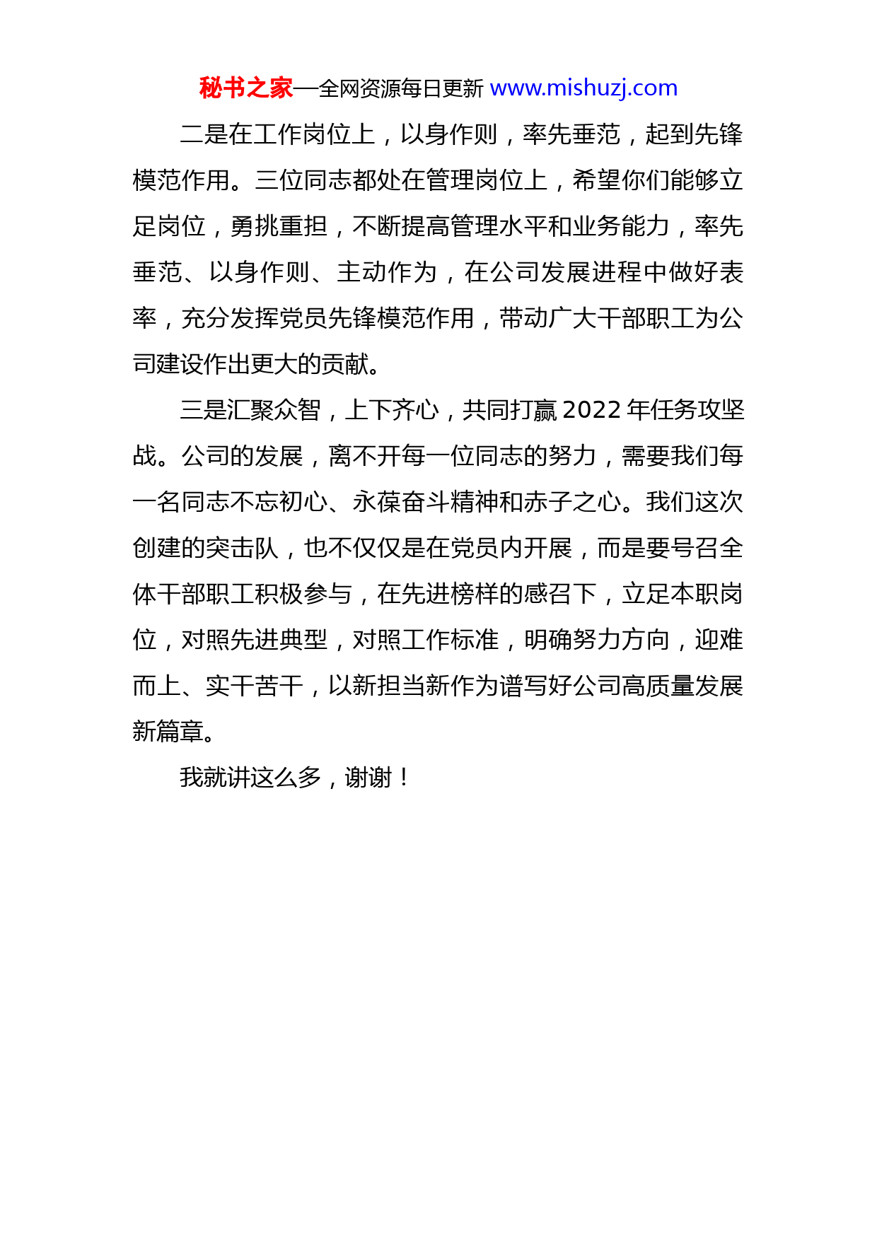 秘书之家—全网资源每日更新www.mishuzj.com支部书记在党员大会上的讲话各位党员同志:今天我们召开党员大会,表决通过XXX同志按期转为正式党员,接收XXX同志为预备党员,这标志着三位同志的政治生命有了新的开始,有了新的起点。我代表公司党支部向你们两位同志表示衷心地祝贺,希望你们站在新的起点上,要更加严格要求自己。此外我们举行了突击队授旗仪式,各突击队代表激情昂扬,我能感受到大家的信心、决心,希望各支突击队切实发挥攻坚克难的先锋作用,奋力完成突击任务。为做好下一阶段工作,借此机会,我代表党支部提几点希望和要求,与大家共勉:一是要不断增强入党的光荣感和责任感,坚定对党的理想信念,永葆正确的政治方向。坚定理想信念,对于一名党员来说,具有极端重要性;对党忠诚,是共产党人一生的追求。对党忠诚,第一位的就是要忠诚于党的信仰,自觉为实现党的理想信念而奋斗。一名党员只有把好了世界观、人生观、价值观这个“总开关”,只有坚定了理想信念,才能自觉坚持正确的政治方向,在大是大非面前旗帜鲜明,在风浪考验面前无所畏惧,在各种诱惑面前立场坚定,在关键时刻毫不含糊,永葆共产党人的政治本色。秘书之家—全网资源每日更新www.mishuzj.com二是在工作岗位上,以身作则,率先垂范,起到先锋模范作用。三位同志都处在管理岗位上,希望你们能够立足岗位,勇挑重担,不断提高管理水平和业务能力,率先垂范、以身作则、主动作为,在公司发展进程中做好表率,充分发挥党员先锋模范作用,带动广大干部职工为公司建设作出更大的贡献。三是汇聚众智,上下齐心,共同打赢2022年任务攻坚战。公司的发展,离不开每一位同志的努力,需要我们每一名同志不忘初心、永葆奋斗精神和赤子之心。我们这次创建的突击队,也不仅仅是在党员内开展,而是要号召全体干部职工积极参与,在先进榜样的感召下,立足本职岗位,对照先进典型,对照工作标准,明确努力方向,迎难而上、实干苦干,以新担当新作为谱写好公司高质量发展新篇章。我就讲这么多,谢谢!
