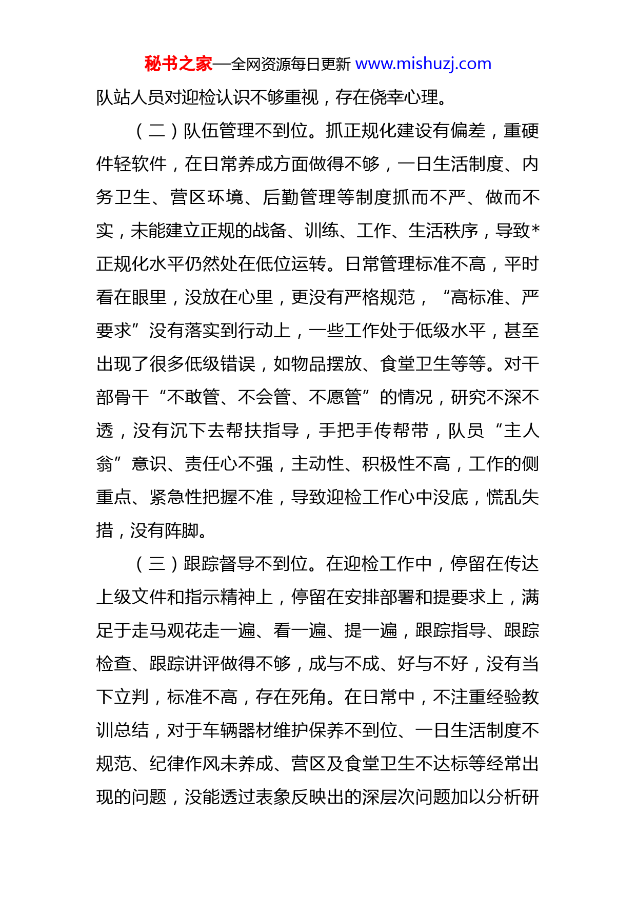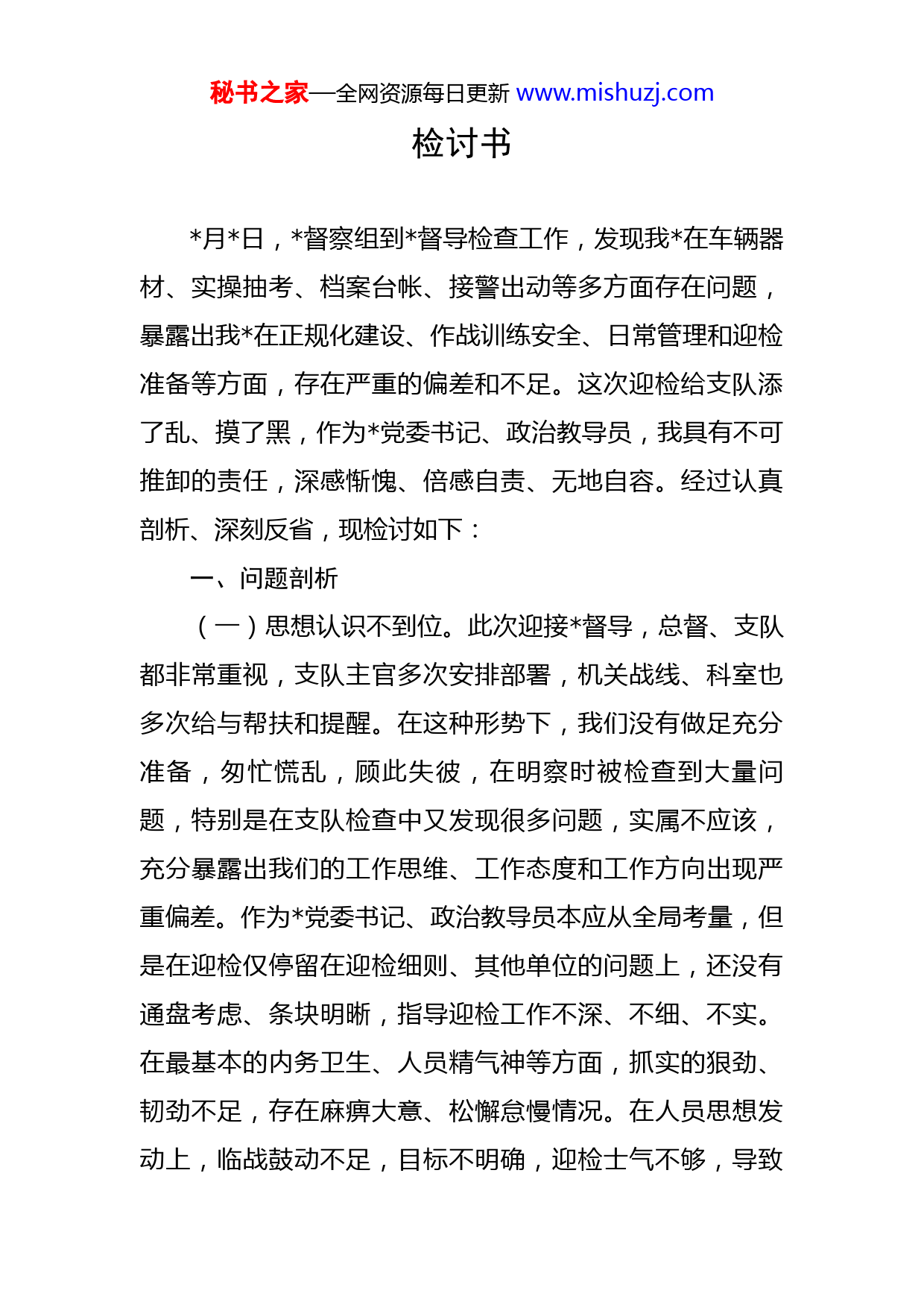 秘书之家—全网资源每日更新www.mishuzj.com检讨书月日,督察组到督导检查工作,发现我在车辆器材、实操抽考、档案台帐、接警出动等多方面存在问题,暴露出我在正规化建设、作战训练安全、日常管理和迎检准备等方面,存在严重的偏差和不足。这次迎检给支队添了乱、摸了黑,作为党委书记、政治教导员,我具有不可推卸的责任,深感惭愧、倍感自责、无地自容。经过认真剖析、深刻反省,现检讨如下:一、问题剖析(一)思想认识不到位。此次迎接督导,总督、支队都非常重视,支队主官多次安排部署,机关战线、科室也多次给与帮扶和提醒。在这种形势下,我们没有做足充分准备,匆忙慌乱,顾此失彼,在明察时被检查到大量问题,特别是在支队检查中又发现很多问题,实属不应该,充分暴露出我们的工作思维、工作态度和工作方向出现严重偏差。作为党委书记、政治教导员本应从全局考量,但是在迎检仅停留在迎检细则、其他单位的问题上,还没有通盘考虑、条块明晰,指导迎检工作不深、不细、不实。在最基本的内务卫生、人员精气神等方面,抓实的狠劲、韧劲不足,存在麻痹大意、松懈怠慢情况。在人员思想发动上,临战鼓动不足,目标不明确,迎检士气不够,导致秘书之家—全网资源每日更新www.mishuzj.com队站人员对迎检认识不够重视,存在侥幸心理。(二)队伍管理不到位。抓正规化建设有偏差,重硬件轻软件,在日常养成方面做得不够,一日生活制度、内务卫生、营区环境、后勤管理等制度抓而不严、做而不实,未能建立正规的战备、训练、工作、生活秩序,导致正规化水平仍然处在低位运转。日常管理标准不高,平时看在眼里,没放在心里,更没有严格规范,“高标准、严要求”没有落实到行动上,一些工作处于低级水平,甚至出现了很多低级错误,如物品摆放、食堂卫生等等。对干部骨干“不敢管、不会管、不愿管”的情况,研究不深不透,没有沉下去帮扶指导,手把手传帮带,队员“主人翁”意识、责任心不强,主动性、积极性不高,工作的侧重点、紧急性把握不准,导致迎检工作心中没底,慌乱失措,没有阵脚。(三)跟踪督导不到位。在迎检工作中,停留在传达上级文件和指示精神上,停留在安排部署和提要求上,满足于走马观花走一遍、看一遍、提一遍,跟踪指导、跟踪检查、跟踪讲评做得不够,成与不成、好与不好,没有当下立判,标准不高,存在死角。在日常中,不注重经验教训总结,对于车辆器材维护保养不到位、一日生活制度不规范、纪律作风未养成、营区及食堂卫生不达标等经常出现的问题,没能透过表象反映出的深层次问题加以分析研秘书之家—全网资源每日更新www.mishuzj.com判,解决方法手段少,导致问题日积月累、积重难返。在工作方式上,习惯于突击式、运动式和亡羊补牢式的工作指导,对于上级安排部署的工作和要求,强调的多,跟进的少,建章立制的少,对落实不到位、存在问题的情况,大多是口头批评,真正严格问责追责的少,致使很多问题只停留在面上,没能从根本上解决,管理工作还没有形成闭环。(四)工作作风不扎实。没有充分理解政委所讲的“严格管理就是对最大的福利”所蕴含的哲理,在具体工作中,只满足于做了,不求做得更好、最好。对的自觉意识过于信任,总认为上面有制度在管着,平时自己也提了要求,他们自己一定能够遵守、能够做到,导致松懈了管理,放松了监督,这实质上是对部属的极大不负责任。在处理问题时原则性不够强,对工作中发现的问题,有时候碍于情面,只是批评教育,没有动真碰硬。比如,在日常管理、档案台账等方面,只是安排人员做了,标准怎么样、程序怎么样、效果怎么样,没有尺度标尺。每天的器材维护保养,仅仅停留在听取报告上,班长没有实地查看,干部也没有去跟踪,导致出现了问题,没能及时解决。二、对问题严重性的认识此次、支队检查发现的问题,精准的挖掘出我工作秘书之家—全网资源每日更新www.mishuzj.com上的缺失。虽然问题发现在队员身上,但是根子在党委,作为党委书记我负有不可推卸的责任。由于自己工作的失职失责,极大地影响了总队、支队的形象,自己深感愧对各级领导和组织对我的信任和关怀,深感愧对全体的拼搏和付出,我也深刻认识到,作为管理者履职不尽责,带来的严重后果,甘愿承担组织给予的一切处理。三、整改措施(一)坚决落实整改。对于检查发现的问题,我将痛定思痛,认真吸取教训、举一反三,直面问题、坚决整改,不把问题带到以后的工作中。对督导组和支队检查组指出的问题,我将带领全体原原本本学习、逐一对照检查,列出责任清单和整改时限,确保全部整改完毕并建立长效机制。我将严格按照正规化建设、作战训练安全的相关要求,对照校正偏差,全面强化落实,确保两项工作走深、走实、走出效果。(二)坚决落实责任。我将正视问题,时刻警醒,认真履职,以求真务实、真抓实干的工作作风,充分发挥好党建带队建、队建促业务的作用,带领全体,落实工作责任,层层分解任务,建立健全责任清晰、分工明确、落实有序的工作秩序,以更高要求和标准对待各项工作,坚决守好责任田,织密安全网,办好实在事,推动队伍建设迈上新台阶。秘书之家—全网资源每日更新www.mishuzj.com(三)坚决知耻后勇。这次教训,对我来说是一次发现不足、警醒自我、改过自新的机会。我将端正态度,从思想上