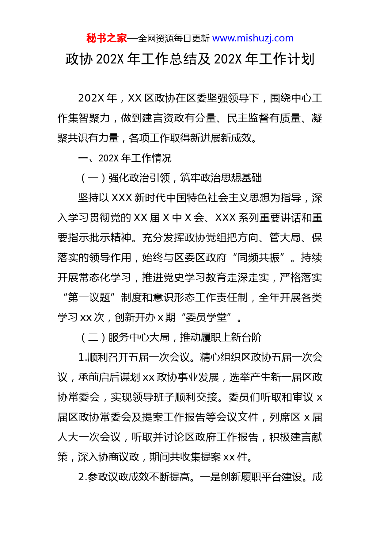 秘书之家—全网资源每日更新www.mishuzj.com政协202X年工作总结及202X年工作计划202X年,XX区政协在区委坚强领导下,围绕中心工作集智聚力,做到建言资政有分量、民主监督有质量、凝聚共识有力量,各项工作取得新进展新成效。一、202X年工作情况(一)强化政治引领,筑牢政治思想基础坚持以XXX新时代中国特色社会主义思想为指导,深入学习贯彻党的XX届X中X会、XXX系列重要讲话和重要指示批示精神。充分发挥政协党组把方向、管大局、保落实的领导作用,始终与区委区政府“同频共振”。持续开展常态化学习,推进党史学习教育走深走实,严格落实“第一议题”制度和意识形态工作责任制,全年开展各类学习xx次,创新开办x期“委员学堂”。(二)服务中心大局,推动履职上新台阶1.顺利召开五届一次会议。精心组织区政协五届一次会议,承前启后谋划xx政协事业发展,选举产生新一届区政协常委会,实现领导班子顺利交接。委员们听取和审议x届区政协常委会及提案工作报告等会议文件,列席区x届人大一次会议,听取并讨论区政府工作报告,积极建言献策,深入协商议政,期间共收集提案xx件。2.参政议政成效不断提高。一是创新履职平台建设。成秘书之家—全网资源每日更新www.mishuzj.com立首批x个委员工作室,就基层社会治理、制造业发展、民生事业协调、服务业提质增效等方面开展专业服务、民情收集、调研座谈、协商交流等活动。建成“委员议事厅”,强化政协委员联系和团结不同界别群众、面向社会正面发声、凝聚和传播共识的基层协商能力。二是深入开展专题调研。紧扣中心工作开展重点调研,先后赴xx、xx、xx、xx等地开展乡村振兴、社会治理、城市管理、历史文化x个专题调研,形成《乡村空间聚落的构建分析》《推动城市治理能力提升》等高质量调研报告。三是认真组织实地视察。组织委员“实地视察+集中座谈”,先后视察xx实验学校、xx广场、xx大街等,围绕教育“双减”、推进工业区建设和吸引高质量企业落户等问题进行交流座谈,及时向区有关部门反馈工作建议。3.民主监督更加有力有效。一是开展会议监督。听取区政府关于今年前三季度经济社会发展情况通报和区纪委监委、区法院、区检察院工作情况通报。二是强化提案办理。区政协四届六次会议以来共收集委员提案xx件,经审查立案xx件,均全部办结,委员满意和基本满意率达xxx%。其中“提升区域微循环交通”“推进跨境金融合作”等提案受到区有关部门重视,有力推动相关政策研究落实。对提案办理工作开展“回头看”,为有效解决金二路城职院段周边群众出行难、南港中路路口排洪渠等问题献计出秘书之家—全网资源每日更新www.mishuzj.com力,目前过街天桥项目已顺利竣工,城市管网排水系统建设工作正有序推进。三是开展热点专题协商。组织委员就社会热点问题进行专题协商,积极为xx发展出谋献策,先后开展社区性家庭式托护服务、就业培训和提升城市管理水平等x项专题协商活动,为研究解决婴幼儿“托护难”、如何发展我区就业培训工作等问题提出意见建议。(三)聚焦社会民生,促进工作展现实效1.开展民生实事督导。配合市政协到xx、xx、xx、xx等镇开展“民生微实事”督导xx个项目共xx次。组织委员实地视察“xx村xx环境提升工程”“xx社区文化广场乒乓球场修复工程”“xx楼梯扶手工程”等民生实事项目,听取项目工作情况汇报,广泛收集民意,为完善民生服务工作贡献政协力量。2.积极反映社情民意。深入开展密切联系委员、联系基层、联系企业、联系群众活动,全年共走访xx位委员、开展入社区听取社情民意活动x场,反馈意见建议xx条。持续开展委员接待日活动,围绕我区民生实事、城市建设、营商环境等民生热点难点问题,向区政府反馈涉及帮扶济困、政校合作共建产业园工作、“众创空间”发展、集群企业登记等意见建议xxx余条。3.开展帮扶济困活动。鼓励委员踊跃参与“扶贫济困日”活动,筹集捐款近xxx万元,实现委员捐款全参与全秘书之家—全网资源每日更新www.mishuzj.com覆盖。拨出捐款约xx万元开展“八一”拥军慰问、帮扶残障人士和“关工学子”、组织“xx助学”行动,汇聚政协爱心;定点帮扶X市和X县共xx万元,助力扶贫攻坚;帮扶xx岸社区、xx村民生实事项目xx万元,推动“我为群众办实事”实践活动。(四)拓展交流联系,彰显团结民主主题1.强化对外交流联动。协助省政协调研xx“三农”“农村生活污水治理”工作,配合上级政协开展“完善产业园区综合配套”“文化设施建设”“水产业高质量发展”等调研视察,发挥政协整体合力。积极开展团结联谊,先后接待xx、xx、xx等地及兄弟区政协考察交流xx次,加强对外交流联系。2.增进各界人士联谊。积极开展国情教育活动,组织港澳委员到xx革命纪念馆、xx旧址等爱国主义教育基地参观学习,凝聚爱国爱港爱澳力量。揭牌政协香港委员联络组,建立联络平台。成立往届政协委员联谊会,充分发挥往届委员的作用。3.推进文史资政育人。举办“携手书写华章同心绘就画卷”主题书画摄影作品展,《区政协创新探索“三个延伸”履职新模式》入选xxxx年改革发展案例,完成政协年报、年鉴和大事记等编撰,开展优秀提案和调研成果汇编,依托文化力量凝聚共识。信息宣传工作取得新突秘书之家—全网资源每日更新www.mishuzj.com