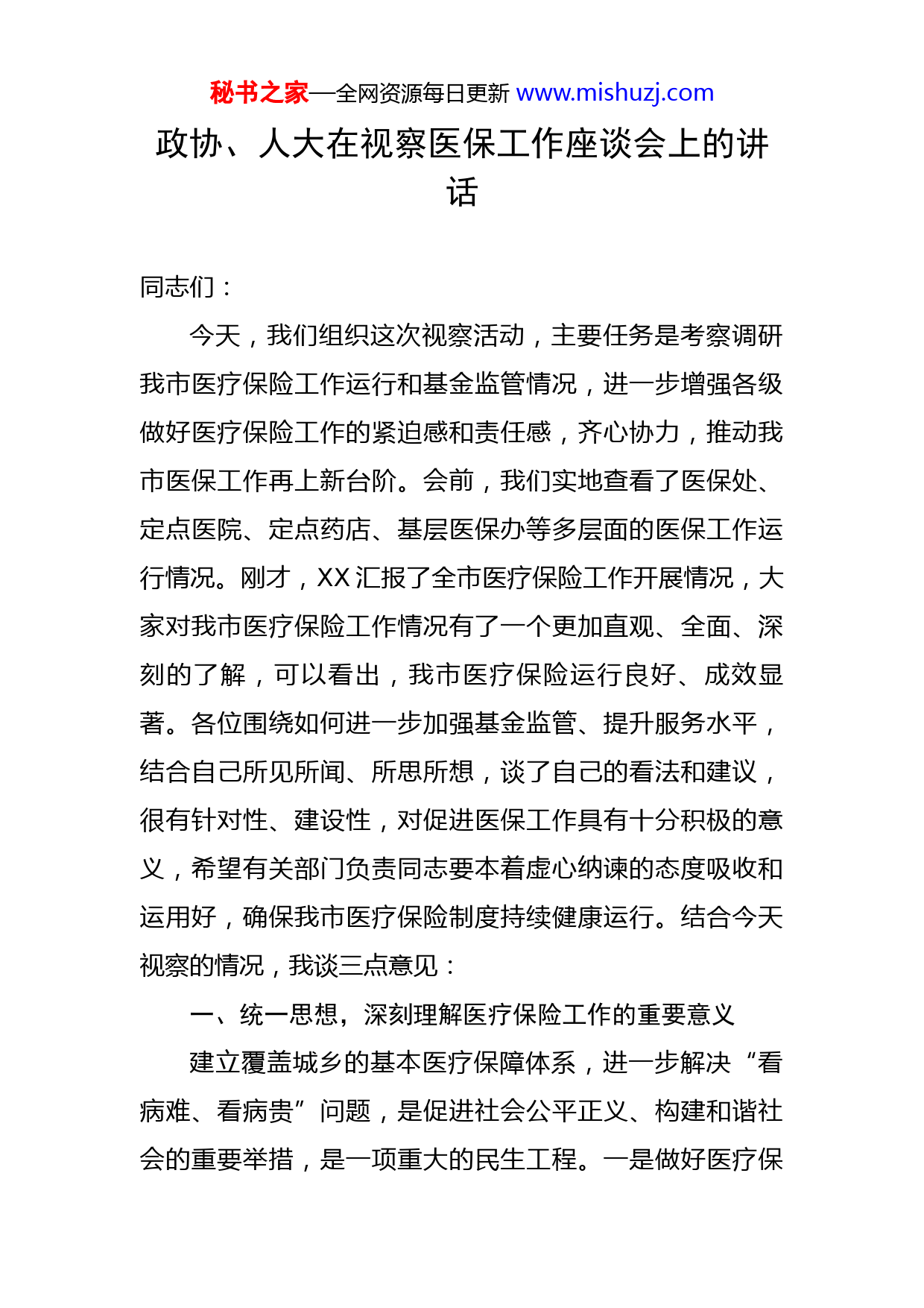 秘书之家—全网资源每日更新www.mishuzj.com政协、人大在视察医保工作座谈会上的讲话同志们:今天,我们组织这次视察活动,主要任务是考察调研我市医疗保险工作运行和基金监管情况,进一步增强各级做好医疗保险工作的紧迫感和责任感,齐心协力,推动我市医保工作再上新台阶。会前,我们实地查看了医保处、定点医院、定点药店、基层医保办等多层面的医保工作运行情况。刚才,XX汇报了全市医疗保险工作开展情况,大家对我市医疗保险工作情况有了一个更加直观、全面、深刻的了解,可以看出,我市医疗保险运行良好、成效显著。各位围绕如何进一步加强基金监管、提升服务水平,结合自己所见所闻、所思所想,谈了自己的看法和建议,很有针对性、建设性,对促进医保工作具有十分积极的意义,希望有关部门负责同志要本着虚心纳谏的态度吸收和运用好,确保我市医疗保险制度持续健康运行。结合今天视察的情况,我谈三点意见:一、统一思想,深刻理解医疗保险工作的重要意义建立覆盖城乡的基本医疗保障体系,进一步解决“看病难、看病贵”问题,是促进社会公平正义、构建和谐社会的重要举措,是一项重大的民生工程。一是做好医疗保秘书之家—全网资源每日更新www.mishuzj.com险工作是“惠民生”的重中之重。医疗保险制度是以大病统筹为主的医疗互助共济制度,有效地解决广大看病难、看不起病的问题,帮助解决抵御重大疾病风险,缓解因病致贫、因贫返贫问题,切实提高健康水平,是一项民心工程、德政工程。提高城乡医保财政补助标准,统一异地就医即时结算政策,扩大用药保障范围,完善大病保险制度等等,能使广大参保群众实实在在感觉到社会保障带来的实惠,直接增加群众的获得感和幸福感。二是做好医疗保险工作是“保稳定”的基本要求。健康是国民素质的基础,实现人人享有基本医疗保障的目标,是国家文明进步的重要标志。全面做好医疗保险工作,妥善解决参保群众看病就医问题,解除其后顾之忧,有利于激发群众奋发有为、积极进取的创业热情,加快社会发展步伐,维护社会和谐稳定。三是做好医疗保险工作是“促改革”的重要任务。全面深化医药卫生体制改革的关键,在于突出医疗、医药、医保“三医联动”,加强基本医保、补充保险、医疗救助等制度衔接,增强制度的系统性、整体性、协同性二、肯定成绩,进一步坚定做好医保工作的信心和决心近年来,特别是新农合与城镇医保制度整合并轨以来,市人社局积极发挥主观能动性,开拓创新,积极作为,医保工作取得显著成效。一是医保制度实现健康持续秘书之家—全网资源每日更新www.mishuzj.com运行。医保基金连续实现“收支平衡、略有结余”年度任务目标,参保覆盖面逐年扩大,药品目录不断增加,报销限额大幅提高,进一步减轻了参保群众的医疗经济负担,有效提高了参保群众的受益程度和医疗保障水平。二是重点群体医疗问题切实解决。统一按照个人自付额度进行大病救助,解决了原城镇医保无大病救助、原新农合救助范围有限制的问题,有效减轻大病患者负担;低保、五保、重残人员等困难人群纳入财政资助范围,进一步保障了弱势群体医疗保障权益。三是医疗服务行为有效规范。建立了较为完善的考核奖惩机制和体系,通过加强日常稽查和年终考核,调动了各定点医院主动开展医保管理的积极性和主动性,各定点医院医保管理制度进一步完善,医保管理更加规范,挂床住院、过度医疗等不规范医疗行为得到有效遏制。四是基础管理工作显著增强。大力推进异地联网即时报销,农村到异地医院住院就医,实现了异地联网即时结算,减少了个人垫付,提高了报销比例;将医保异地联网手续办理、门诊慢性病申报、外地住院医疗费报销等业务,全部下放至镇街医保办,极大方便了参保看病就医。五是群众健康意识明显增强。随着医保制度的推进实施,逐步改变了城乡特别是广大农民的就医观念,群众不再像以往那样“小病拖、大病扛”,健康意识明显增强,也有力推动了我市医疗卫生事业的快速发展。秘书之家—全网资源每日更新www.mishuzj.com在充分肯定成绩的同时,也要清醒地认识到,当前我市基本医疗保险工作还存在着一些问题和不足,主要表现在:极少数群众存有“无病不保、有病再保”的思想,参保的积极性和主动性仍需提高;医保基金支出增幅很大,但群众感受不明显,过度医疗、极个别医院延迟报销等现象依然存在等。解决好上述问题,是确保医保制度健康发展的重要基础,是推动医保工作走向制度化、规范化轨道的重要保证。各级各有关部门要切实增强做好医保工作的责任感和使命感,进一步坚定信心和决心,强化组织领导,落实工作责任,加大工作力度,强化工作措施,切实把这件为民利民的好事办好、实事办实,努力让城乡更多、更公平地享受经济社会发展的成果。三、突出重点,扎实推进医保事业持续健康发展“江山就是人民,人民就是江山。中国共产党领导人民打江山、守江山,守的是人民的心。”党的二十大报告充分彰显了我们党始终把人民放在心中最高位置,把让人民过上好日子作为奋斗目标。医保部门作为重要的民生部门,更要坚持人民至上,践行以人民为中心的发展思想,准确理解把握党的二十大对医保工作的重大决策部署,紧盯解决医疗保障不平衡不充分的发展问题,认