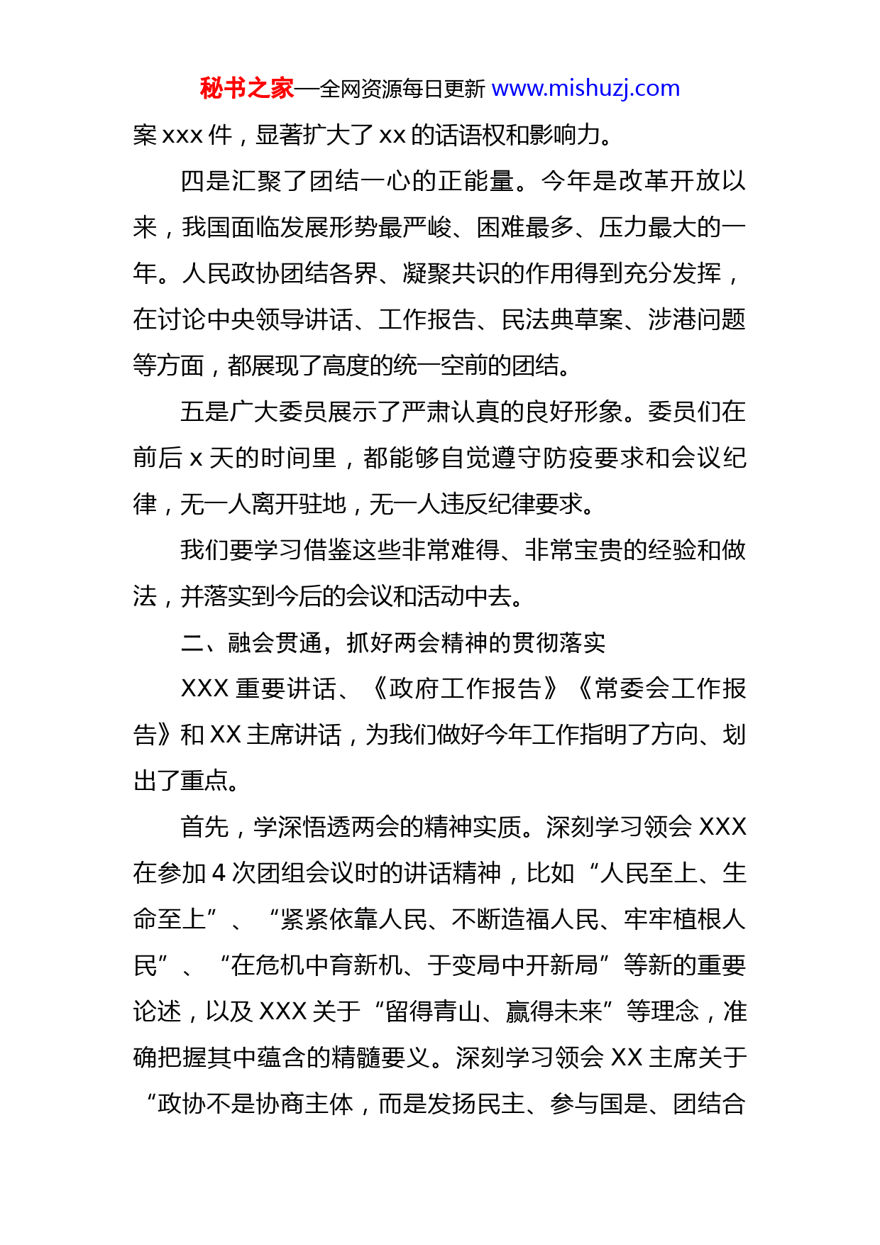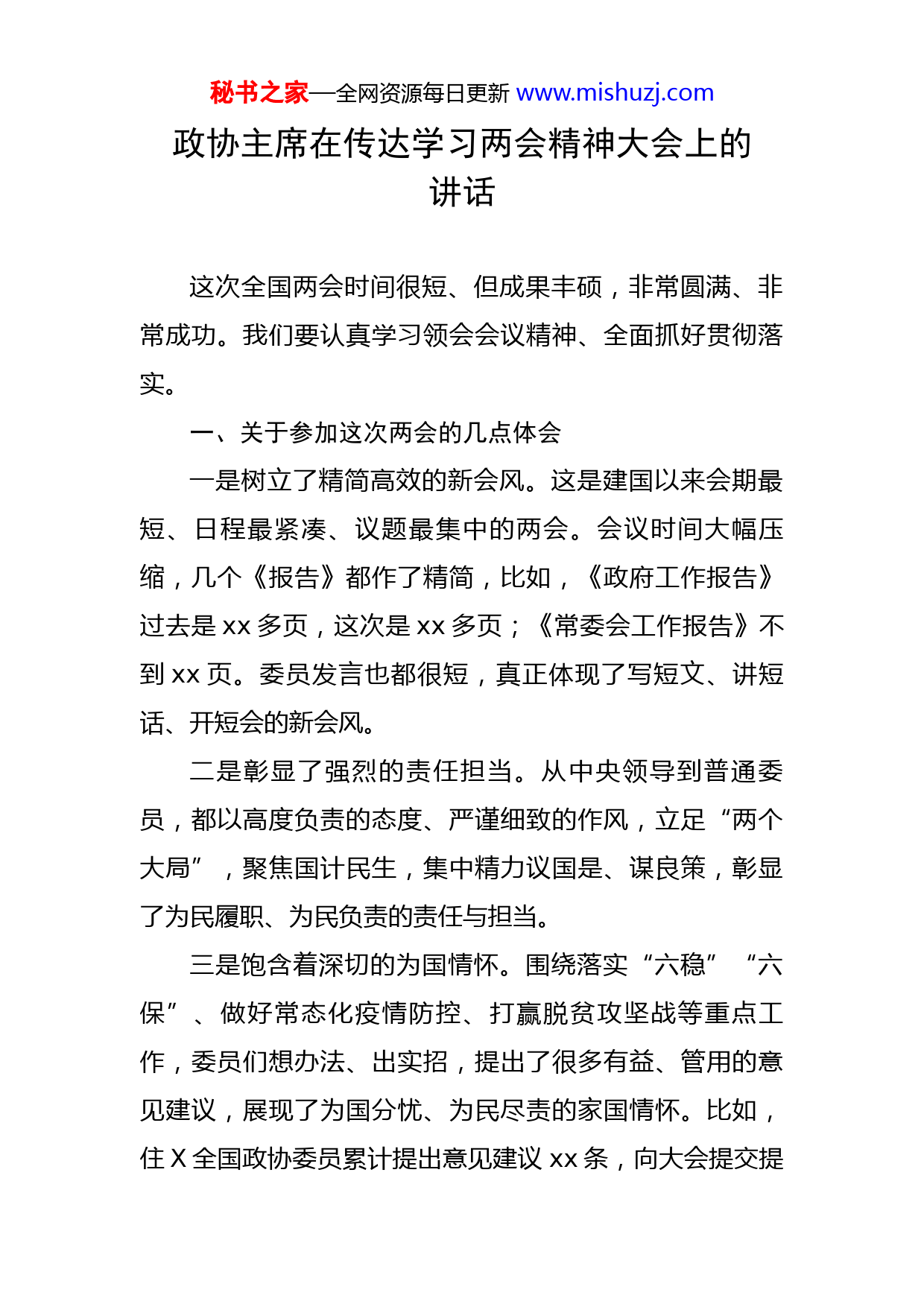 秘书之家—全网资源每日更新www.mishuzj.com政协主席在传达学习两会精神大会上的讲话这次全国两会时间很短、但成果丰硕,非常圆满、非常成功。我们要认真学习领会会议精神、全面抓好贯彻落实。一、关于参加这次两会的几点体会一是树立了精简高效的新会风。这是建国以来会期最短、日程最紧凑、议题最集中的两会。会议时间大幅压缩,几个《报告》都作了精简,比如,《政府工作报告》过去是xx多页,这次是xx多页;《常委会工作报告》不到xx页。委员发言也都很短,真正体现了写短文、讲短话、开短会的新会风。二是彰显了强烈的责任担当。从中央领导到普通委员,都以高度负责的态度、严谨细致的作风,立足“两个大局”,聚焦国计民生,集中精力议国是、谋良策,彰显了为民履职、为民负责的责任与担当。三是饱含着深切的为国情怀。围绕落实“六稳”“六保”、做好常态化疫情防控、打赢脱贫攻坚战等重点工作,委员们想办法、出实招,提出了很多有益、管用的意见建议,展现了为国分忧、为民尽责的家国情怀。比如,住X全国政协委员累计提出意见建议xx条,向大会提交提秘书之家—全网资源每日更新www.mishuzj.com案xxx件,显著扩大了xx的话语权和影响力。四是汇聚了团结一心的正能量。今年是改革开放以来,我国面临发展形势最严峻、困难最多、压力最大的一年。人民政协团结各界、凝聚共识的作用得到充分发挥,在讨论中央领导讲话、工作报告、民法典草案、涉港问题等方面,都展现了高度的统一空前的团结。五是广大委员展示了严肃认真的良好形象。委员们在前后x天的时间里,都能够自觉遵守防疫要求和会议纪律,无一人离开驻地,无一人违反纪律要求。我们要学习借鉴这些非常难得、非常宝贵的经验和做法,并落实到今后的会议和活动中去。二、融会贯通,抓好两会精神的贯彻落实XXX重要讲话、《政府工作报告》《常委会工作报告》和XX主席讲话,为我们做好今年工作指明了方向、划出了重点。首先,学深悟透两会的精神实质。深刻学习领会XXX在参加4次团组会议时的讲话精神,比如“人民至上、生命至上”、“紧紧依靠人民、不断造福人民、牢牢植根人民”、“在危机中育新机、于变局中开新局”等新的重要论述,以及XXX关于“留得青山、赢得未来”等理念,准确把握其中蕴含的精髓要义。深刻学习领会XX主席关于“政协不是协商主体,而是发扬民主、参与国是、团结合秘书之家—全网资源每日更新www.mishuzj.com作的重要平台”等重要观点,始终把牢新时代人民政协的新方位、新使命。要召开省政协党组会议、主席会议、分党组会议、支部会议等,分层分级传达会议精神,机关党委要对抓好学习贯彻活动做好部署;主席会议成员、党组成员要带头宣讲,近期至少为市县政协作x次专题辅导。各市州政协也要及时组织学习讨论,确保两会精神入心入脑。其次,抓好今年重点任务的落实。一是为全省改革发展献计出力。要紧扣高质量脱贫、全面建成小康社会目标协商议政。精准选题、精心调研,切实增强资政建言的针对性、科学性、可行性。要围绕做好常态化疫情防控、健全公共卫生体系等开展专题协商,推动“外防输入、内防反弹”要求得到有效落实。同时,政协要多参与、多指导常态化防疫工作,讲好复工复产的xx故事和政协故事。要围绕“六稳”“六保”要求,多提可行务实的意见建议。比如,就如何保就业、保民生、保企业等深入调研,提出切合xx实际的对策建议。保民生最重要的是保就业,最近,可对城市摆摊设点的方式和方法提出实施建议。摆摊既是最简单、最可行的自主就业方式,又可扩大消费。要围绕制定“十四五”规划,通过深入调查研究,结合国家新出台的政策措施,多提一些事关全局、利在长远的重大发展思路和建设项目的建议,供党委政府决策参考。二是秘书之家—全网资源每日更新www.mishuzj.com增强履职的新本领,也就是增强凝聚共识的能力水平。扎实做好凝聚共识工作。凝聚共识,难在“凝聚”,重在“共识”,贵在“以道交友、以诚待人、以理服众、以商求同”。要创新理念方法,凝聚共识不是无区别的强求一律,而是有方向的启发引领;不是单向度的灌输说教,而是互动式的协商讨论;不是表面的附和敷衍,而是内心的深刻认同;不是快餐式的立竿见影,而是长期性的润物无声。要把凝聚共识融入到调研视察、协商议政活动中,不搞“清一色”、不搞“单打一”,注重联合各党派、各界别,在加强学习中凝共识、在加强交流中聚共识。要针对经济社会发展的热点、难点、焦点问题,有的放矢地做好宣传政策、理顺情绪、增进团结的工作,厚植共同的政治基础和社会基础。三是全力以赴做好脱贫攻坚收官工作。要从严从实从细查漏补缺,扎实做好补短板、强弱项工作,确保政协领导所联系的帮扶县都能高质量完成脱贫攻坚的任务。主席会议成员要再去联系县认真细致地过一遍,做到问题全部清零;帮扶办要加强协调指导,对下一阶段的工作流程作出安排,排出时间表;x个小分队也要加强调研督导,把发现的问题解决在基层。另外,要筹办好政协扶贫展,从现在开始就得抓紧梳理、收集、汇总扶贫资料,争取办成一个回顾历史、展示成就的精彩展览。第三,不断提高各级政协组织和委员的自身素质。要秘书之家—全网资源每日更新www