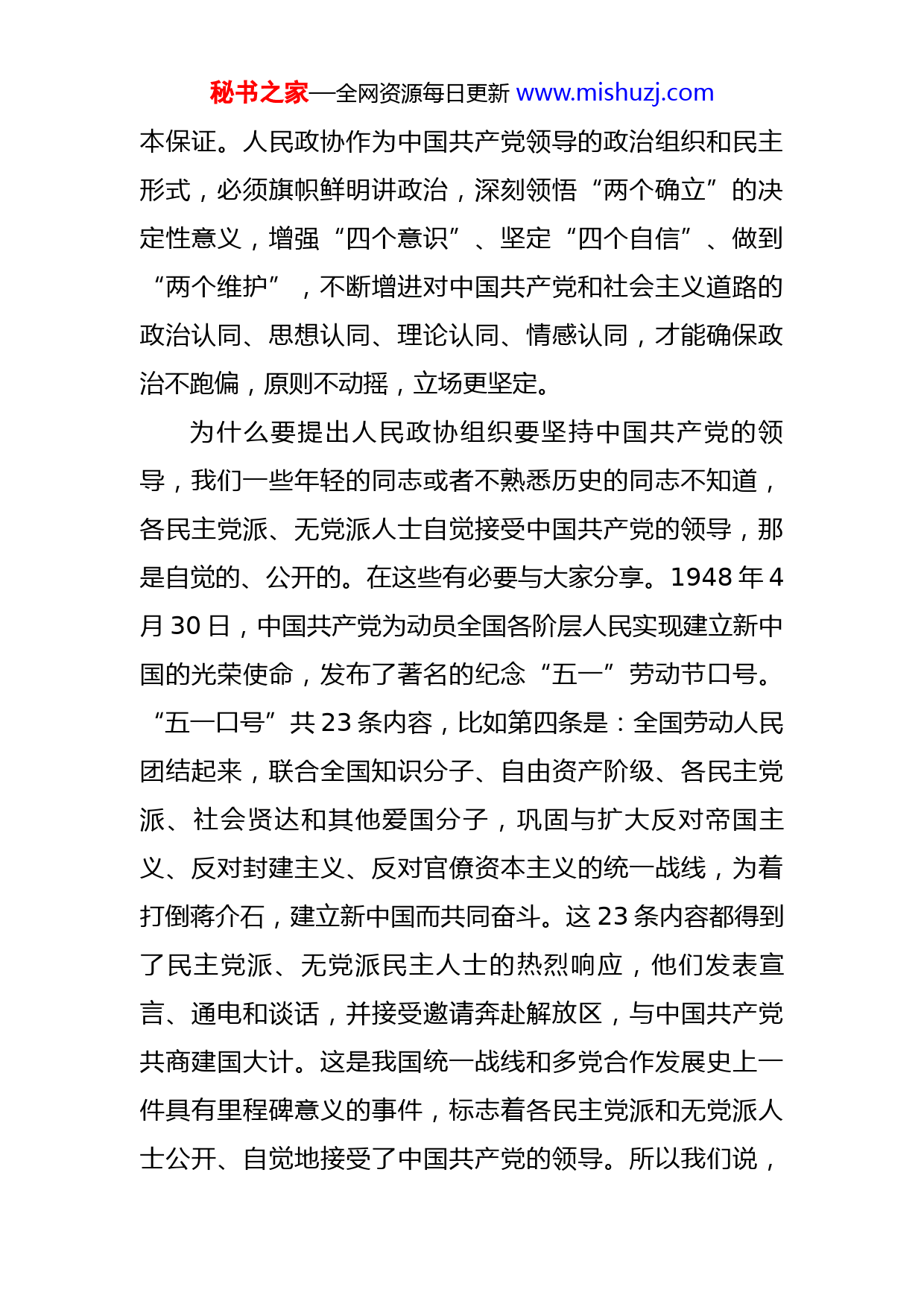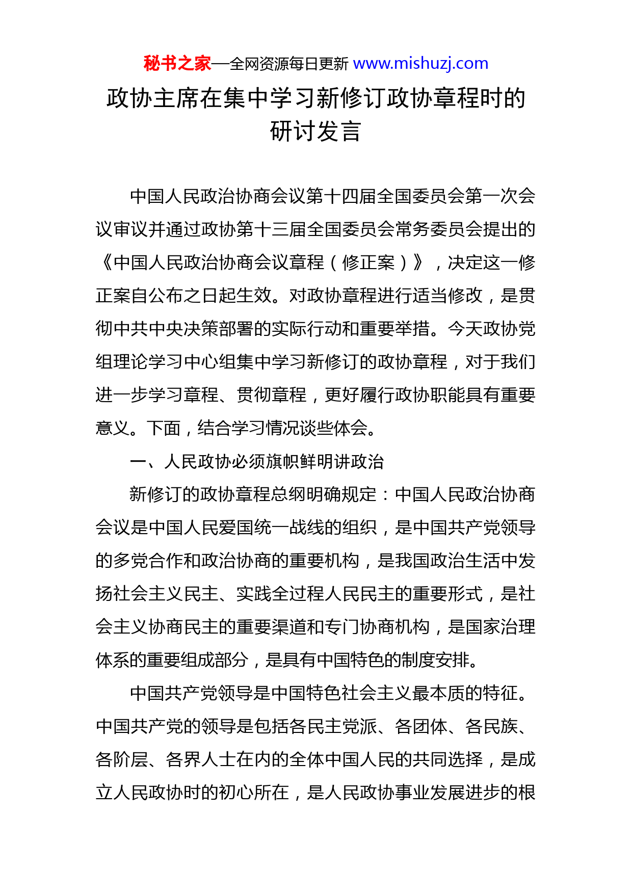 秘书之家—全网资源每日更新www.mishuzj.com政协主席在集中学习新修订政协章程时的研讨发言中国人民政治协商会议第十四届全国委员会第一次会议审议并通过政协第十三届全国委员会常务委员会提出的《中国人民政治协商会议章程(修正案)》,决定这一修正案自公布之日起生效。对政协章程进行适当修改,是贯彻中共中央决策部署的实际行动和重要举措。今天政协党组理论学习中心组集中学习新修订的政协章程,对于我们进一步学习章程、贯彻章程,更好履行政协职能具有重要意义。下面,结合学习情况谈些体会。一、人民政协必须旗帜鲜明讲政治新修订的政协章程总纲明确规定:中国人民政治协商会议是中国人民爱国统一战线的组织,是中国共产党领导的多党合作和政治协商的重要机构,是我国政治生活中发扬社会主义民主、实践全过程人民民主的重要形式,是社会主义协商民主的重要渠道和专门协商机构,是国家治理体系的重要组成部分,是具有中国特色的制度安排。中国共产党领导是中国特色社会主义最本质的特征。中国共产党的领导是包括各民主党派、各团体、各民族、各阶层、各界人士在内的全体中国人民的共同选择,是成立人民政协时的初心所在,是人民政协事业发展进步的根秘书之家—全网资源每日更新www.mishuzj.com本保证。人民政协作为中国共产党领导的政治组织和民主形式,必须旗帜鲜明讲政治,深刻领悟“两个确立”的决定性意义,增强“四个意识”、坚定“四个自信”、做到“两个维护”,不断增进对中国共产党和社会主义道路的政治认同、思想认同、理论认同、情感认同,才能确保政治不跑偏,原则不动摇,立场更坚定。为什么要提出人民政协组织要坚持中国共产党的领导,我们一些年轻的同志或者不熟悉历史的同志不知道,各民主党派、无党派人士自觉接受中国共产党的领导,那是自觉的、公开的。在这些有必要与大家分享。1948年4月30日,中国共产党为动员全国各阶层人民实现建立新中国的光荣使命,发布了著名的纪念“五一”劳动节口号。“五一口号”共23条内容,比如第四条是:全国劳动人民团结起来,联合全国知识分子、自由资产阶级、各民主党派、社会贤达和其他爱国分子,巩固与扩大反对帝国主义、反对封建主义、反对官僚资本主义的统一战线,为着打倒蒋介石,建立新中国而共同奋斗。这23条内容都得到了民主党派、无党派民主人士的热烈响应,他们发表宣言、通电和谈话,并接受邀请奔赴解放区,与中国共产党共商建国大计。这是我国统一战线和多党合作发展史上一件具有里程碑意义的事件,标志着各民主党派和无党派人士公开、自觉地接受了中国共产党的领导。所以我们说,秘书之家—全网资源每日更新www.mishuzj.com新时代人民政协要旗帜鲜明讲政治,增强“四个意识”、坚定“四个自信”、做到“两个维护”。二、人民政协必须牢牢把握“大团结、大联合”这个主题党的二十大报告提出:全面建设社会主义现代化国家,必须充分发挥亿万人民的创造伟力,不断巩固全国各族人民大团结,加强海内外中华儿女大团结,形成同心共圆中国梦的强大合力。人民政协是中国人民爱国统一战线的组织,团结和民主是人民政协的两面光辉旗帜,也是人民政协的两大价值追求。实现中华民族伟大复兴,是包括中华儿女在内的共同责任和奋斗目标。人民政协组织要进一步巩固和发展最广泛的爱国统一战线,加强海内外中华儿女大团结,调动一切积极因素,团结一切可能团结的人,找到最大公约数,画出最大同心圆,同心同德,群策群力,按照中国特色社会主义事业“五位一体”总体布局和“四个全面”战略布局,维护和发展安定团结的政治局面,不断促进社会主义物质文明、政治文明、精神文明、社会文明、生态文明的协调发展,为实现第二个百年奋斗目标、实现中华民族伟大复兴的中国梦而团结奋斗。人民政协成立70多年来,发挥自身优势,参政议政,民主监督,为社会主义现代化建设作出重大贡献。70多年秘书之家—全网资源每日更新www.mishuzj.com的人民政协历史,造就了人民政协“大团结、大统一”的组织优势。新时代人民政协,必须进一步把握好民主与团结这两个主题,围绕一切可以团结的力量,广泛凝聚共识,在政治、法治、经济、农业农村、社会、教育、科学技术、文化艺术、新闻出版、医药卫生、体育、资源环境等方面,广开言路,广开才路,充分发挥“重要阵地”“重要渠道”作用。三、人民政协必须围绕中心大局履行职能新修订的政协章程明确提出政协的主要职能是政治协商、民主监督、参政议政,要把加强思想政治引领、广泛凝聚共识贯穿履职工作之中。政治协商是对国家大政方针和地方的重要举措以及经济建设、政治建设、文化建设、社会建设、生态文明建设中的重要问题,在决策之前和决策实施之中进行协商。人民政协每年要根据党委、人大、政府和民主党派、人民团体的提议,举行有各党派、团体的负责人和各族各界人士的代表参加的会议,围绕经济社会发展中的重要问题进行协商。民主监督是对国家宪法、法律和法规的实施,重大方针政策、重大改革举措、重要决策部署的贯彻执行情况,涉及人民群众切身利益的实际问题解决落实情况,国家机关及其工作人员的工作等,通过提出意见、批评、建议的方式进行的