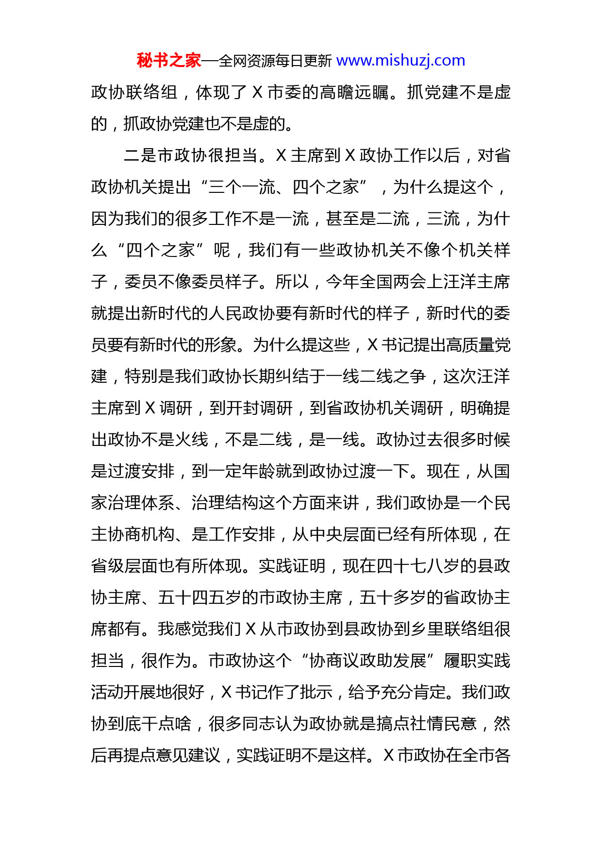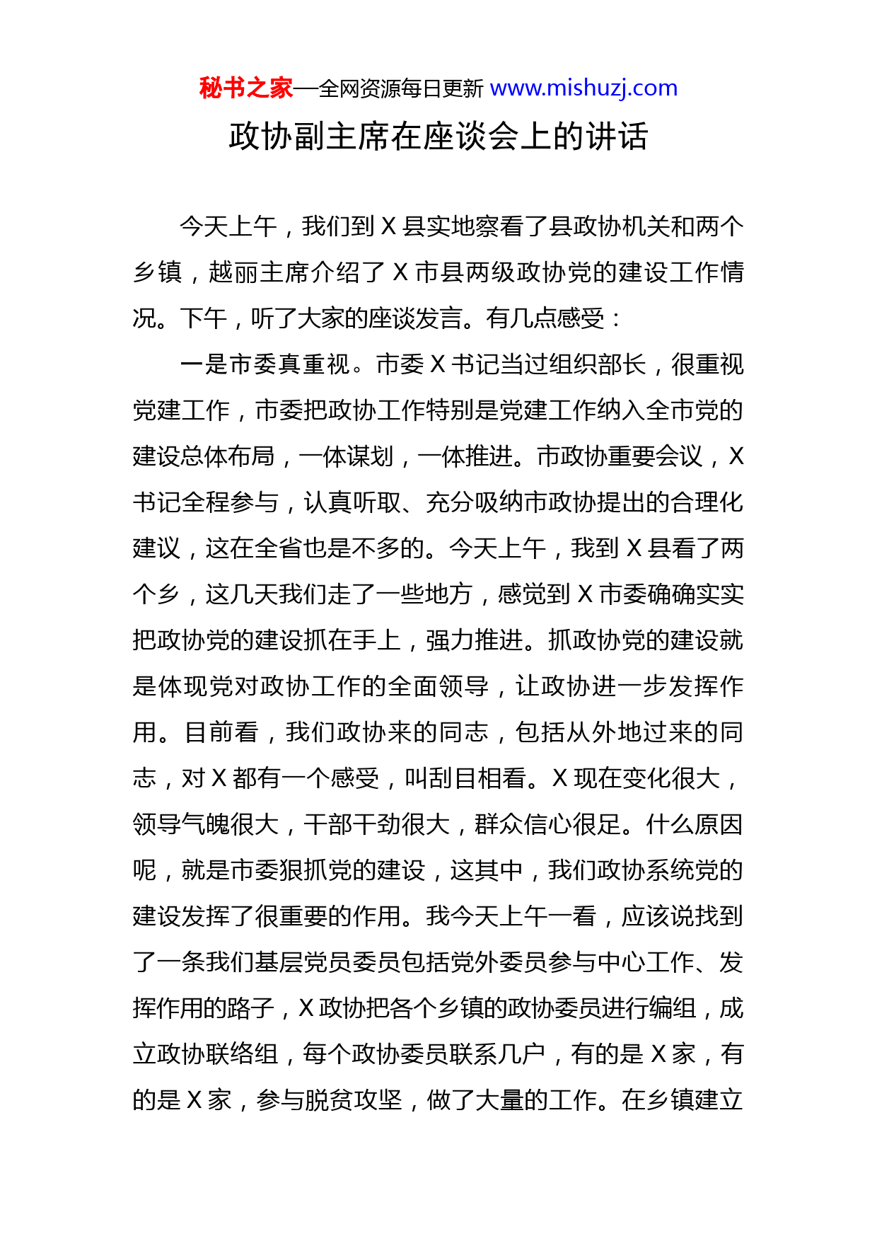秘书之家—全网资源每日更新www.mishuzj.com政协副主席在座谈会上的讲话今天上午,我们到X县实地察看了县政协机关和两个乡镇,越丽主席介绍了X市县两级政协党的建设工作情况。下午,听了大家的座谈发言。有几点感受:一是市委真重视。市委X书记当过组织部长,很重视党建工作,市委把政协工作特别是党建工作纳入全市党的建设总体布局,一体谋划,一体推进。市政协重要会议,X书记全程参与,认真听取、充分吸纳市政协提出的合理化建议,这在全省也是不多的。今天上午,我到X县看了两个乡,这几天我们走了一些地方,感觉到X市委确确实实把政协党的建设抓在手上,强力推进。抓政协党的建设就是体现党对政协工作的全面领导,让政协进一步发挥作用。目前看,我们政协来的同志,包括从外地过来的同志,对X都有一个感受,叫刮目相看。X现在变化很大,领导气魄很大,干部干劲很大,群众信心很足。什么原因呢,就是市委狠抓党的建设,这其中,我们政协系统党的建设发挥了很重要的作用。我今天上午一看,应该说找到了一条我们基层党员委员包括党外委员参与中心工作、发挥作用的路子,X政协把各个乡镇的政协委员进行编组,成立政协联络组,每个政协委员联系几户,有的是X家,有的是X家,参与脱贫攻坚,做了大量的工作。在乡镇建立秘书之家—全网资源每日更新www.mishuzj.com政协联络组,体现了X市委的高瞻远瞩。抓党建不是虚的,抓政协党建也不是虚的。二是市政协很担当。X主席到X政协工作以后,对省政协机关提出“三个一流、四个之家”,为什么提这个,因为我们的很多工作不是一流,甚至是二流,三流,为什么“四个之家”呢,我们有一些政协机关不像个机关样子,委员不像委员样子。所以,今年全国两会上汪洋主席就提出新时代的人民政协要有新时代的样子,新时代的委员要有新时代的形象。为什么提这些,X书记提出高质量党建,特别是我们政协长期纠结于一线二线之争,这次汪洋主席到X调研,到开封调研,到省政协机关调研,明确提出政协不是火线,不是二线,是一线。政协过去很多时候是过渡安排,到一定年龄就到政协过渡一下。现在,从国家治理体系、治理结构这个方面来讲,我们政协是一个民主协商机构、是工作安排,从中央层面已经有所体现,在省级层面也有所体现。实践证明,现在四十七八岁的县政协主席、五十四五岁的市政协主席,五十多岁的省政协主席都有。我感觉我们X从市政协到县政协到乡里联络组很担当,很作为。市政协这个“协商议政助发展”履职实践活动开展地很好,X书记作了批示,给予充分肯定。我们政协到底干点啥,很多同志认为政协就是搞点社情民意,然后再提点意见建议,实践证明不是这样。X市政协在全市各秘书之家—全网资源每日更新www.mishuzj.com项工作中有新作为、大作为,特别是围绕市委市政府中心工作,把各级政协委员凝聚起来发挥作用,很多工作包括市委重大工程、重点项目、重要活动,都有我们政协的影子。我感到,我们X这一届政协没有懈怠,没有松懈,敢担当,有作为。三是县乡在加力。县乡两级是人民政协最薄弱的地方,汪洋主席来后也感觉到县级政协工作是弱点,就是人少事多。X还好些,县级政协有二十几人的,有十几人的。昨天,我到X调研,他们的情况就差一些,X县政协仅有X个编制,主席副主席两三个,几个专委会主任就占完了。看了X县的两个乡镇,我感到他们的精神状态都很好,都在无私的奉献,积极的工作,这是我们县乡在给力、在加力。通过今天的调研,我感觉很受教育。我们这次来的主要目的是对两个意见X的贯彻落实情况进行调研。原定的是一个专项督查,由省委牵头、省委组织部、省委统战部和省政协X家联合督查。X主席考虑到现在基层督导检查太多,不堪重负,改为由省政协督查式调研,重点调研这两个意见贯彻落实情况。今天通过实地调研、座谈汇报,我认为这两个意见在X贯彻落实比较好。在工作要点上和工作成绩上推进的非常扎实,在一些薄弱短板上进行了大胆的探索。下面,我讲三点意见供大家参考。秘书之家—全网资源每日更新www.mishuzj.com一要充分认识学习贯彻两个意见的重大意义。我走这几个地市,反复在讲,两个文件的出台特别中办文件的出台,有特殊的时代背景和特别重要的意义。今年是人民政协成立X周年,在人民政协X年的发展史上,加强党的建设一直在提,一直在加强,这次中办意见从七个方面,很全面很系统,省委实施意见X条,有很多具体的要求。我们一定要把这些文件学习贯彻落实好,汪洋主席调研X一个重要课题就是人民政协在新时代如何更好发挥作用。他在习近平总书记关于加强和改进人民政协工作的重要思想理论研讨会上讲到,中华民族站起来的时期是人民政协制度创立并不断探索发展的时期,中华民族富起来的时期是人民政协制度巩固和不断完善的时期,中华民族强起来的时期是人民政协进入更加成熟更加定型的时期。长期以来,我们政协的工作都是建言献策,十九大以后提出要建言资政和凝聚共识双向发力,在建言献策的过程中凝聚更多的共识。建言献策是发扬民主,凝聚共识是加强团结,民主和团结是政协两大主题,我们长期以来在工作过程中偏向民主,在团结方面做的不够。所以,这次文件说人民政协的主要任务是把党中央的决策部署和对政协工作的要求落实下去,把海内外中华儿女实