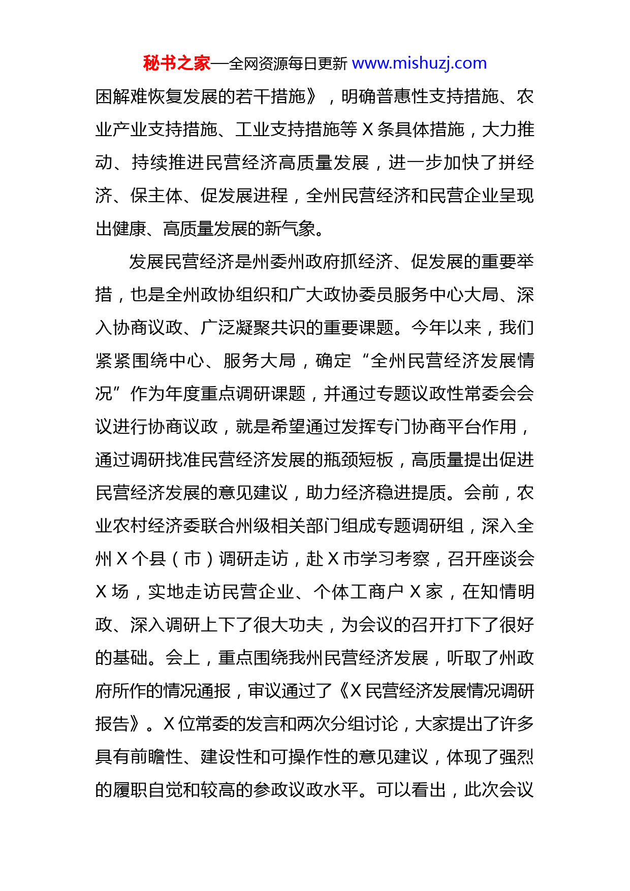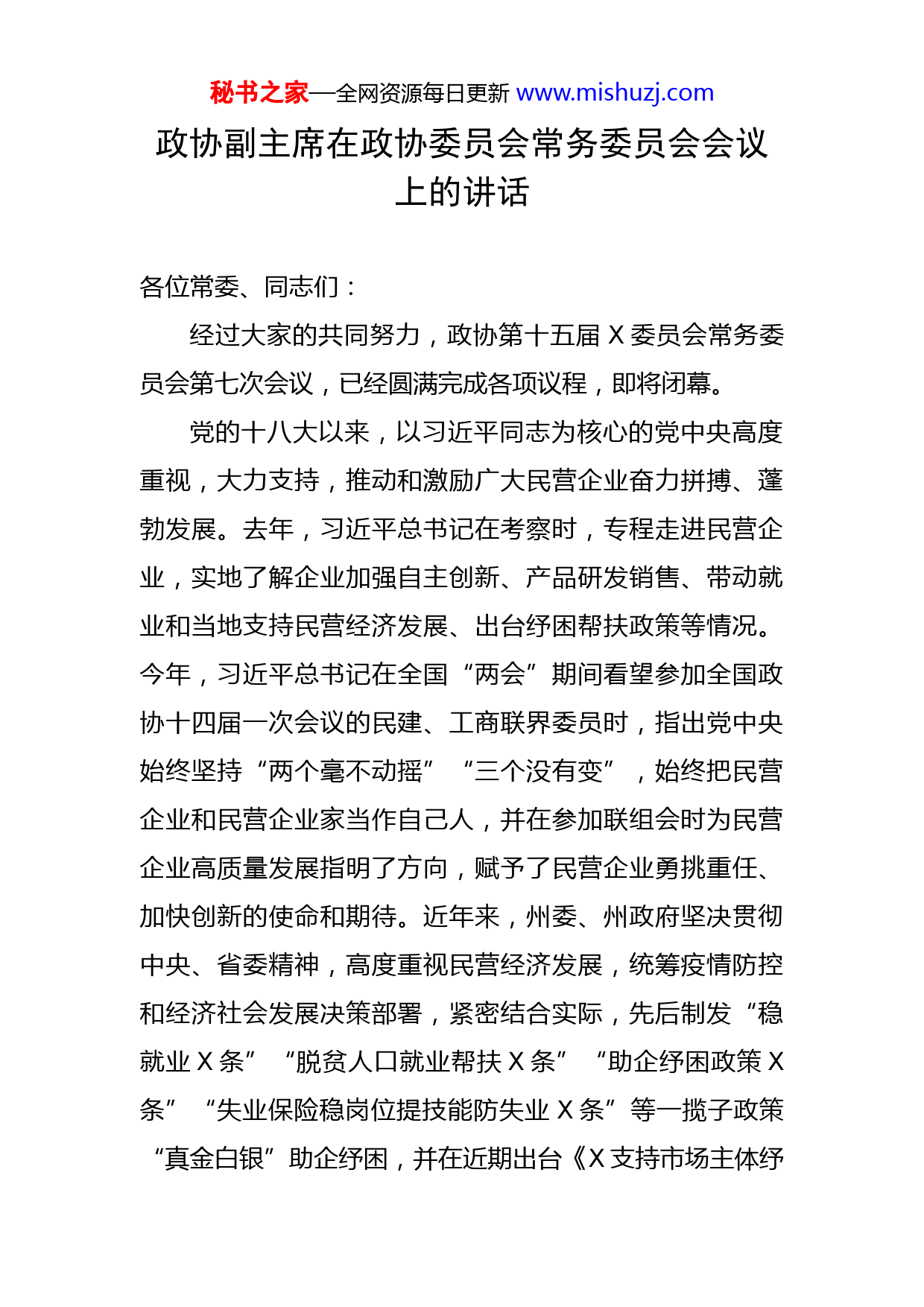 秘书之家—全网资源每日更新www.mishuzj.com政协副主席在政协委员会常务委员会会议上的讲话各位常委、同志们:经过大家的共同努力,政协第十五届X委员会常务委员会第七次会议,已经圆满完成各项议程,即将闭幕。党的十八大以来,以习近平同志为核心的党中央高度重视,大力支持,推动和激励广大民营企业奋力拼搏、蓬勃发展。去年,习近平总书记在考察时,专程走进民营企业,实地了解企业加强自主创新、产品研发销售、带动就业和当地支持民营经济发展、出台纾困帮扶政策等情况。今年,习近平总书记在全国“两会”期间看望参加全国政协十四届一次会议的民建、工商联界委员时,指出党中央始终坚持“两个毫不动摇”“三个没有变”,始终把民营企业和民营企业家当作自己人,并在参加联组会时为民营企业高质量发展指明了方向,赋予了民营企业勇挑重任、加快创新的使命和期待。近年来,州委、州政府坚决贯彻中央、省委精神,高度重视民营经济发展,统筹疫情防控和经济社会发展决策部署,紧密结合实际,先后制发“稳就业X条”“脱贫人口就业帮扶X条”“助企纾困政策X条”“失业保险稳岗位提技能防失业X条”等一揽子政策“真金白银”助企纾困,并在近期出台《X支持市场主体纾秘书之家—全网资源每日更新www.mishuzj.com困解难恢复发展的若干措施》,明确普惠性支持措施、农业产业支持措施、工业支持措施等X条具体措施,大力推动、持续推进民营经济高质量发展,进一步加快了拼经济、保主体、促发展进程,全州民营经济和民营企业呈现出健康、高质量发展的新气象。发展民营经济是州委州政府抓经济、促发展的重要举措,也是全州政协组织和广大政协委员服务中心大局、深入协商议政、广泛凝聚共识的重要课题。今年以来,我们紧紧围绕中心、服务大局,确定“全州民营经济发展情况”作为年度重点调研课题,并通过专题议政性常委会会议进行协商议政,就是希望通过发挥专门协商平台作用,通过调研找准民营经济发展的瓶颈短板,高质量提出促进民营经济发展的意见建议,助力经济稳进提质。会前,农业农村经济委联合州级相关部门组成专题调研组,深入全州X个县(市)调研走访,赴X市学习考察,召开座谈会X场,实地走访民营企业、个体工商户X家,在知情明政、深入调研上下了很大功夫,为会议的召开打下了很好的基础。会上,重点围绕我州民营经济发展,听取了州政府所作的情况通报,审议通过了《X民营经济发展情况调研报告》。X位常委的发言和两次分组讨论,大家提出了许多具有前瞻性、建设性和可操作性的意见建议,体现了强烈的履职自觉和较高的参政议政水平。可以看出,此次会议秘书之家—全网资源每日更新www.mishuzj.com外调内研充分深入,意见建议言之有物,双向发力贯穿始终,会议内容、形式、成果都非常丰富,取得了积极成效。会后,农业农村经济委要充分吸收大家的意见建议,进一步修改完善后,形成高质量的协商成果报送州委州政府。本次会议,我们还听取了州纪委监委关于党风廉政建设工作情况的通报,大家一致认为,过去一年,在州委坚强领导下,全州纪检监察机关扎实履行监督首责,政治监督更加精准、保障中心更加有效、监督网络更加严密,正风肃纪反腐高压态势持续保持,为我州高质量发展提供了坚强的政治保证和纪律保障。会议还审议通过了州政协副秘书长、专委会主任、副主任任免和十五届州政协常委、委员调整事宜,希望任命到新岗位履职的X位同志在各自岗位上学在前、干在前、当标兵、作表率,不断提高履职尽责的能力和水平,充分展示自身的良好素质;也希望其他因专委会更名重新任命的同志,立足新的起点,着力改进工作理念、优化工作模式、提升工作效能,以推动工作的新担当新作为新成绩,检验和彰显专委会设置调整的成效。各位常委、同志们:今年是喜迎建州X周年、加快建设“一州两区三家园”的关键之年,我们要坚定以习近平新时代中国特色社会主义思想为指导,全面贯彻党的二十秘书之家—全网资源每日更新www.mishuzj.com大精神,认真落实全国“两会”、省委州委十二届二次全会确定的目标任务,以党的政治建设为统领,以服务全州发展大局为主线,以加强专门协商机构建设为支撑,积极践行全过程人民民主,高标准履职、高效率作为,为奋力写好中国式现代化X新篇章贡献政协智慧和力量。受X主席委托,下面,我就当前州、县(市)政协需要着力抓好的一些重点工作,再讲几点意见。一、强化理论武装,在“三个全面”上下功夫抓好理论学习是加强党的政治建设、坚定政治信仰的重要手段。我们要把学习贯彻党的二十大、全国“两会”精神作为当前和今后一个时期的重要政治任务,始终用党的创新理论统一思想、统一意志、统一行动。一是全面学习贯彻习近平新时代中国特色社会主义思想。中央部署从X月开始,在全党自上而下分两批开展学习贯彻习近平新时代中国特色社会主义思想主题教育。这是党中央为全面贯彻党的二十大精神、动员全党为完成党的中心任务而团结奋斗所作的重大部署,是深入推进新时代党的建设新的伟大工程的重大部署。其目的就是要用习近平新时代中国特色社会主义思想凝心铸魂,推动全党更加自觉深刻领悟“两个确立”的决定性意义,增强“四个意识”、坚定“四个自信”、