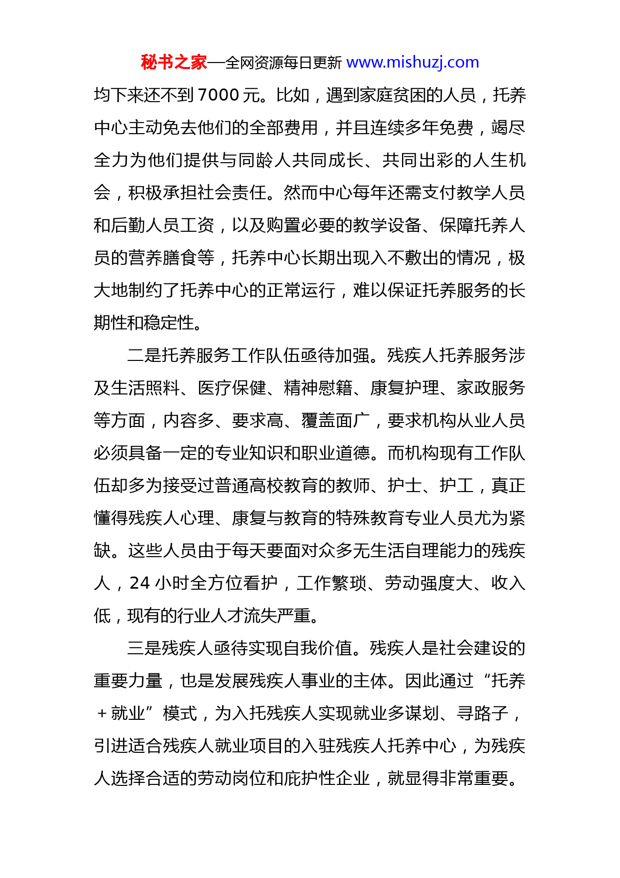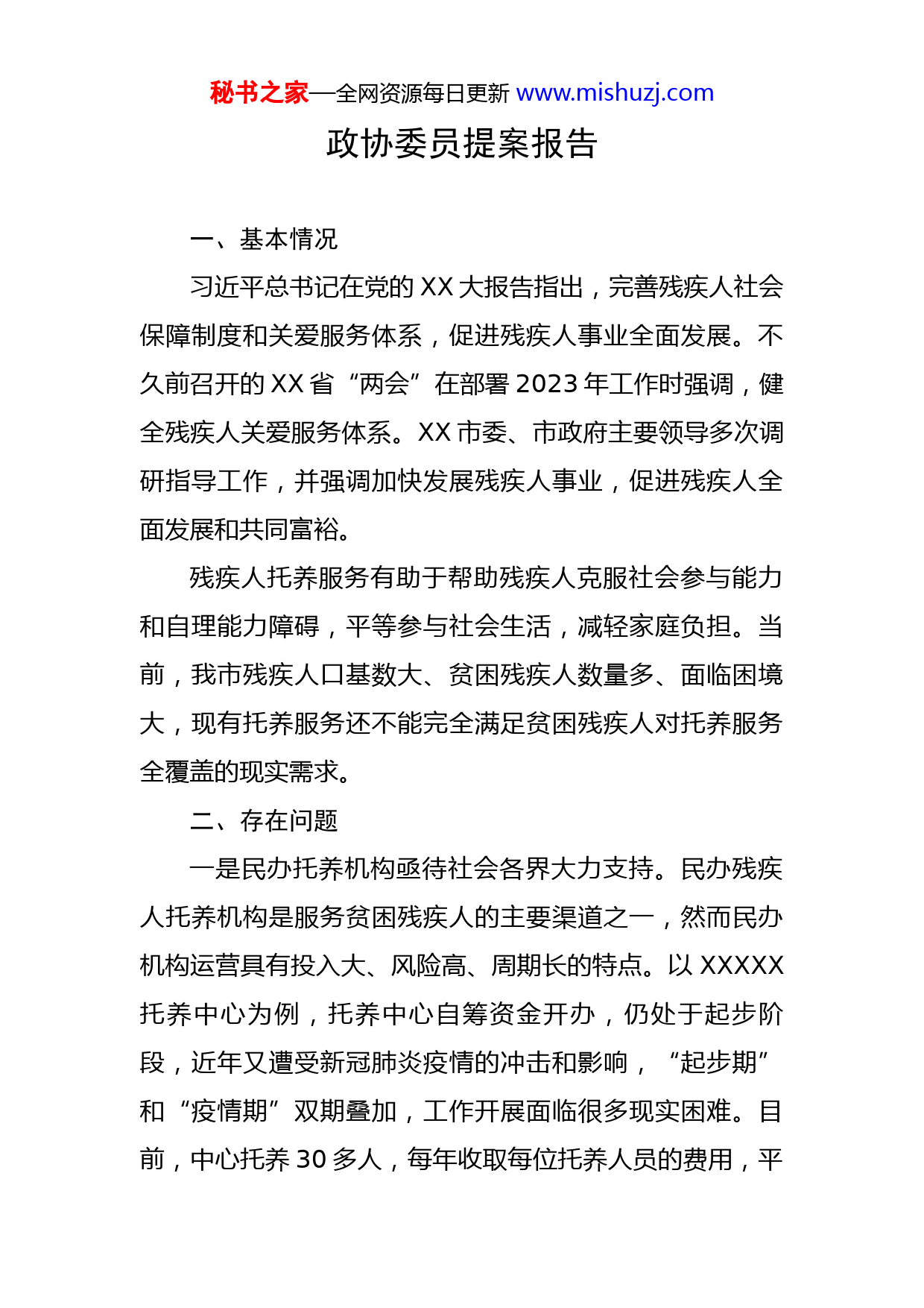 秘书之家—全网资源每日更新www.mishuzj.com政协委员提案报告一、基本情况习近平总书记在党的XX大报告指出,完善残疾人社会保障制度和关爱服务体系,促进残疾人事业全面发展。不久前召开的XX省“两会”在部署2023年工作时强调,健全残疾人关爱服务体系。XX市委、市政府主要领导多次调研指导工作,并强调加快发展残疾人事业,促进残疾人全面发展和共同富裕。残疾人托养服务有助于帮助残疾人克服社会参与能力和自理能力障碍,平等参与社会生活,减轻家庭负担。当前,我市残疾人口基数大、贫困残疾人数量多、面临困境大,现有托养服务还不能完全满足贫困残疾人对托养服务全覆盖的现实需求。二、存在问题一是民办托养机构亟待社会各界大力支持。民办残疾人托养机构是服务贫困残疾人的主要渠道之一,然而民办机构运营具有投入大、风险高、周期长的特点。以XXXXX托养中心为例,托养中心自筹资金开办,仍处于起步阶段,近年又遭受新冠肺炎疫情的冲击和影响,“起步期”和“疫情期”双期叠加,工作开展面临很多现实困难。目前,中心托养30多人,每年收取每位托养人员的费用,平秘书之家—全网资源每日更新www.mishuzj.com均下来还不到7000元。比如,遇到家庭贫困的人员,托养中心主动免去他们的全部费用,并且连续多年免费,竭尽全力为他们提供与同龄人共同成长、共同出彩的人生机会,积极承担社会责任。然而中心每年还需支付教学人员和后勤人员工资,以及购置必要的教学设备、保障托养人员的营养膳食等,托养中心长期出现入不敷出的情况,极大地制约了托养中心的正常运行,难以保证托养服务的长期性和稳定性。二是托养服务工作队伍亟待加强。残疾人托养服务涉及生活照料、医疗保健、精神慰籍、康复护理、家政服务等方面,内容多、要求高、覆盖面广,要求机构从业人员必须具备一定的专业知识和职业道德。而机构现有工作队伍却多为接受过普通高校教育的教师、护士、护工,真正懂得残疾人心理、康复与教育的特殊教育专业人员尤为紧缺。这些人员由于每天要面对众多无生活自理能力的残疾人,24小时全方位看护,工作繁琐、劳动强度大、收入低,现有的行业人才流失严重。三是残疾人亟待实现自我价值。残疾人是社会建设的重要力量,也是发展残疾人事业的主体。因此通过“托养+就业”模式,为入托残疾人实现就业多谋划、寻路子,引进适合残疾人就业项目的入驻残疾人托养中心,为残疾人选择合适的劳动岗位和庇护性企业,就显得非常重要。秘书之家—全网资源每日更新www.mishuzj.com然而,目前来说这方面还是短板,还处于探索之中。同时,一些托养机构仍然没有与各种非盈利组织、第三方机构、爱心志愿者等积极力量形成强大合力,仍处于“单打独斗”、“独木难支”的困境之中,严重制约了残疾人广泛接触社会、了解社会,感受社会的机会,也制约了残疾人实现自身价值。三、具体建议一是进一步健全规章制度。依据残疾人托养服务国家标准即《就业年龄段智力、精神及重度肢体残疾人托养服务规范》文件精神,结合我市实际制定符合吕梁市的托养服务规定,确保各机构托养服务符合规范要求。统筹整合各类资源,引导和鼓励社会力量参与,推进公办民营、民办公助等托养模式,开展邻里照护、日间照料、居家托养、集中托养等多种形式的残疾人托养服务,帮助残疾人实现自我生活能力的提升。二是进一步加大政策倾斜。延续国家对托养服务行业实施的减税降费、减免租金,困难企业降低社保费率、缓缴社保费以及贷款支持等普惠性的纾困扶持措施。加大残疾人托养服务资金投入,扩大残疾人托养服务覆盖面。适时请市政府相关部门对各种托养机构服务成本进行测算,进一步确定服务成本标准,在国家政策允许的前提下,努力对那些社会贡献大、但发展陷入困境的民办托养机构加秘书之家—全网资源每日更新www.mishuzj.com大政策倾斜。三是进一步强化工作队伍。在全市事业单位招聘考试中专门单列一定数量岗位用于招考特殊教育专业大学毕业生,录用后充实到托养服务机构中,不断壮大师资力量,切实提升托养服务水平。市残联持续加大力度,定期组织全市托养机构从业人员集中培训,邀请行业专家、学者、教授上课,讲解政策法规,传授工作经验,并组织参观见学活动,取长补短,促进托养机构提升师资水平。同时,在条件允许的情况下,把托养机构老师送到外地学习培训,开阔眼界,增长见识,提高服务能力,更好地帮助残疾人塑造自尊自信、自立自强的品格,激发残疾人奋勇拼搏动力,持续实现残疾人自我能力的提升。