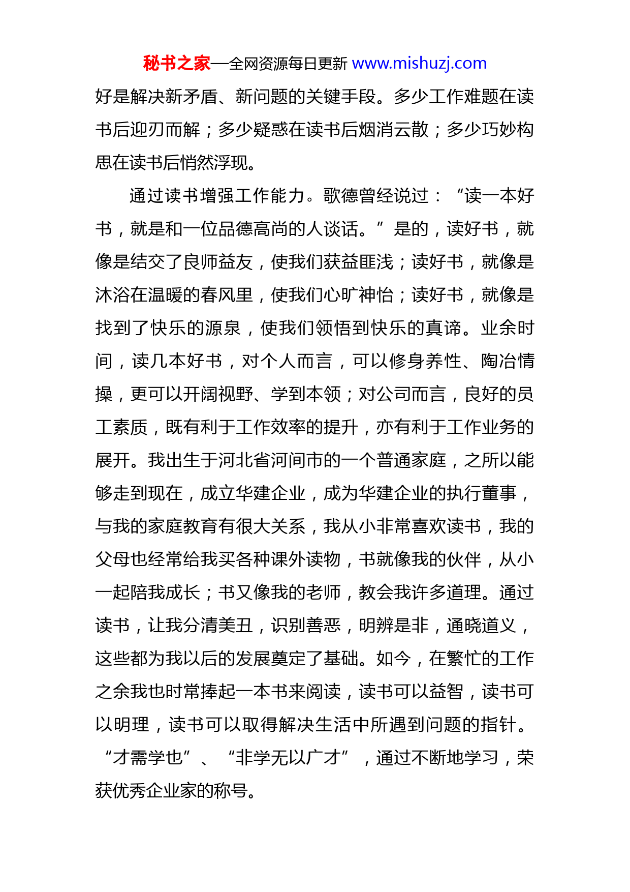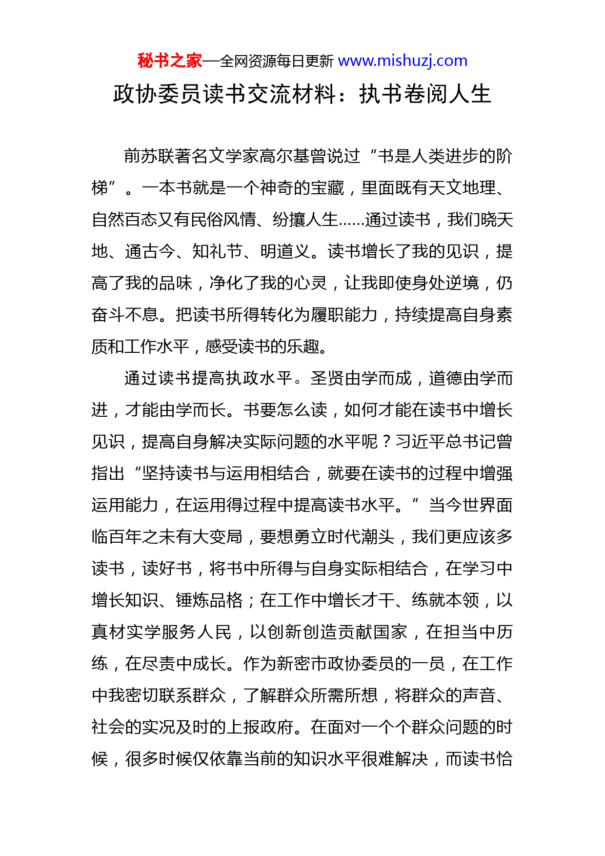 秘书之家—全网资源每日更新www.mishuzj.com政协委员读书交流材料:执书卷阅人生前苏联著名文学家高尔基曾说过“书是人类进步的阶梯”。一本书就是一个神奇的宝藏,里面既有天文地理、自然百态又有民俗风情、纷攘人生……通过读书,我们晓天地、通古今、知礼节、明道义。读书增长了我的见识,提高了我的品味,净化了我的心灵,让我即使身处逆境,仍奋斗不息。把读书所得转化为履职能力,持续提高自身素质和工作水平,感受读书的乐趣。通过读书提高执政水平。圣贤由学而成,道德由学而进,才能由学而长。书要怎么读,如何才能在读书中增长见识,提高自身解决实际问题的水平呢?习近平总书记曾指出“坚持读书与运用相结合,就要在读书的过程中增强运用能力,在运用得过程中提高读书水平。”当今世界面临百年之未有大变局,要想勇立时代潮头,我们更应该多读书,读好书,将书中所得与自身实际相结合,在学习中增长知识、锤炼品格;在工作中增长才干、练就本领,以真材实学服务人民,以创新创造贡献国家,在担当中历练,在尽责中成长。作为新密市政协委员的一员,在工作中我密切联系群众,了解群众所需所想,将群众的声音、社会的实况及时的上报政府。在面对一个个群众问题的时候,很多时候仅依靠当前的知识水平很难解决,而读书恰秘书之家—全网资源每日更新www.mishuzj.com好是解决新矛盾、新问题的关键手段。多少工作难题在读书后迎刃而解;多少疑惑在读书后烟消云散;多少巧妙构思在读书后悄然浮现。通过读书增强工作能力。歌德曾经说过:“读一本好书,就是和一位品德高尚的人谈话。”是的,读好书,就像是结交了良师益友,使我们获益匪浅;读好书,就像是沐浴在温暖的春风里,使我们心旷神怡;读好书,就像是找到了快乐的源泉,使我们领悟到快乐的真谛。业余时间,读几本好书,对个人而言,可以修身养性、陶冶情操,更可以开阔视野、学到本领;对公司而言,良好的员工素质,既有利于工作效率的提升,亦有利于工作业务的展开。我出生于河北省河间市的一个普通家庭,之所以能够走到现在,成立华建企业,成为华建企业的执行董事,与我的家庭教育有很大关系,我从小非常喜欢读书,我的父母也经常给我买各种课外读物,书就像我的伙伴,从小一起陪我成长;书又像我的老师,教会我许多道理。通过读书,让我分清美丑,识别善恶,明辨是非,通晓道义,这些都为我以后的发展奠定了基础。如今,在繁忙的工作之余我也时常捧起一本书来阅读,读书可以益智,读书可以明理,读书可以取得解决生活中所遇到问题的指针。“才需学也”、“非学无以广才”,通过不断地学习,荣获优秀企业家的称号。秘书之家—全网资源每日更新www.mishuzj.com通过读书养性,陶冶性情。“衣服可以装饰我们的外表,读书可以净化我们的内心。”“医病不如吃药,医俗不如读书。”通俗的话语传达出的是读书带给我们内在的改变。阅读历史,我们可以知得失;阅读文学,我们可以增才情;阅读哲学,我们可以辩是非;阅读伦理,我们可以知廉耻。只有不断地读书、读好书,才能从中汲取思想营养,逐步拥有高尚的品德,树立正确的人生观和价值观,才能具有责任感和使命感,才能与时俱进,适应时代的发展要求。市政协开展的“书卷常开、书香政协”活动,组织政协委员多读书、读好书、善读书,引导委员更好履职尽责,广泛凝聚共识,以实际行动迎接党的二十大胜利召开。巨大的建筑,总是由一木一石叠起来的,读书亦是如此。读书虽不能够让你短时间内有所不同,但经过时间的沉淀,终究会让你有所成。匡衡凿壁偷光,孙敬悬梁刺股,只有孜孜不倦的读书,汲取知识的养分,化为自身成长的动力,才能适应不同的时代要求,实现自身的人生价值。习近平总书记指出:“学习是文明传承之途、人生成长之梯、政党巩固之基、国家兴盛之要。”朋友们,从此刻开始,让我们一起读书吧!在读书中感悟人生,在读书中学会思考,在读书中幸福成长。让我们以自身实际行秘书之家—全网资源每日更新www.mishuzj.com动,迎接二十大的顺利召开!