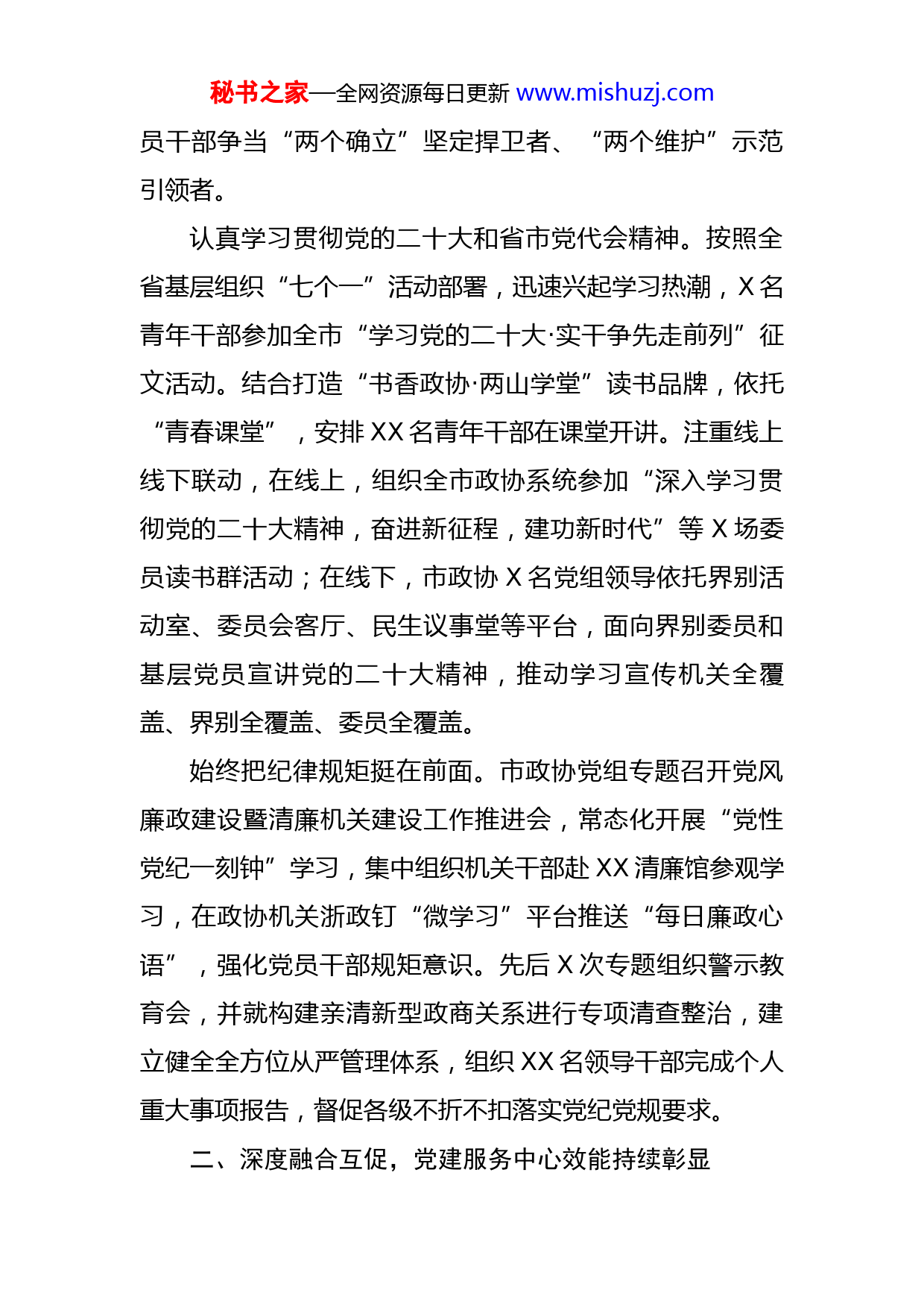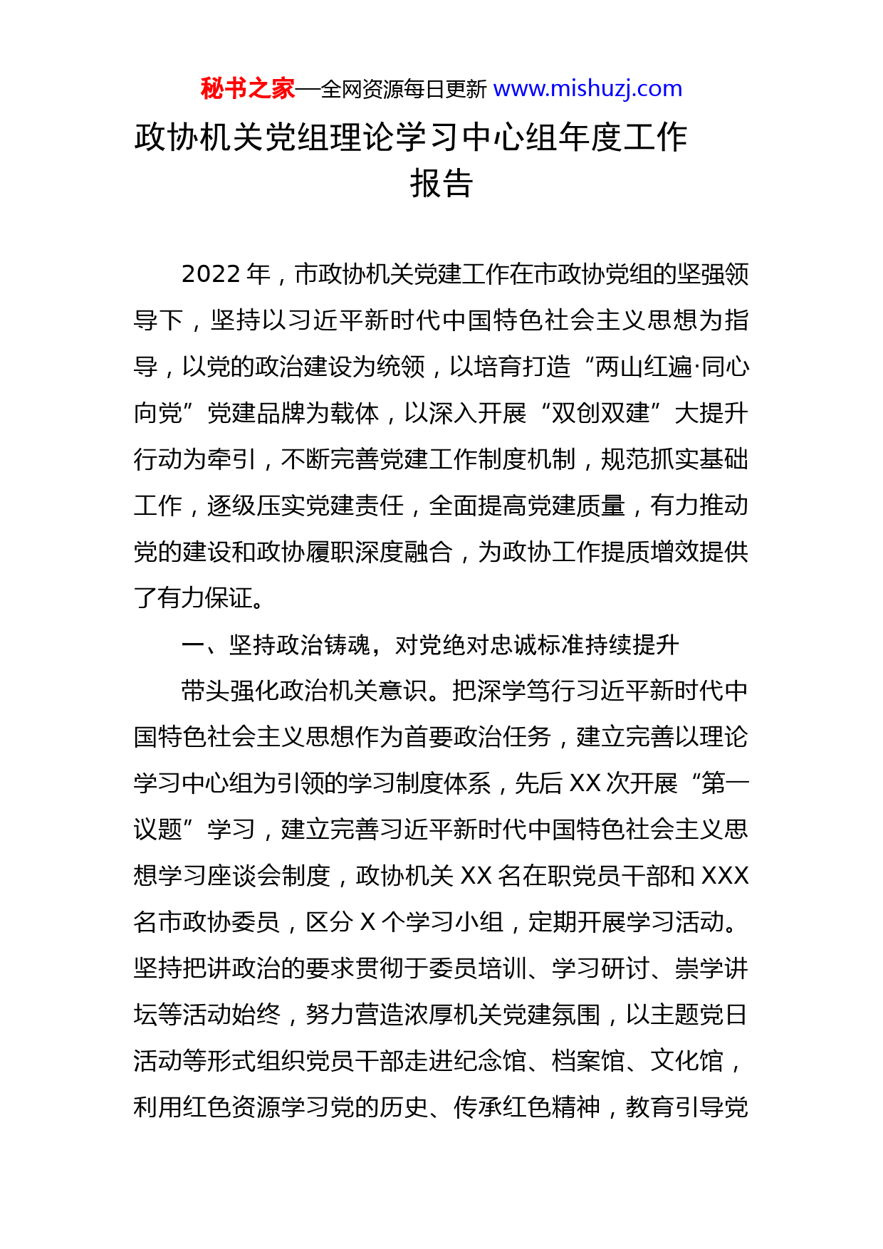秘书之家—全网资源每日更新www.mishuzj.com政协机关党组理论学习中心组年度工作报告2022年,市政协机关党建工作在市政协党组的坚强领导下,坚持以习近平新时代中国特色社会主义思想为指导,以党的政治建设为统领,以培育打造“两山红遍·同心向党”党建品牌为载体,以深入开展“双创双建”大提升行动为牵引,不断完善党建工作制度机制,规范抓实基础工作,逐级压实党建责任,全面提高党建质量,有力推动党的建设和政协履职深度融合,为政协工作提质增效提供了有力保证。一、坚持政治铸魂,对党绝对忠诚标准持续提升带头强化政治机关意识。把深学笃行习近平新时代中国特色社会主义思想作为首要政治任务,建立完善以理论学习中心组为引领的学习制度体系,先后XX次开展“第一议题”学习,建立完善习近平新时代中国特色社会主义思想学习座谈会制度,政协机关XX名在职党员干部和XXX名市政协委员,区分X个学习小组,定期开展学习活动。坚持把讲政治的要求贯彻于委员培训、学习研讨、崇学讲坛等活动始终,努力营造浓厚机关党建氛围,以主题党日活动等形式组织党员干部走进纪念馆、档案馆、文化馆,利用红色资源学习党的历史、传承红色精神,教育引导党秘书之家—全网资源每日更新www.mishuzj.com员干部争当“两个确立”坚定捍卫者、“两个维护”示范引领者。认真学习贯彻党的二十大和省市党代会精神。按照全省基层组织“七个一”活动部署,迅速兴起学习热潮,X名青年干部参加全市“学习党的二十大·实干争先走前列”征文活动。结合打造“书香政协·两山学堂”读书品牌,依托“青春课堂”,安排XX名青年干部在课堂开讲。注重线上线下联动,在线上,组织全市政协系统参加“深入学习贯彻党的二十大精神,奋进新征程,建功新时代”等X场委员读书群活动;在线下,市政协X名党组领导依托界别活动室、委员会客厅、民生议事堂等平台,面向界别委员和基层党员宣讲党的二十大精神,推动学习宣传机关全覆盖、界别全覆盖、委员全覆盖。始终把纪律规矩挺在前面。市政协党组专题召开党风廉政建设暨清廉机关建设工作推进会,常态化开展“党性党纪一刻钟”学习,集中组织机关干部赴XX清廉馆参观学习,在政协机关浙政钉“微学习”平台推送“每日廉政心语”,强化党员干部规矩意识。先后X次专题组织警示教育会,并就构建亲清新型政商关系进行专项清查整治,建立健全全方位从严管理体系,组织XX名领导干部完成个人重大事项报告,督促各级不折不扣落实党纪党规要求。二、深度融合互促,党建服务中心效能持续彰显秘书之家—全网资源每日更新www.mishuzj.com坚持把党的领导贯穿政协履职全过程。一年来,市政协党组突出把学习贯彻习近平总书记关于统筹疫情防控和经济社会发展的重要指示批示和党中央有关精神,与学习贯彻省委“两个先行”、市委“六个新XX”建设等决策部署紧密结合,主动将政协工作置于市委工作大局之中,严格执行请示报告制度,把党建工作纳入机关“奔跑委室”“优秀委室”评选范围,作为市对区县年度政协工作综合考评的重要内容,立起了党建引领的鲜明导向。聚焦中心大局谋划推进党的建设。市政协党组把投身市委实干争先主题实践作为学习贯彻落实省、市党代会精神的总载体、总抓手,加开政协常委会专题研究部署,专门制定《实施方案》。围绕大力实施生态强市、制造强市战略,组织市委书记、市长与政协委员“面对面”高端协商,举办X次常委会专题议政、X次双月协商座谈,共有XXX多名政协委员、XXX多名市民代表参加协商议政,向市委市政府报送X份《协商纪要》。聚焦全媒体《看见》栏目暴露的问题线索,开展“《看见》政协在监督”,分类开展X场专项民主监督活动,报送X份《民主监督建议书》,推动建立长效机制,举一反三解决问题,主要做法被省政协确定为年度政协工作创新案例。带头践行政协履职为民的服务宗旨。牵头组织X期“亲清直通车·政企恳谈会”,市政协主要领导先后与XX秘书之家—全网资源每日更新www.mishuzj.com名企业家代表面对面畅谈。积极参与“三聚三保三落实”助企纾困稳进提质攻坚行动,主席会议成员下沉一线实地解难帮困,共走访联系企业XX家,报送《关于疫情防控常态化背景下进一步开展助企纾困工作的建议》,得到省、市领导批示肯定。创新构建“四融三联两走进”凝聚共识新机制,以“六个一”活动落实集体学习、界别协商、民主监督。连续XX次开展“主席接待日”活动,共有XX余位政协委员、界别群众走进政协机关,面对面协调解决问题XX多个。继续发挥全国社情民意信息联系直报点优势,广泛搜集民意信息。市政协为XXX名政协委员发放“民情日记本”,共编发信息专报XXX期,有XX条信息被全国政协和省政协采用,走在了全省前列。三、锻造坚强堡垒,党的组织体系建设持续优化完善组织体系,基层基础不断夯实。持续深化“六好”支部创建,开展“堡垒指数”“先锋指数”管理,机关三支部、四支部分别评为市直机关标准化建设“示范支部”和“特色支部”,X名同志评为“优秀党员”。按照“机关设党委、专委会设支部、界别设小组”的基本思路,将市政协委员中的XXX名党员委员,组成X个履职临时党委和X个临时党支部,围绕履职需要开展工作、发挥作用。指导区县在XX个“民生