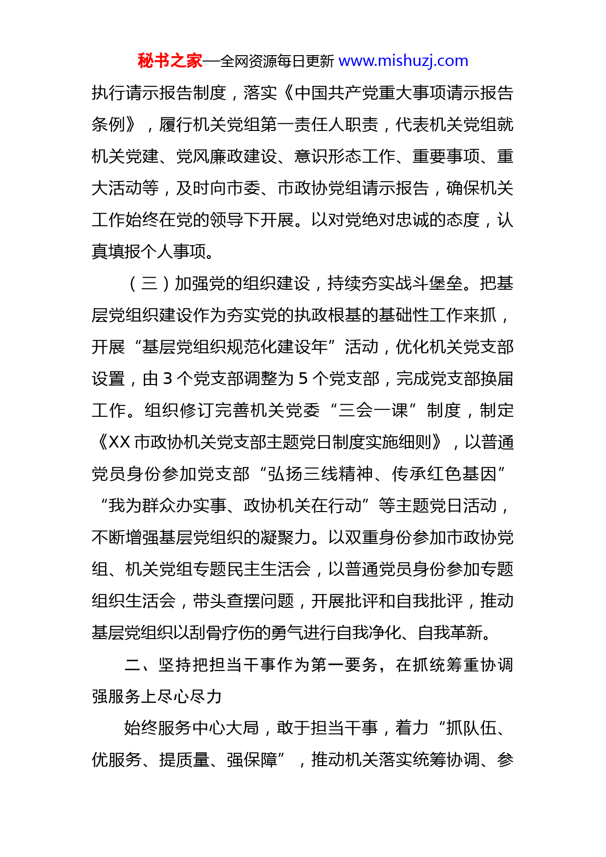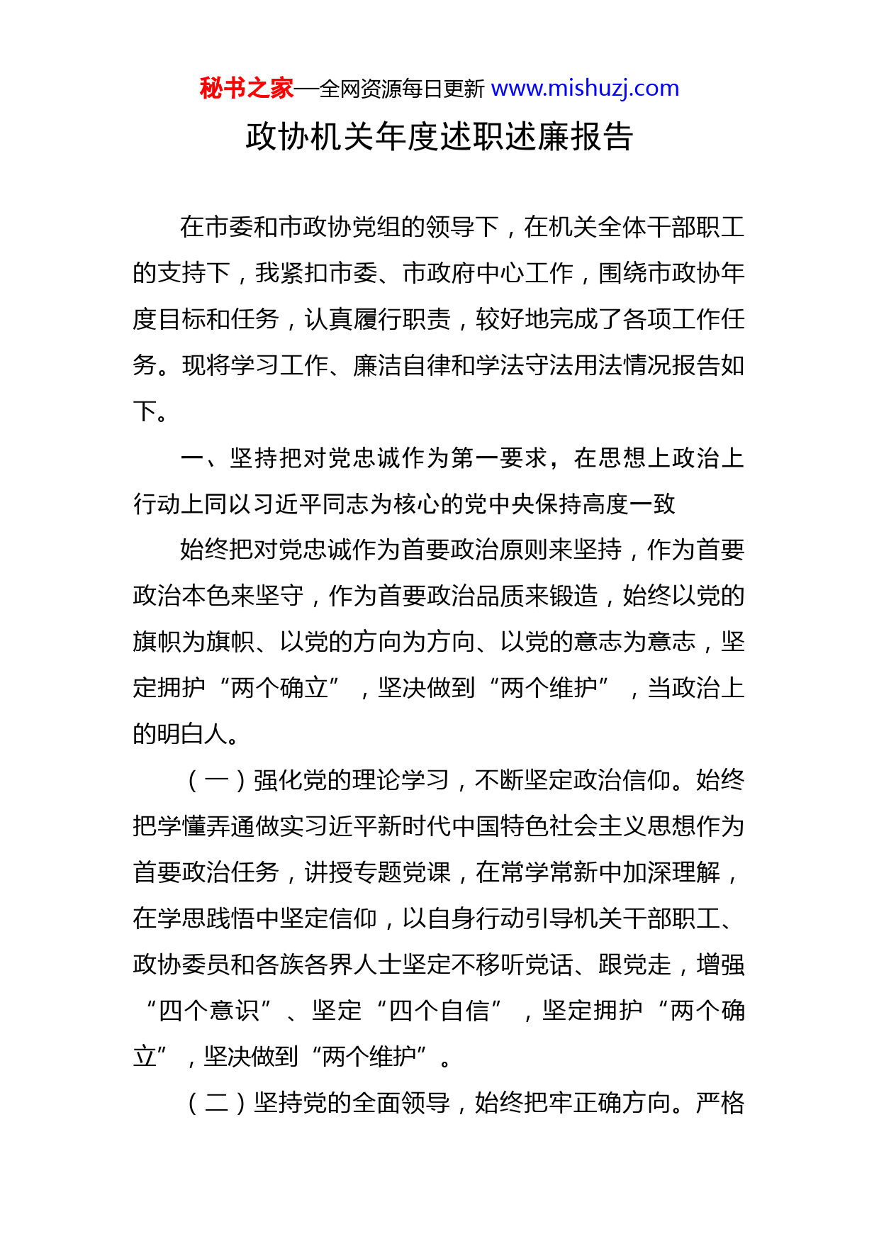 秘书之家—全网资源每日更新www.mishuzj.com政协机关年度述职述廉报告在市委和市政协党组的领导下,在机关全体干部职工的支持下,我紧扣市委、市政府中心工作,围绕市政协年度目标和任务,认真履行职责,较好地完成了各项工作任务。现将学习工作、廉洁自律和学法守法用法情况报告如下。一、坚持把对党忠诚作为第一要求,在思想上政治上行动上同以习近平同志为核心的党中央保持高度一致始终把对党忠诚作为首要政治原则来坚持,作为首要政治本色来坚守,作为首要政治品质来锻造,始终以党的旗帜为旗帜、以党的方向为方向、以党的意志为意志,坚定拥护“两个确立”,坚决做到“两个维护”,当政治上的明白人。(一)强化党的理论学习,不断坚定政治信仰。始终把学懂弄通做实习近平新时代中国特色社会主义思想作为首要政治任务,讲授专题党课,在常学常新中加深理解,在学思践悟中坚定信仰,以自身行动引导机关干部职工、政协委员和各族各界人士坚定不移听党话、跟党走,增强“四个意识”、坚定“四个自信”,坚定拥护“两个确立”,坚决做到“两个维护”。(二)坚持党的全面领导,始终把牢正确方向。严格秘书之家—全网资源每日更新www.mishuzj.com执行请示报告制度,落实《中国共产党重大事项请示报告条例》,履行机关党组第一责任人职责,代表机关党组就机关党建、党风廉政建设、意识形态工作、重要事项、重大活动等,及时向市委、市政协党组请示报告,确保机关工作始终在党的领导下开展。以对党绝对忠诚的态度,认真填报个人事项。(三)加强党的组织建设,持续夯实战斗堡垒。把基层党组织建设作为夯实党的执政根基的基础性工作来抓,开展“基层党组织规范化建设年”活动,优化机关党支部设置,由3个党支部调整为5个党支部,完成党支部换届工作。组织修订完善机关党委“三会一课”制度,制定《XX市政协机关党支部主题党日制度实施细则》,以普通党员身份参加党支部“弘扬三线精神、传承红色基因”“我为群众办实事、政协机关在行动”等主题党日活动,不断增强基层党组织的凝聚力。以双重身份参加市政协党组、机关党组专题民主生活会,以普通党员身份参加专题组织生活会,带头查摆问题,开展批评和自我批评,推动基层党组织以刮骨疗伤的勇气进行自我净化、自我革新。二、坚持把担当干事作为第一要务,在抓统筹重协调强服务上尽心尽力始终服务中心大局,敢于担当干事,着力“抓队伍、优服务、提质量、强保障”,推动机关落实统筹协调、参秘书之家—全网资源每日更新www.mishuzj.com谋助手、督办落实、服务保障等职能,为政协各项工作的开展提供有力保障。(一)积极发挥参谋助手作用。紧扣省政协、市委和市政协党组、主席会议重大决策部署,提出意见建议,推动各项工作部署落到实处,取得实效。协助谋划协商计划和工作要点、党组理论中心组学习计划、“助力脱贫攻坚、助推乡村振兴”专项活动方案,分解年度目标绩效考核工作任务、市政协领导联系(督导)市级重点工作任务,积极做好相关工作的组织实施。(二)着力强化履职服务保障。加强对市政协重点工作、重大活动、重要会议的统筹协调和服务保障,促进各项工作顺利开展。一年来,精心筹备召开2次全委会议、4次常委会议、18次主席会议,组织科技创新情况、xx建设情况常委会视察。强化宣传信息工作,在《xx政协报》《XX日报》上刊登政协履职专版,xxx等被省政协采纳并报送全国政协和省直部门。牵头组织好市政协考察学习活动,协助开展《新阶段XX产业创新发展战略研究》课题研究,支持配合专委会开展煤炭资源可持续利用、主城区公办及普惠性学前教育资源配置、防范化解安全生产领域重大风险等重点调研视察16次。协助省政协联合开展“大力发展新技术新业态新模式,加快提升现代物流企业竞争力”“芒果种子资源”等同题调研。配合推进“书香政秘书之家—全网资源每日更新www.mishuzj.com协”建设,开展“悦读新时代,书香筑梦圆”读书分享活动,支持配合有关专委会与xx市政协联合举办“xxx”美术书法作品联展。协助推进“有事来协商”平台建设,细化工作方案,强化服务保障;配合召开“有事来协商”工作推进会,开展“小微协商”活动,协助有关方面解决了老旧小区污水管网改造、村民用水困难等一批老百姓“急难愁盼”的问题。积极开展换届相关工作,严肃换届纪律,确保政协换届工作圆满完成。做好机关疫情防控常态化和联系督xx县疫情防控、xx村对口帮扶等工作。统筹协调困难职工、困难群众、老干部慰问活动,与相关专委会共同组织了第七次“委员活动日”活动,分别在xx大学、xx大学举办了市政协委员党史学习教育和履职能力提升班。(三)强力推动机关高效运转。强化机关运转,有序协调市政协领导和各工作机构负责人参加全市有关会议和活动,严格文稿审核把关,全年审核各类文稿200余份,审签各类文件2000余份。强化制度建设,制定机关党组工作规则、议事决策规则,机关加班管理、值班管理暂行办法,修订完善机关公务车辆管理、公务出行车辆保障管理办法,印发《关于严肃财经纪律进一步加强机关财务管理工作的通知》,不断提升机关管理服务水平。强化干部队伍建设,组织机关公文处理技能竞赛活动,提升机关干部职工文稿写作和公