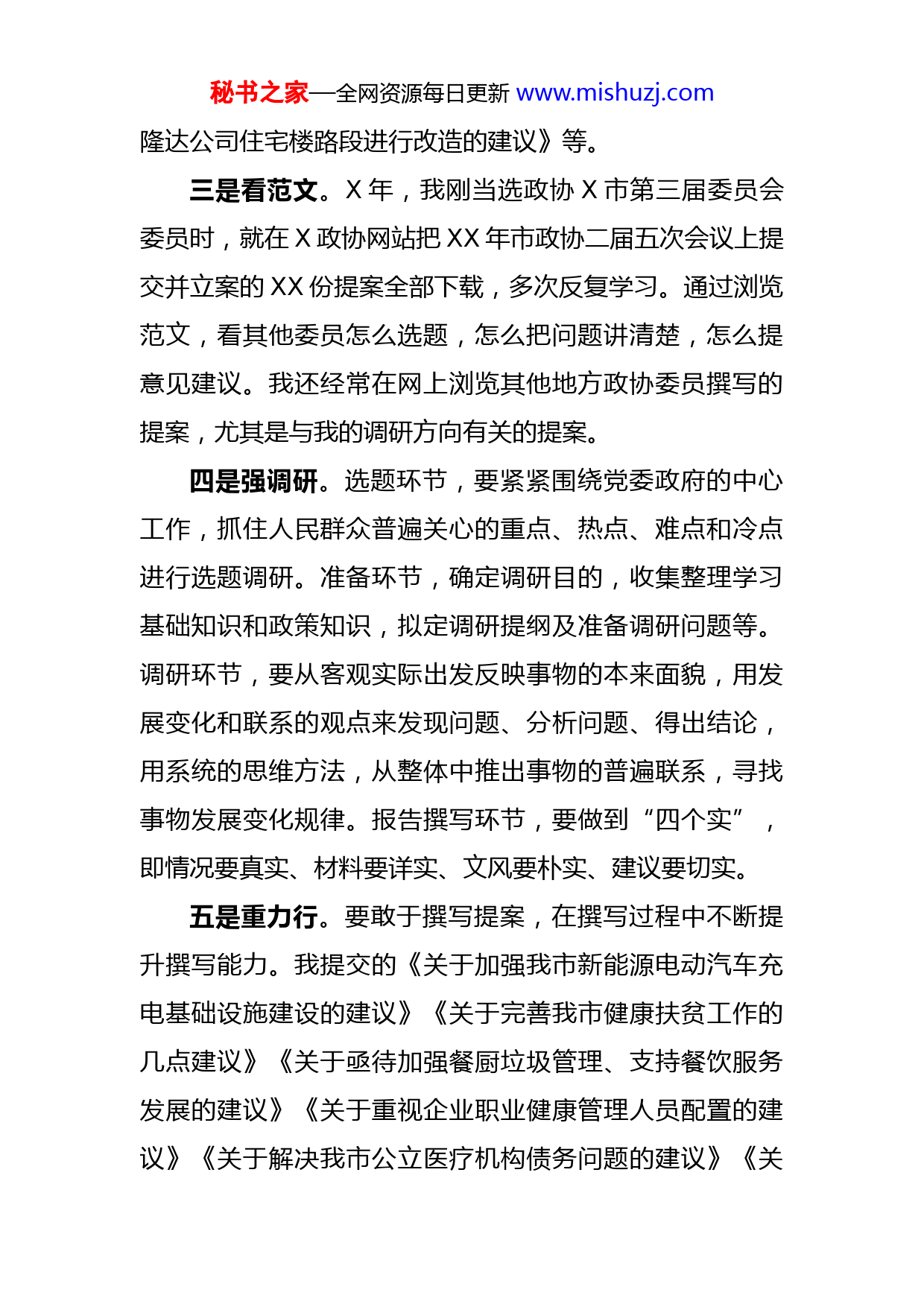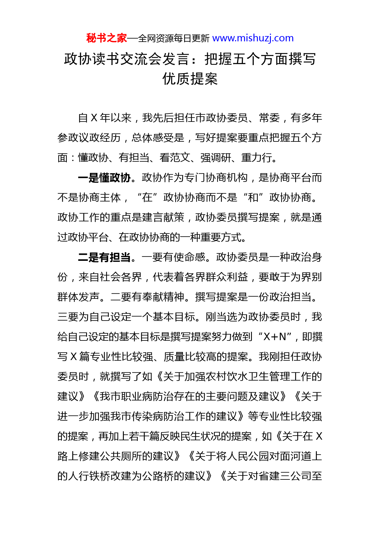 秘书之家—全网资源每日更新www.mishuzj.com政协读书交流会发言:把握五个方面撰写优质提案自X年以来,我先后担任市政协委员、常委,有多年参政议政经历,总体感受是,写好提案要重点把握五个方面:懂政协、有担当、看范文、强调研、重力行。一是懂政协。政协作为专门协商机构,是协商平台而不是协商主体,“在”政协协商而不是“和”政协协商。政协工作的重点是建言献策,政协委员撰写提案,就是通过政协平台、在政协协商的一种重要方式。二是有担当。一要有使命感。政协委员是一种政治身份,来自社会各界,代表着各界群众利益,要敢于为界别群体发声。二要有奉献精神。撰写提案是一份政治担当。三要为自己设定一个基本目标。刚当选为政协委员时,我给自己设定的基本目标是撰写提案努力做到“X+N”,即撰写X篇专业性比较强、质量比较高的提案。我刚担任政协委员时,就撰写了如《关于加强农村饮水卫生管理工作的建议》《我市职业病防治存在的主要问题及建议》《关于进一步加强我市传染病防治工作的建议》等专业性比较强的提案,再加上若干篇反映民生状况的提案,如《关于在X路上修建公共厕所的建议》《关于将人民公园对面河道上的人行铁桥改建为公路桥的建议》《关于对省建三公司至秘书之家—全网资源每日更新www.mishuzj.com隆达公司住宅楼路段进行改造的建议》等。三是看范文。X年,我刚当选政协X市第三届委员会委员时,就在X政协网站把XX年市政协二届五次会议上提交并立案的XX份提案全部下载,多次反复学习。通过浏览范文,看其他委员怎么选题,怎么把问题讲清楚,怎么提意见建议。我还经常在网上浏览其他地方政协委员撰写的提案,尤其是与我的调研方向有关的提案。四是强调研。选题环节,要紧紧围绕党委政府的中心工作,抓住人民群众普遍关心的重点、热点、难点和冷点进行选题调研。准备环节,确定调研目的,收集整理学习基础知识和政策知识,拟定调研提纲及准备调研问题等。调研环节,要从客观实际出发反映事物的本来面貌,用发展变化和联系的观点来发现问题、分析问题、得出结论,用系统的思维方法,从整体中推出事物的普遍联系,寻找事物发展变化规律。报告撰写环节,要做到“四个实”,即情况要真实、材料要详实、文风要朴实、建议要切实。五是重力行。要敢于撰写提案,在撰写过程中不断提升撰写能力。我提交的《关于加强我市新能源电动汽车充电基础设施建设的建议》《关于完善我市健康扶贫工作的几点建议》《关于亟待加强餐厨垃圾管理、支持餐饮服务发展的建议》《关于重视企业职业健康管理人员配置的建议》《关于解决我市公立医疗机构债务问题的建议》《关秘书之家—全网资源每日更新www.mishuzj.com于发展体育+旅游助推我市全域旅游发展的建议》《关于进一步优化我市托育服务体系建设的建议》等,其中多篇提案被市政协评为优秀提案。XX年撰写《关于加强临床用血供应保障助力常态化疫情防控的建议》,农工党X省委会将其作为集体提案提交省政协十二届五次会议,被列为省领导督办重点提案。