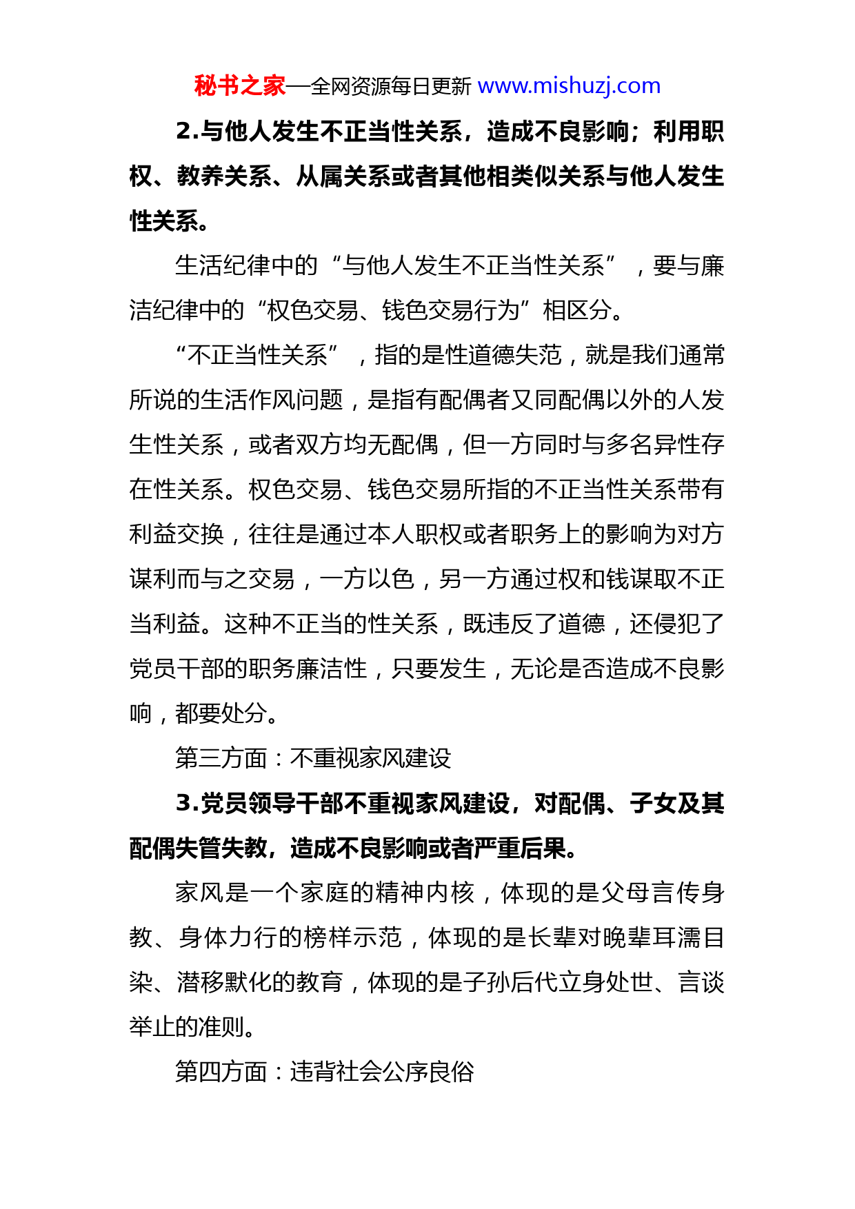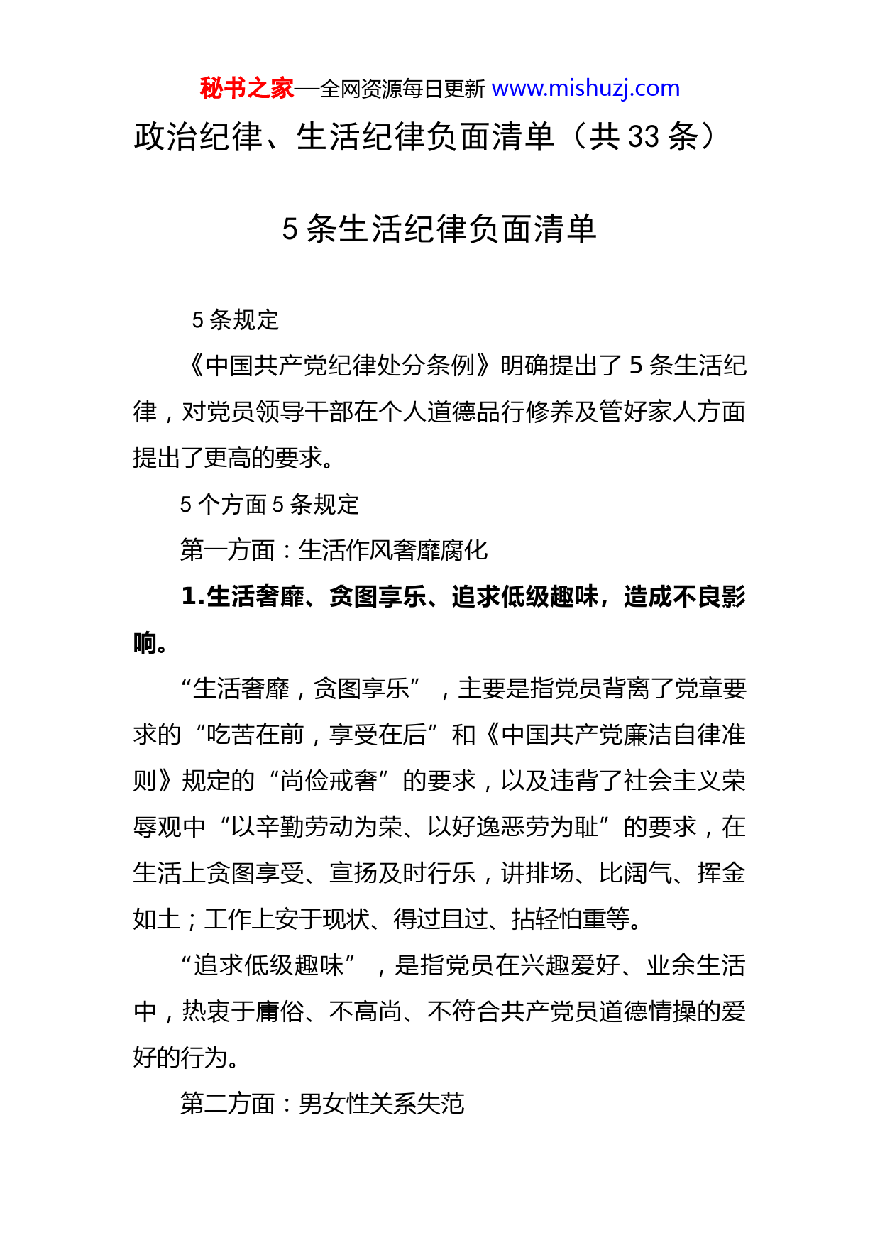 秘书之家—全网资源每日更新www.mishuzj.com政治纪律、生活纪律负面清单(共33条)5条生活纪律负面清单5条规定《中国共产党纪律处分条例》明确提出了5条生活纪律,对党员领导干部在个人道德品行修养及管好家人方面提出了更高的要求。5个方面5条规定第一方面:生活作风奢靡腐化1.生活奢靡、贪图享乐、追求低级趣味,造成不良影响。“生活奢靡,贪图享乐”,主要是指党员背离了党章要求的“吃苦在前,享受在后”和《中国共产党廉洁自律准则》规定的“尚俭戒奢”的要求,以及违背了社会主义荣辱观中“以辛勤劳动为荣、以好逸恶劳为耻”的要求,在生活上贪图享受、宣扬及时行乐,讲排场、比阔气、挥金如土;工作上安于现状、得过且过、拈轻怕重等。“追求低级趣味”,是指党员在兴趣爱好、业余生活中,热衷于庸俗、不高尚、不符合共产党员道德情操的爱好的行为。第二方面:男女性关系失范秘书之家—全网资源每日更新www.mishuzj.com2.与他人发生不正当性关系,造成不良影响;利用职权、教养关系、从属关系或者其他相类似关系与他人发生性关系。生活纪律中的“与他人发生不正当性关系”,要与廉洁纪律中的“权色交易、钱色交易行为”相区分。“不正当性关系”,指的是性道德失范,就是我们通常所说的生活作风问题,是指有配偶者又同配偶以外的人发生性关系,或者双方均无配偶,但一方同时与多名异性存在性关系。权色交易、钱色交易所指的不正当性关系带有利益交换,往往是通过本人职权或者职务上的影响为对方谋利而与之交易,一方以色,另一方通过权和钱谋取不正当利益。这种不正当的性关系,既违反了道德,还侵犯了党员干部的职务廉洁性,只要发生,无论是否造成不良影响,都要处分。第三方面:不重视家风建设3.党员领导干部不重视家风建设,对配偶、子女及其配偶失管失教,造成不良影响或者严重后果。家风是一个家庭的精神内核,体现的是父母言传身教、身体力行的榜样示范,体现的是长辈对晚辈耳濡目染、潜移默化的教育,体现的是子孙后代立身处世、言谈举止的准则。第四方面:违背社会公序良俗秘书之家—全网资源每日更新www.mishuzj.com4.违背社会公序良俗,在公共场所有不当行为,造成不良影响。公序,即公共秩序,主要是指维护国家和社会正常发展的一般秩序。良俗,即良好风俗,主要是指维护国家和社会健康发展的一般道德。遵守公序良俗,主要是指党员的行为应当遵守公共秩序,符合善良风俗,不得违反国家的公共秩序和社会的一般道德。第五方面:违反社会公德、家庭美德5.其他严重违反社会公德、家庭美德的行为。社会公德是指人们在社会交往和公共生活中应该遵守的行为准则,是维护社会成员之间最基本的社会关系秩序、保证社会和谐稳定最起码的道德要求。家庭美德是家庭生活的道德规范,主要包括尊老爱幼、男女平等、夫妻和睦、勤俭持家、邻里互助等内容。秘书之家—全网资源每日更新www.mishuzj.com28条政治纪律负面清单9个方面28条负面清单《中国共产党纪律处分条例》为党组织和党员划出了政治纪律“红线”,主要划分为9个方面28条负面清单。第一方面:“四个意识”不强、落实“两个维护”不到位1.在重大原则问题上不同党中央保持一致且有实际言论、行为或者造成不良后果。2.在党内组织秘密集团或者组织其他分裂党的活动,参加秘密集团或者参加其他分裂党的活动。3.党员领导干部在本人主政的地方或者分管的部门自行其是,搞山头主义,拒不执行党中央确定的大政方针,甚至背着党中央另搞一套。4.落实党中央决策部署不坚决,打折扣、搞变通,在政治上造成不良影响或者严重后果。5.擅自对应当由党中央决定的重大政策问题作出决定、对外发表主张。第二方面:发表、传播有严重政治问题的言论6.通过网络、广播、电视、报刊、传单、书籍等,或者利用讲座、论坛、报告会、座谈会等方式,公开发表坚持资产阶级自由化立场,反对、违背四项基本原则,反对、违背、歪曲党的改革开放决策或者其他有严重政治问秘书之家—全网资源每日更新www.mishuzj.com题的文章、演说、宣言、声明等行为;妄议党中央大政方针,破坏党的集中统一;丑化党和国家形象,或者诋毁、诬蔑党和国家领导人、英雄模范,或者歪曲党的历史、中华人民共和国历史、人民军队历史,以及为这些行为提供方便条件。7.制作、贩卖、传播坚持资产阶级自由化立场、反对四项基本原则、反对改革开放决策、有严重政治问题的书刊、音像制品、电子读物、网络音视频资料等。8.私自携带、寄递坚持资产阶级自由化立场、反对四项基本原则、反对改革开放决策、有严重政治问题的资料入出境。第三方面:破坏党的团结统一9.在党内搞团团伙伙、结党营私、拉帮结派、培植个人势力等非组织活动,或者通过搞利益交换、为自己营造声势等活动捞取政治资本。10.制造、散布、传播政治谣言,破坏党的团结统一;政治品行恶劣,匿名诬告,有意陷害或者制造其他谣言,造成损害或者不良影响。第四方面:对组织不忠诚、不老实11.对党不忠诚不老实,表里不一,阳奉阴违,欺上瞒下,搞两面派,做两面人。12.不按照有关规定向组织请示、报告重大事项。秘书之家—全网资源每日更新www.mishuzj.com13.干扰巡视巡察工作或者不落实巡视巡察整改要求。14.对抗组