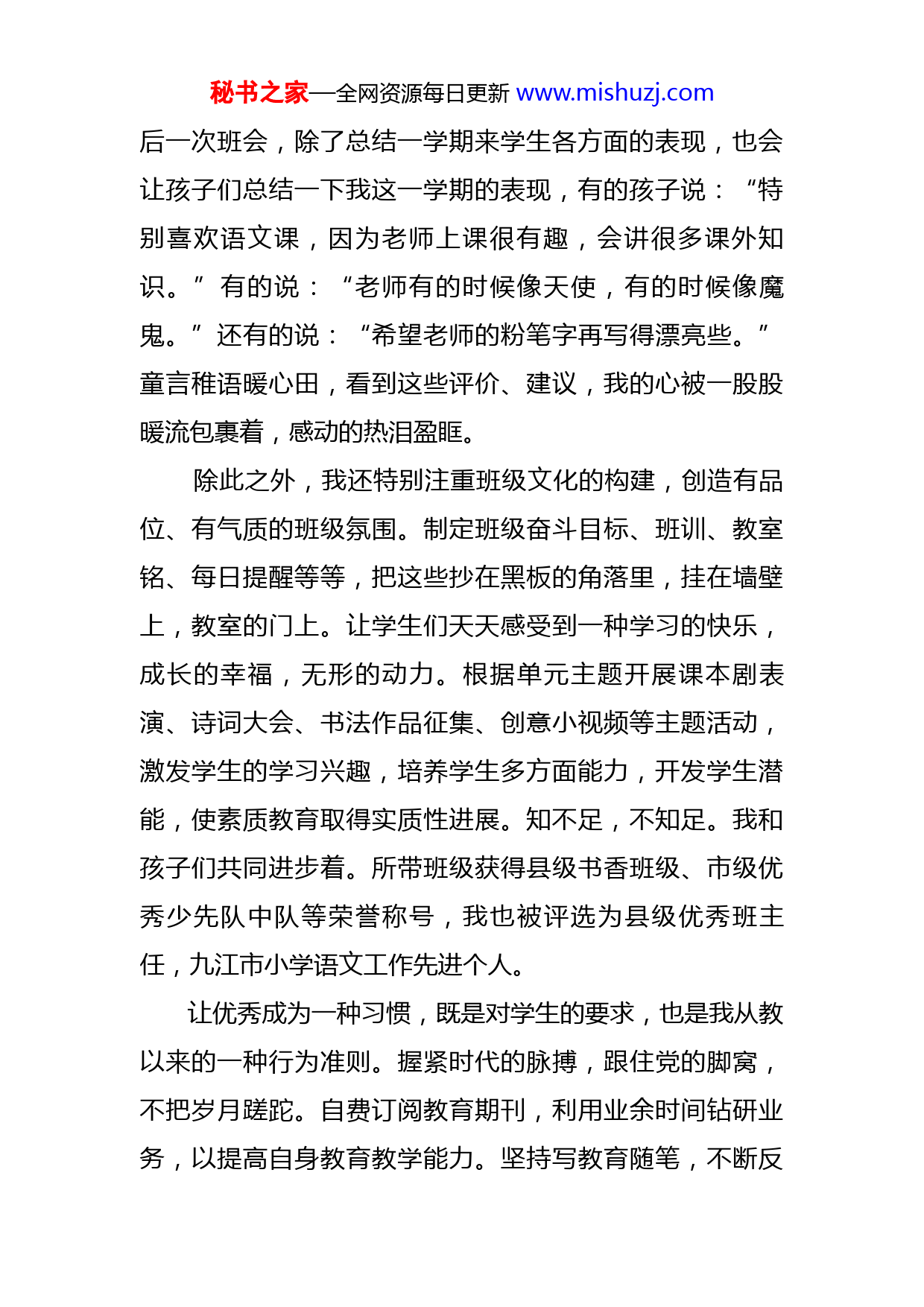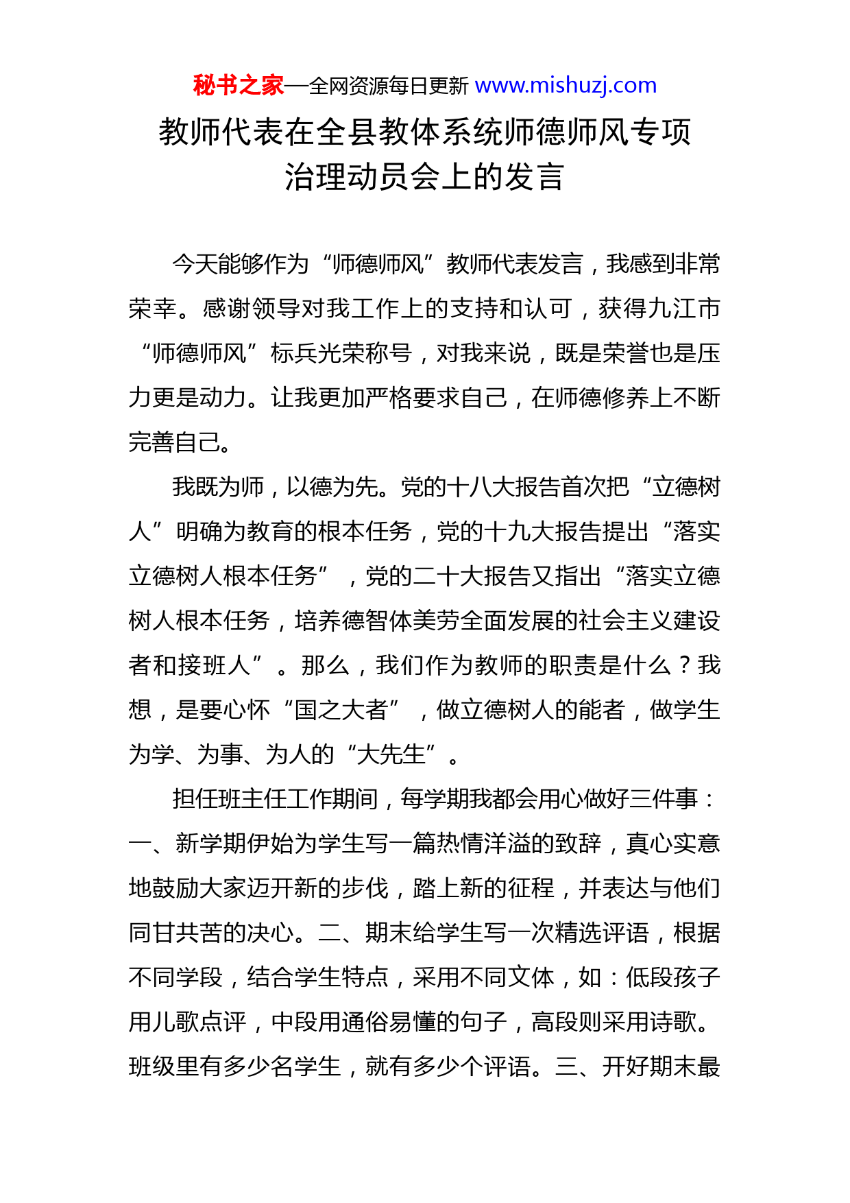 秘书之家—全网资源每日更新www.mishuzj.com教师代表在全县教体系统师德师风专项治理动员会上的发言今天能够作为“师德师风”教师代表发言,我感到非常荣幸。感谢领导对我工作上的支持和认可,获得九江市“师德师风”标兵光荣称号,对我来说,既是荣誉也是压力更是动力。让我更加严格要求自己,在师德修养上不断完善自己。我既为师,以德为先。党的十八大报告首次把“立德树人”明确为教育的根本任务,党的十九大报告提出“落实立德树人根本任务”,党的二十大报告又指出“落实立德树人根本任务,培养德智体美劳全面发展的社会主义建设者和接班人”。那么,我们作为教师的职责是什么?我想,是要心怀“国之大者”,做立德树人的能者,做学生为学、为事、为人的“大先生”。担任班主任工作期间,每学期我都会用心做好三件事:一、新学期伊始为学生写一篇热情洋溢的致辞,真心实意地鼓励大家迈开新的步伐,踏上新的征程,并表达与他们同甘共苦的决心。二、期末给学生写一次精选评语,根据不同学段,结合学生特点,采用不同文体,如:低段孩子用儿歌点评,中段用通俗易懂的句子,高段则采用诗歌。班级里有多少名学生,就有多少个评语。三、开好期末最秘书之家—全网资源每日更新www.mishuzj.com后一次班会,除了总结一学期来学生各方面的表现,也会让孩子们总结一下我这一学期的表现,有的孩子说:“特别喜欢语文课,因为老师上课很有趣,会讲很多课外知识。”有的说:“老师有的时候像天使,有的时候像魔鬼。”还有的说:“希望老师的粉笔字再写得漂亮些。”童言稚语暖心田,看到这些评价、建议,我的心被一股股暖流包裹着,感动的热泪盈眶。除此之外,我还特别注重班级文化的构建,创造有品位、有气质的班级氛围。制定班级奋斗目标、班训、教室铭、每日提醒等等,把这些抄在黑板的角落里,挂在墙壁上,教室的门上。让学生们天天感受到一种学习的快乐,成长的幸福,无形的动力。根据单元主题开展课本剧表演、诗词大会、书法作品征集、创意小视频等主题活动,激发学生的学习兴趣,培养学生多方面能力,开发学生潜能,使素质教育取得实质性进展。知不足,不知足。我和孩子们共同进步着。所带班级获得县级书香班级、市级优秀少先队中队等荣誉称号,我也被评选为县级优秀班主任,九江市小学语文工作先进个人。让优秀成为一种习惯,既是对学生的要求,也是我从教以来的一种行为准则。握紧时代的脉搏,跟住党的脚窝,不把岁月蹉跎。自费订阅教育期刊,利用业余时间钻研业务,以提高自身教育教学能力。坚持写教育随笔,不断反秘书之家—全网资源每日更新www.mishuzj.com思自己的不足。珍惜每一次听课、外出学习的机会,积极参加青年教师赛课活动。担任校报编辑,和同事创办文学社,采集童诗,参加省运会。每一次的突破,都是走向卓越。卓然独立,越而胜己。我深知,在我的周围有很多优秀的老师,他们日复一日静守教育这方净土,以爱为墨,以技为笔,素手清心,朝耕暮云,他们是我学习的榜样。在今后的工作当中,我要以党的教育方针为指路明灯,站在教育这片热土上,以人格魅力呵护学生心灵,以学术造诣开启学生智慧,把自己的温暖和情感倾注到每一个学生身上,让每一个学生都健康成长,让每一个孩子都有人生出彩的机会。