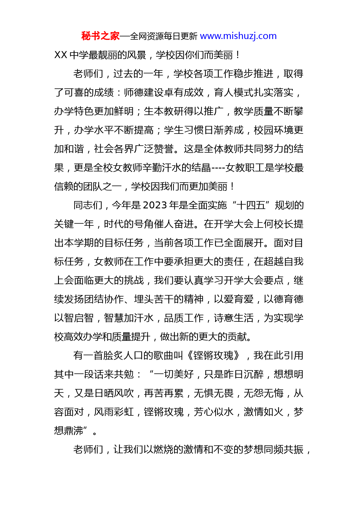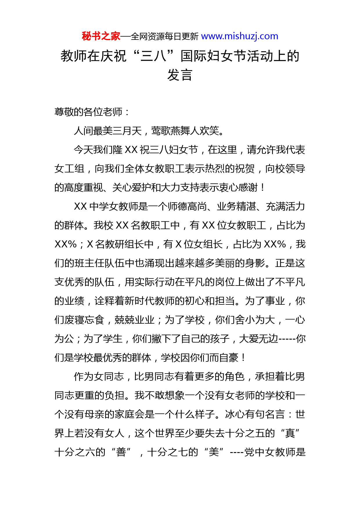 秘书之家—全网资源每日更新www.mishuzj.com教师在庆祝“三八”国际妇女节活动上的发言尊敬的各位老师:人间最美三月天,莺歌燕舞人欢笑。今天我们隆XX祝三八妇女节,在这里,请允许我代表女工组,向我们全体女教职工表示热烈的祝贺,向校领导的高度重视、关心爱护和大力支持表示衷心感谢!XX中学女教师是一个师德高尚、业务精湛、充满活力的群体。我校XX名教职工中,有XX位女教职工,占比为XX%;X名教研组长中,有X位女组长,占比为XX%,我们的班主任队伍中也涌现出越来越多美丽的身影。正是这支优秀的队伍,用实际行动在平凡的岗位上做出了不平凡的业绩,诠释着新时代教师的初心和担当。为了事业,你们废寝忘食,兢兢业业;为了学校,你们舍小为大,一心为公;为了学生,你们撇下了自己的孩子,大爱无边-----你们是学校最优秀的群体,学校因你们而自豪!作为女同志,比男同志有着更多的角色,承担着比男同志更重的负担。我不敢想象一个没有女老师的学校和一个没有母亲的家庭会是一个什么样子。冰心有句名言:世界上若没有女人,这个世界至少要失去十分之五的“真”十分之六的“善”,十分之七的“美”----党中女教师是秘书之家—全网资源每日更新www.mishuzj.comXX中学最靓丽的风景,学校因你们而美丽!老师们,过去的一年,学校各项工作稳步推进,取得了可喜的成绩:师德建设卓有成效,育人模式扎实落实,办学特色更加鲜明;生本教研得以推广,教学质量不断攀升,办学水平不断提高;学生习惯日渐养成,校园环境更加和谐,社会各界广泛赞誉。这是全体教师共同努力的结果,更是全校女教师辛勤汗水的结晶----女教职工是学校最信赖的团队之一,学校因我们而更加美丽!同志们,今年是2023年是全面实施“十四五”规划的关键一年,时代的号角催人奋进。在开学大会上何校长提出本学期的目标任务,当前各项工作已全面展开。面对目标任务,女教师在工作中要承担更大的责任,在超越自我上会面临更大的挑战,我们要认真学习开学大会要点,继续发扬团结协作、埋头苦干的精神,以爱育爱,以德育德以智启智,智慧加汗水,品质工作,诗意生活,为实现学校高效办学和质量提升,做出新的更大的贡献。有一首脍炙人口的歌曲叫《铿锵玫瑰》,我在此引用其中一段话来共勉:“一切美好,只是昨日沉醉,想想明天,又是日晒风吹,再苦再累,无惧无畏,无怨无悔,从容面对,风雨彩虹,铿锵玫瑰,芳心似水,激情如火,梦想鼎沸”。老师们,让我们以燃烧的激情和不变的梦想同频共振,秘书之家—全网资源每日更新www.mishuzj.com让学校在我们的共同努力下实现新跨越,取得新辉煌!再次祝大家节日快乐,身体健康,家庭幸福,青春永驻,XX中学各项事业再创新辉煌,再上新台阶!关爱妇女促和谐努力同心向未来