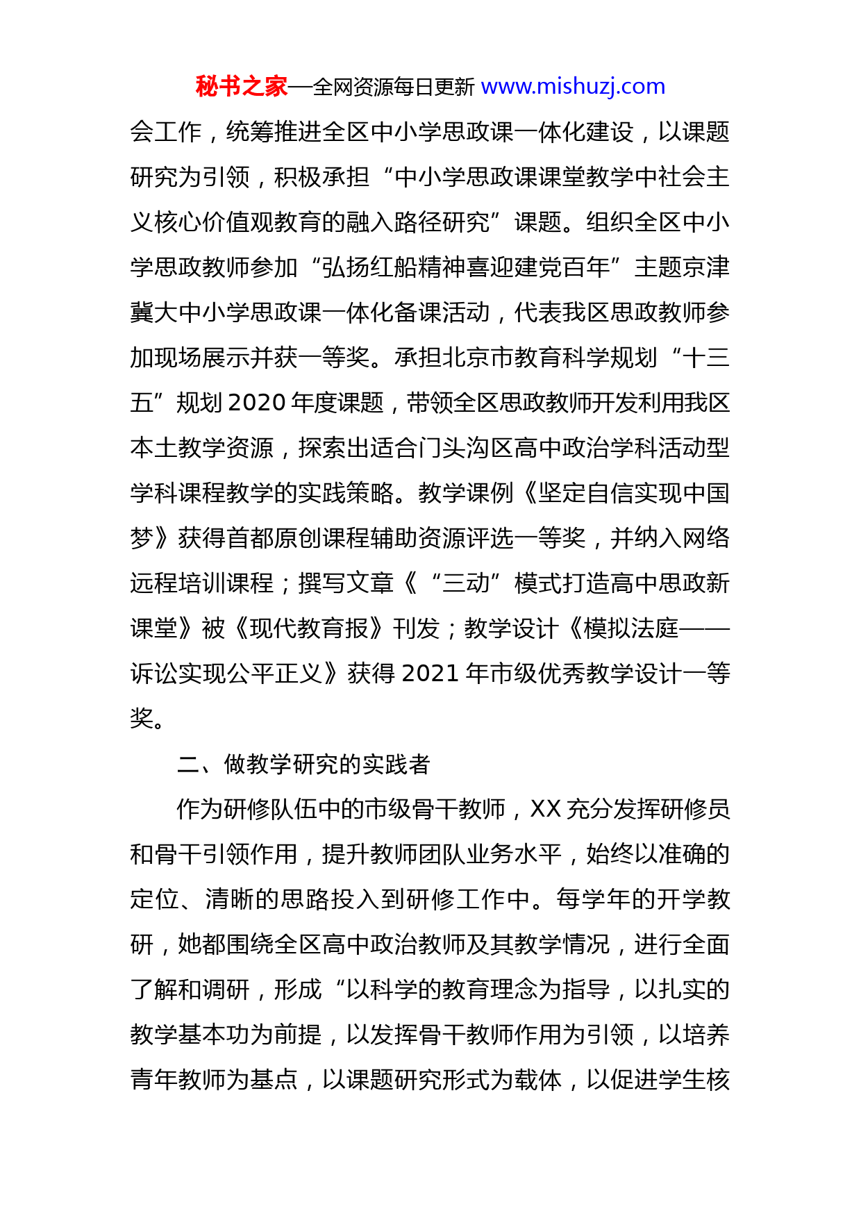 秘书之家—全网资源每日更新www.mishuzj.com教育系统师德师风典型事迹材料每一位教师都肩负着教书育人的神圣职责,他们是教育的燃灯者,是灵魂的工程师,更是学生的“筑梦人”。他们,寄情一根粉笔,坚守三尺讲台,静待一树花开,用心守望学生成长。为弘扬高尚师德,传播教育正能量,“文明门头沟”微信公众号开设“师者·最美的你”专栏,对我区教育系统师德典型事迹进行宣传推介,展现长安街旁、永定河畔绿水青山好教师不忘教育初心、牢记育人使命和砥砺前行的风采。XX,中共党员,高级教师,市级骨干教师,现任区教育研修学院高中政治学科研修员。连续三届被评为区级骨干教师,主持或参与十二项国家级、市级科研课题,先后承担市、区级公开课五十余节,开展国家级、市级、区级讲座六十余次,三十余篇教学成果(论文)获得国家级、市级、区级奖项,多篇文章被发表或出版。教学基本功扎实,获市级教学评比一等奖五次,指导教师比赛获市级一等奖三十余次。曾获评区级优秀教师、师德先进个人、工会积极分子等称号。一、做思政教育的引领者作为高中政治研修员,XX坚持以课题研究为抓手,引领提升全区思政教师素养。积极参加区中小学思政教育研究秘书之家—全网资源每日更新www.mishuzj.com会工作,统筹推进全区中小学思政课一体化建设,以课题研究为引领,积极承担“中小学思政课课堂教学中社会主义核心价值观教育的融入路径研究”课题。组织全区中小学思政教师参加“弘扬红船精神喜迎建党百年”主题京津冀大中小学思政课一体化备课活动,代表我区思政教师参加现场展示并获一等奖。承担北京市教育科学规划“十三五”规划2020年度课题,带领全区思政教师开发利用我区本土教学资源,探索出适合门头沟区高中政治学科活动型学科课程教学的实践策略。教学课例《坚定自信实现中国梦》获得首都原创课程辅助资源评选一等奖,并纳入网络远程培训课程;撰写文章《“三动”模式打造高中思政新课堂》被《现代教育报》刊发;教学设计《模拟法庭——诉讼实现公平正义》获得2021年市级优秀教学设计一等奖。二、做教学研究的实践者作为研修队伍中的市级骨干教师,XX充分发挥研修员和骨干引领作用,提升教师团队业务水平,始终以准确的定位、清晰的思路投入到研修工作中。每学年的开学教研,她都围绕全区高中政治教师及其教学情况,进行全面了解和调研,形成“以科学的教育理念为指导,以扎实的教学基本功为前提,以发挥骨干教师作用为引领,以培养青年教师为基点,以课题研究形式为载体,以促进学生核秘书之家—全网资源每日更新www.mishuzj.com心素养发展为目标”的教研模式,凸显教研的针对性、实效性和操作性。她作为全国中小学教师继续教育专家多次开展国家级培训,指导多名教师先后获得北京市课堂教学、论文、教学设计评比和京教杯比赛一等奖、二等奖。在高考攻坚工作中,XX将外请考评专家与区域教师讲座相结合,将高考阅卷启示作为高考攻坚的必修课,认真开展高三研训会,建强高考攻坚团队。同时,认真分析高考数据,及时发现问题,研究解决问题的策略和方法,统筹全员分解问题、逐个击破。她撰写的考试评价研究《2015年北京文综卷政治试题一大亮点——开放性》在陕西师范大学主办的《中学政治教学参考》杂志刊发;《2016年北京高考试题分析》在华师教育研究院网发表。教育教学战线上的追梦人XX正以饱满的热情和对教育事业的无限热爱,坚守教育前沿,践行教育初心,在逐梦路上奋勇前行。