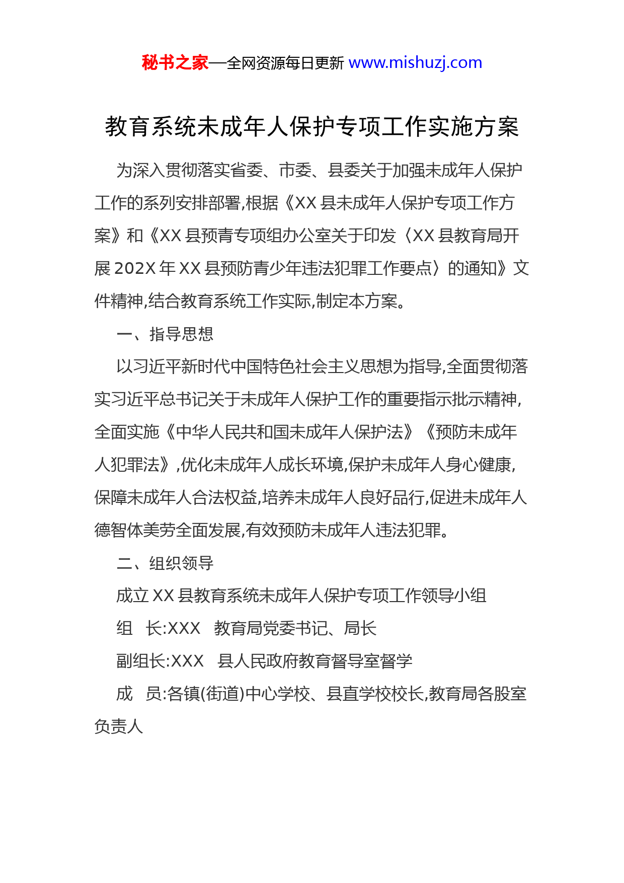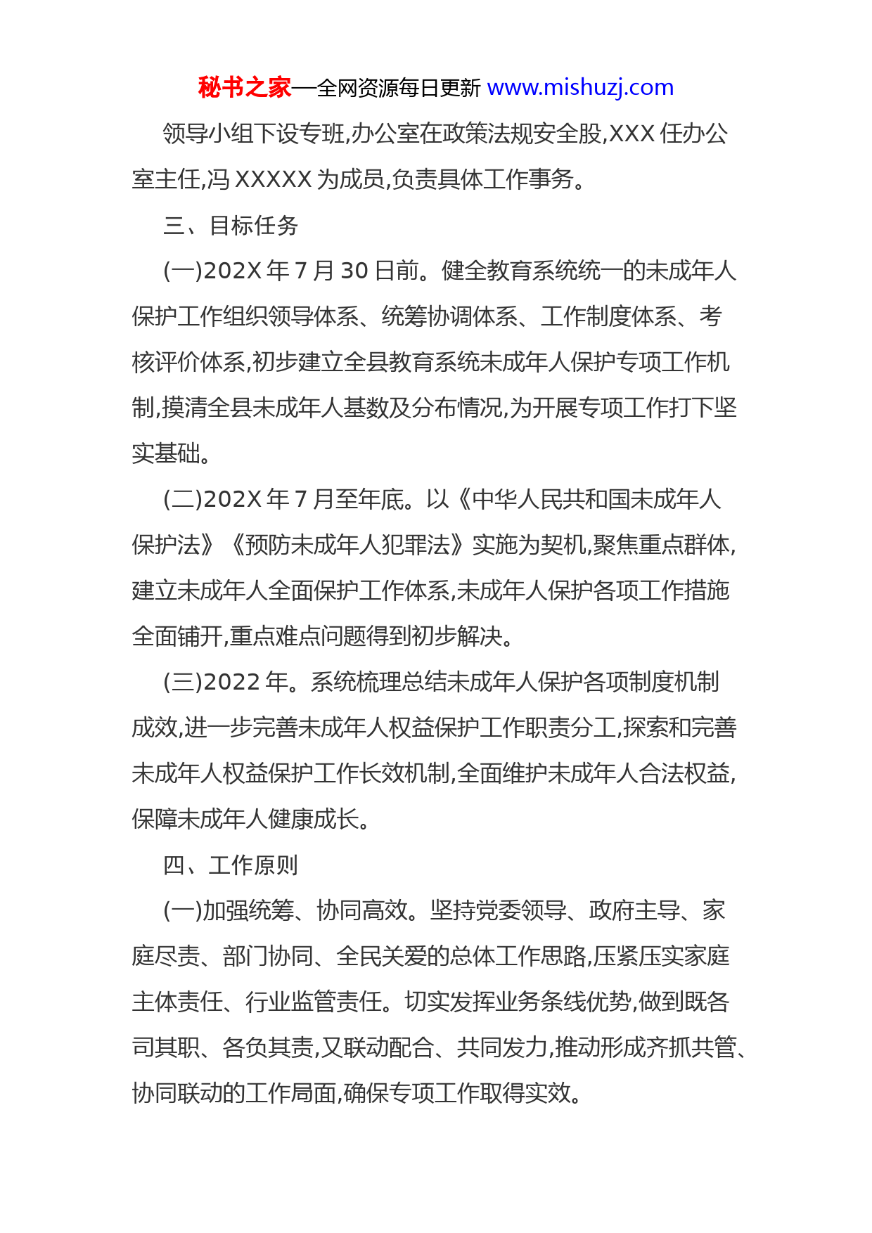 秘书之家—全网资源每日更新www.mishuzj.com教育系统未成年人保护专项工作实施方案为深入贯彻落实省委、市委、县委关于加强未成年人保护工作的系列安排部署,根据《XX县未成年人保护专项工作方案》和《XX县预青专项组办公室关于印发〈XX县教育局开展202X年XX县预防青少年违法犯罪工作要点〉的通知》文件精神,结合教育系统工作实际,制定本方案。一、指导思想以习近平新时代中国特色社会主义思想为指导,全面贯彻落实习近平总书记关于未成年人保护工作的重要指示批示精神,全面实施《中华人民共和国未成年人保护法》《预防未成年人犯罪法》,优化未成年人成长环境,保护未成年人身心健康,保障未成年人合法权益,培养未成年人良好品行,促进未成年人德智体美劳全面发展,有效预防未成年人违法犯罪。二、组织领导成立XX县教育系统未成年人保护专项工作领导小组组长:XXX教育局党委书记、局长副组长:XXX县人民政府教育督导室督学成员:各镇(街道)中心学校、县直学校校长,教育局各股室负责人秘书之家—全网资源每日更新www.mishuzj.com领导小组下设专班,办公室在政策法规安全股,XXX任办公室主任,冯XXXXX为成员,负责具体工作事务。三、目标任务(一)202X年7月30日前。健全教育系统统一的未成年人保护工作组织领导体系、统筹协调体系、工作制度体系、考核评价体系,初步建立全县教育系统未成年人保护专项工作机制,摸清全县未成年人基数及分布情况,为开展专项工作打下坚实基础。(二)202X年7月至年底。以《中华人民共和国未成年人保护法》《预防未成年人犯罪法》实施为契机,聚焦重点群体,建立未成年人全面保护工作体系,未成年人保护各项工作措施全面铺开,重点难点问题得到初步解决。(三)2022年。系统梳理总结未成年人保护各项制度机制成效,进一步完善未成年人权益保护工作职责分工,探索和完善未成年人权益保护工作长效机制,全面维护未成年人合法权益,保障未成年人健康成长。四、工作原则(一)加强统筹、协同高效。坚持党委领导、政府主导、家庭尽责、部门协同、全民关爱的总体工作思路,压紧压实家庭主体责任、行业监管责任。切实发挥业务条线优势,做到既各司其职、各负其责,又联动配合、共同发力,推动形成齐抓共管、协同联动的工作局面,确保专项工作取得实效。秘书之家—全网资源每日更新www.mishuzj.com(二)依法依规、尊重规律。尊重未成年人成长规律特点,严格依照法律规定开展工作。在法律框架内,探索形式多样、符合未成年人身心特点和成长规律的方式方法开展工作。(三)聚焦重点、分类施策。严格按照依法保护未成年人合法权益的工作思路,因地制宜、因事而定、分门别类、分类施策,不搞“一刀切”“齐步走”,积极稳妥推进未成年人保护专项工作。(四)宣传引导、全员参与。积极宣传广泛动员,使未成年人保护工作家喻户晓,切实提高学校和社会的知晓率,切实提高全社会对未成年人的保护意识,形成浓厚的社会氛围。五、工作内容(一)“1+3”组织领导成立一个工作专班:建立教育系统未成年人专项工作专班。建立三项制度:一是制定未成年人保护工作责任清单制度,二是建立未成年人保护工作救助帮扶制度;三是建立未成年人保护工作督导考核制度。(二)“3+1”监测预警1.联动摸排工作机制。摸清在校的留守儿童、困境儿童、事实无人抚养儿童、孤残儿童、疑似辍学生、服刑在戒人员子女、有严重不良行为未成年人等特殊未成年人底数和生存现状,分类建立动态管理台账,建立完善个人档案。上下互动、同级共享,实现未成年人信息收集、研判、调度、运用一体化,为未成年人权益保护工作提供数据支撑,切实增强未成年人保秘书之家—全网资源每日更新www.mishuzj.com护工作的针对性和实效性。(牵头股室:业务股、学前教育股、政策法规安全股;责任单位:各中心学校、县直学校)2.动态监测工作机制。不折不扣执行“强制报告制度”,建立多渠道发现报告机制,发现未成年人敏感信息第一时间报告、第一时间处理。在工作、生活中发现未成年人遭受或者疑似遭受不法侵害、面临无人监护照护以及其他危险情形的,应当立即向公安、民政、司法等有关部门报告。(牵头股室:政策法规安全股;责任单位:各中心学校、县直学校)3.信息预警工作机制。在学校建立监测哨点,在每个哨点设置未成年人健康监测管理员并作为第一报告人,提高早期监测时效性、敏感性、精准性。加强部门沟通协作,建立未成年人保护信息实时通报制度,及时通报未成年人监护失职案件,共享未成年人相关信息,协同做好生活、医疗、教育等救助和司法援助。(牵头股室:青少年活动中心、政策法规安全股;责任单位:各中心学校、县直学校)4.分级分类保护制度。根据民政部部门未成年人蓝色、黄色、橙色、红色四个等级分级信息开展“平安关爱”行动。对蓝色等级未成年人平时进行随访、关注;对黄色等级未成年人每月进行走访,了解其生活、健康状况;对橙色等级未成年人安排人员“一对一”结对帮扶,按周开展走访;对红色等级未成年人立即实施必要的心理干预、生活救助和按《遵义市对有严重不良行为的未成年人送读专门学校接受专门教育工作暂秘书之家—全网资源每日更新www.mishuzj.com行办法(试行)》进行转学安置等救助保护措