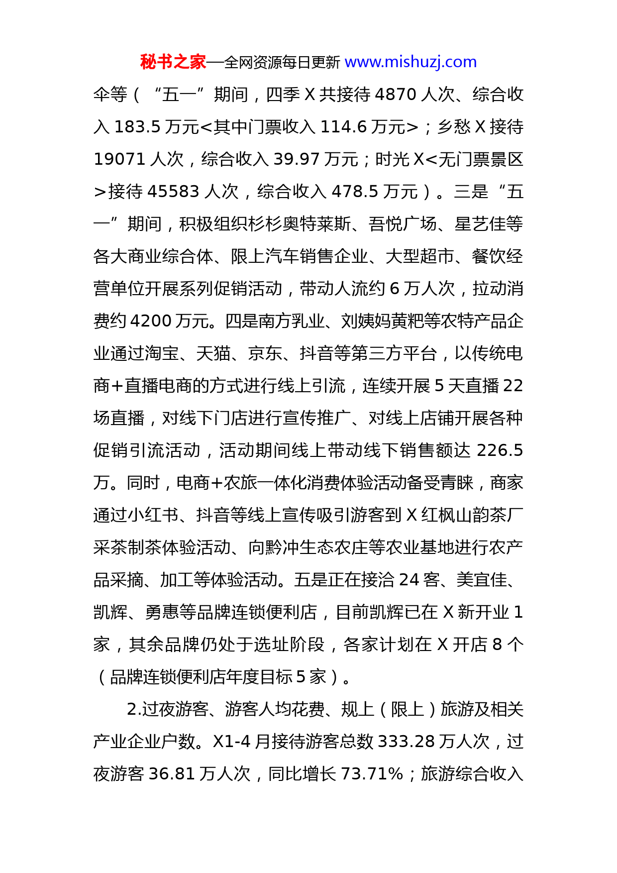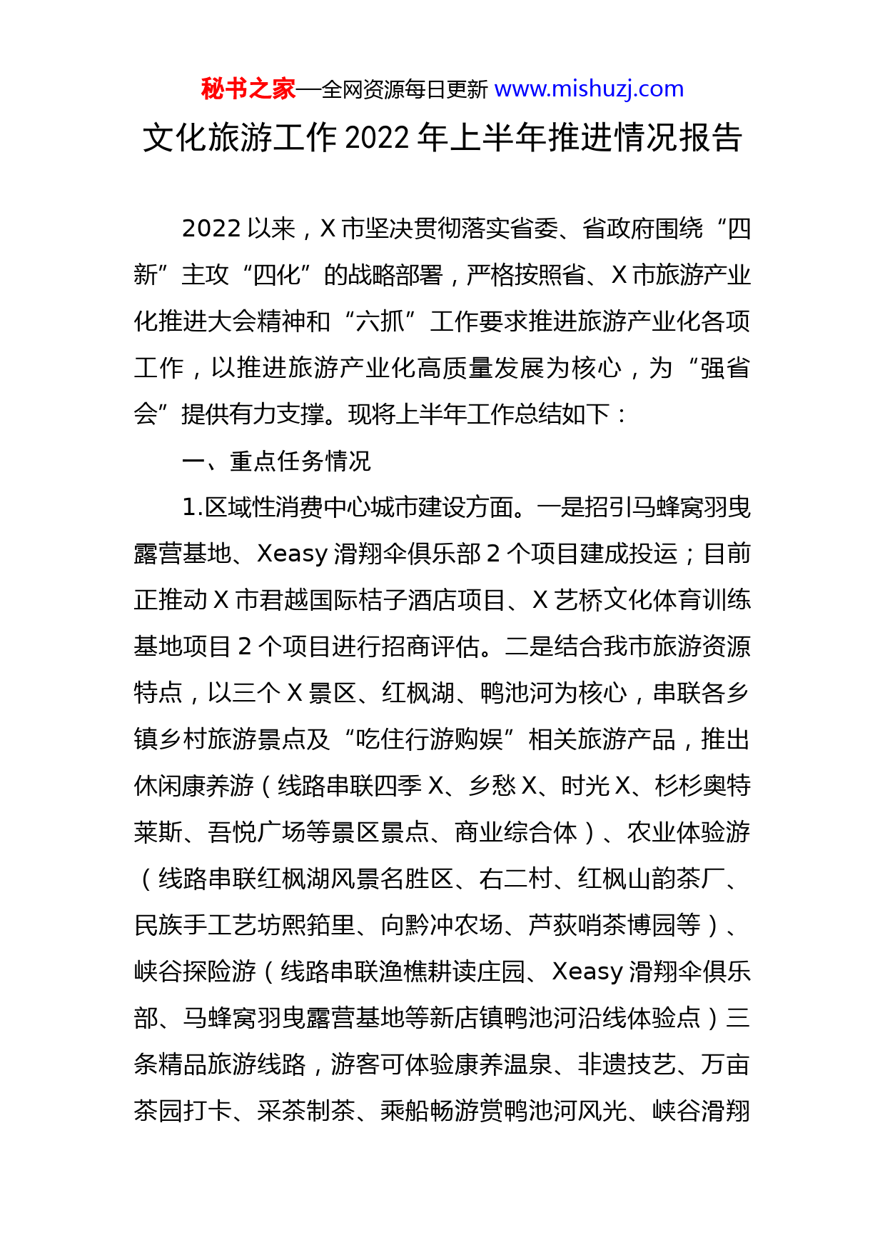 秘书之家—全网资源每日更新www.mishuzj.com文化旅游工作2022年上半年推进情况报告2022以来,X市坚决贯彻落实省委、省政府围绕“四新”主攻“四化”的战略部署,严格按照省、X市旅游产业化推进大会精神和“六抓”工作要求推进旅游产业化各项工作,以推进旅游产业化高质量发展为核心,为“强省会”提供有力支撑。现将上半年工作总结如下:一、重点任务情况1.区域性消费中心城市建设方面。一是招引马蜂窝羽曳露营基地、Xeasy滑翔伞俱乐部2个项目建成投运;目前正推动X市君越国际桔子酒店项目、X艺桥文化体育训练基地项目2个项目进行招商评估。二是结合我市旅游资源特点,以三个X景区、红枫湖、鸭池河为核心,串联各乡镇乡村旅游景点及“吃住行游购娱”相关旅游产品,推出休闲康养游(线路串联四季X、乡愁X、时光X、杉杉奥特莱斯、吾悦广场等景区景点、商业综合体)、农业体验游(线路串联红枫湖风景名胜区、右二村、红枫山韵茶厂、民族手工艺坊熙筘里、向黔冲农场、芦荻哨茶博园等)、峡谷探险游(线路串联渔樵耕读庄园、Xeasy滑翔伞俱乐部、马蜂窝羽曳露营基地等新店镇鸭池河沿线体验点)三条精品旅游线路,游客可体验康养温泉、非遗技艺、万亩茶园打卡、采茶制茶、乘船畅游赏鸭池河风光、峡谷滑翔秘书之家—全网资源每日更新www.mishuzj.com伞等(“五一”期间,四季X共接待4870人次、综合收入183.5万元<其中门票收入114.6万元>;乡愁X接待19071人次,综合收入39.97万元;时光X<无门票景区>接待45583人次,综合收入478.5万元)。三是“五一”期间,积极组织杉杉奥特莱斯、吾悦广场、星艺佳等各大商业综合体、限上汽车销售企业、大型超市、餐饮经营单位开展系列促销活动,带动人流约6万人次,拉动消费约4200万元。四是南方乳业、刘姨妈黄粑等农特产品企业通过淘宝、天猫、京东、抖音等第三方平台,以传统电商+直播电商的方式进行线上引流,连续开展5天直播22场直播,对线下门店进行宣传推广、对线上店铺开展各种促销引流活动,活动期间线上带动线下销售额达226.5万。同时,电商+农旅一体化消费体验活动备受青睐,商家通过小红书、抖音等线上宣传吸引游客到X红枫山韵茶厂采茶制茶体验活动、向黔冲生态农庄等农业基地进行农产品采摘、加工等体验活动。五是正在接洽24客、美宜佳、凯辉、勇惠等品牌连锁便利店,目前凯辉已在X新开业1家,其余品牌仍处于选址阶段,各家计划在X开店8个(品牌连锁便利店年度目标5家)。2.过夜游客、游客人均花费、规上(限上)旅游及相关产业企业户数。X1-4月接待游客总数333.28万人次,过夜游客36.81万人次,同比增长73.71%;旅游综合收入秘书之家—全网资源每日更新www.mishuzj.com31.66亿元,全市游客人均花费950元。全市规上(限上)旅游及相关产业企业累计64家(旅游出行2家、旅游住宿8家、旅游餐饮26家、旅游游览1家、旅游购物22家、旅游综合服务1家、旅游辅助服务4家),已完成全年目标(全年任务数累计59家;占X市比重6.14%)。其中餐饮、住宿、文化体育娱乐共在线运营28户,2月份新增1户(融合酒店)住宿企业上限入统。二、公共文化工作开展情况1.完成政务服务攻坚任务。我局政务服务事项83项,已实现全程网办69项,网办率达83%,远远超过政务指标网办率任务数75%。上半年共依法依规办出3家行政许可证照,同步在信用中国网站公示。制定2022年文化市场双随机监督计划,跟踪了解文化企业的经营情况。再次梳理并更新全市文化旅游体育行业监管服务对象名录.对接工会、妇联做好我局换届选举工会主席和妇联主任的筹备工作。完成规范性文件清理及公平竞争相关工作2.持续推进公共文化服务体系建设,一是打造“15分钟文化生活圈,2022年我市拟完成35个项目建设,投入175万元,截止5月19日,我市已拨付资金175万元用于“圈内”文化站(中心)提升改造工作,已启动项目30个。二是完成村级文化中心提升改造工作。2022年我市拟完成“一圈”外文化中心提升改造项目43个,已通过X市秘书之家—全网资源每日更新www.mishuzj.com文旅局第三方公司测评项目6个。并组织开展元旦、春节、清明、五一、端午期间等相关活动。三、主要工作措施1.理清产业思路。以“爽爽X·湖城X”为定位,结合全市国土空间规划,编制《X市“十四五”文化旅游发展专项规划》,对旅游产业发展定位、发展路径、发展目标等内容进行明确,全力以赴打造以山水园林为特色的国家全域旅游示范区,按照“一核一带三区”旅游产业发展布局(一核:以中心城区为核心,以时光X、四季X、乡愁X、恐龙小镇为龙头,汇聚吾悦广场、杉杉奥特莱斯、中环国际小吃街等核心项目,打造夜间经济,聚焦餐饮、购物、游乐、研学、住宿等产业发展,形成游客集散地和商贸文旅消费聚集区;一带:X贵安环红枫湖旅游带;三区:卫城古镇黔菜文化体验区、暗流羊皮洞乡村休闲旅游区、新店鸭池河大桥山地体旅融合度假区),围绕旅游产业化“四大行动”,紧扣“六抓”工作要求,做足“旅游+”“+旅游”融合发展文章,做强做长旅游产业链,推动一二三产业融合发展。同时,制定2022年“强旅游”工作实施方案,具体细化2022年任务,成立工作领导小组,加强工作调度;以推进旅游产业化高质量发展为核心,从思想上深化认识,从行动上注重实效,助推全市“强省会”工作顺利开展。秘书之家—全网资源