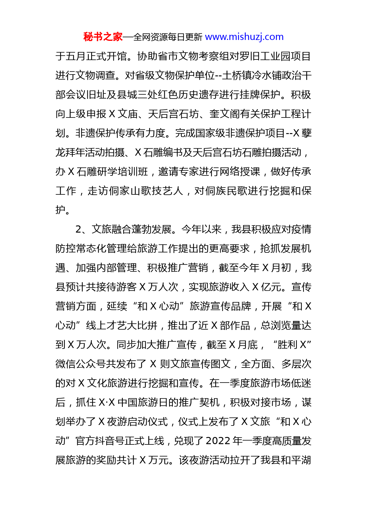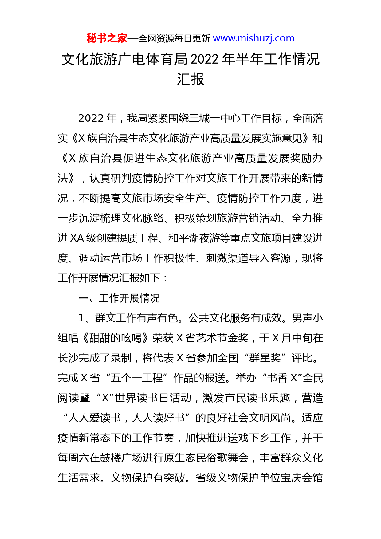 秘书之家—全网资源每日更新www.mishuzj.com文化旅游广电体育局2022年半年工作情况汇报2022年,我局紧紧围绕三城一中心工作目标,全面落实《X族自治县生态文化旅游产业高质量发展实施意见》和《X族自治县促进生态文化旅游产业高质量发展奖励办法》,认真研判疫情防控工作对文旅工作开展带来的新情况,不断提高文旅市场安全生产、疫情防控工作力度,进一步沉淀梳理文化脉络、积极策划旅游营销活动、全力推进XA级创建提质工程、和平湖夜游等重点文旅项目建设进度、调动运营市场工作积极性、刺激渠道导入客源,现将工作开展情况汇报如下:一、工作开展情况1、群文工作有声有色。公共文化服务有成效。男声小组唱《甜甜的吆喝》荣获X省艺术节金奖,于X月中旬在长沙完成了录制,将代表X省参加全国“群星奖”评比。完成X省“五个一工程”作品的报送。举办“书香X”全民阅读暨“X”世界读书日活动,激发市民读书乐趣,营造“人人爱读书,人人读好书”的良好社会文明风尚。适应疫情新常态下的工作节奏,加快推进送戏下乡工作,并于每周六在鼓楼广场进行原生态民俗歌舞会,丰富群众文化生活需求。文物保护有突破。省级文物保护单位宝庆会馆秘书之家—全网资源每日更新www.mishuzj.com于五月正式开馆。协助省市文物考察组对罗旧工业园项目进行文物调查。对省级文物保护单位--土桥镇冷水铺政治干部会议旧址及县城三处红色历史遗存进行挂牌保护。积极向上级申报X文庙、天后宫石坊、奎文阁有关保护工程计划。非遗保护传承有力度。完成国家级非遗保护项目--X孽龙拜年活动拍摄、X石雕编书及天后宫石坊石雕拍摄活动,办X石雕研学培训班,邀请专家进行网络授课,做好传承工作,走访侗家山歌技艺人,对侗族民歌进行挖掘和保护。2、文旅融合蓬勃发展。今年以来,我县积极应对疫情防控常态化管理给旅游工作提出的更高要求,抢抓发展机遇、加强内部管理、积极推广营销,截至今年X月初,我县预计共接待游客X万人次,实现旅游收入X亿元。宣传营销方面,延续“和X心动”旅游宣传品牌,开展“和X心动”线上才艺大比拼,推出了近X部作品,总浏览量达到X万人次。同步加大推广宣传,截至X月底,“胜利X”微信公众号共发布了X则文旅宣传图文,全方面、多层次的对X文化旅游进行挖掘和宣传。在一季度旅游市场低迷后,抓住X·X中国旅游日的推广契机,积极对接市场,谋划举办了X夜游启动仪式,仪式上发布了X文旅“和X心动”官方抖音号正式上线,兑现了2022年一季度高质量发展旅游的奖励共计X万元。该夜游活动拉开了我县和平湖秘书之家—全网资源每日更新www.mishuzj.com夜游项目的序幕,并定期在每周六晚在鼓楼广场开展原生态民俗歌舞表演,让来X的游客深切感受X夜游的快乐,截至活动举办以来,游客反响热烈,旅行社接待游客近X人次。市场营销方面。带领部分文旅企业参加了在洪江古商城景区举办的怀化市2022年中国旅游日活动,将X文旅产品:X鸭、甜茶、白蜡、酸萝卜、唯楚红酒等进行一次全面生动的展销,助推文旅产业融合发展。与X翔文旅公司共同商议谋划,及时向市场推出了“春和景明、和X心动”一日游、“踏春寻花、嗨游X”二日游两款产品及“感悟和平、强国有我”X一日研学和“感悟和平文化、传承长征精神”党建红培课程,结合乡村旅游相关景点,制定亲子游、团队游等四条旅游线路。重点项目情况。2022年,与发改局一起共梳理了X个重点项目,其中X个项目均已完成入统工作。X月完成申报省级乡村旅游重点村X镇畅风坳村,市级旅游重点村的有碧涌哨田村和公坪镇公坪社区。唯楚酒庄创XA级景区已通过市里预评审。在重点项目建设工作开展方面,创XA工作正在完善创建的配套设施建设,受降园广场项目正在编制纳入我县《第二批土地征收成片开发方案》向省里进行申报批复;和平湖夜游项目的初步设计评审报告已出,并完成招投标,预计X月底启动码头建设工作,争取年底开游;长征国家文化公园项目已重新启动,邀请国家级专业人士邓博士一行对我县旅游特秘书之家—全网资源每日更新www.mishuzj.com别是红色旅游工作进行了调研和发展指导,红军长征在X陈列馆已于X月X日开馆;冷水铺干部会议旧址已成为省级文保单位、上坪烈士陵园正在积极向上申报专门对口项目资金。招商引资情况。积极招商引资,洽谈引进X爱旅人旅游管理有限公司以文旅市场稀缺的体验型军旅题材产品为主导的,体验式、沉浸式的军旅文化园,该公司总投资X亿元,现招商工作已进入准备签订框架合作协议阶段,筏钓、农旅融合等项目正在积极洽谈中。X月底,参加投促中心安排的招商引资活动,赴桂林市考察文旅项目和对接旅游招商工作,现正积极与该市旅游业的第一家上市企业桂林旅游股份有限公司对接下一步合作事宜。3、广播电视安播有力。督促融媒体和网络狠抓安全生产,做好隐患排查,尤其严格机房等要害部位的检查,确保安全播出。垫资给融媒体X万元付清了长虹公司货款,避免了中央所清理整顿的“两拖欠”现象的发生。4、体育工作稳步推进。为做好全市残运会今年将在我县召开的服务工作,我局会同残联一起开展了怀化市第二届残疾人运动会的前期调研准备。联合财政局建立健全体育彩票销售激励机制和运作模式,争取把X的体彩销售量更上一层楼。积极跟