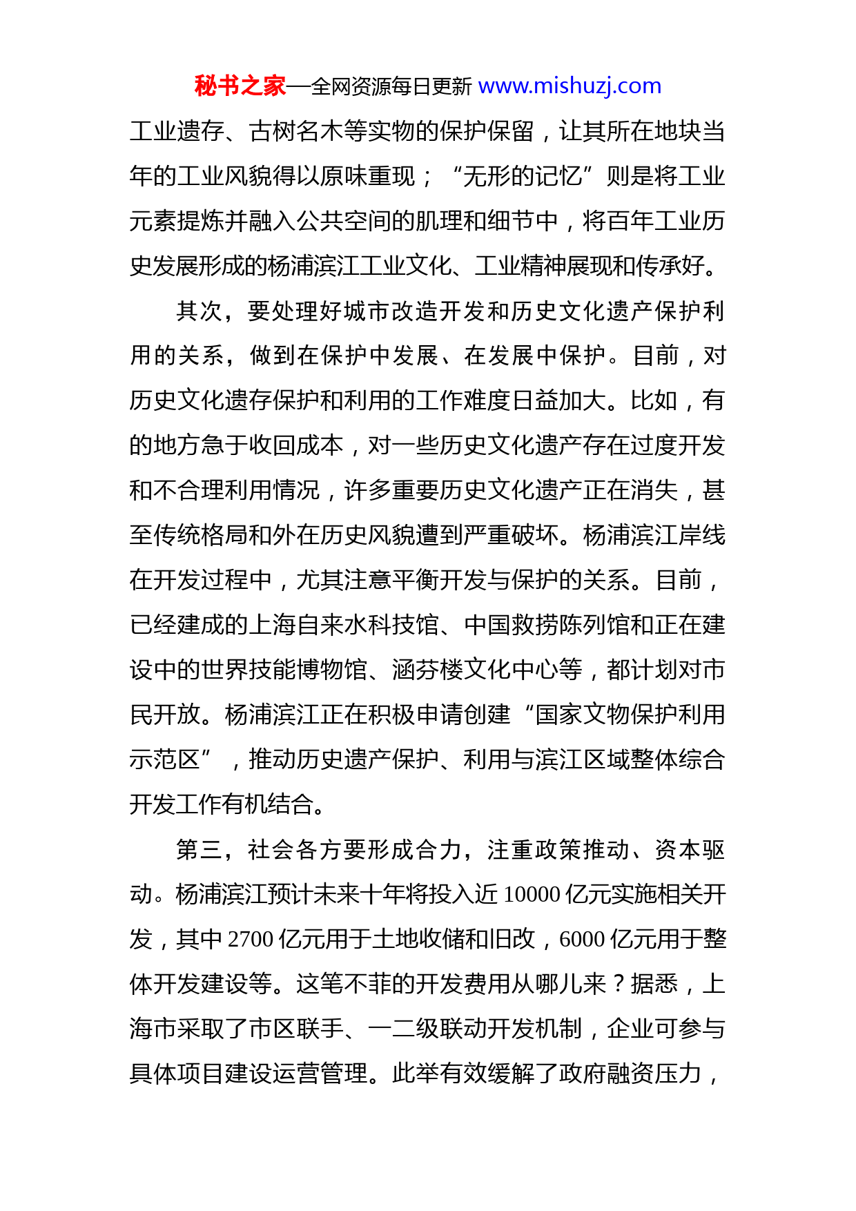 秘书之家—全网资源每日更新www.mishuzj.com文化让小康生活更有滋味陆敏杨浦滨江是上海中心城区里最长的滨江岸线,杨浦滨江所在的杨树浦工业区,曾是上海近代最大的能源供给和工业基地,10多公里的岸线上密布几十家工厂。多年来,市民“临江不见江”。日前,笔者在参加“走向我们的小康生活”主题采访时看到,曾经的滨江工业长廊已转型为以公园、绿地、开放空间为主的生活岸线,不少市民在沿江步行道上慢跑锻炼,驻足拍照。注重文明传承、文化延续是城市发展建设中的重要课题,让城市留下记忆,满足人民群众日益增长的精神文化需求,也是实现全面小康的题中应有之义。如何保护城市中的历史文化遗产,留住城市记忆?首先,要有一个科学的规划设计。在杨浦滨江南段岸线上,规划保护保留的历史建筑总计24处66幢,总建筑面积达26.2万平方米。此外,这里还有一大批极具特色的百年工业遗存。如何把这些重要的历史遗存保存好、利用好成为规划设计的难点。上海市在实现杨浦滨江这个最大规模的工业遗存转化时,采取了“有形的记忆”和“无形的记忆”两种方式。“有形的记忆”主要是通过对历史建筑秘书之家—全网资源每日更新www.mishuzj.com工业遗存、古树名木等实物的保护保留,让其所在地块当年的工业风貌得以原味重现;“无形的记忆”则是将工业元素提炼并融入公共空间的肌理和细节中,将百年工业历史发展形成的杨浦滨江工业文化、工业精神展现和传承好。其次,要处理好城市改造开发和历史文化遗产保护利用的关系,做到在保护中发展、在发展中保护。目前,对历史文化遗存保护和利用的工作难度日益加大。比如,有的地方急于收回成本,对一些历史文化遗产存在过度开发和不合理利用情况,许多重要历史文化遗产正在消失,甚至传统格局和外在历史风貌遭到严重破坏。杨浦滨江岸线在开发过程中,尤其注意平衡开发与保护的关系。目前,已经建成的上海自来水科技馆、中国救捞陈列馆和正在建设中的世界技能博物馆、涵芬楼文化中心等,都计划对市民开放。杨浦滨江正在积极申请创建“国家文物保护利用示范区”,推动历史遗产保护、利用与滨江区域整体综合开发工作有机结合。第三,社会各方要形成合力,注重政策推动、资本驱动。杨浦滨江预计未来十年将投入近10000亿元实施相关开发,其中2700亿元用于土地收储和旧改,6000亿元用于整体开发建设等。这笔不菲的开发费用从哪儿来?据悉,上海市采取了市区联手、一二级联动开发机制,企业可参与具体项目建设运营管理。此举有效缓解了政府融资压力,秘书之家—全网资源每日更新www.mishuzj.com拓宽了融资渠道,吸引了更多社会资本和机构参与,从而加快旧改进程,实现规模开发。杨浦滨江的探索值得借鉴。在城市文化遗产保护过程中,各地要解决好保护和开发的资金难题,吸引社会资金拓宽融资渠道,打造与社会资本共建共赢模式,并探索配套的保险保障制度,确保保护与开发真正造福人民。