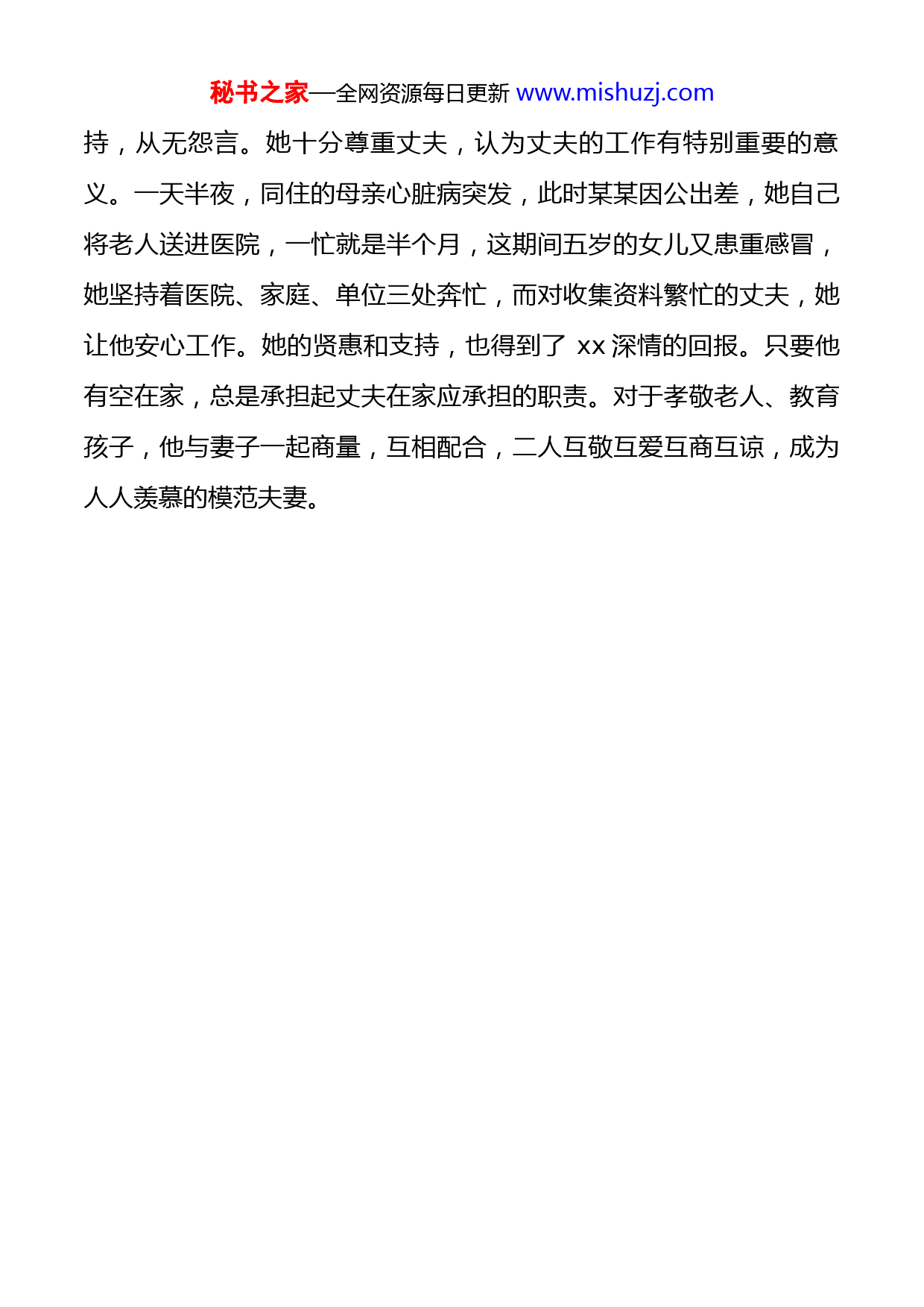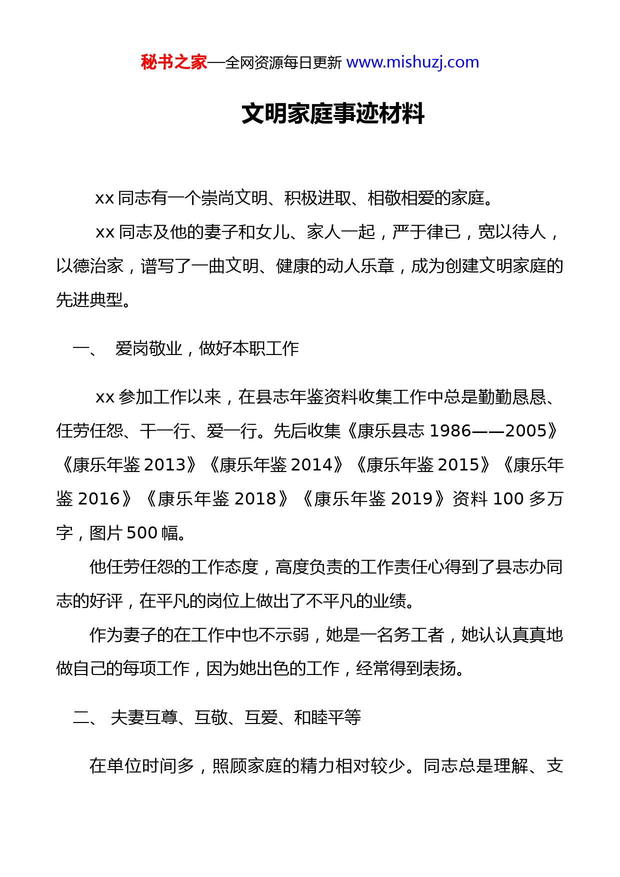 秘书之家—全网资源每日更新www.mishuzj.com文明家庭事迹材料xx同志有一个崇尚文明、积极进取、相敬相爱的家庭。xx同志及他的妻子和女儿、家人一起,严于律已,宽以待人,以德治家,谱写了一曲文明、健康的动人乐章,成为创建文明家庭的先进典型。一、爱岗敬业,做好本职工作xx参加工作以来,在县志年鉴资料收集工作中总是勤勤恳恳、任劳任怨、干一行、爱一行。先后收集《康乐县志1986——2005》《康乐年鉴2013》《康乐年鉴2014》《康乐年鉴2015》《康乐年鉴2016》《康乐年鉴2018》《康乐年鉴2019》资料100多万字,图片500幅。他任劳任怨的工作态度,高度负责的工作责任心得到了县志办同志的好评,在平凡的岗位上做出了不平凡的业绩。作为妻子的在工作中也不示弱,她是一名务工者,她认认真真地做自己的每项工作,因为她出色的工作,经常得到表扬。二、夫妻互尊、互敬、互爱、和睦平等在单位时间多,照顾家庭的精力相对较少。同志总是理解、支秘书之家—全网资源每日更新www.mishuzj.com持,从无怨言。她十分尊重丈夫,认为丈夫的工作有特别重要的意义。一天半夜,同住的母亲心脏病突发,此时某某因公出差,她自己将老人送进医院,一忙就是半个月,这期间五岁的女儿又患重感冒,她坚持着医院、家庭、单位三处奔忙,而对收集资料繁忙的丈夫,她让他安心工作。她的贤惠和支持,也得到了xx深情的回报。只要他有空在家,总是承担起丈夫在家应承担的职责。对于孝敬老人、教育孩子,他与妻子一起商量,互相配合,二人互敬互爱互商互谅,成为人人羡慕的模范夫妻。秘书之家—全网资源每日更新www.mishuzj.com