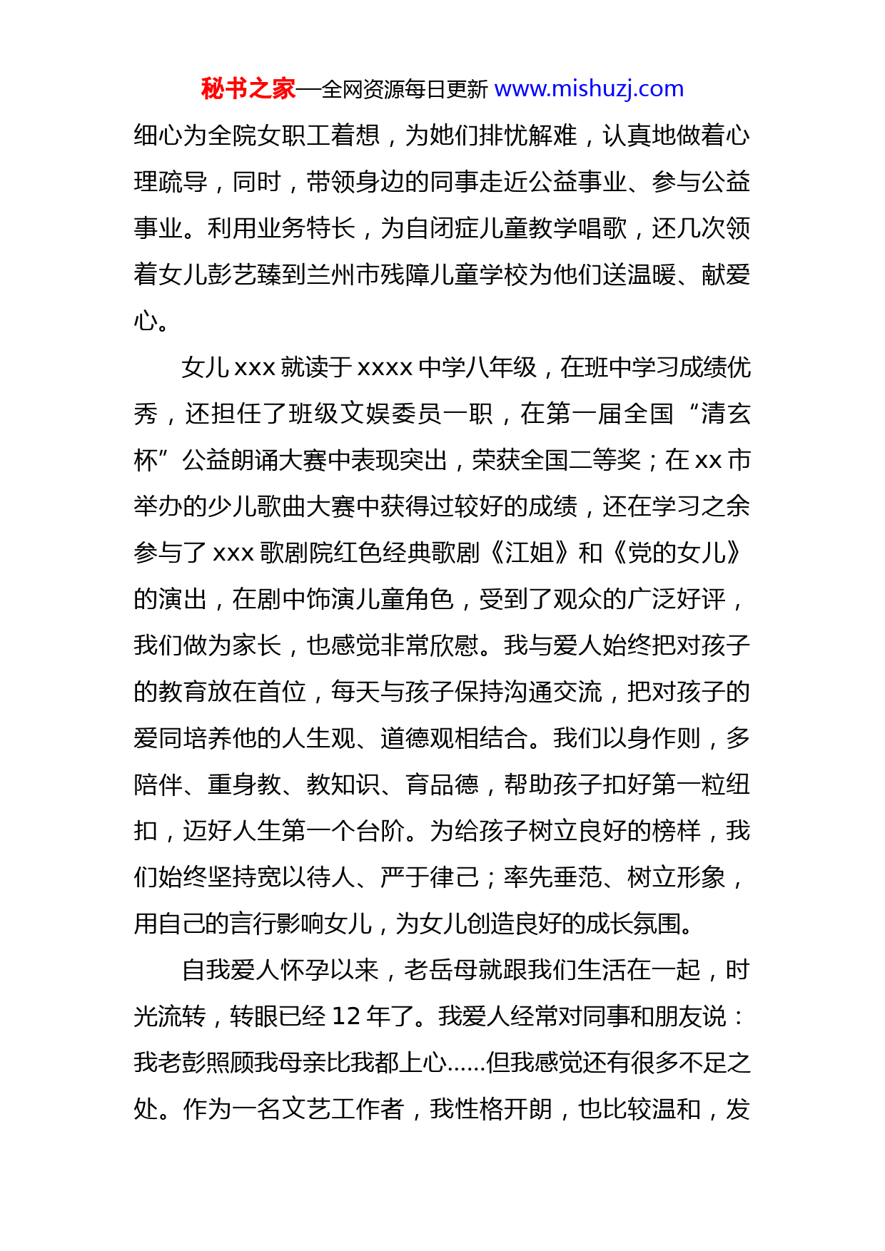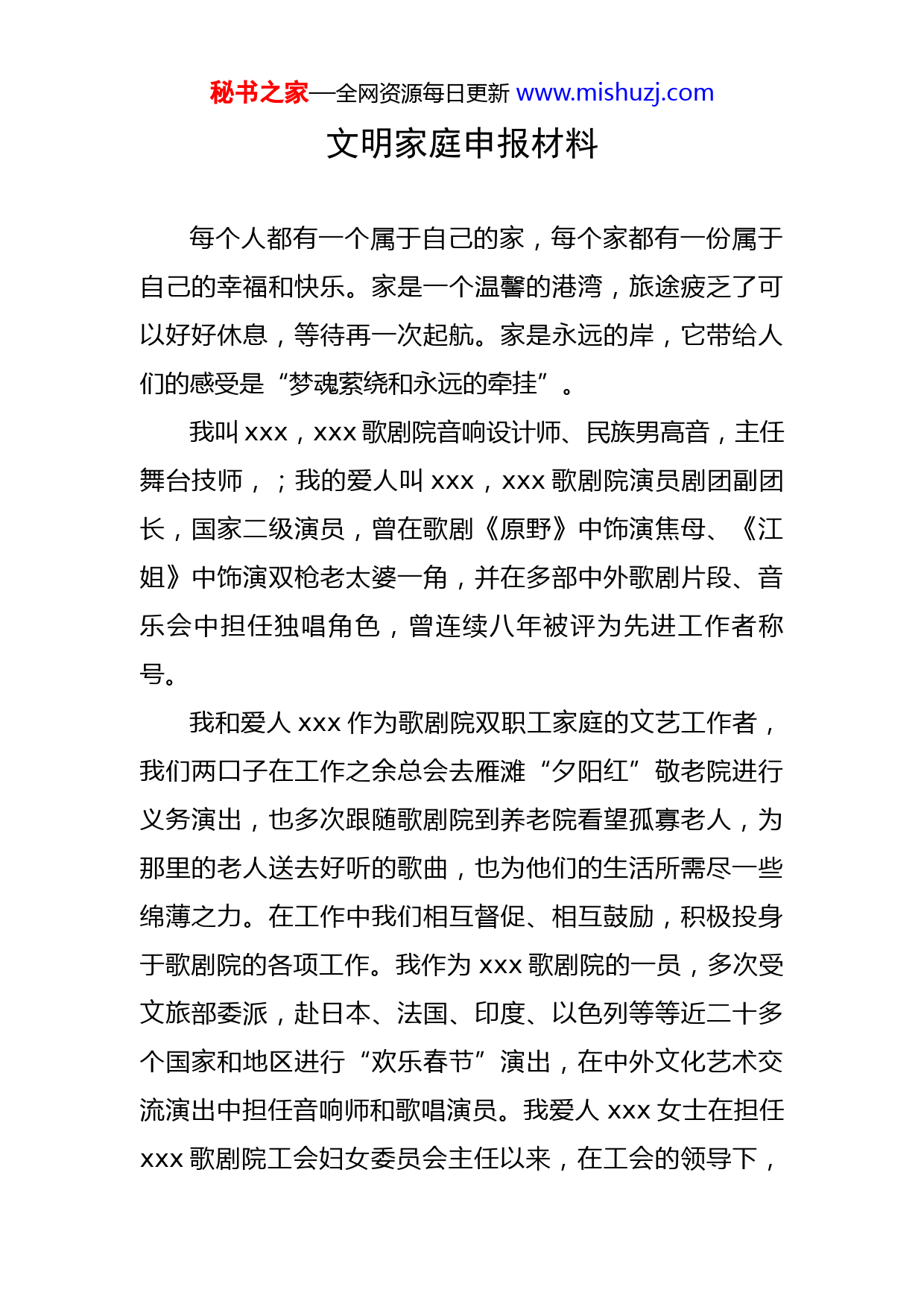 秘书之家—全网资源每日更新www.mishuzj.com文明家庭申报材料每个人都有一个属于自己的家,每个家都有一份属于自己的幸福和快乐。家是一个温馨的港湾,旅途疲乏了可以好好休息,等待再一次起航。家是永远的岸,它带给人们的感受是“梦魂萦绕和永远的牵挂”。我叫xxx,xxx歌剧院音响设计师、民族男高音,主任舞台技师,;我的爱人叫xxx,xxx歌剧院演员剧团副团长,国家二级演员,曾在歌剧《原野》中饰演焦母、《江姐》中饰演双枪老太婆一角,并在多部中外歌剧片段、音乐会中担任独唱角色,曾连续八年被评为先进工作者称号。我和爱人xxx作为歌剧院双职工家庭的文艺工作者,我们两口子在工作之余总会去雁滩“夕阳红”敬老院进行义务演出,也多次跟随歌剧院到养老院看望孤寡老人,为那里的老人送去好听的歌曲,也为他们的生活所需尽一些绵薄之力。在工作中我们相互督促、相互鼓励,积极投身于歌剧院的各项工作。我作为xxx歌剧院的一员,多次受文旅部委派,赴日本、法国、印度、以色列等等近二十多个国家和地区进行“欢乐春节”演出,在中外文化艺术交流演出中担任音响师和歌唱演员。我爱人xxx女士在担任xxx歌剧院工会妇女委员会主任以来,在工会的领导下,秘书之家—全网资源每日更新www.mishuzj.com细心为全院女职工着想,为她们排忧解难,认真地做着心理疏导,同时,带领身边的同事走近公益事业、参与公益事业。利用业务特长,为自闭症儿童教学唱歌,还几次领着女儿彭艺臻到兰州市残障儿童学校为他们送温暖、献爱心。女儿xxx就读于xxxx中学八年级,在班中学习成绩优秀,还担任了班级文娱委员一职,在第一届全国“清玄杯”公益朗诵大赛中表现突出,荣获全国二等奖;在xx市举办的少儿歌曲大赛中获得过较好的成绩,还在学习之余参与了xxx歌剧院红色经典歌剧《江姐》和《党的女儿》的演出,在剧中饰演儿童角色,受到了观众的广泛好评,我们做为家长,也感觉非常欣慰。我与爱人始终把对孩子的教育放在首位,每天与孩子保持沟通交流,把对孩子的爱同培养他的人生观、道德观相结合。我们以身作则,多陪伴、重身教、教知识、育品德,帮助孩子扣好第一粒纽扣,迈好人生第一个台阶。为给孩子树立良好的榜样,我们始终坚持宽以待人、严于律己;率先垂范、树立形象,用自己的言行影响女儿,为女儿创造良好的成长氛围。自我爱人怀孕以来,老岳母就跟我们生活在一起,时光流转,转眼已经12年了。我爱人经常对同事和朋友说:我老彭照顾我母亲比我都上心……但我感觉还有很多不足之处。作为一名文艺工作者,我性格开朗,也比较温和,发秘书之家—全网资源每日更新www.mishuzj.com觉老人比较孤独,没事总喜欢跟他开两句玩笑,逗她开心。我们的单位很多同事因为这点都比较佩服我,我感觉这也没什么,每个人都要老,应该做到“老吾老以及人之老,幼吾幼以及人之幼”,我和xxx经常主动要求参与单位党总支举办的各类公益活动,给孤寡老人和残障儿童唱歌,何况是对待我们自己的老人呢,再说一路走来,老人给我们的家庭做出了多大的付出,为我们带来了多少欢乐,我们尊敬她、孝敬她是应该的。在生活中我们两口子总会以“切磋艺术”的形式来提升家庭的艺术氛围,为家中86岁的岳母和12岁的女儿以客厅为“舞台”给家人表演节目从而增添老人和孩子在生活中的幸福感。作为一个文艺家庭,在工作者,我们用爱岗敬业严格要求自己,积极参加“陇原红色文艺轻骑兵”下乡演出,不惜辛苦、不辞劳累,为乡间百姓送去歌声与欢乐,以文艺的方式助力脱贫攻坚和乡村振兴,献上一份文艺工作者的力量与爱心。在全国“抗疫”期间本人录制多首抗疫诗歌、小音乐广播剧、现代诗《看见》《因为有你》《逆行的答案》《珍惜》《破晓》《庚子年》、自己创作并演绎音乐快板《志愿者之歌》等作品。并作词、演唱原创歌曲“白衣天使”,“以艺抗疫”,致敬那些伟大的“逆行者”,也很荣幸这些作品在学习强国平台和文旅厅、xxx歌剧院公众号中播出,获得很大的点击量。秘书之家—全网资源每日更新www.mishuzj.com我们全家严格遵守法律法规,尊重社会公德和公序良俗,从不做违法乱纪的事情,参加工作这二十多年来,一直勤勤恳恳、努力工作;始终勤于学习、兢兢业业、尽职尽责,在历年的业务考核中我多次获得第一名的好成绩,并被xxx歌剧院多次评选为优秀和先进工作者。我的家庭是一个平凡而崇尚文明、和睦和谐、向上向善的幸福之家,在外遵纪守法,爱岗敬业;在内孝敬父母,以德育人,我们全家人互敬互爱、善待邻里,因此,形成了一个温馨、快乐、和谐的家庭。