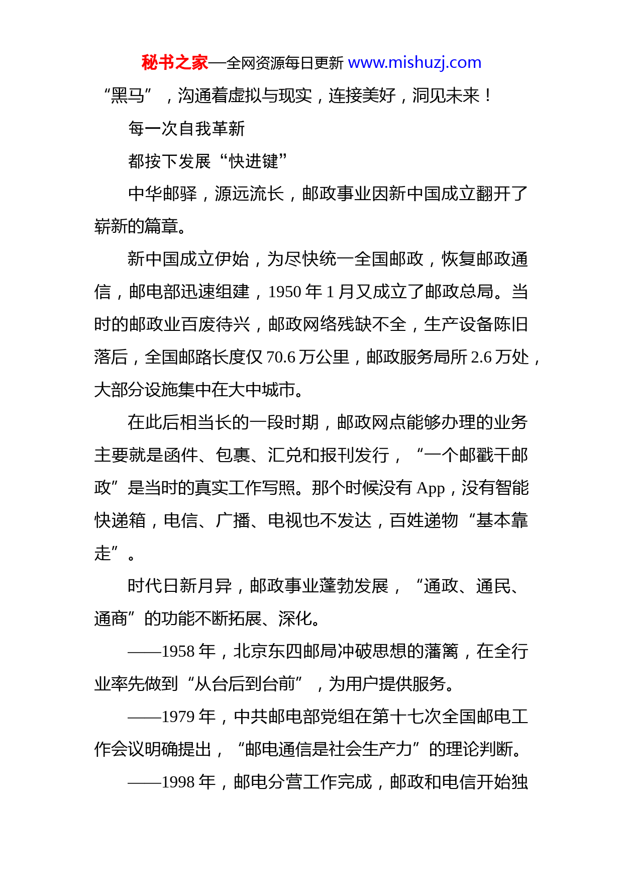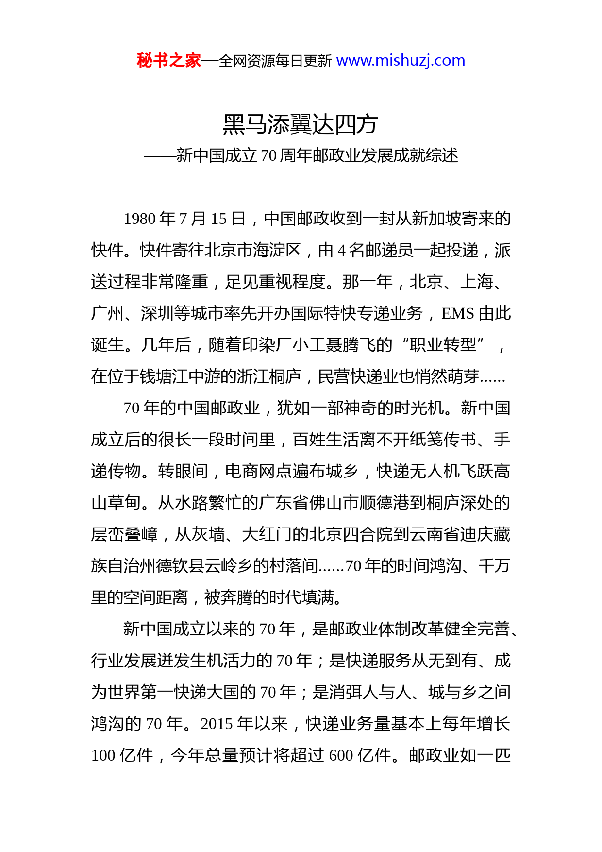 秘书之家—全网资源每日更新www.mishuzj.com黑马添翼达四方——新中国成立70周年邮政业发展成就综述1980年7月15日,中国邮政收到一封从新加坡寄来的快件。快件寄往北京市海淀区,由4名邮递员一起投递,派送过程非常隆重,足见重视程度。那一年,北京、上海、广州、深圳等城市率先开办国际特快专递业务,EMS由此诞生。几年后,随着印染厂小工聂腾飞的“职业转型”,在位于钱塘江中游的浙江桐庐,民营快递业也悄然萌芽……70年的中国邮政业,犹如一部神奇的时光机。新中国成立后的很长一段时间里,百姓生活离不开纸笺传书、手递传物。转眼间,电商网点遍布城乡,快递无人机飞跃高山草甸。从水路繁忙的广东省佛山市顺德港到桐庐深处的层峦叠嶂,从灰墙、大红门的北京四合院到云南省迪庆藏族自治州德钦县云岭乡的村落间……70年的时间鸿沟、千万里的空间距离,被奔腾的时代填满。新中国成立以来的70年,是邮政业体制改革健全完善、行业发展迸发生机活力的70年;是快递服务从无到有、成为世界第一快递大国的70年;是消弭人与人、城与乡之间鸿沟的70年。2015年以来,快递业务量基本上每年增长100亿件,今年总量预计将超过600亿件。邮政业如一匹秘书之家—全网资源每日更新www.mishuzj.com“黑马”,沟通着虚拟与现实,连接美好,洞见未来!每一次自我革新都按下发展“快进键”中华邮驿,源远流长,邮政事业因新中国成立翻开了崭新的篇章。新中国成立伊始,为尽快统一全国邮政,恢复邮政通信,邮电部迅速组建,1950年1月又成立了邮政总局。当时的邮政业百废待兴,邮政网络残缺不全,生产设备陈旧落后,全国邮路长度仅70.6万公里,邮政服务局所2.6万处,大部分设施集中在大中城市。在此后相当长的一段时期,邮政网点能够办理的业务主要就是函件、包裹、汇兑和报刊发行,“一个邮戳干邮政”是当时的真实工作写照。那个时候没有App,没有智能快递箱,电信、广播、电视也不发达,百姓递物“基本靠走”。时代日新月异,邮政事业蓬勃发展,“通政、通民、通商”的功能不断拓展、深化。——1958年,北京东四邮局冲破思想的藩篱,在全行业率先做到“从台后到台前”,为用户提供服务。——1979年,中共邮电部党组在第十七次全国邮电工作会议明确提出,“邮电通信是社会生产力”的理论判断。——1998年,邮电分营工作完成,邮政和电信开始独秘书之家—全网资源每日更新www.mishuzj.com立自主经营。——2005年,国务院印发《邮政体制改革方案》。——2007年,根据“一分开、两改革、四完善”的邮政体制改革思路,国家邮政局、中国邮政集团公司揭牌,政企分开基本完成。——2008年,大部制改革启动,邮政行业为“大交通”增添新动力,邮政、快递企业也乘上了综合交通运输体系“快车”。——党的十八大以来,邮政业继续发挥邮政体制改革优势,把创新作为引领发展的第一动力。在创新驱动下,邮政业正在让百姓生活更方便,让企业发展更具活力。这些历史坐标的背后,是邮政业改革稳步推进,行业发展提速换挡。与此同时,一个发展环境优化、治理能力提升的产业生态体系正在完善——信息通信、运输工具、手持终端等设备,成为生产服务效率提升的利器;资本、人才、管理等要素的注入,加速了建设现代企业的步伐;与电商、制造业等行业的深度联动,与综合交通运输体系的有效衔接,快递业的产业链正在不断延伸。1949年,我国邮政业务总量仅仅1.6亿元,到2018年年底,全国邮政业务总量已经达到12345亿元,70年间增长了7700多倍。邮政体系已经成为国家战略性的基础设施和社会的组织系统,邮政业作为现代服务业的重要组成部秘书之家—全网资源每日更新www.mishuzj.com分,作为推动流通方式转型,促进消费升级的现代化先导性产业,在服务国家经济社会发展和改善民生发挥了越来越重要的基础作用。每一次民心回应都迈出现代化的坚实脚步镜头回到2009年的辽宁省葫芦岛市新开岭乡,百余名村民以按红手印的方式向国家邮政局呼吁在当地修建邮政局所,解决近2万名农民用邮难的问题……此后,国家邮政局将空白乡镇邮政局所补建工作列为邮政业改革发展工作的重点,在国家发展改革委的支持下“乡乡设所”作为基础设施建设的重要内容被纳入《国民经济和社会发展第十二个五年规划纲要》和《国家基本公共服务体系“十二五”规划》,并于2010年7月正式启动补白工作。到2015年,邮政业首次全面完成8840个空白乡镇邮政局所补建工作,第一次实现了每个乡镇至少拥有1个邮政网点的目标。新中国成立之初,我国邮政网络规模小、网点少、设备陈旧、技术落后,邮政业务大都依靠人工完成,工作效率普遍较低。70年来,邮政业不断加强基础设施建设,提高普遍服务能力,在促进城乡和区域协调发展、改善民生等方面发挥了重要的支撑作用。国家邮政局数据显示,截至2018年,全国建成了230多个邮政和快递类专业物流园秘书之家—全网资源每日更新www.mishuzj.com区,邮路和快递服务网路单程长度达到3944.8万公里,拥有各类营业网点27.5万处,分别是1949年的56倍和10.4倍。全行业拥有3家货运航空公司,运营全货机115架,邮政、快递服务汽车32.2万辆,电商班列、高铁快递等运营模式取得重大进展。国务院发展研究中心产业经济研究室主任魏际刚认为,基础设施建设是推动经济增长和现代化进程的重要