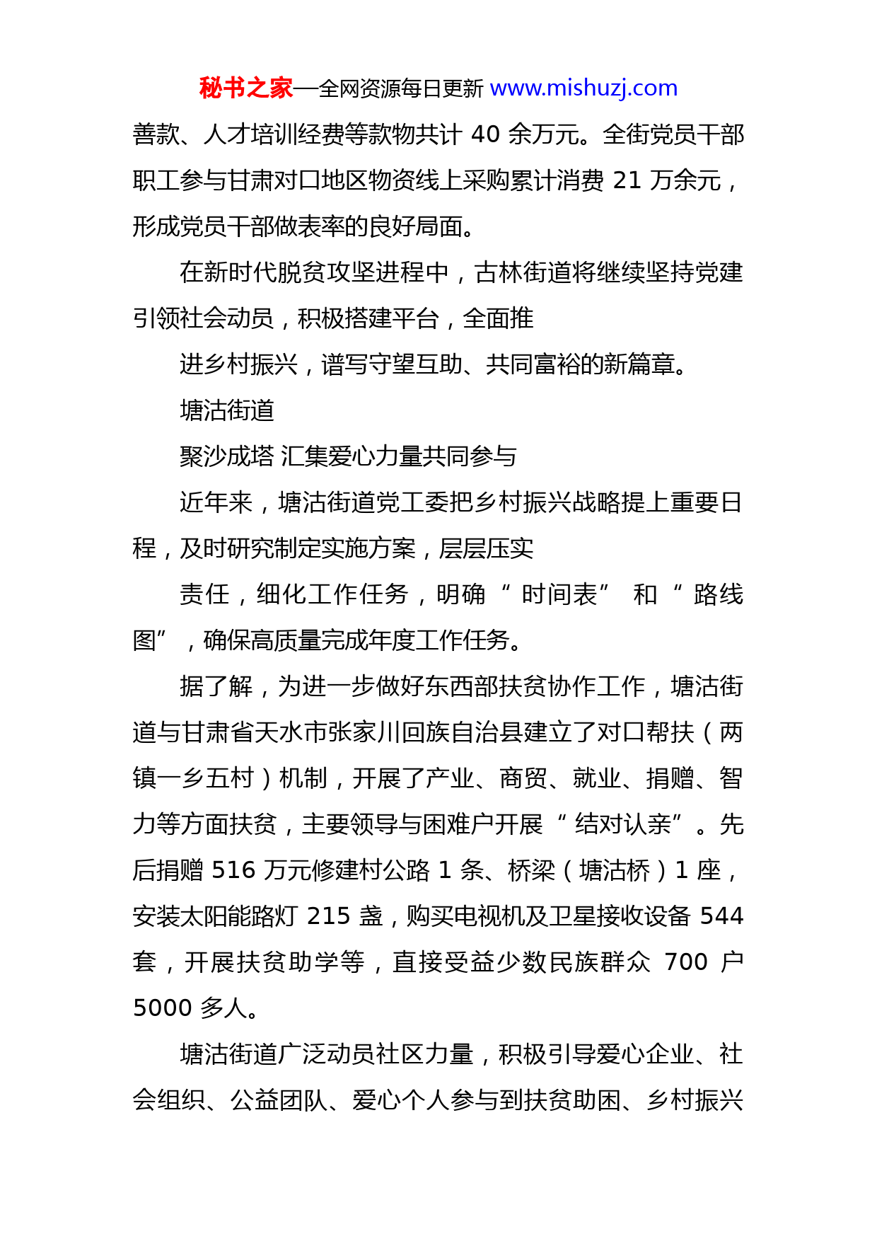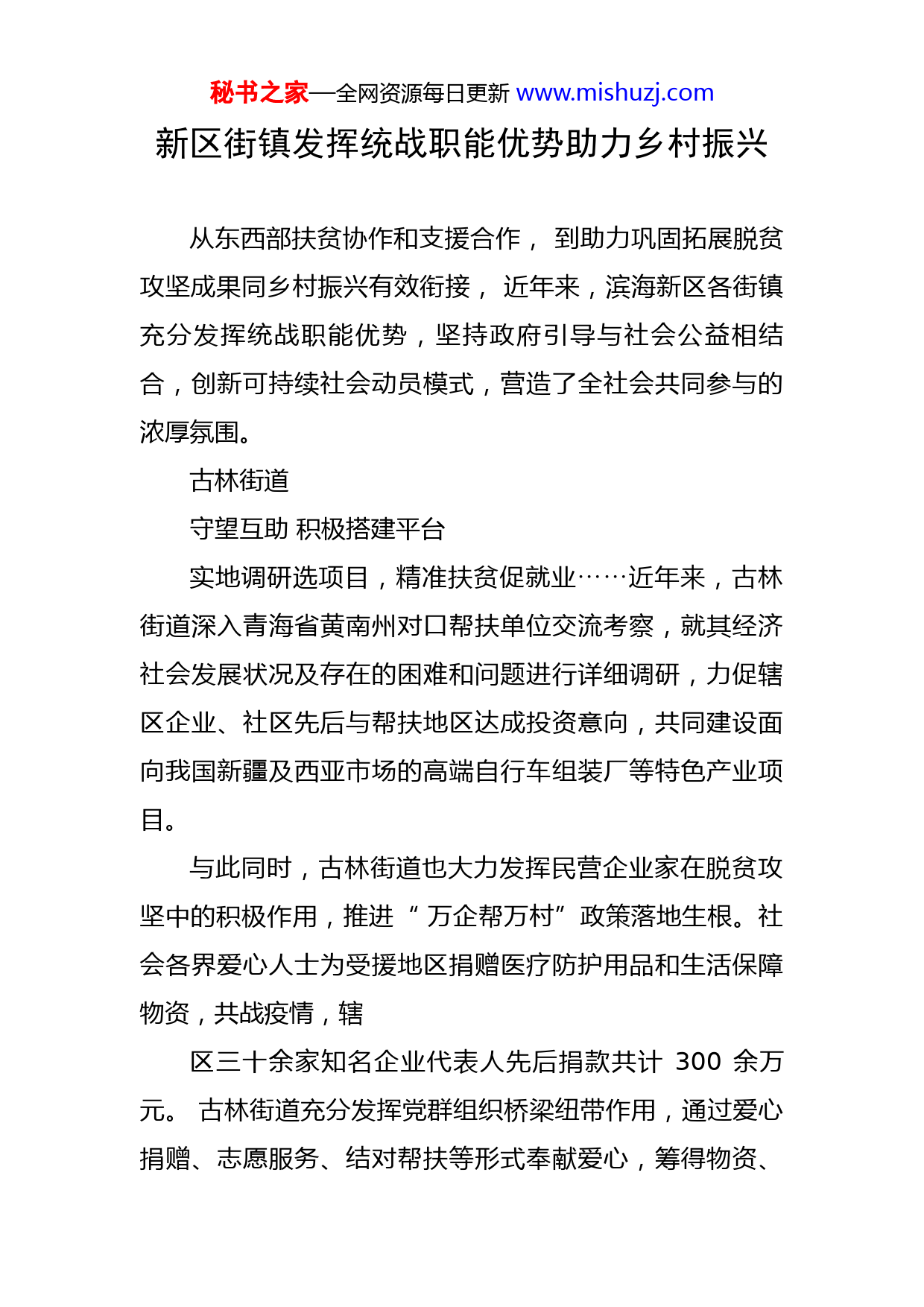 秘书之家—全网资源每日更新www.mishuzj.com新区街镇发挥统战职能优势助力乡村振兴从东西部扶贫协作和支援合作,到助力巩固拓展脱贫攻坚成果同乡村振兴有效衔接,近年来,滨海新区各街镇充分发挥统战职能优势,坚持政府引导与社会公益相结合,创新可持续社会动员模式,营造了全社会共同参与的浓厚氛围。古林街道守望互助积极搭建平台实地调研选项目,精准扶贫促就业近年来,古林⋯⋯街道深入青海省黄南州对口帮扶单位交流考察,就其经济社会发展状况及存在的困难和问题进行详细调研,力促辖区企业、社区先后与帮扶地区达成投资意向,共同建设面向我国新疆及西亚市场的高端自行车组装厂等特色产业项目。与此同时,古林街道也大力发挥民营企业家在脱贫攻坚中的积极作用,推进“万企帮万村”政策落地生根。社会各界爱心人士为受援地区捐赠医疗防护用品和生活保障物资,共战疫情,辖区三十余家知名企业代表人先后捐款共计300余万元。古林街道充分发挥党群组织桥梁纽带作用,通过爱心捐赠、志愿服务、结对帮扶等形式奉献爱心,筹得物资、秘书之家—全网资源每日更新www.mishuzj.com善款、人才培训经费等款物共计40余万元。全街党员干部职工参与甘肃对口地区物资线上采购累计消费21万余元,形成党员干部做表率的良好局面。在新时代脱贫攻坚进程中,古林街道将继续坚持党建引领社会动员,积极搭建平台,全面推进乡村振兴,谱写守望互助、共同富裕的新篇章。塘沽街道聚沙成塔汇集爱心力量共同参与近年来,塘沽街道党工委把乡村振兴战略提上重要日程,及时研究制定实施方案,层层压实责任,细化工作任务,明确“时间表”和“路线图”,确保高质量完成年度工作任务。据了解,为进一步做好东西部扶贫协作工作,塘沽街道与甘肃省天水市张家川回族自治县建立了对口帮扶(两镇一乡五村)机制,开展了产业、商贸、就业、捐赠、智力等方面扶贫,主要领导与困难户开展“结对认亲”。先后捐赠516万元修建村公路1条、桥梁(塘沽桥)1座,安装太阳能路灯215盏,购买电视机及卫星接收设备544套,开展扶贫助学等,直接受益少数民族群众700户5000多人。塘沽街道广泛动员社区力量,积极引导爱心企业、社会组织、公益团队、爱心个人参与到扶贫助困、乡村振兴秘书之家—全网资源每日更新www.mishuzj.com工作中来。在街道的广泛动员下,社会各界积极响应,纷纷慷慨解囊,充分发挥自身资源优势,从人财物等各方面对困难地区、困难群体施以援手,将点滴的爱心力量汇聚成爱心大潮。塘沽街道在2020-2022年3年期间动员社会力量捐款达240万元,为巩固拓展脱贫攻坚成果、实施乡村振兴贡献了塘沽街道力量。杨家泊镇凝心聚力深化基层统战工作近年来,杨家泊镇凝心聚力深化基层统战工作。杨家泊镇构建“统战体系”,提升工作统筹力。杨家泊镇成立了统战工作领导小组,镇党委书记任组长,明确统战委员具体负责,各村党组织书记负责本村统战工作,着力构建“党委领导—统战专责—各村落实”的工作体系。与此同时,杨家泊镇持续织密“统战网络”,增强工作影响力,搭建“统战平台”,彰显工作第1页共3页笔苑公众号和文术公众号整理,获得可编辑复制的word版,请关注公众号,进入文稿群!秘书之家—全网资源每日更新www.mishuzj.com凝聚力。镇党委通过杨家泊镇商会平台,联系号召镇域企业,筹集救助资金约30万元,成立“杨家泊镇救助基金”,在天津开发区慈善协会的推动下,向困难群体定向精准帮扶。结合党史学习教育和镇域重点工作,杨家泊镇组织召开企业和党外代表人士座谈会,畅谈学习心得,交流意见建议,有力推进各项工作顺利进行。小王庄镇文化产业提升乡村经济为了充分激发地方的内生动力,小王庄镇通过精心策划,以文创引流,将潜在的旅游资源转化成市场接受的文化产品,特色的“赏花经济”加入了绘画写生、摄影比赛、线上直播等元素,越发地吸引游客的关注。今年“五一”小长假,很多游客走进了小王庄镇。在李官庄农场,游客眼前一片郁郁葱葱,这座依托乡贤文化建立的家庭农场显示出特殊的魅力。曾经,这里只有裸露的黄土地和孤零零的农作物,经过经营者的规划设计,一块块土地被平整划分变成青青草地,一棵棵树苗被小心栽入等待枝繁叶茂,一捆捆木板被拼接整合建成户外景致。粗犷的风格变得精致,霍比特小屋、多人大秋千、草坪游秘书之家—全网资源每日更新www.mishuzj.com乐园、动力小火车等多种娱乐设施从无到有。小王庄镇在保留已有建筑的基础之上整体规划,着力打造网红式民宿和游玩点位。徐庄子古枣乡居的建设让生态宜居重归乡村,这是一座集乡村休闲旅游、农事科普实践、节庆活动承办于一体,设施齐全的特色民宿。待到秋季,乡村艺术节、农民丰收节和冬枣节等以农产品丰收为主题的节庆活动在丰收广场如火如荼地开展。游园采摘旅游项目和自产自销的农民集市实现了城乡供需的精准对接,进而带动乡村特色农产品的线上销售。杭州道街道用细微处的光为乡村振兴提亮“我们企业虽然小,但能助力国家战略,也是我们的荣幸。”“疫情当下,我们这些退休人员的日子最好过,捐这点钱不多。”作为老旧城区的典型代表,杭州道⋯⋯街道的资源优势并不明显。这里的大企业少、个体工商户多,高楼大厦少、老旧小区居民多。虽有
