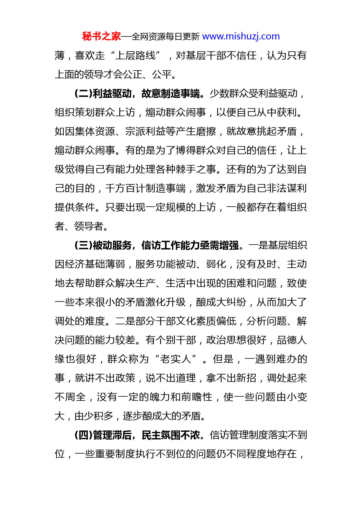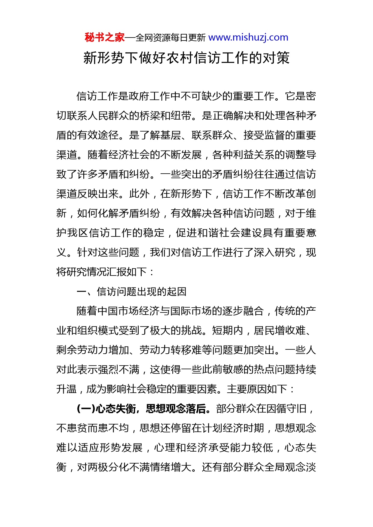 秘书之家—全网资源每日更新www.mishuzj.com新形势下做好农村信访工作的对策信访工作是政府工作中不可缺少的重要工作。它是密切联系人民群众的桥梁和纽带。是正确解决和处理各种矛盾的有效途径。是了解基层、联系群众、接受监督的重要渠道。随着经济社会的不断发展,各种利益关系的调整导致了许多矛盾和纠纷。一些突出的矛盾纠纷往往通过信访渠道反映出来。此外,在新形势下,信访工作不断改革创新,如何化解矛盾纠纷,有效解决各种信访问题,对于维护我区信访工作的稳定,促进和谐社会建设具有重要意义。针对这些问题,我们对信访工作进行了深入研究,现将研究情况汇报如下:一、信访问题出现的起因随着中国市场经济与国际市场的逐步融合,传统的产业和组织模式受到了极大的挑战。短期内,居民增收难、剩余劳动力增加、劳动力转移难等问题更加突出。一些人对此表示强烈不满,这使得一些此前敏感的热点问题持续升温,成为影响社会稳定的重要因素。主要原因如下:(一)心态失衡,思想观念落后。部分群众在因循守旧,不患贫而患不均,思想还停留在计划经济时期,思想观念难以适应形势发展,心理和经济承受能力较低,心态失衡,对两极分化不满情绪增大。还有部分群众全局观念淡秘书之家—全网资源每日更新www.mishuzj.com薄,喜欢走“上层路线”,对基层干部不信任,认为只有上面的领导才会公正、公平。(二)利益驱动,故意制造事端。少数群众受利益驱动,组织策划群众上访,煽动群众闹事,以便自己从中获利。如因集体资源、宗派利益等产生磨擦,就故意挑起矛盾,煽动群众闹事。有的是为了博得群众对自己的信任,让上级觉得自己有能力处理各种棘手之事。还有的为了达到自己的目的,千方百计制造事端,激发矛盾为自己非法谋利提供条件。只要出现一定规模的上访,一般都存在着组织者、领导者。(三)被动服务,信访工作能力亟需增强。一是基层组织因经济基础薄弱,服务功能被动、弱化,没有及时、主动地去帮助群众解决生产、生活中出现的困难和问题,致使一些本来很小的矛盾激化升级,酿成大纠纷,从而加大了调处的难度。二是部分干部文化素质偏低,分析问题、解决问题的能力较差。有个别干部,政治思想很好,品德人缘也很好,群众称为“老实人”。但是,一遇到难办的事,就讲不出政策,说不出道理,拿不出新招,调处起来不周全,没有一定的魄力和前瞻性,使一些问题由小变大,由少积多,逐步酿成大的矛盾。(四)管理滞后,民主氛围不浓。信访管理制度落实不到位,一些重要制度执行不到位的问题仍不同程度地存在,秘书之家—全网资源每日更新www.mishuzj.com导致群众对民主管理的监督缺失,群众的利益受损,进而引起群众的强烈不满。有些信访多村和街道征求群众意见较少等等。二、新形势下做好农村信访工作的对策(一)抓住“早”,变上访为下访。要及时捕捉信息,及早化解矛盾。在具体操作中,要坚决克服“上访无好人”的观点,正确对待上访群众,教育引导群众通过正当渠道反映问题,依照法律法规解决矛盾,及时有效地疏导群众。要立足于“抓早、抓小、抓苗头”,经常深入基层调查研究,广泛搜集信息,超前预测,防患未然。要把易发、多发信访的村、街道、企业作为重点排查对象,对排查出的苗头性、倾向性问题和不安定因素,及时摸清产生的原因,有针对性地制定解决措施,将问题化解在萌芽状态。(二)突出“快”,变久拖为速决。对于群众上访,接访后要做到快调查、速处理、快结案,力争一次处理到位,不留后患,避免重复上访、越级上访的发生。在调查处理中要坚持两个“要”,把握两个“关”,做到“三不结”。即:事实要查细,把握好事实关;有错要必纠,把握好处理关。要做到问题未查清的不结案;处理结果未与上访人见面的不结案;调查结论群众不满意的不结案。(三)把握“源”,变处理为预防。实践中,每发生一次秘书之家—全网资源每日更新www.mishuzj.com群众上访都会存在一定的工作成本,而一旦引发集体上访,则更加需要花费大量的人力、物力和财力。因此,我们在解决群众上访问题的同时,要注重超前防范,标本兼治,从根本上减少信访案件的发生。一是要配备好强有力的基层信访干部队伍。二是要加强对群众信访工作的创新解决能力,提高信访队伍的政治素质和工作能力。(四)强化“责”,变被动为联动。一是要落实信访工作责任制。逐级建立党政“一把手”负总责、分管领导具体抓的工作机制,层层明确责任,一级对一级负责。二是要健全信访网络。从镇到村、到组、到重点地段、重点区域,都要有信息员、联络员、调处员、宣传员,定期召开会议,分析、研究、解决问题,通报工作情况,形成上下协调、齐抓共管的格局,充分发挥信访信息网络的预报、预警作用,彻底排查不稳定因素,及时收集报送影响基层稳定的苗头性问题。三是要推行稳定承诺制。信访相关部门要公开承诺,明确处理期限,引导群众有问题逐级反映。四是要实行领导接访日制度。变上访为下访,变来访为回访,变上告为下解,党员领导干部要定期接待群众来信来访,对群众反映的问题及时答复,耐心解释,果断处理。(五)瞄准“热”,变焦点为亮点。一是要建立健全信访进展公开制度,让群众真正了解信访工作进展情况,对于秘书之家—全网资源每日更新www.mishuzj