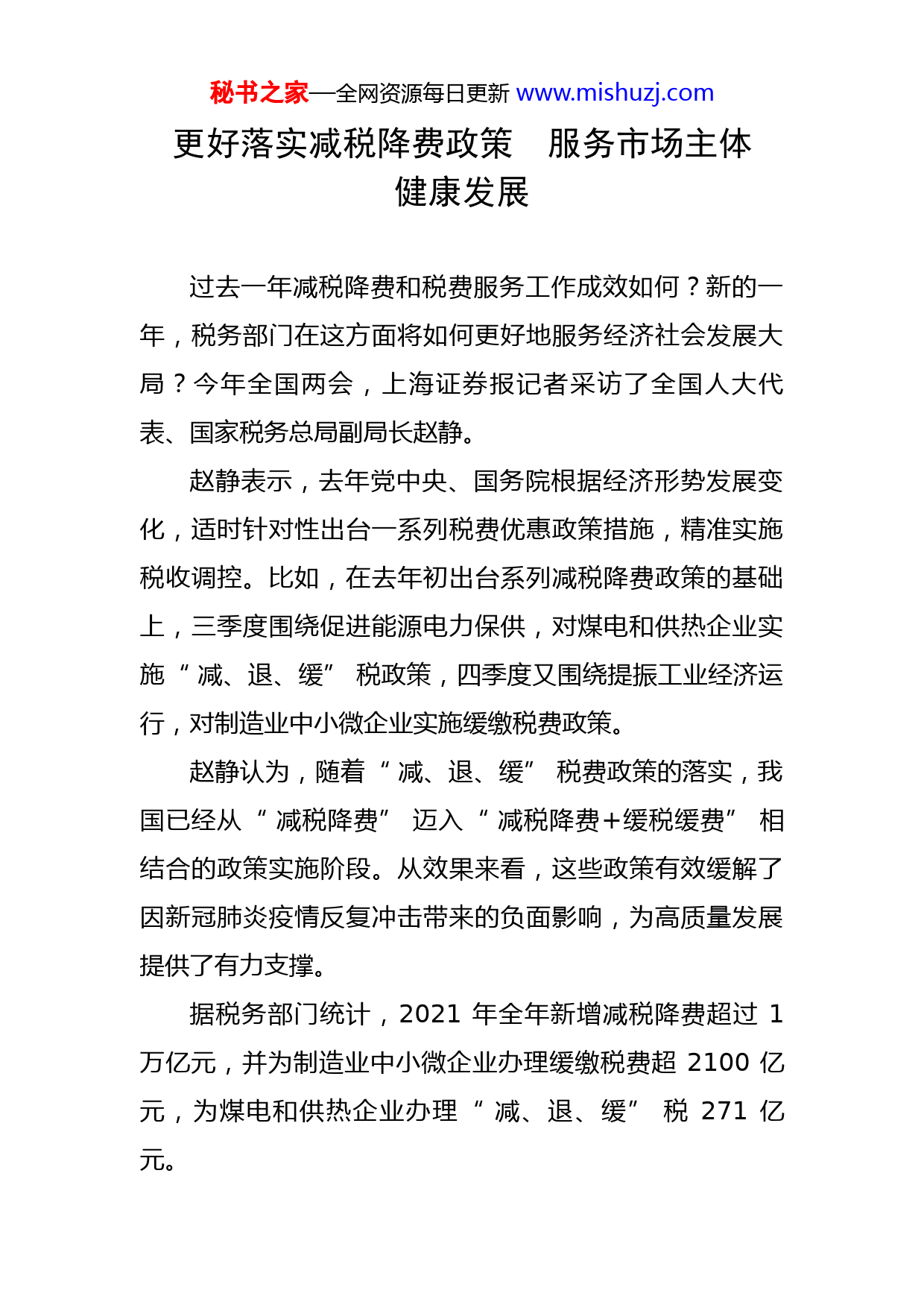 秘书之家—全网资源每日更新www.mishuzj.com更好落实减税降费政策服务市场主体健康发展过去一年减税降费和税费服务工作成效如何?新的一年,税务部门在这方面将如何更好地服务经济社会发展大局?今年全国两会,上海证券报记者采访了全国人大代表、国家税务总局副局长赵静。赵静表示,去年党中央、国务院根据经济形势发展变化,适时针对性出台一系列税费优惠政策措施,精准实施税收调控。比如,在去年初出台系列减税降费政策的基础上,三季度围绕促进能源电力保供,对煤电和供热企业实施“减、退、缓”税政策,四季度又围绕提振工业经济运行,对制造业中小微企业实施缓缴税费政策。赵静认为,随着“减、退、缓”税费政策的落实,我国已经从“减税降费”迈入“减税降费+缓税缓费”相结合的政策实施阶段。从效果来看,这些政策有效缓解了因新冠肺炎疫情反复冲击带来的负面影响,为高质量发展提供了有力支撑。据税务部门统计,2021年全年新增减税降费超过1万亿元,并为制造业中小微企业办理缓缴税费超2100亿元,为煤电和供热企业办理“减、退、缓”税271亿元。秘书之家—全网资源每日更新www.mishuzj.com除了真金白银的税费“红包”,不断升级的税费服务也为市场主体焕发新活力赋能加码。作为来自税务系统的全国人大代表,税收营商环境一直是赵静关注的重点。“好的营商环境就像阳光、水和空气,须臾不能缺少。税务部门是与市场主体打交道最多、联系最紧密的窗口单位之一,牵涉千万户企业、数亿自然人纳税人和10亿多缴费人,服务质量、监管方式直接影响营商环境。”赵静表示。赵静说,在税务部门开展的各项调研工作中,“税费服务越来越好”已经成为广大纳税人缴费人的直观感受。今年政府工作报告提出,实施新的组合式税费支持政策,坚持阶段性措施和制度性安排相结合,减税与退税并举,预计全年退税减税约2.5万亿元。对此税务部门将如何落实?赵静告诉记者,目前,各级税务机关正在按照税务总局党委统一部署要求,认真细致做好征管配套、信息系统升级等工作,并将明确落实“责任书”、紧盯施工“倒计时”、铺设快享“高速路”、推送税费“红利账”、筑牢纪律“防火墙”,全力以赴确保党中央、国务院新的组合式税费支持政策落地生根,让市场主体和人民群众有实实在在的获得感。秘书之家—全网资源每日更新www.mishuzj.com具体而言,税务部门将持续完善税费优惠政策直达快享机制,精准筛选符合优惠政策享受条件的纳税人缴费人,实现政策精准推送,并试点通过电子税务局等渠道推送减税降费红利账单,进一步提升纳税人缴费人的减税降费获得感。此外,税务部门将充分依托税收大数据,切实做好跟踪分析,让政策效应在充分释放中更好展现。“同时,在落实税费支持政策中持续优化营商环境,巩固拓展党史学习教育成果,推动为民办实事常态化长效化。”赵静表示,后续税务总局还将根据新情况新需求不断完善便民办税缴费举措,进一步为市场主体纾困解难,持续优化税收营商环境。