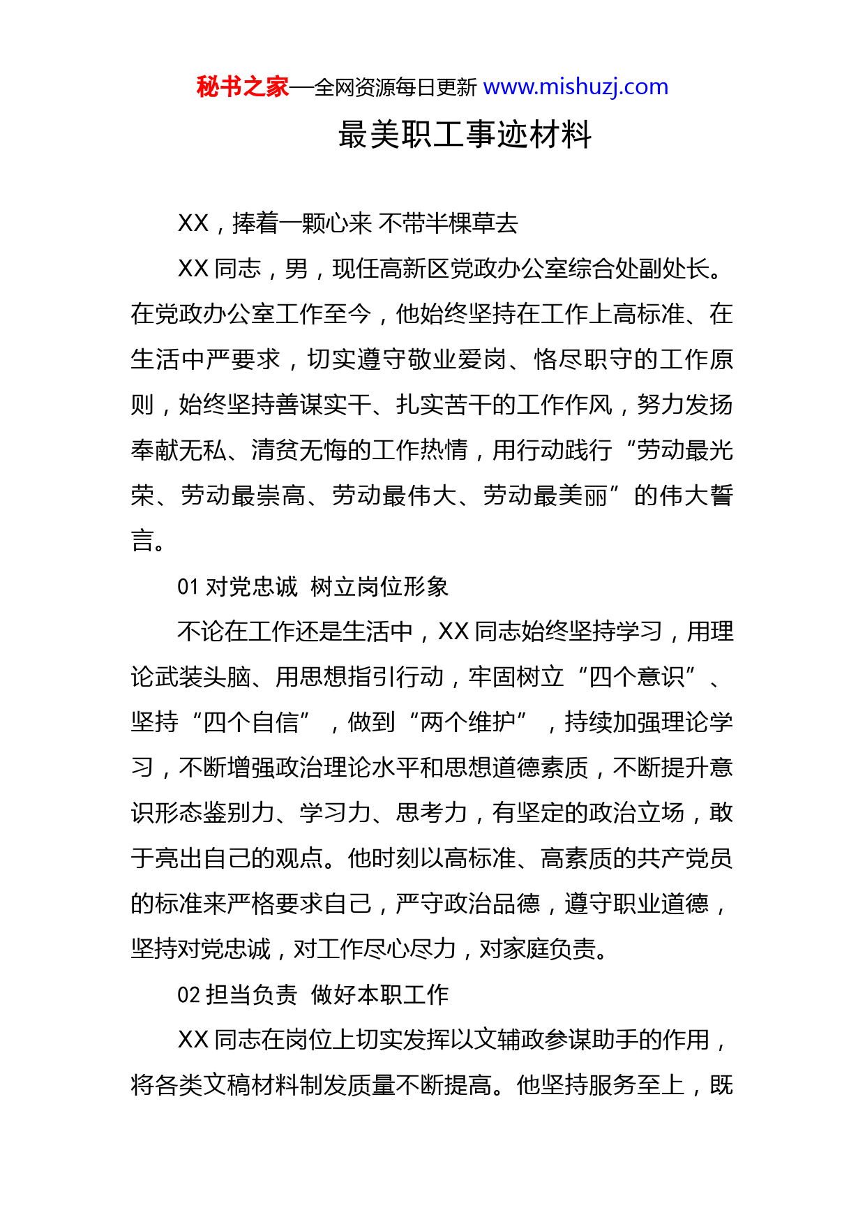 秘书之家—全网资源每日更新www.mishuzj.com最美职工事迹材料XX,捧着一颗心来不带半棵草去XX同志,男,现任高新区党政办公室综合处副处长。在党政办公室工作至今,他始终坚持在工作上高标准、在生活中严要求,切实遵守敬业爱岗、恪尽职守的工作原则,始终坚持善谋实干、扎实苦干的工作作风,努力发扬奉献无私、清贫无悔的工作热情,用行动践行“劳动最光荣、劳动最崇高、劳动最伟大、劳动最美丽”的伟大誓言。01对党忠诚树立岗位形象不论在工作还是生活中,XX同志始终坚持学习,用理论武装头脑、用思想指引行动,牢固树立“四个意识”、坚持“四个自信”,做到“两个维护”,持续加强理论学习,不断增强政治理论水平和思想道德素质,不断提升意识形态鉴别力、学习力、思考力,有坚定的政治立场,敢于亮出自己的观点。他时刻以高标准、高素质的共产党员的标准来严格要求自己,严守政治品德,遵守职业道德,坚持对党忠诚,对工作尽心尽力,对家庭负责。02担当负责做好本职工作XX同志在岗位上切实发挥以文辅政参谋助手的作用,将各类文稿材料制发质量不断提高。他坚持服务至上,既秘书之家—全网资源每日更新www.mishuzj.com尊重、服务拟稿单位,又坚持原则、大胆审核,做到工作到位不越位、帮忙不添乱,勤学习、苦练习、善总结、多感悟,既掌握相关法律法规和方针政策,又熟知全面工作。XX同志在工作时,坚持做到三个要点。一是要严把发文关口,实行总量控制,严格控制发文数量,树立全局观念、法制观念和规范意识,切实把好行文关、政策关、内容关、文字关、格式关等各个关口,有力促进上级各项决策部署的落实和全区各项工作的顺利推进;二是要全面服务党工委会议及党工委、管委会综合性会议,高质高效审印议题材料和各类会议材料;三是要按照省市关于开展政策标准化梳理工作部署要求,完成政策标准化“扩覆盖、强整改、促提升”各项工作部署。XX同志对平台录入的每一份文件、政策及解读都进行了认真的检查,确保准确率、及时率实现100%。03廉洁自律做到心中有戒在工作中,XX同志不断践行“严、真、细、实、快”的工作作风,对待工作严肃、严格、严谨,不讲条件、不打折扣、不搞变通,把工作细节做扎实、做到位,始终坚持实事求是、求真务实,力戒形式主义、官僚主义,切实增强使命感、责任感和紧迫感。他始终坚持“今日事今日秘书之家—全网资源每日更新www.mishuzj.com毕”的信念,对工作常怀敬畏之心,勤学苦练,不因事多而顾此失彼,不因事急而不讲程序,不因人熟而降低要求。XX同志始终以昂扬的精神状态和强烈的责任感、使命感,在平凡的岗位上更好地奉献自我、服务大局。在工作纪律上,他坚决不做违背原则的事,坚决不说没有党性的话,坚决不干有损办公室形象的事。“捧着一颗心来,不带半棵草去”,在今后的学习、生活和工作中,XX同志将进一步加强学习,严于律己,提高自己的思想政治觉悟和业务技能水平,在高新区“三次创业”征程中不断贡献力量。