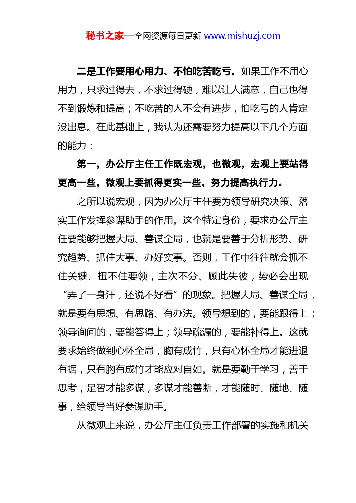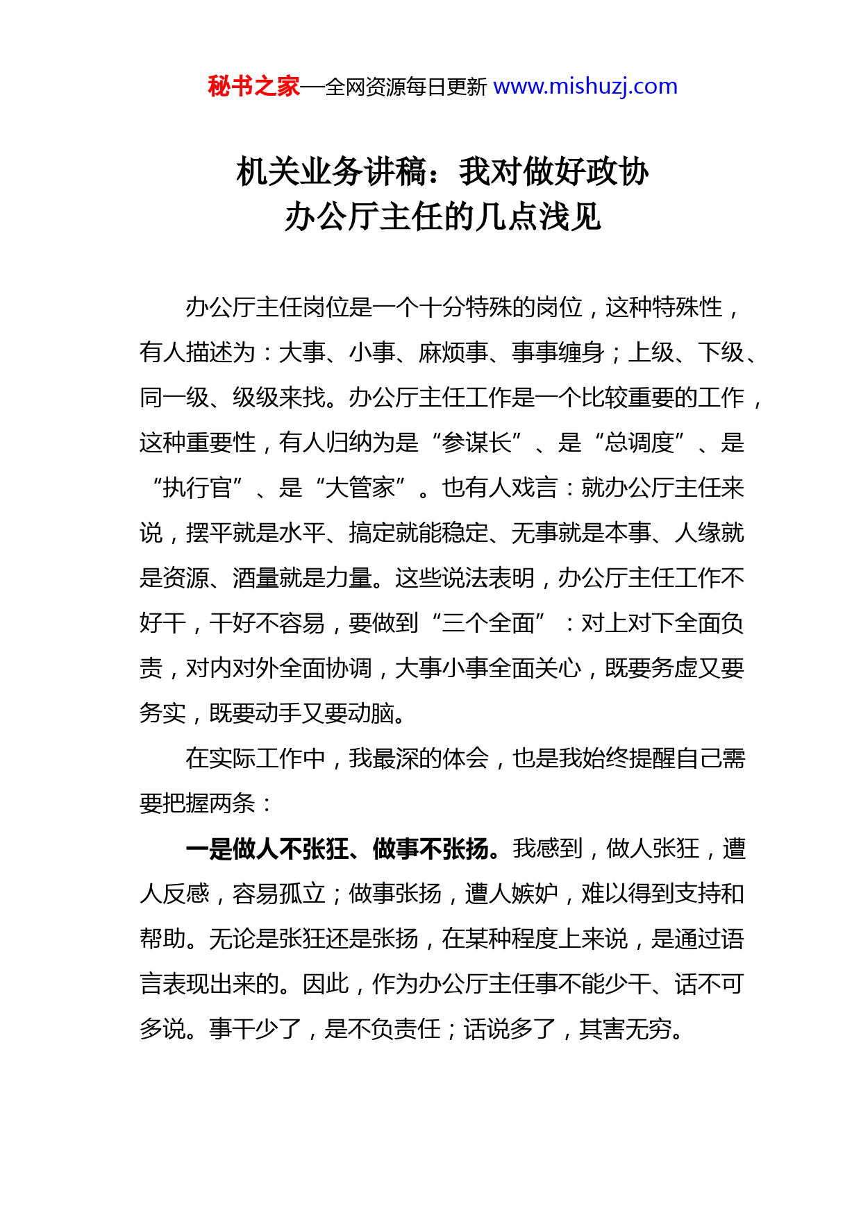 秘书之家—全网资源每日更新www.mishuzj.com机关业务讲稿:我对做好政协办公厅主任的几点浅见办公厅主任岗位是一个十分特殊的岗位,这种特殊性,有人描述为:大事、小事、麻烦事、事事缠身;上级、下级、同一级、级级来找。办公厅主任工作是一个比较重要的工作,这种重要性,有人归纳为是“参谋长”、是“总调度”、是“执行官”、是“大管家”。也有人戏言:就办公厅主任来说,摆平就是水平、搞定就能稳定、无事就是本事、人缘就是资源、酒量就是力量。这些说法表明,办公厅主任工作不好干,干好不容易,要做到“三个全面”:对上对下全面负责,对内对外全面协调,大事小事全面关心,既要务虚又要务实,既要动手又要动脑。在实际工作中,我最深的体会,也是我始终提醒自己需要把握两条:一是做人不张狂、做事不张扬。我感到,做人张狂,遭人反感,容易孤立;做事张扬,遭人嫉妒,难以得到支持和帮助。无论是张狂还是张扬,在某种程度上来说,是通过语言表现出来的。因此,作为办公厅主任事不能少干、话不可多说。事干少了,是不负责任;话说多了,其害无穷。秘书之家—全网资源每日更新www.mishuzj.com二是工作要用心用力、不怕吃苦吃亏。如果工作不用心用力,只求过得去,不求过得硬,难以让人满意,自己也得不到锻炼和提高;不吃苦的人不会有进步,怕吃亏的人肯定没出息。在此基础上,我认为还需要努力提高以下几个方面的能力:第一,办公厅主任工作既宏观,也微观,宏观上要站得更高一些,微观上要抓得更实一些,努力提高执行力。之所以说宏观,因为办公厅主任要为领导研究决策、落实工作发挥参谋助手的作用。这个特定身份,要求办公厅主任要能够把握大局、善谋全局,也就是要善于分析形势、研究趋势、抓住大事、办好实事。否则,工作中往往就会抓不住关键、扭不住要领,主次不分、顾此失彼,势必会出现“弄了一身汗,还说不好看”的现象。把握大局、善谋全局,就是要有思想、有思路、有办法。领导想到的,要能跟得上;领导询问的,要能答得上;领导疏漏的,要能补得上。这就要求始终做到心怀全局,胸有成竹,只有心怀全局才能进退有据,只有胸有成竹才能应对自如。就是要勤于学习,善于思考,足智才能多谋,多谋才能善断,才能随时、随地、随事,给领导当好参谋助手。从微观上来说,办公厅主任负责工作部署的实施和机关秘书之家—全网资源每日更新www.mishuzj.com建设,这就要求办公厅主任要把工作抓得严而又严、细而又细、实而又实。就是要敢抓落实、善抓落实,保质保量完成任务,使领导们的想法变成现实。这是办公厅主任必须练就的一项“过得硬”的基本功。具体说来,就是要做到“三抓”:一是要抓住,对领导说过的、定下的、交办的事,要抓住不放,雷厉风行,说干就干,干就力争干好。二是要抓紧,任何工作抓而不紧,等于不抓,这样,势必拖了新事,误了急事,坏了好事,就会把小事弄成大事,把简单的事变成难办的事。三是要一抓到底,不解决问题不撒手。如果见难而退,虎头蛇尾,缺乏善始善终的决心、扭住不放的韧劲和义无反顾的勇气,就会功亏一篑。我们做每一项工作,总会遇到这样或那样的困难。越是胜利在望,困难也就越大。只有在任何复杂的情况下,绝不后退一步,敢于和善于烧好“最后一把火”,才能功到自然成。第二,办公厅主任工作既主动,也被动,要在被动中争取主动,努力提高预见力。办公厅主任工作是一种围绕着服务对象开展的工作,具有从属性、服务性、辅助性的特点,要不断地、千方百计地秘书之家—全网资源每日更新www.mishuzj.com满足服务对象的不同需求,还要根据需求的变化,及时调整自己的工作任务、工作重点。可以说,要因领导人的调整而调整、领导人注意力的变化而变化。因此,工作虽有一定的主动性,但是,在更多的情况下处于被动状态。这就要求必须充分发挥自己的主观能动性,努力提高预见力,使工作由领导交办,向领导交办与主动谋划相结合,力求早半拍、快半拍,多未雨绸缪,多当事前“诸葛亮”。要有一定的思想理论政策水平,能用宽广的眼光看问题,提出的意见建议才能具有较强的针对性、科学性和可操作性。要善于多层面、多角度地思考问题,能够提出多个方案,供决策时比较和选择。因此,主动、超前思考问题、谋划工作,是办公厅主任必须养成的良好习惯,也是做好工作的重要前提。第三,办公厅主任工作既要有刚性,也要有柔性,要刚柔相济,努力提高协调力。任何一个单位要把工作做好,离不开内部的心齐气顺,离不开外部的支持配合,这种内和外顺的关系,在一定的程度上,需要办公厅主任通过协调工作来维系和创造。所以,办公厅主任工作虽然涉及的范围比较大、联系的面也比较广。秘书之家—全网资源每日更新www.mishuzj.com但是,要仔细分析,无外乎是两个层面:一个层面是对内,另一个层面是对外。对内要能够“理得顺”,对外要能够“合得来”。对内,要管理有力,勇于负责,使机关做到政治先进、工作扎实、行为规范。在参与政务上,做到超前、深入;在管理事务上,做到规范、细致;在搞好服务上,做到热情、主动。做到帮忙不添乱、切实不表面、宽松不放松。对外,要善于协调,要多沟通、多联络,让相关部门熟悉、理解、乐意支持。协调是一种手段、是一门艺术,也是一种能力。提高协调力,一是要增强