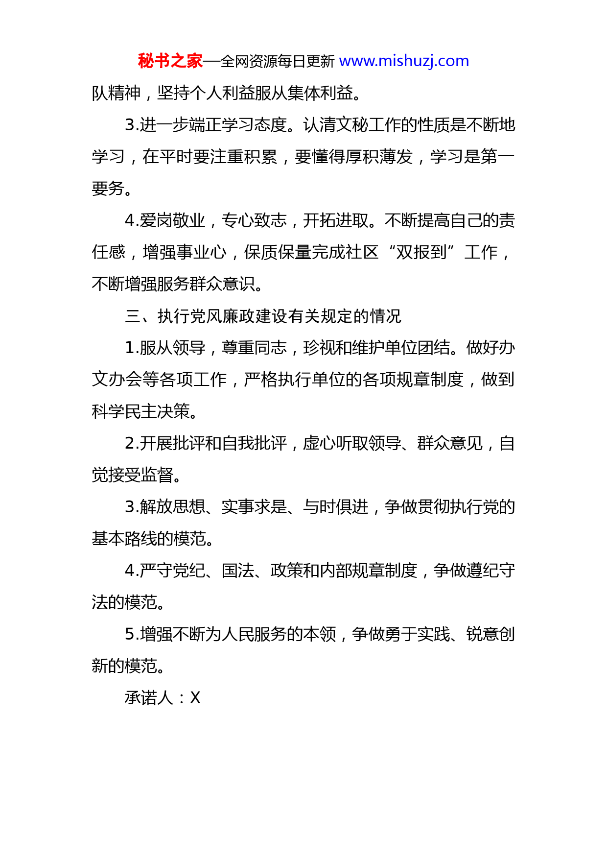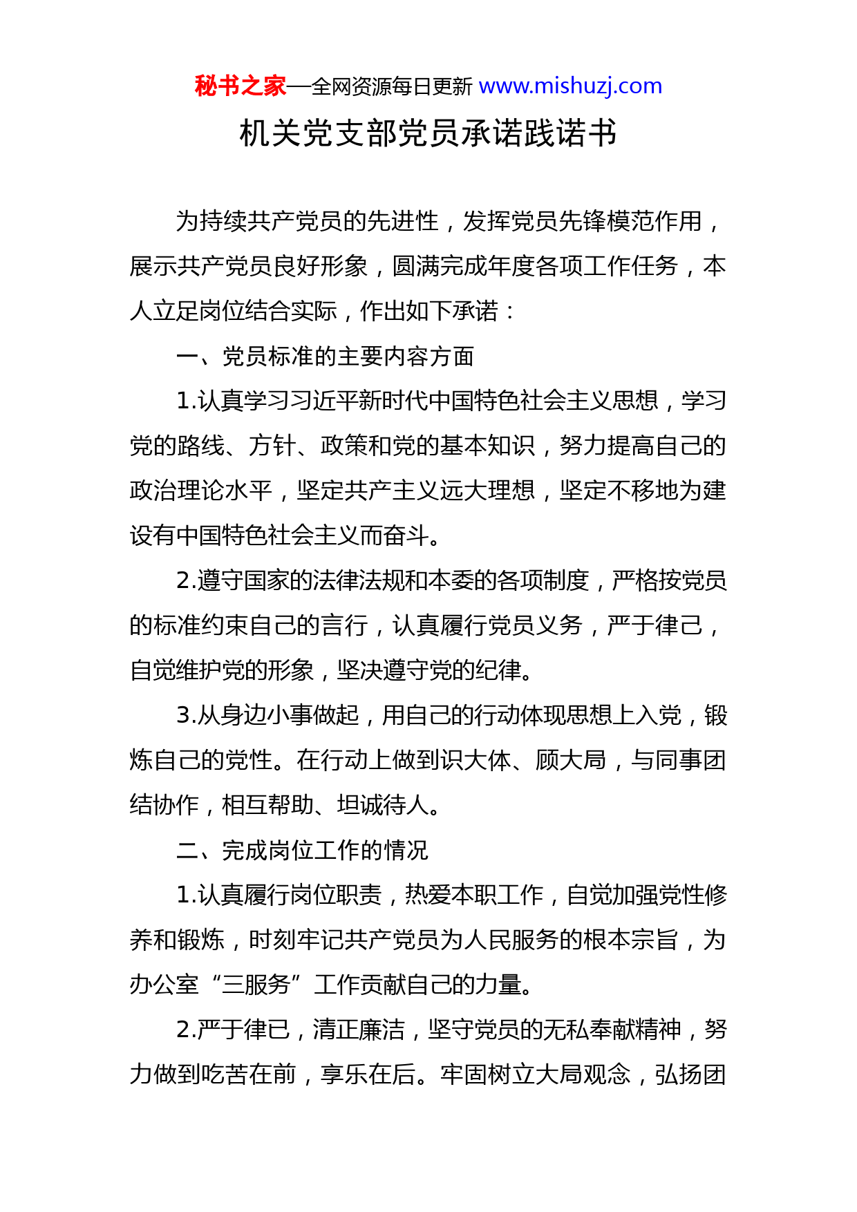 秘书之家—全网资源每日更新www.mishuzj.com机关党支部党员承诺践诺书为持续共产党员的先进性,发挥党员先锋模范作用,展示共产党员良好形象,圆满完成年度各项工作任务,本人立足岗位结合实际,作出如下承诺:一、党员标准的主要内容方面1.认真学习习近平新时代中国特色社会主义思想,学习党的路线、方针、政策和党的基本知识,努力提高自己的政治理论水平,坚定共产主义远大理想,坚定不移地为建设有中国特色社会主义而奋斗。2.遵守国家的法律法规和本委的各项制度,严格按党员的标准约束自己的言行,认真履行党员义务,严于律己,自觉维护党的形象,坚决遵守党的纪律。3.从身边小事做起,用自己的行动体现思想上入党,锻炼自己的党性。在行动上做到识大体、顾大局,与同事团结协作,相互帮助、坦诚待人。二、完成岗位工作的情况1.认真履行岗位职责,热爱本职工作,自觉加强党性修养和锻炼,时刻牢记共产党员为人民服务的根本宗旨,为办公室“三服务”工作贡献自己的力量。2.严于律已,清正廉洁,坚守党员的无私奉献精神,努力做到吃苦在前,享乐在后。牢固树立大局观念,弘扬团秘书之家—全网资源每日更新www.mishuzj.com队精神,坚持个人利益服从集体利益。3.进一步端正学习态度。认清文秘工作的性质是不断地学习,在平时要注重积累,要懂得厚积薄发,学习是第一要务。4.爱岗敬业,专心致志,开拓进取。不断提高自己的责任感,增强事业心,保质保量完成社区“双报到”工作,不断增强服务群众意识。三、执行党风廉政建设有关规定的情况1.服从领导,尊重同志,珍视和维护单位团结。做好办文办会等各项工作,严格执行单位的各项规章制度,做到科学民主决策。2.开展批评和自我批评,虚心听取领导、群众意见,自觉接受监督。3.解放思想、实事求是、与时俱进,争做贯彻执行党的基本路线的模范。4.严守党纪、国法、政策和内部规章制度,争做遵纪守法的模范。5.增强不断为人民服务的本领,争做勇于实践、锐意创新的模范。承诺人:X